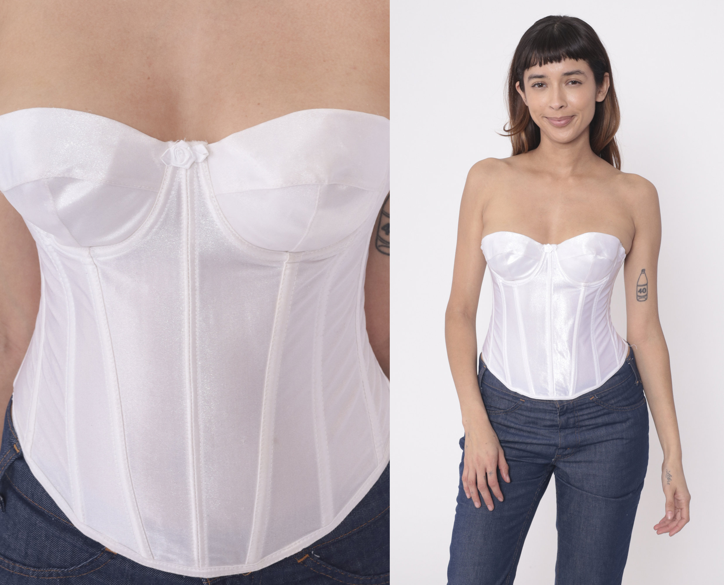 Vintage 90s bustier bra top in white with a sheer back. Strapless with boning, a low back, and a sweetheart neckline.