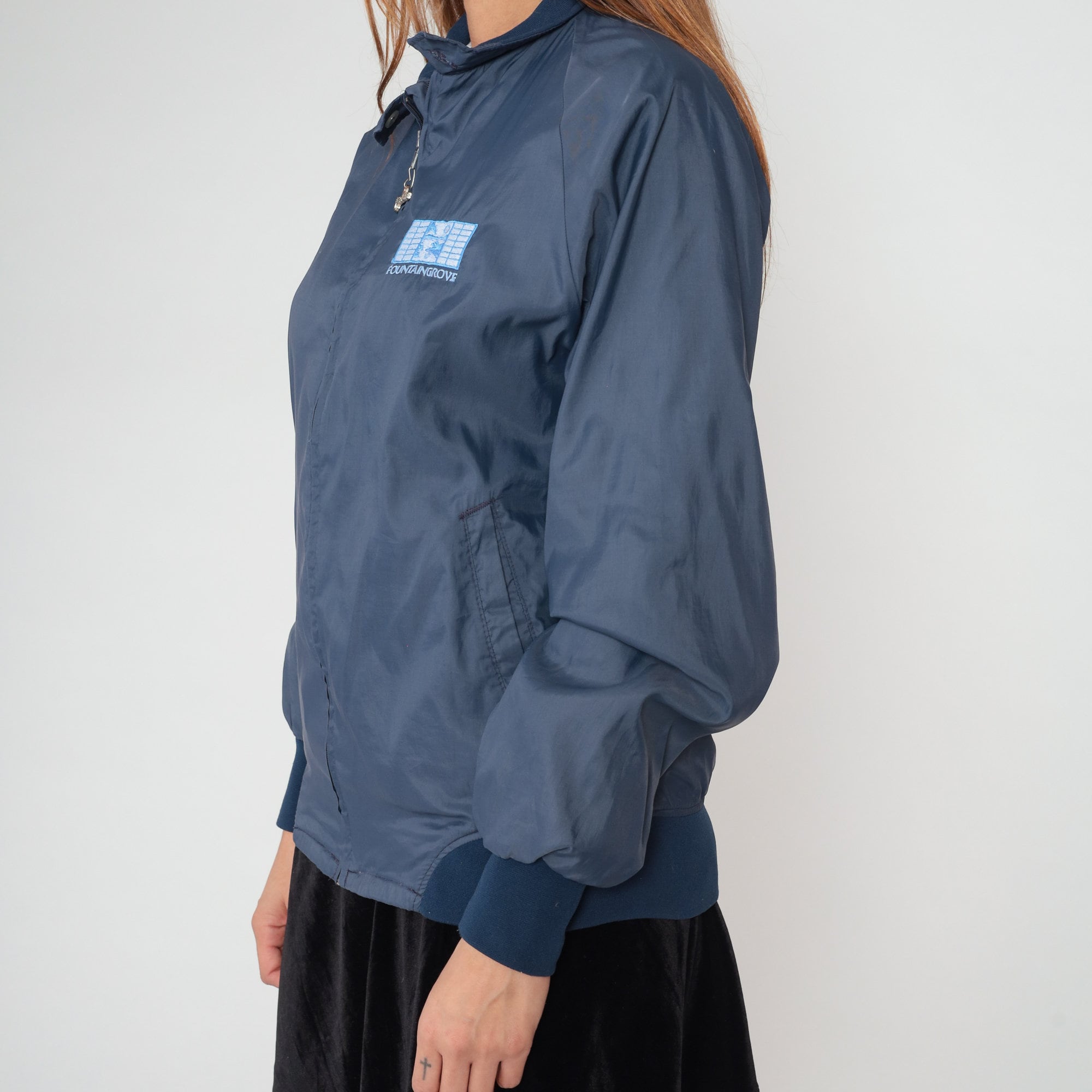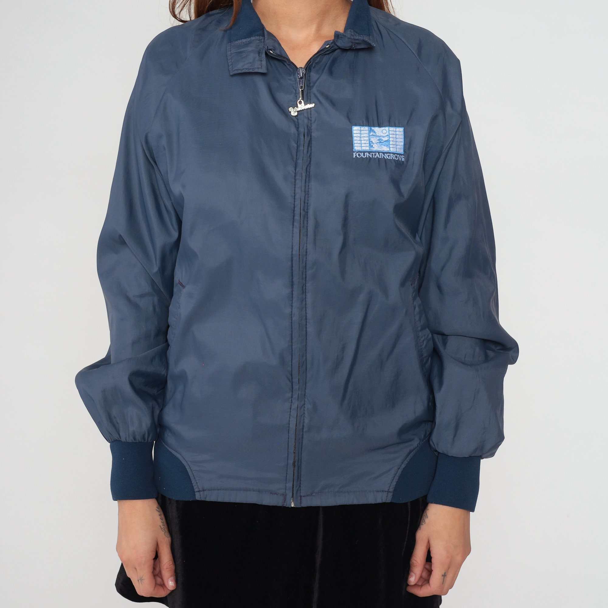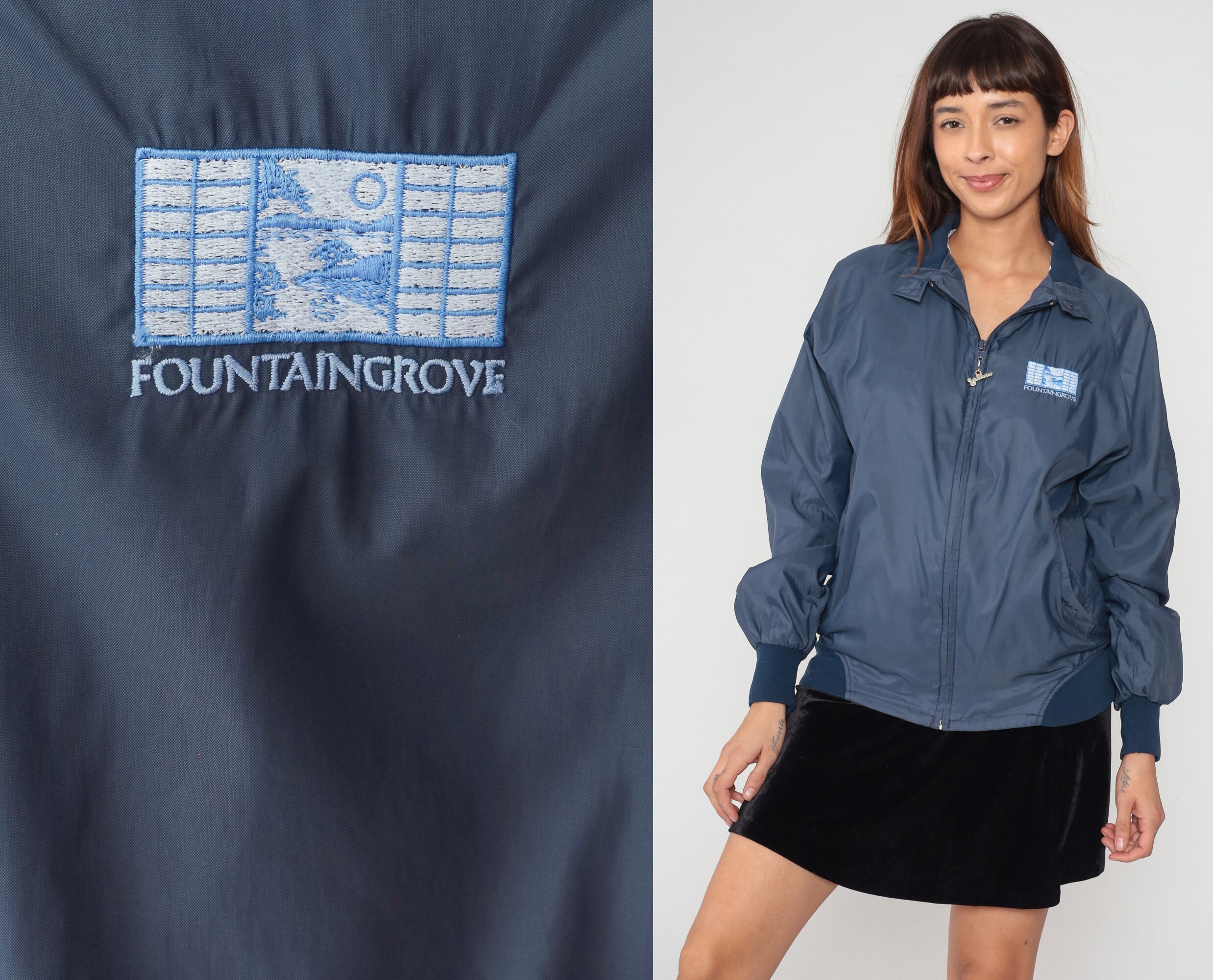 Vintage 90s windbreaker jacket in navy blue with a Fountaingrove logo on the chest and a Duckster logo zipper up the front.