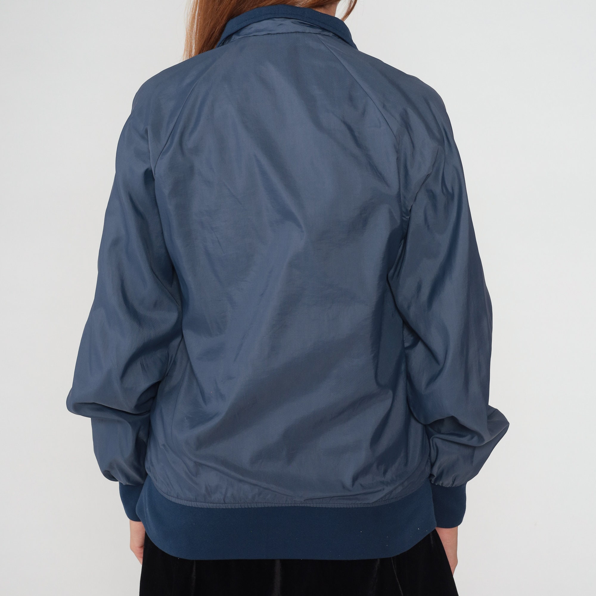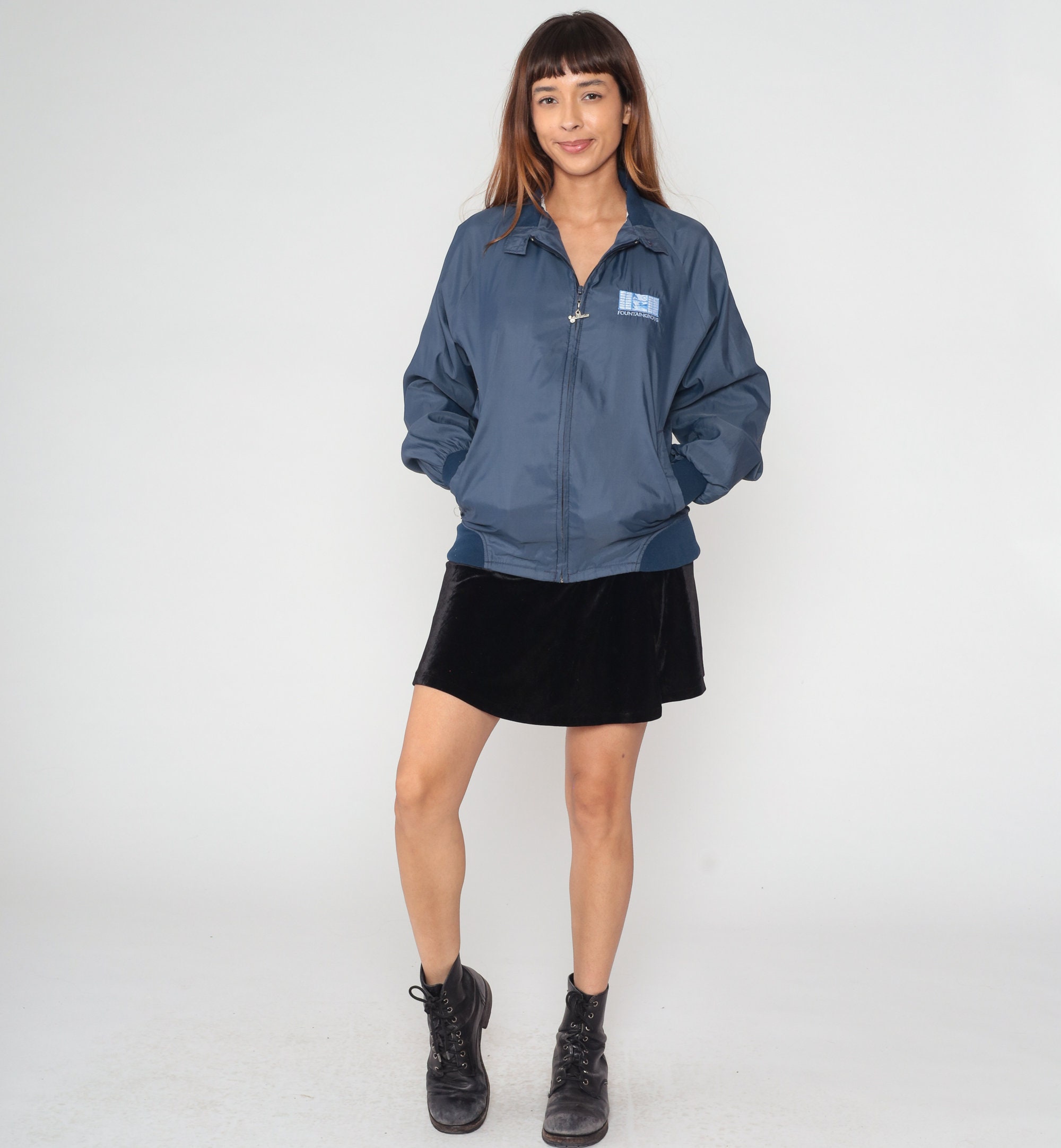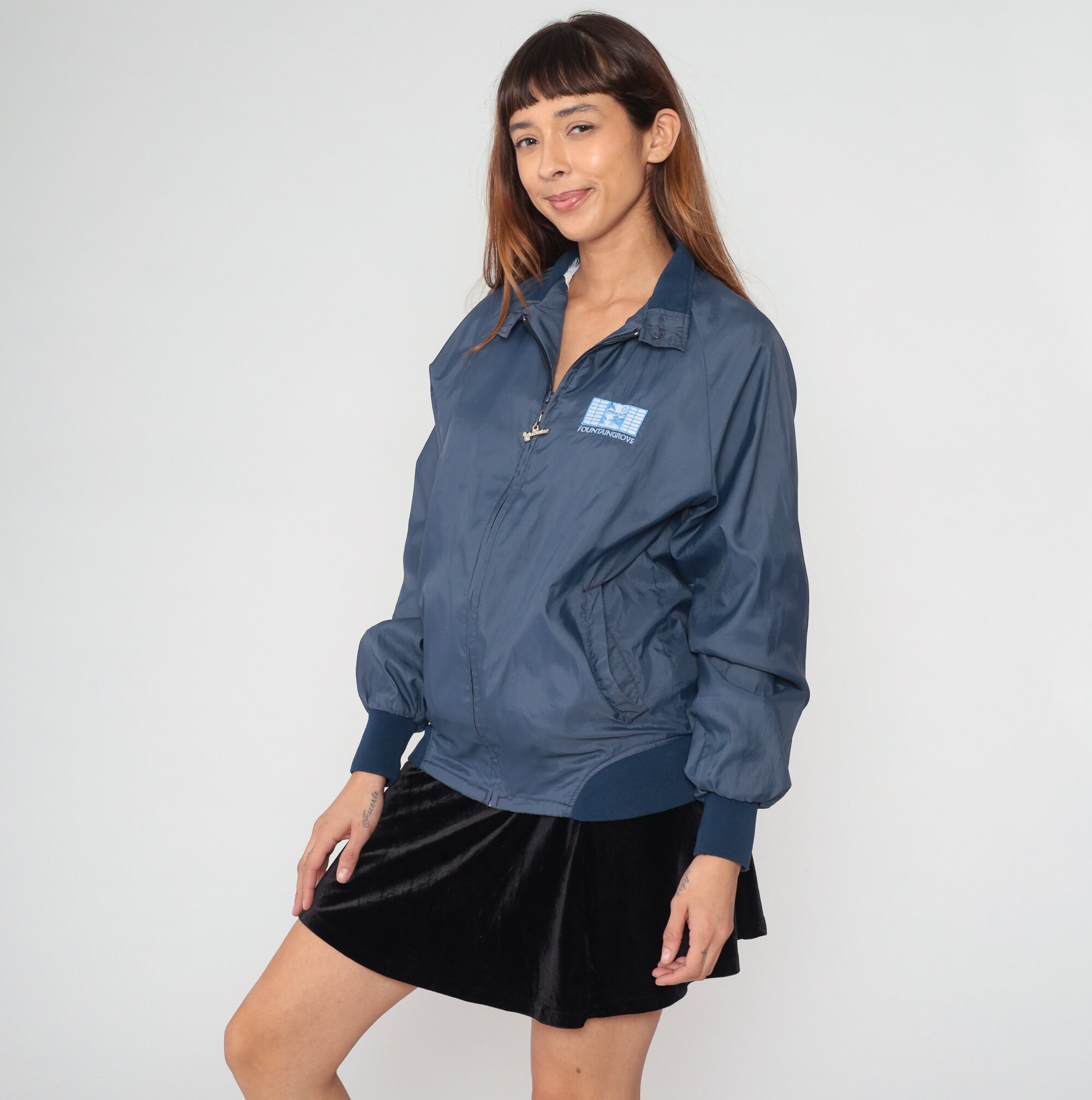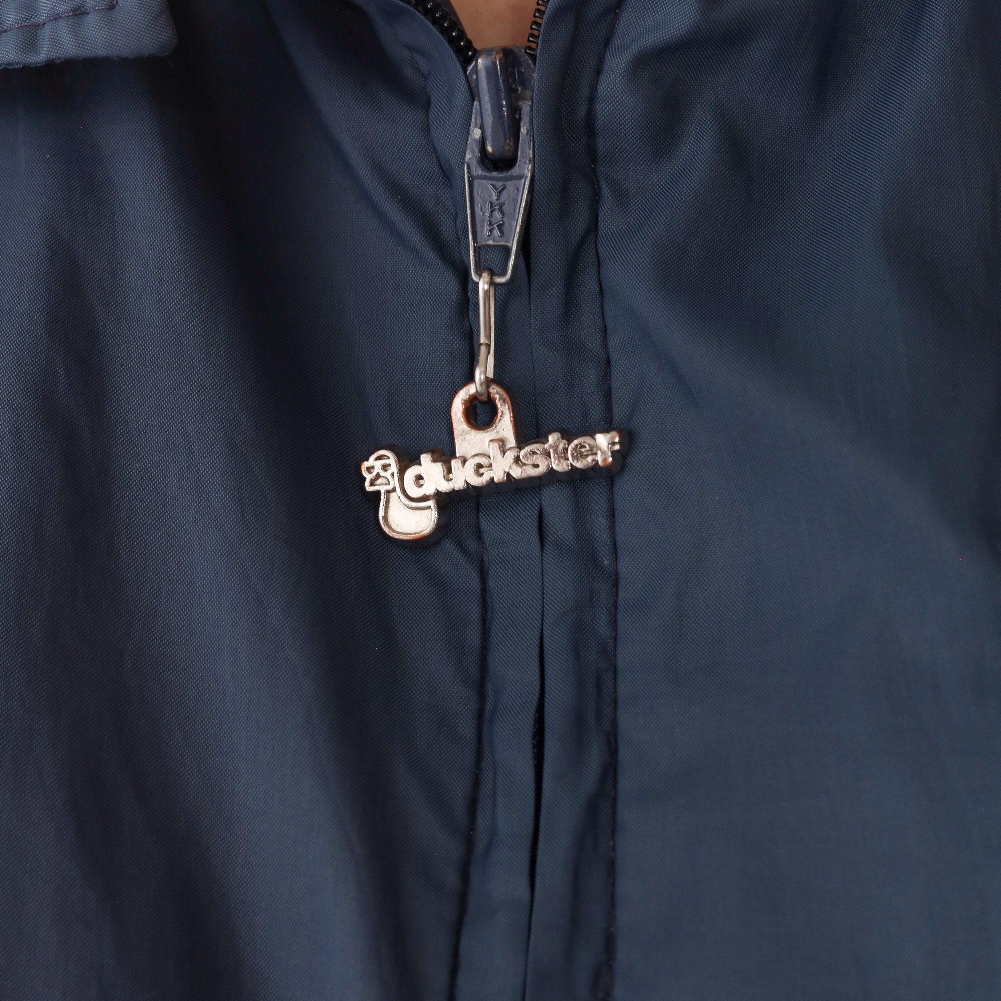 Vintage 90s windbreaker jacket in navy blue with a Fountaingrove logo on the chest and a Duckster logo zipper up the front.