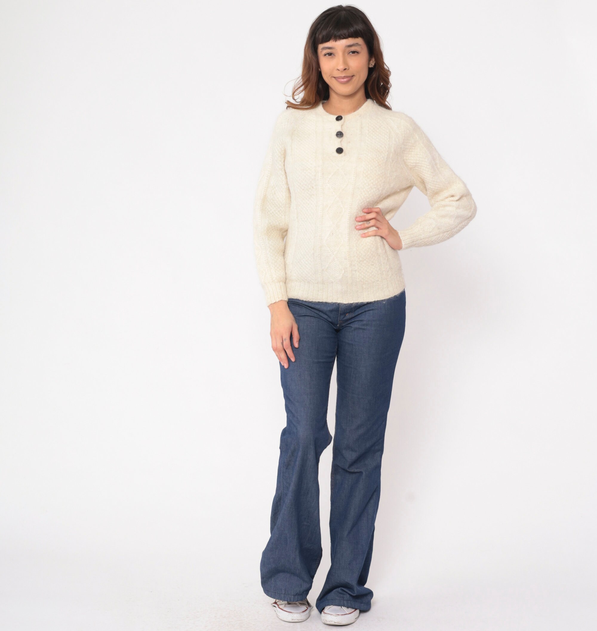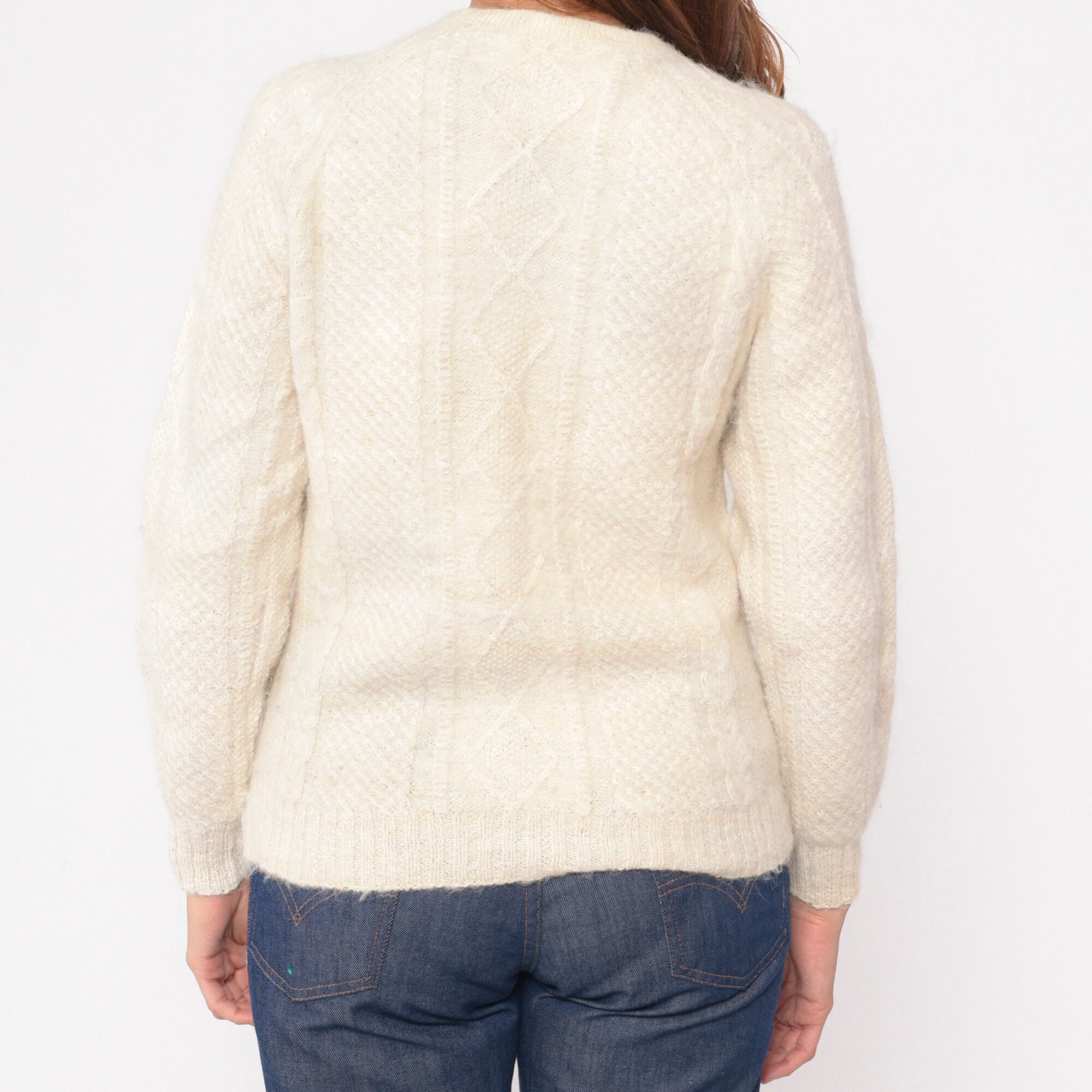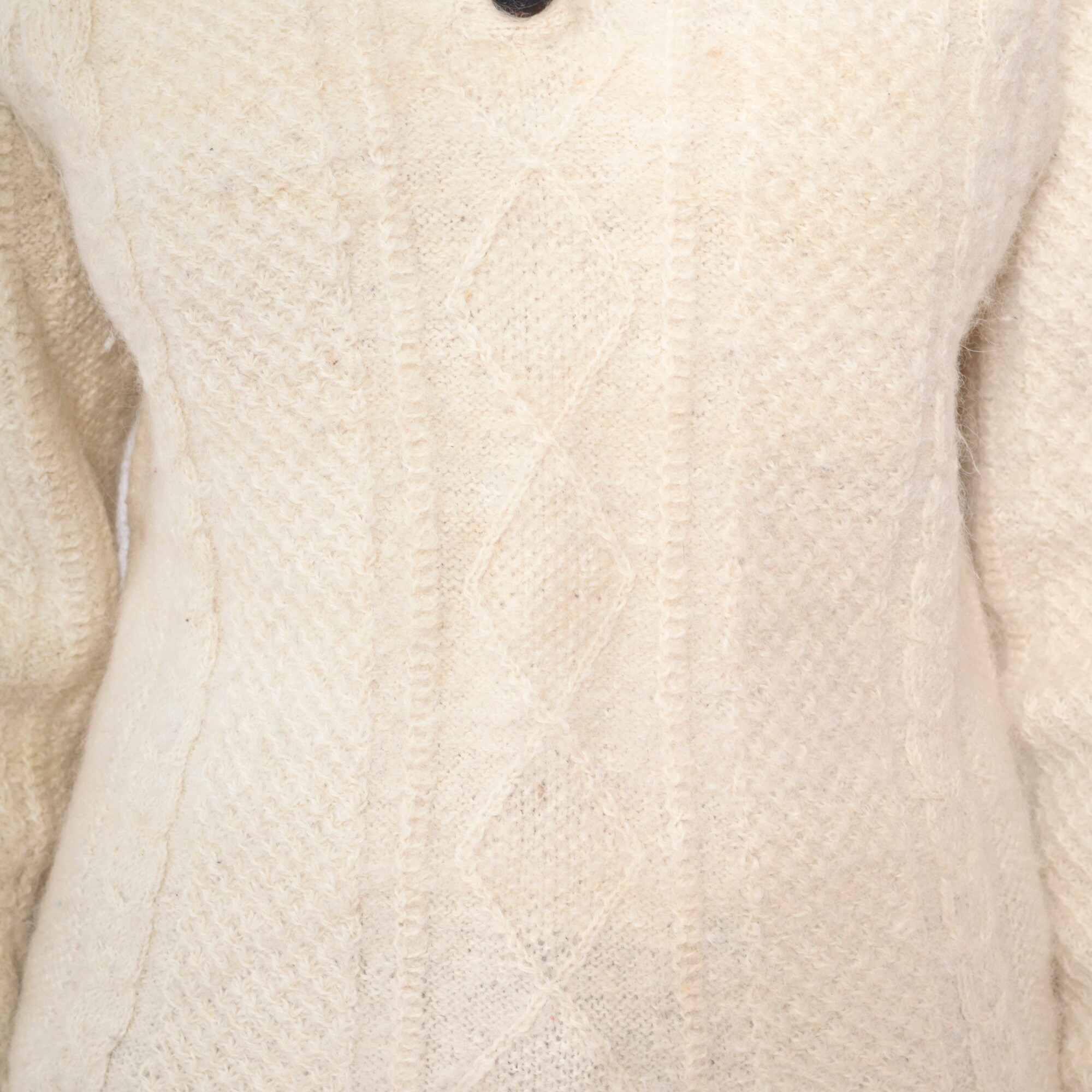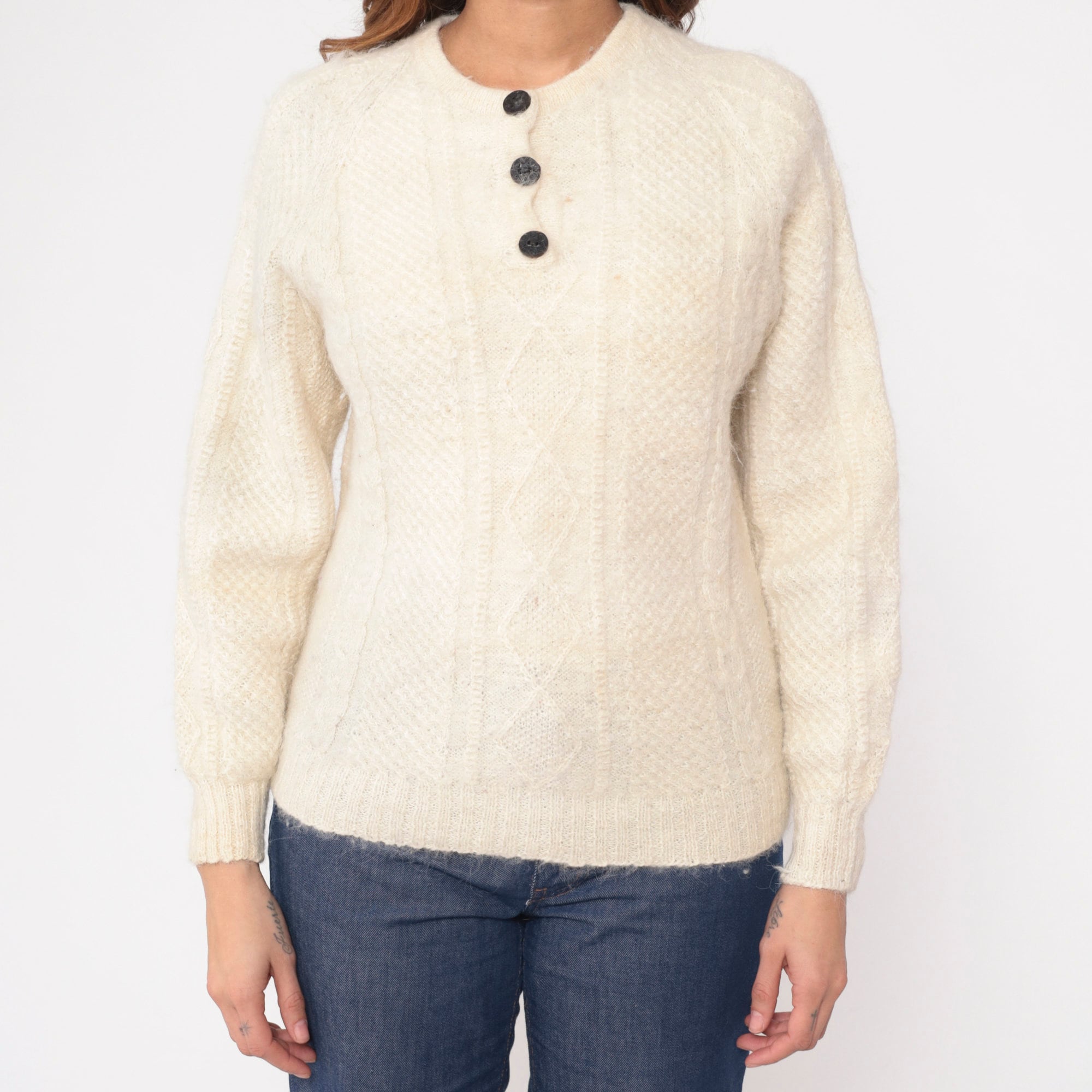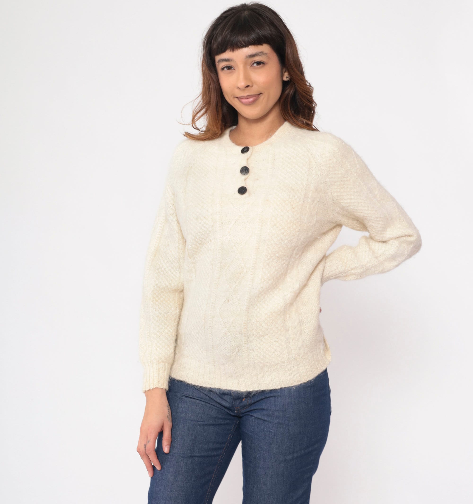 Vintage 80s sweater in cream alpaca wool knit with diamonds and cable knit. It features buttons up the chest and raglan sleeves.