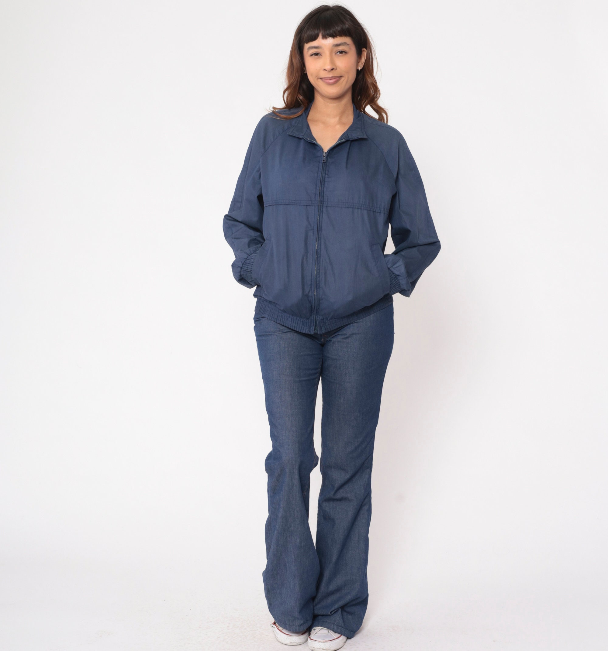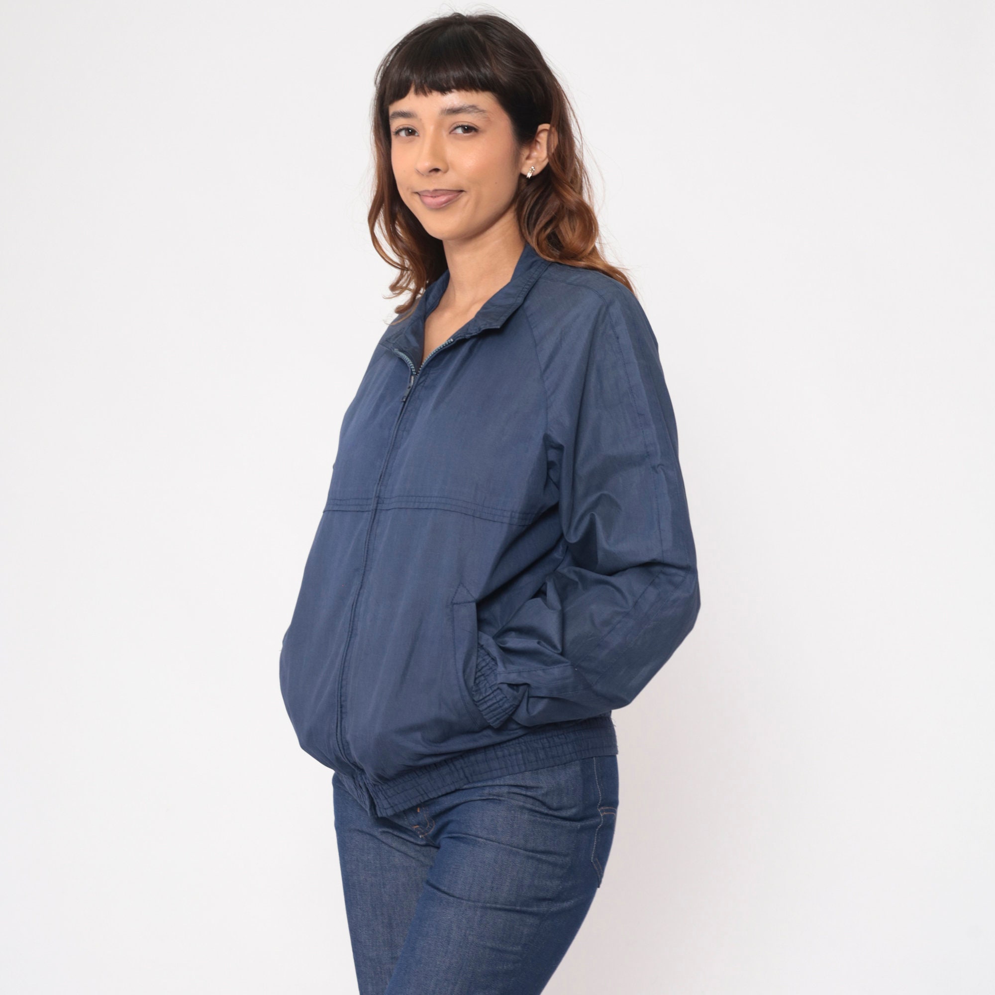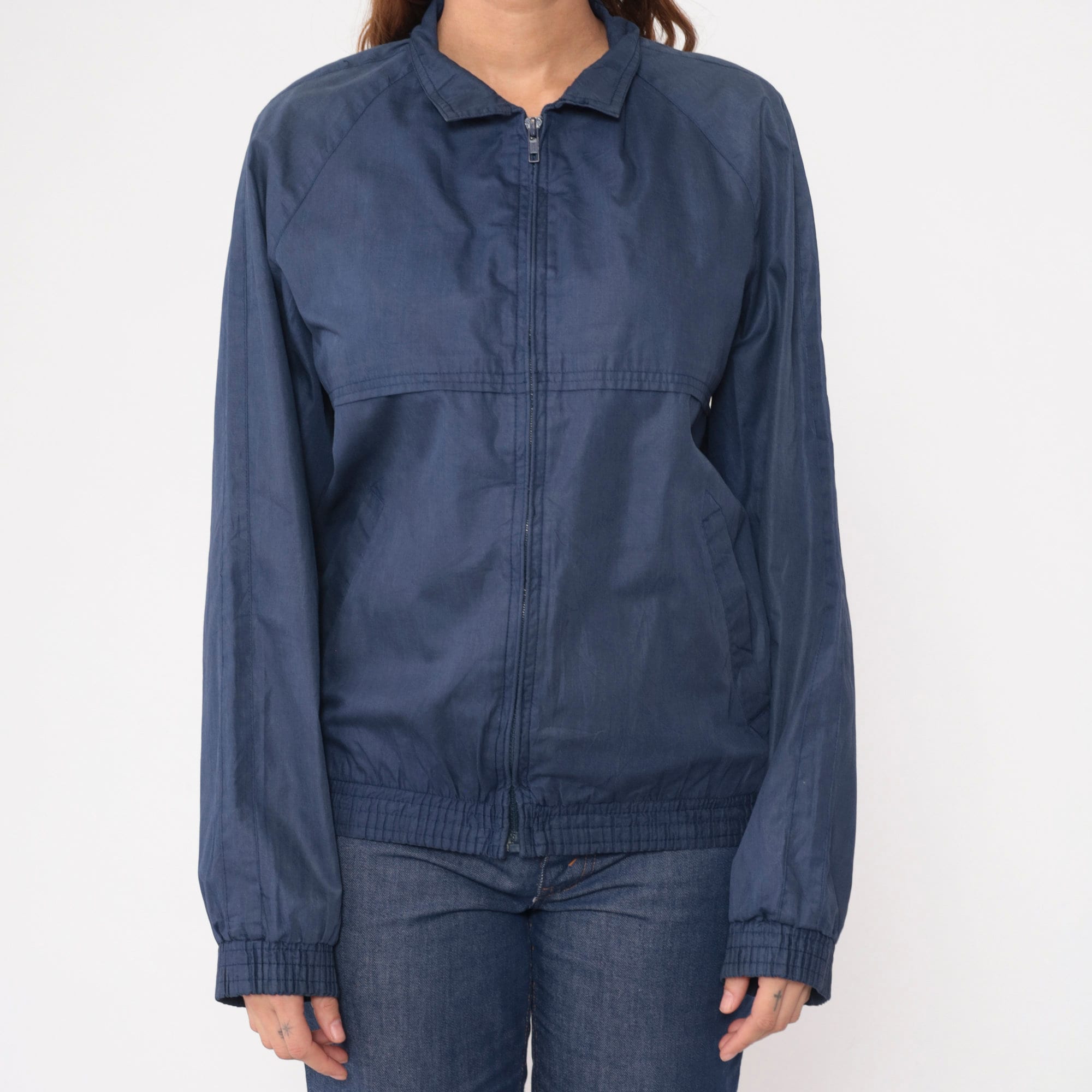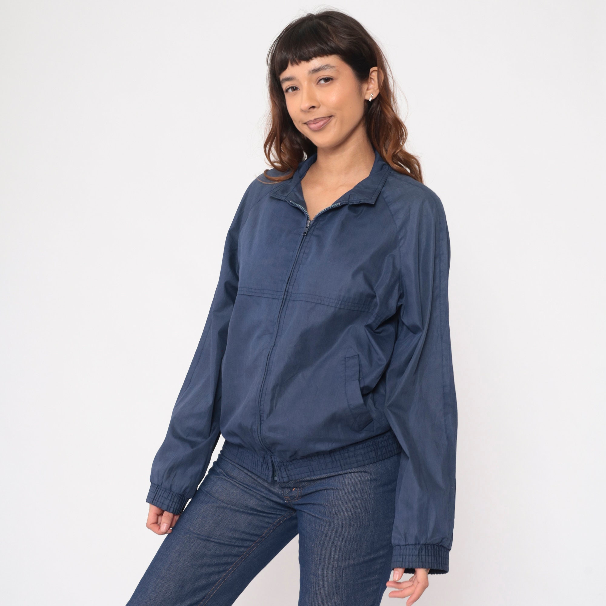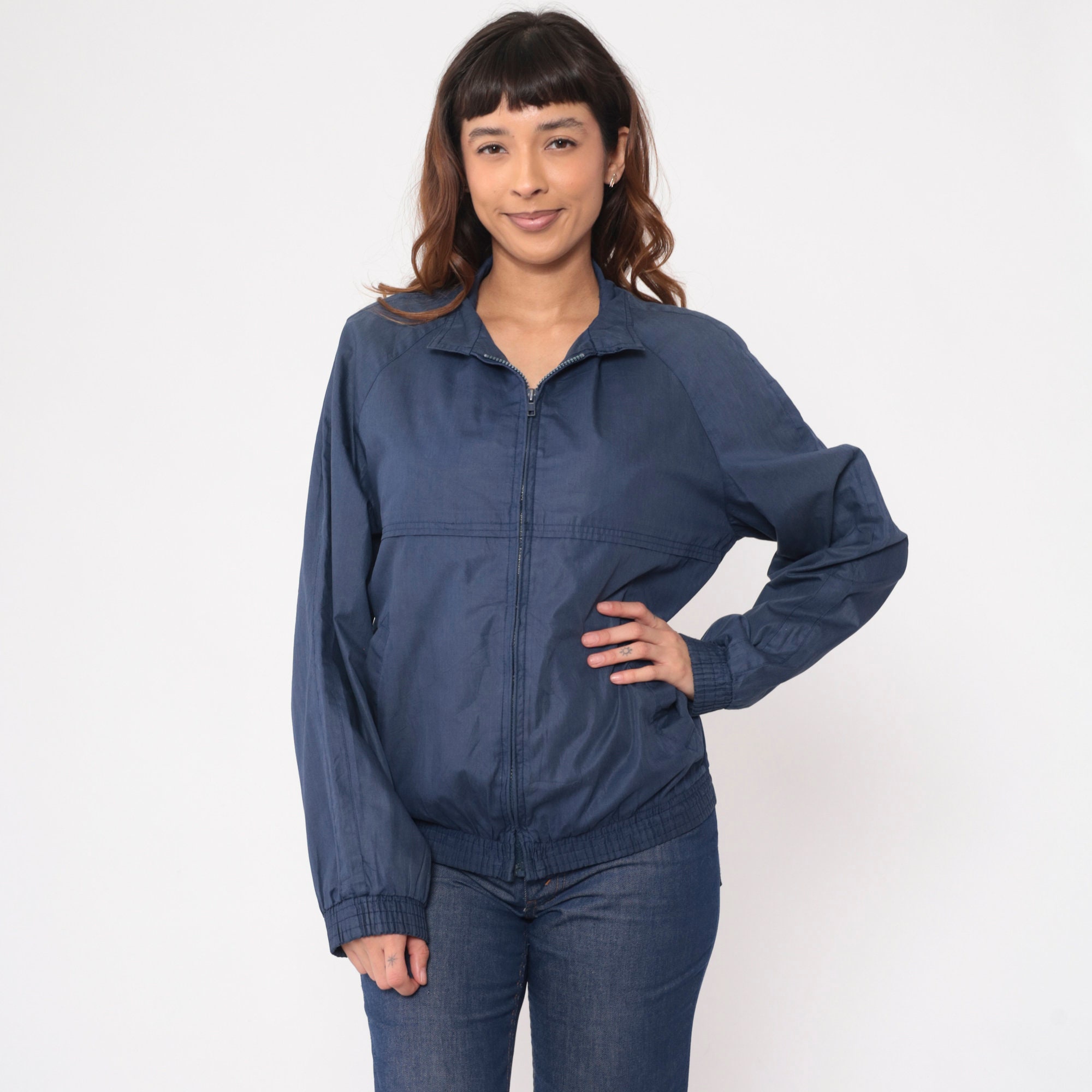 Vintage 80s jacket in navy blue with raglan sleeves and a full zip.