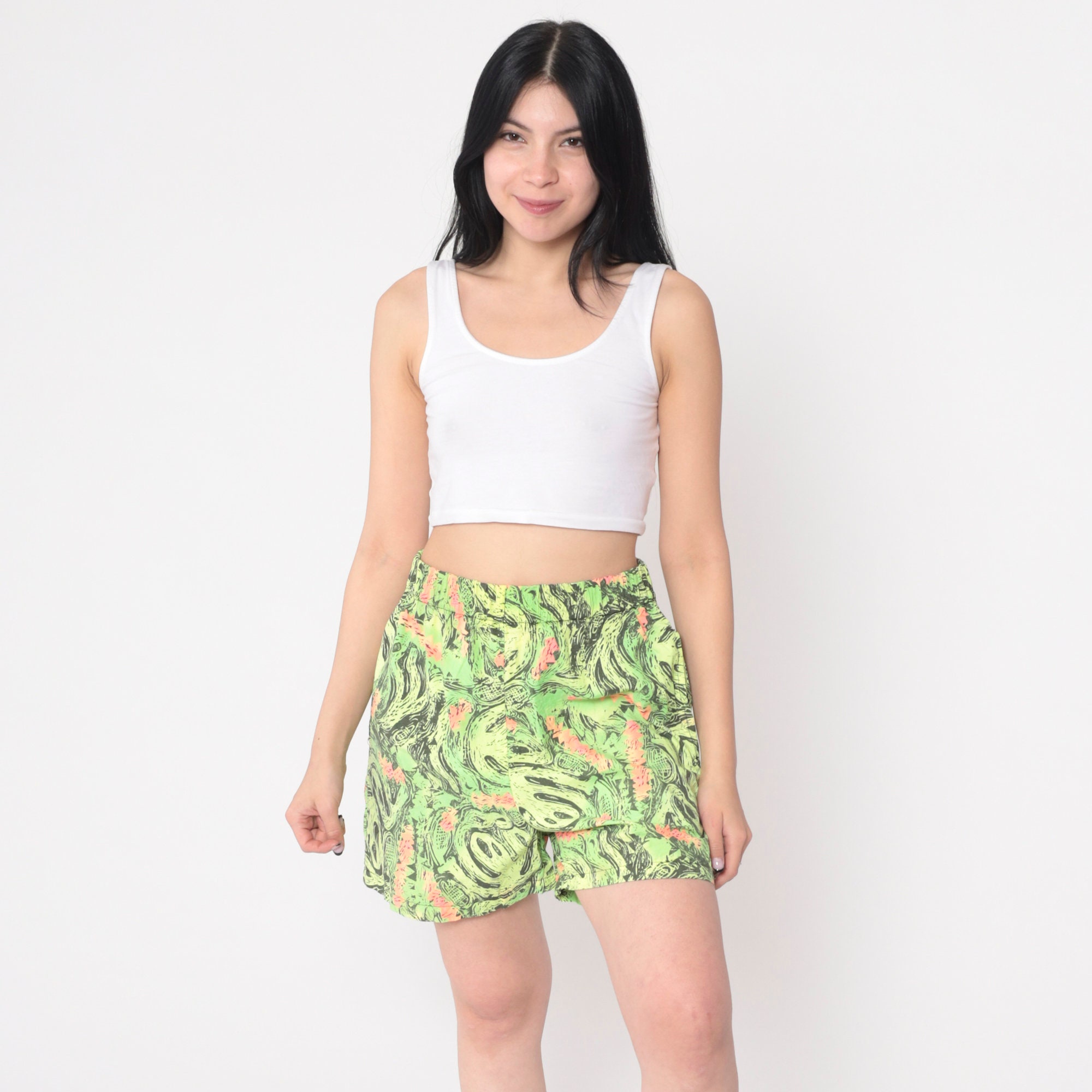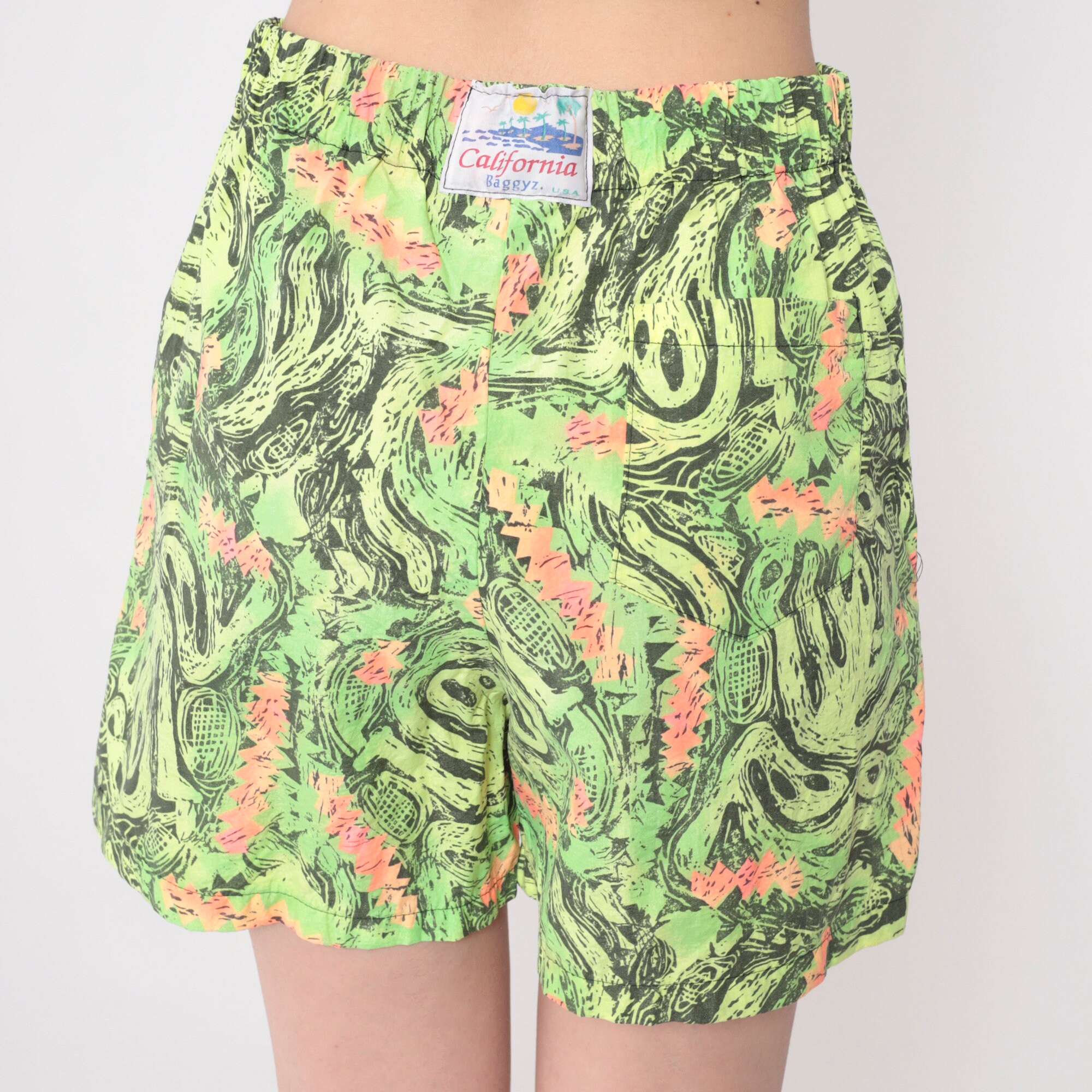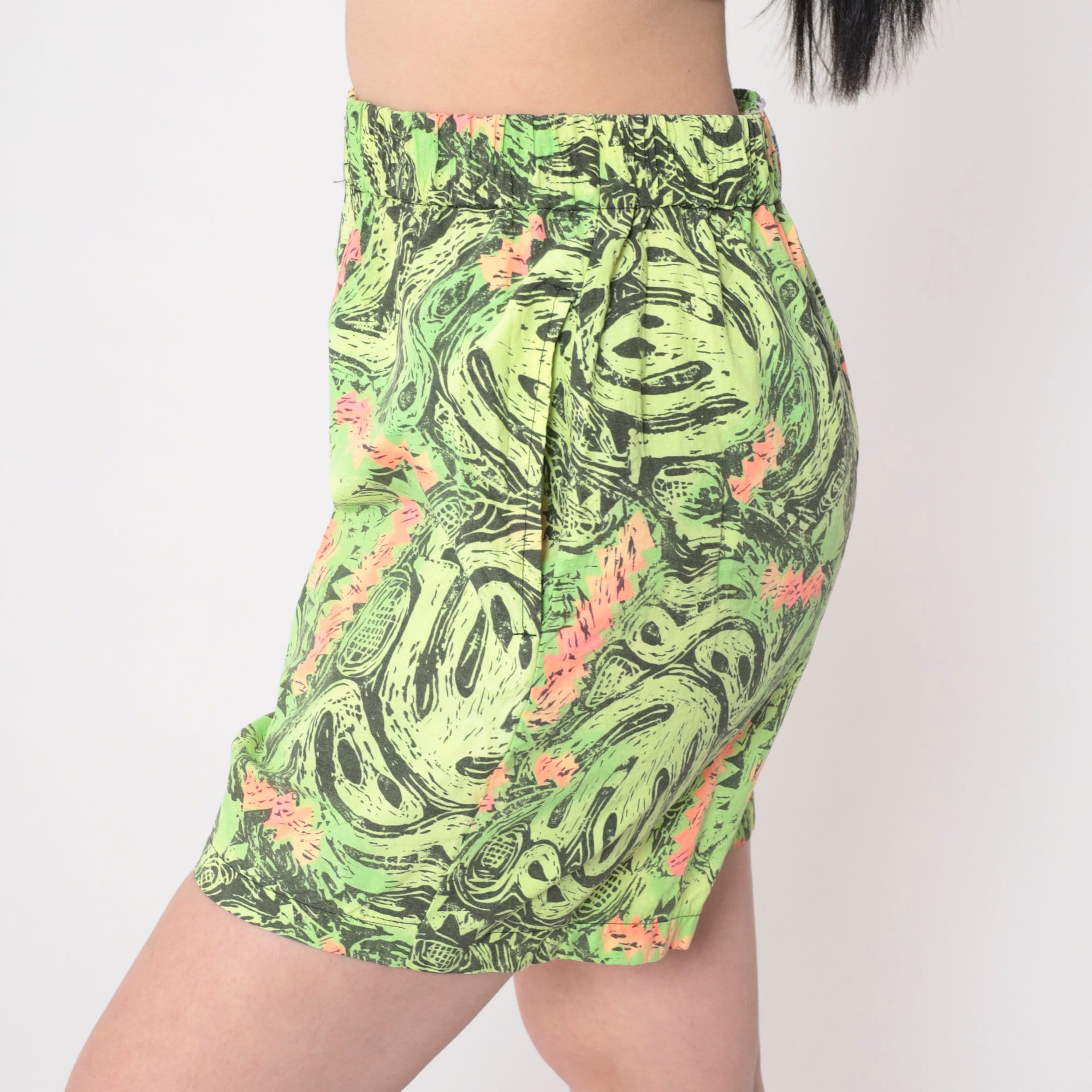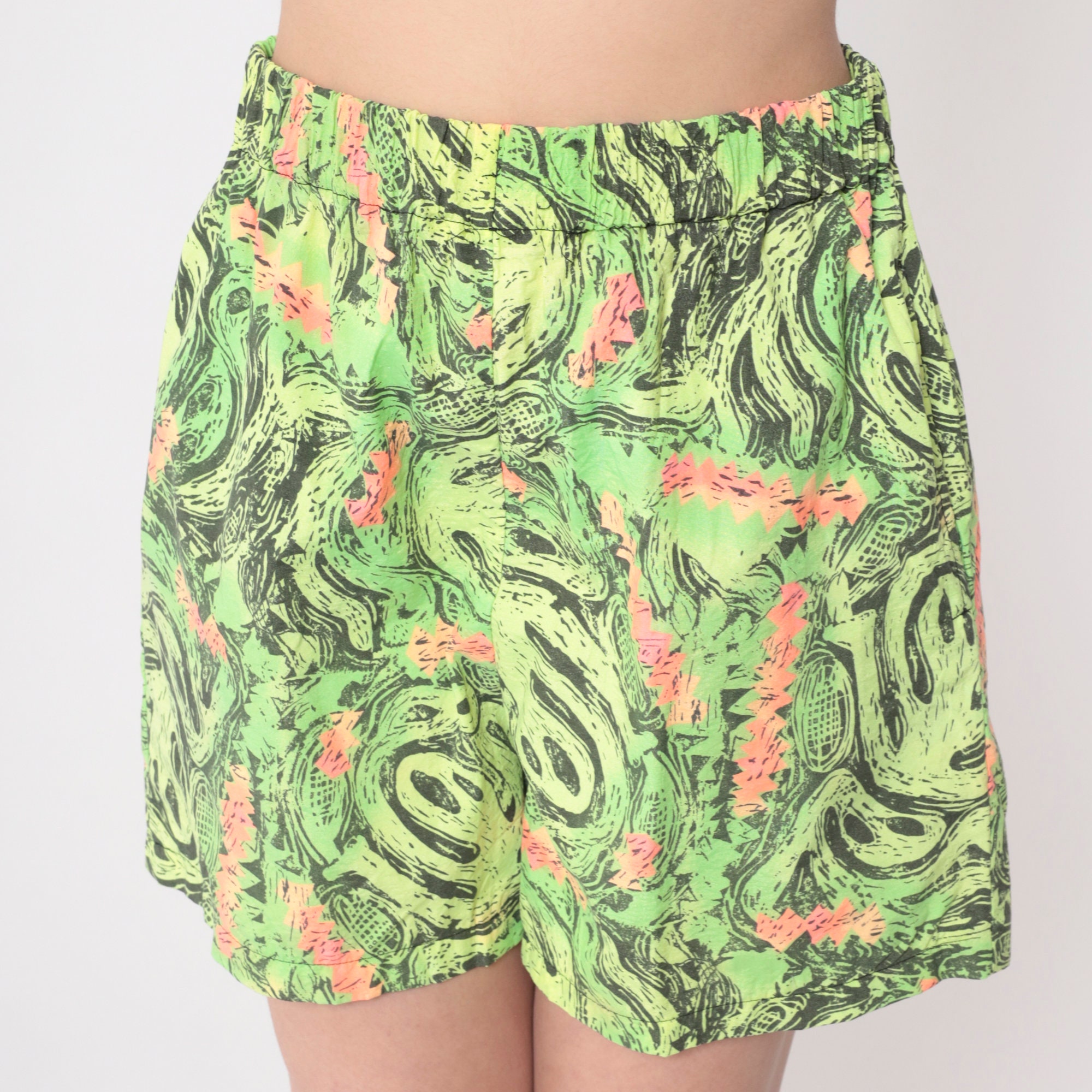 Vintage 80s shorts in neon with an abstract print that looks like aliens. Baggy fit with an elastic waist.