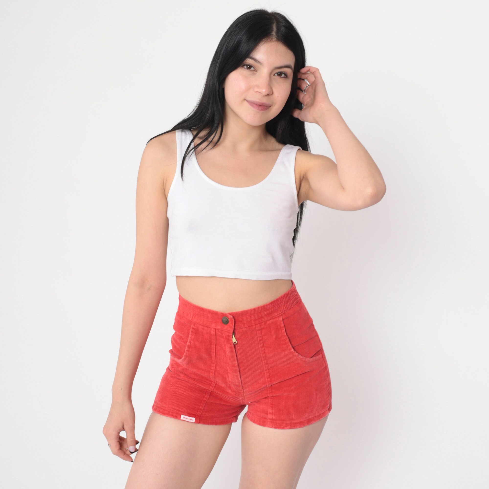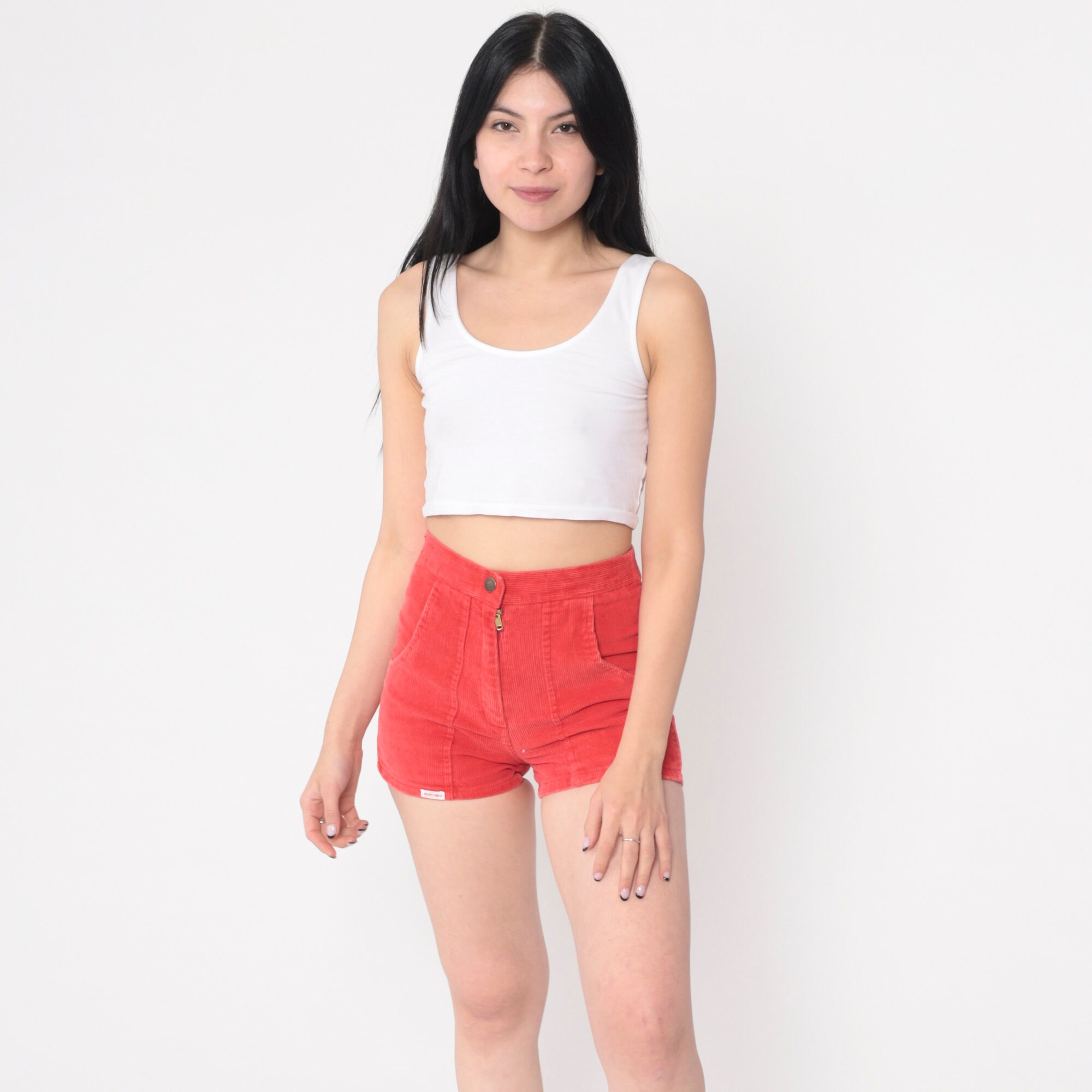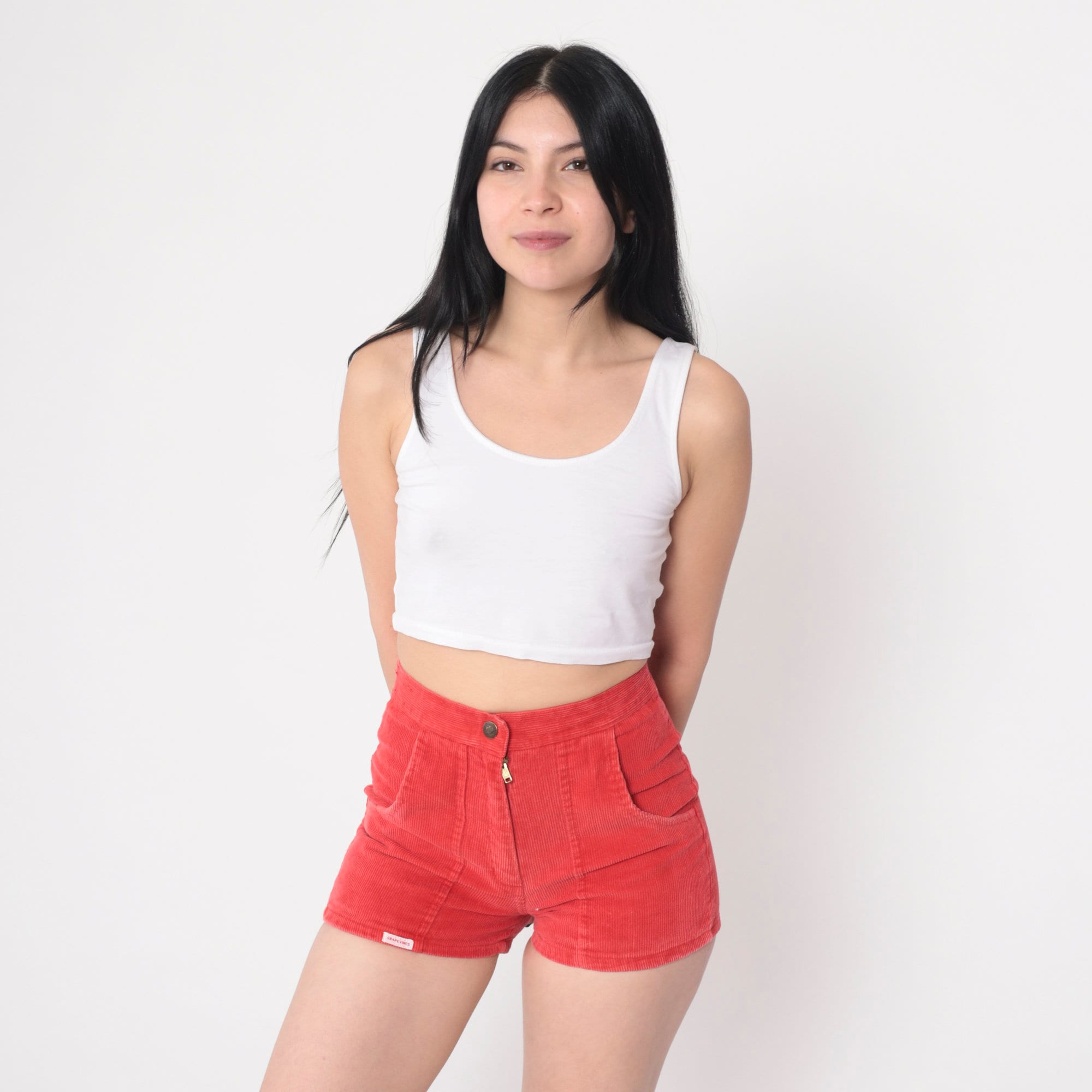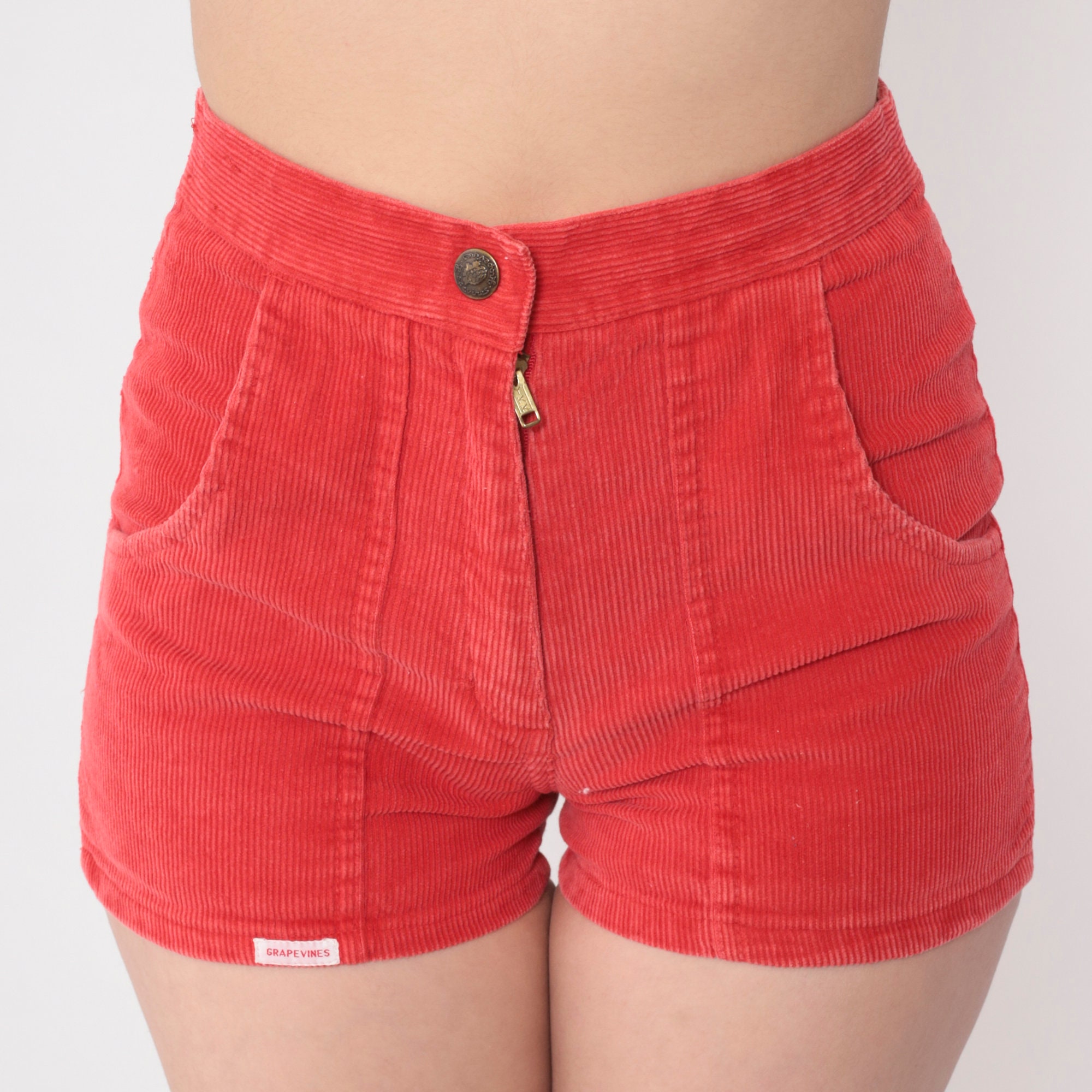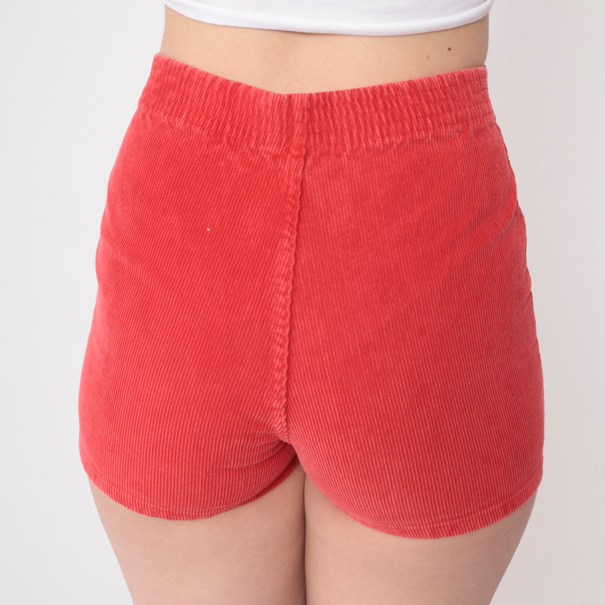 Vintage 80s shorts in red corduroy with patch pockets in the front and elastic at the back of the waist. Zipper fly.