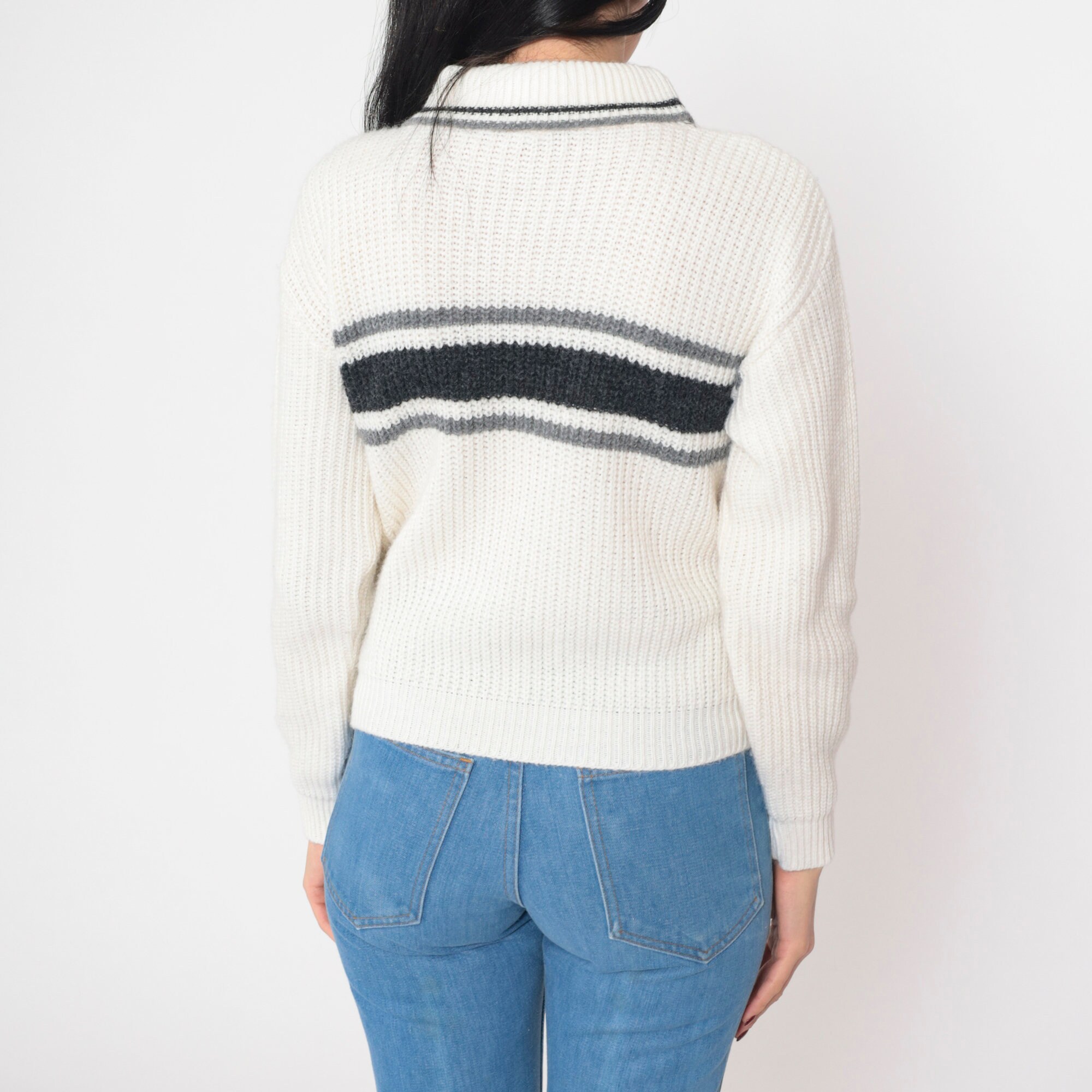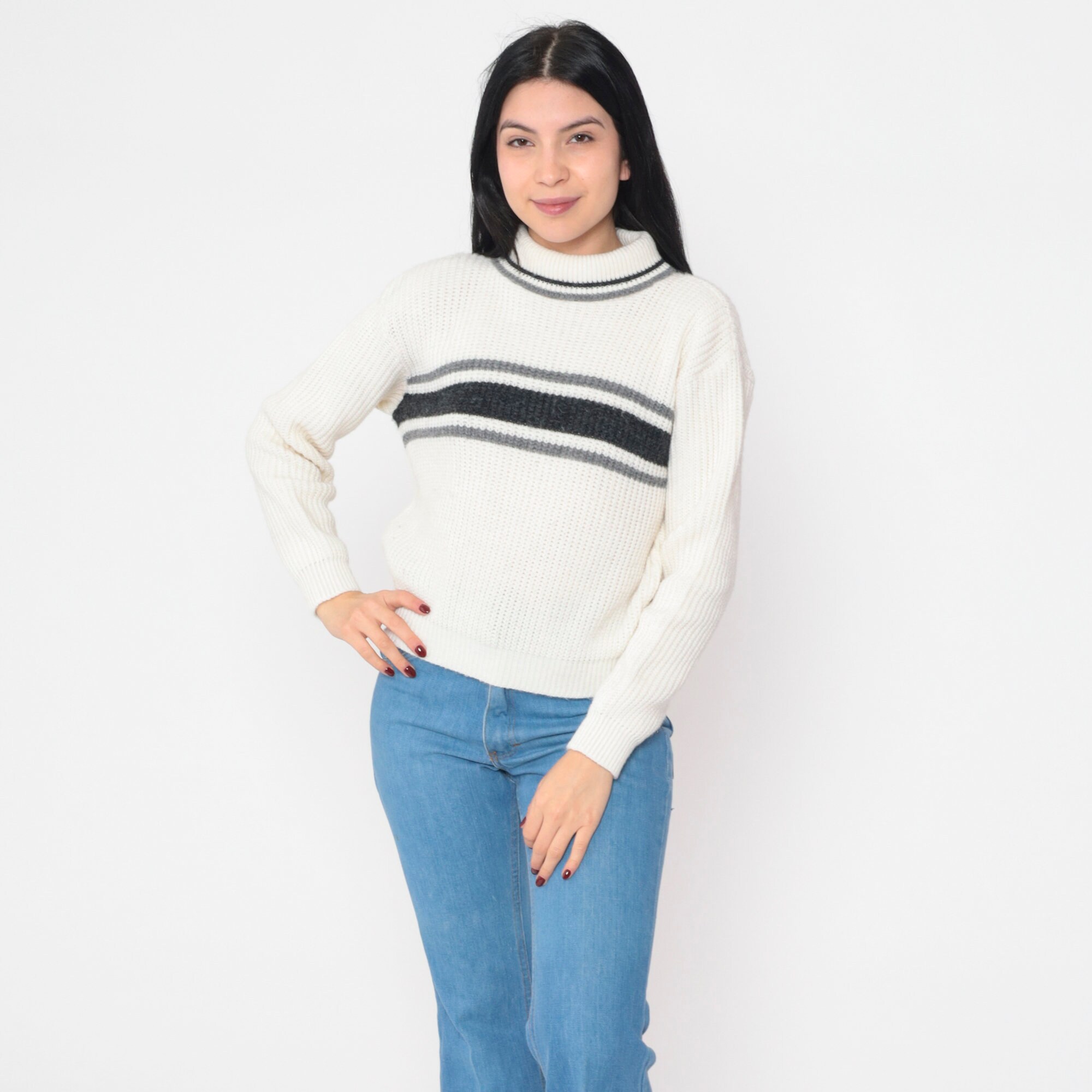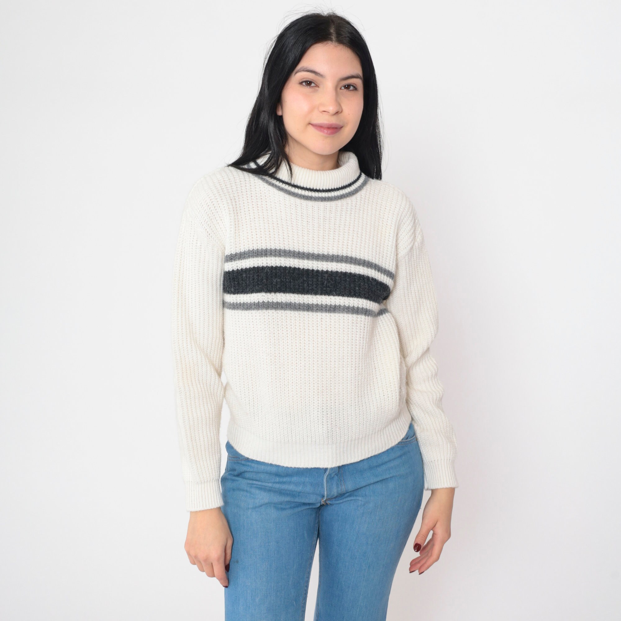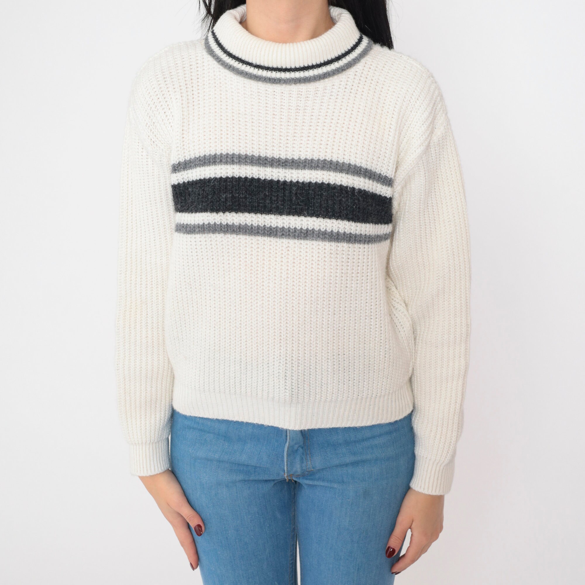 Vintage 80s sweater in white knit with black and grey stripes and a turtleneck.