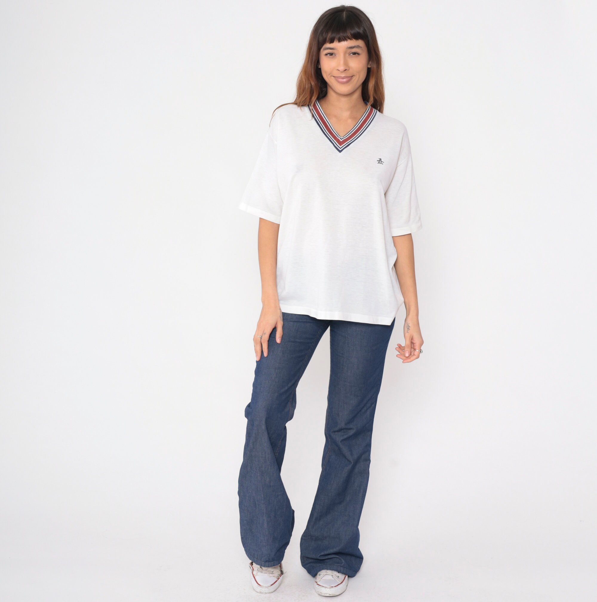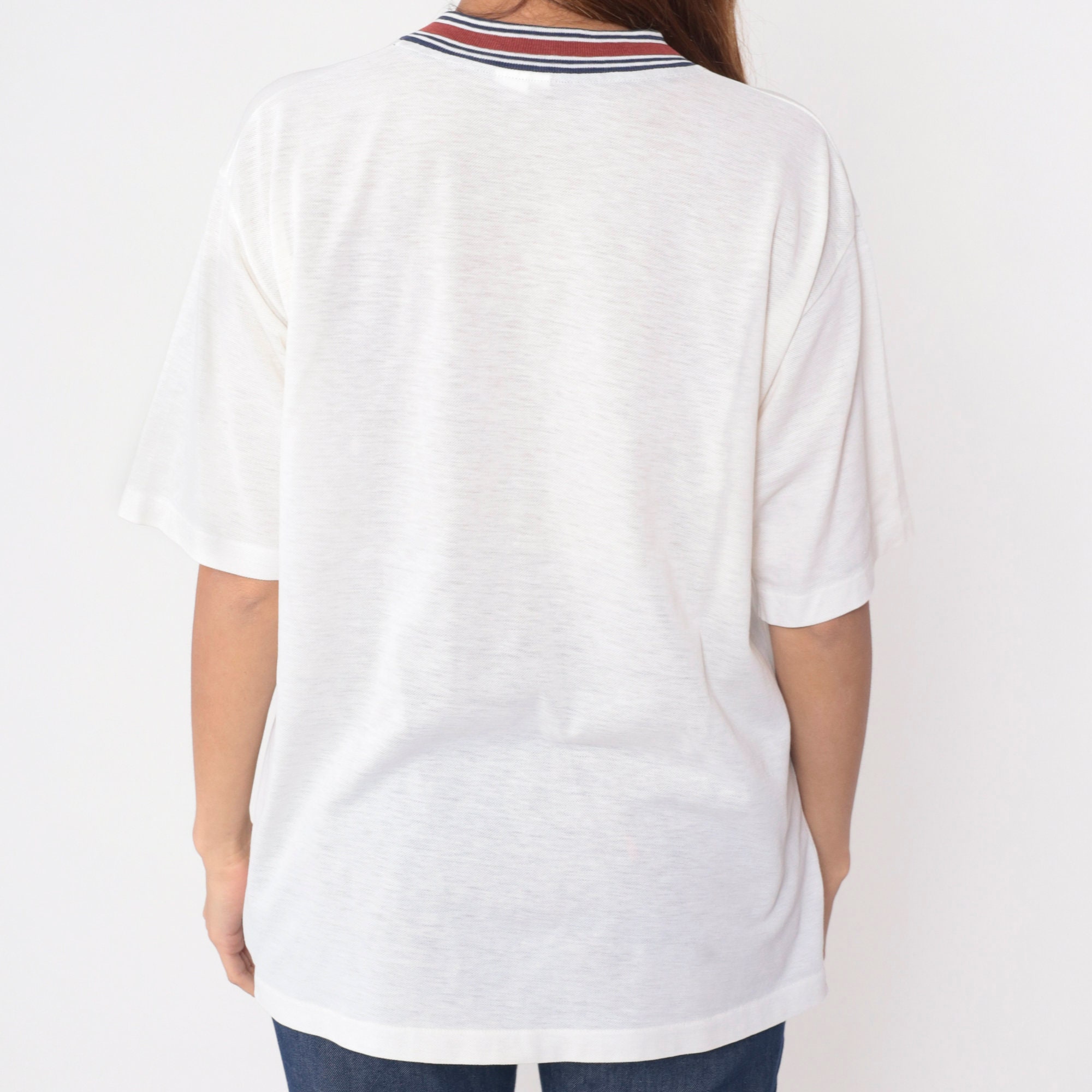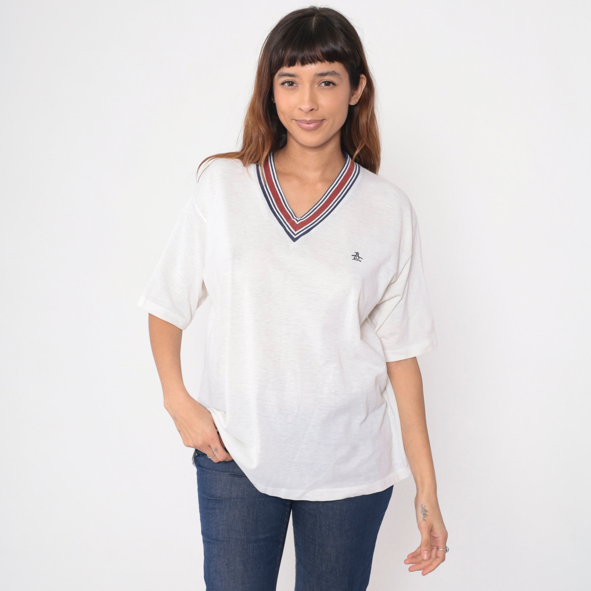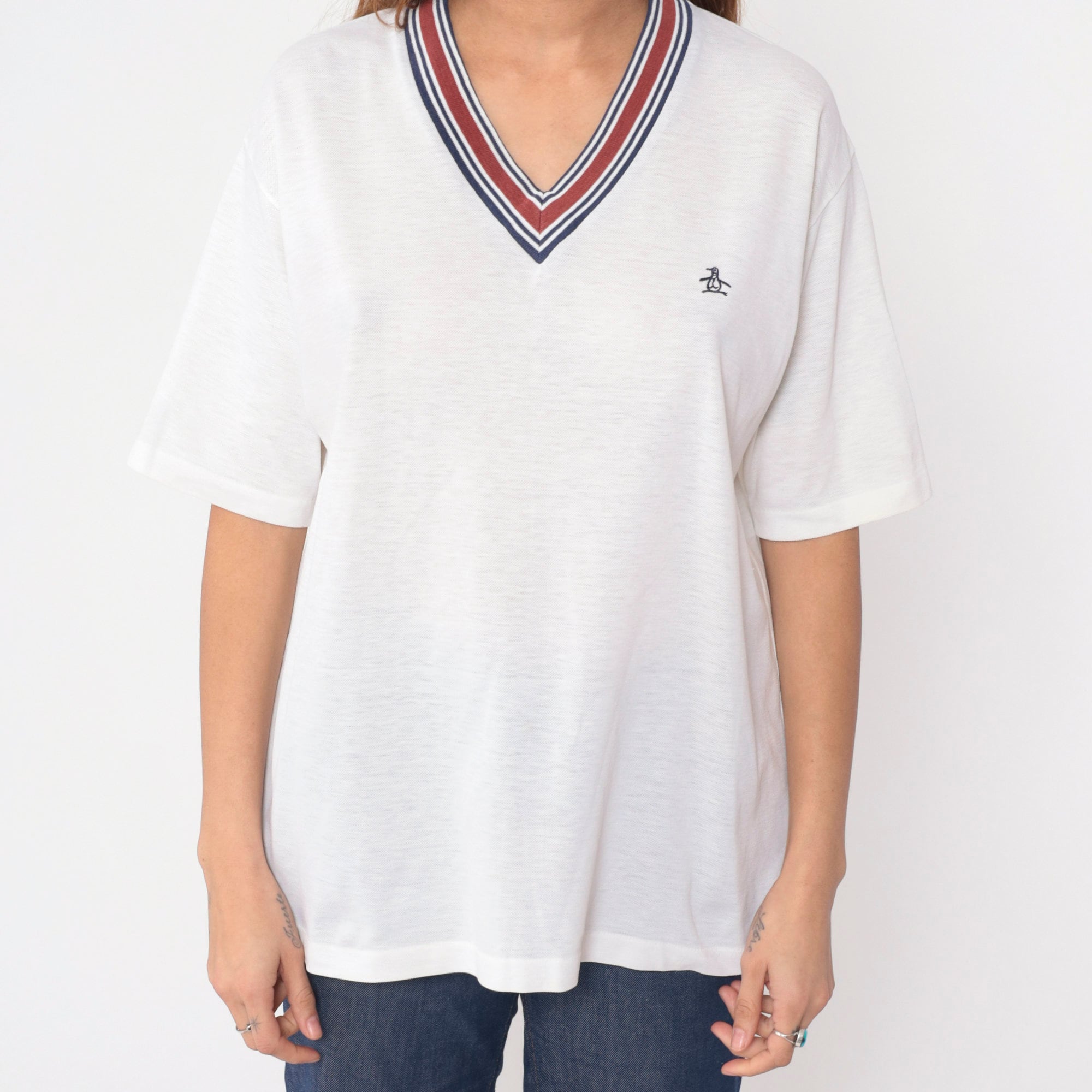 Vintage 80s t shirt by Grand Slam Munsingwear in white with a ringer v neck and the penguin logo on the chest.
