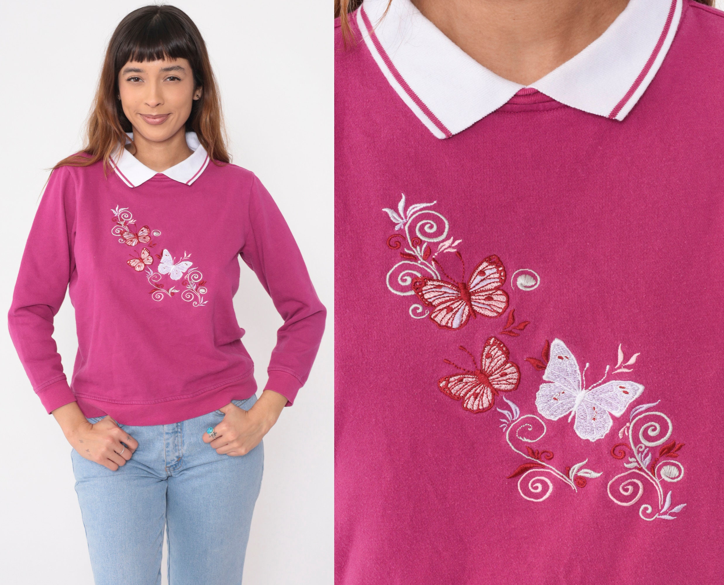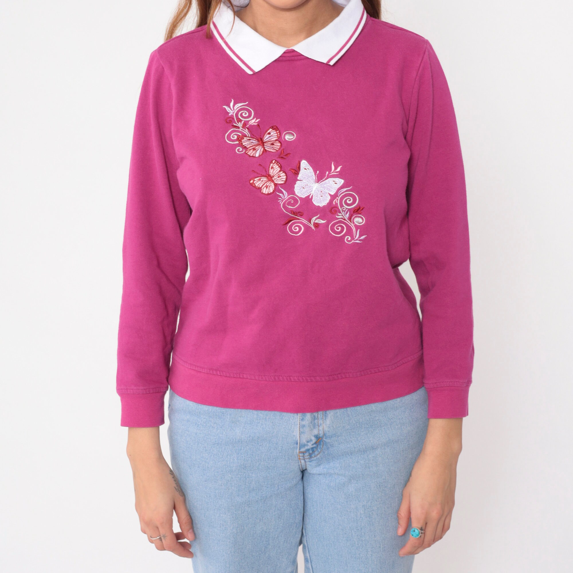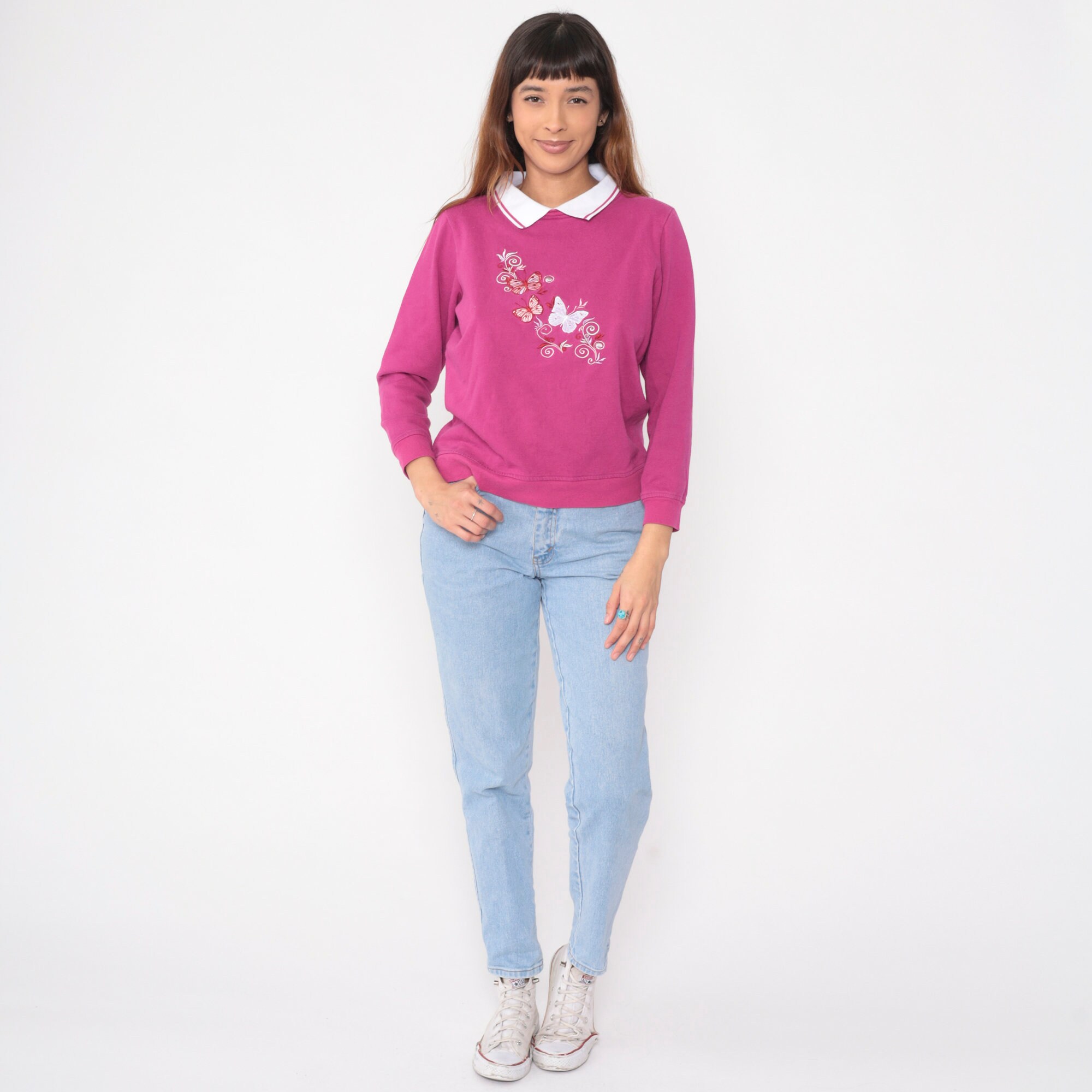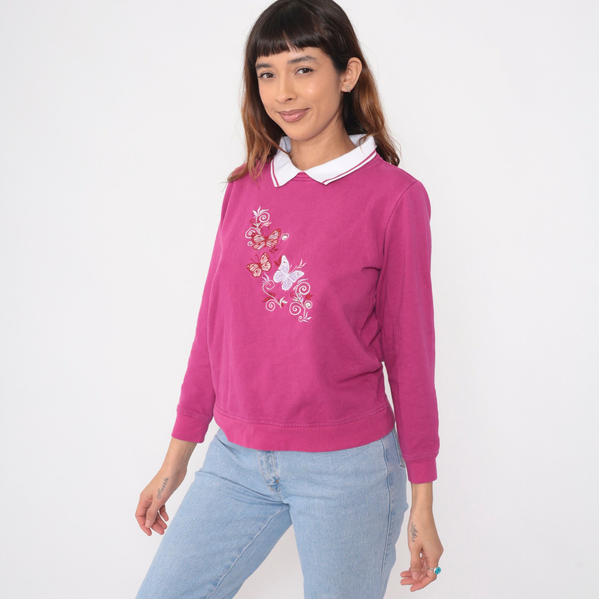 Vintage 90s sweatshirt with embroidered butterflies and a white collar.