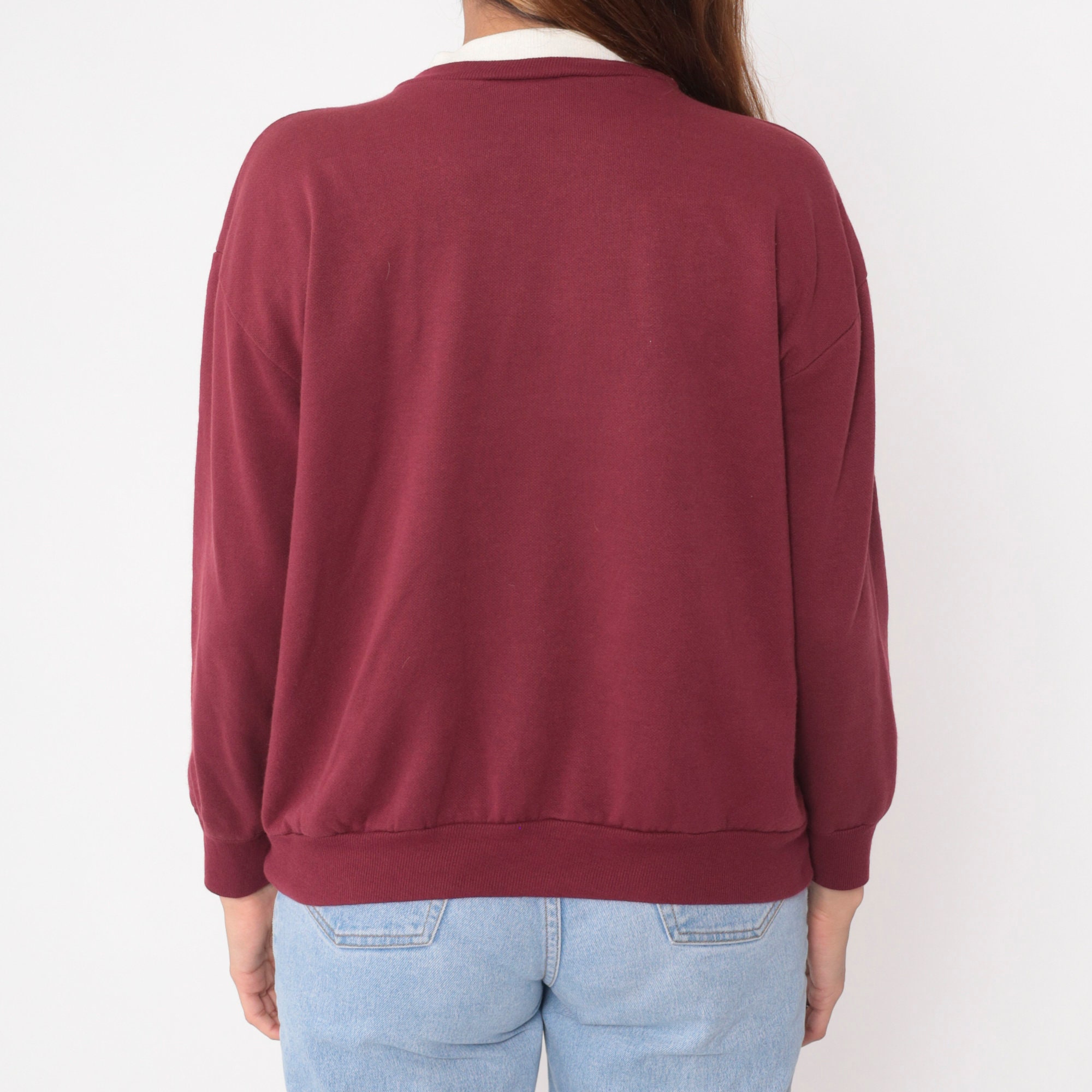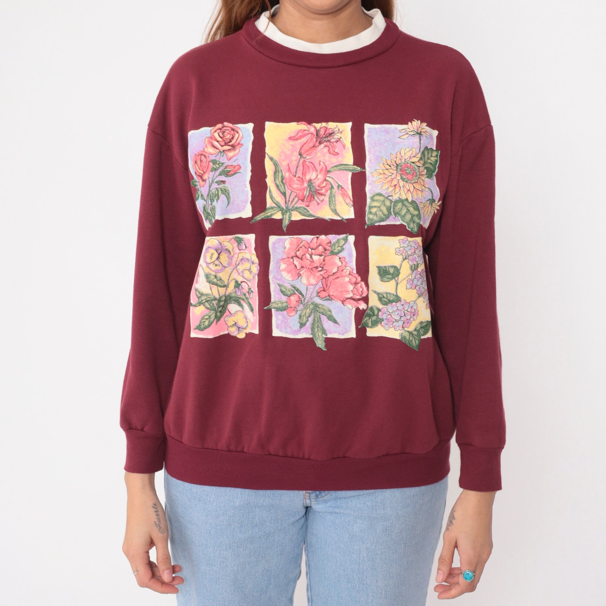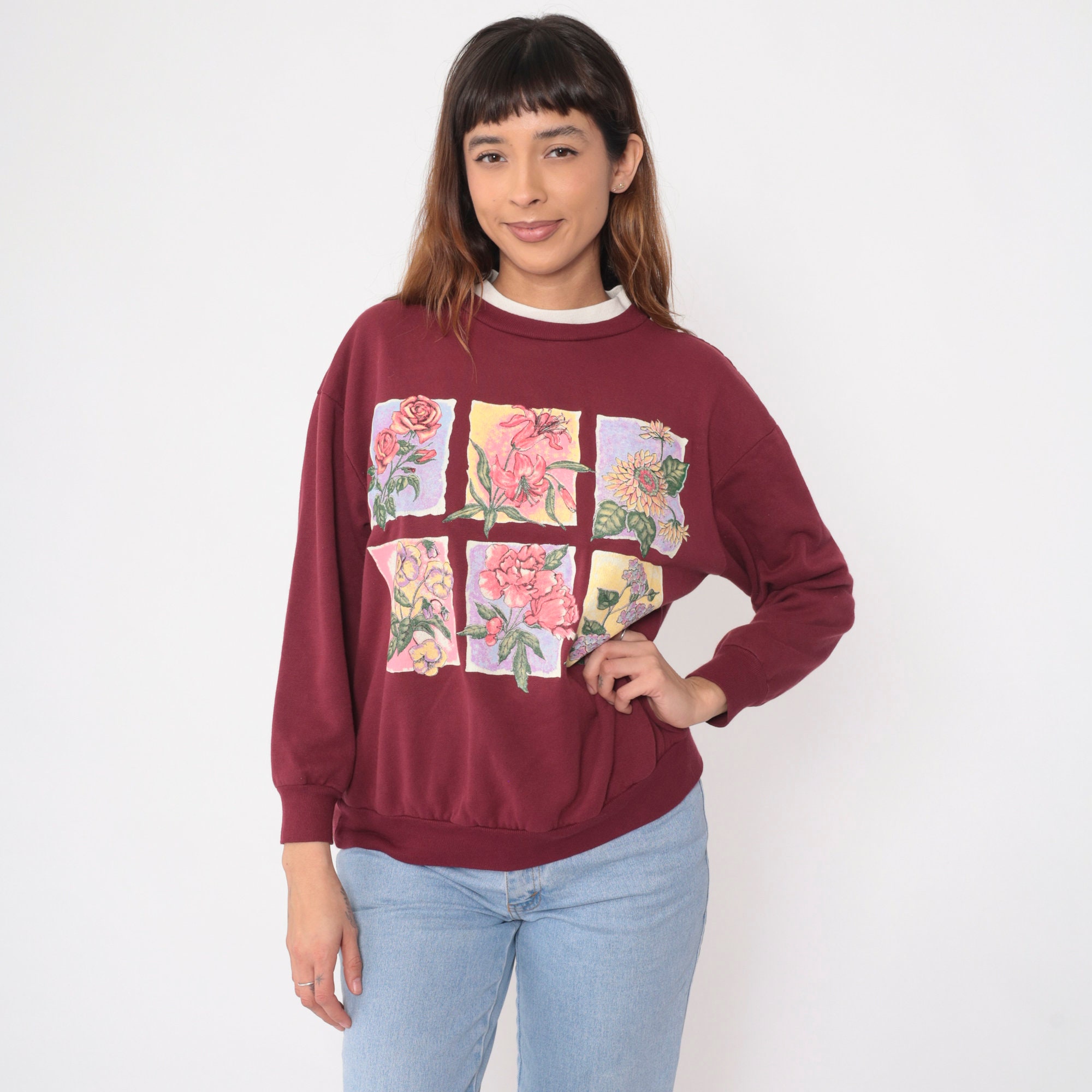 Vintage 90s sweatshirt in burgundy with a floral print on the chest and a double collar.