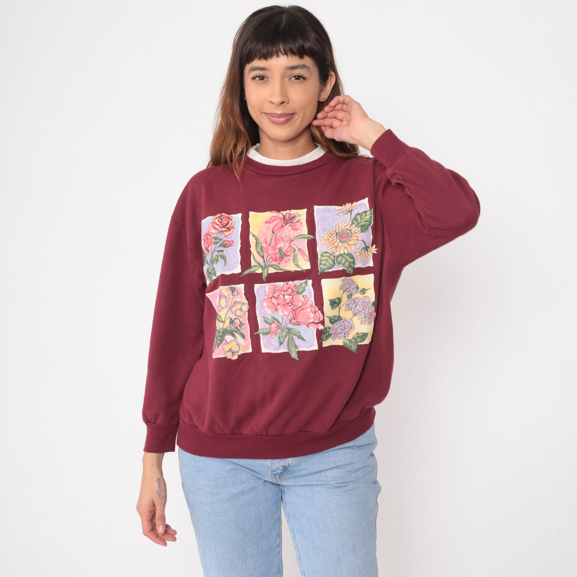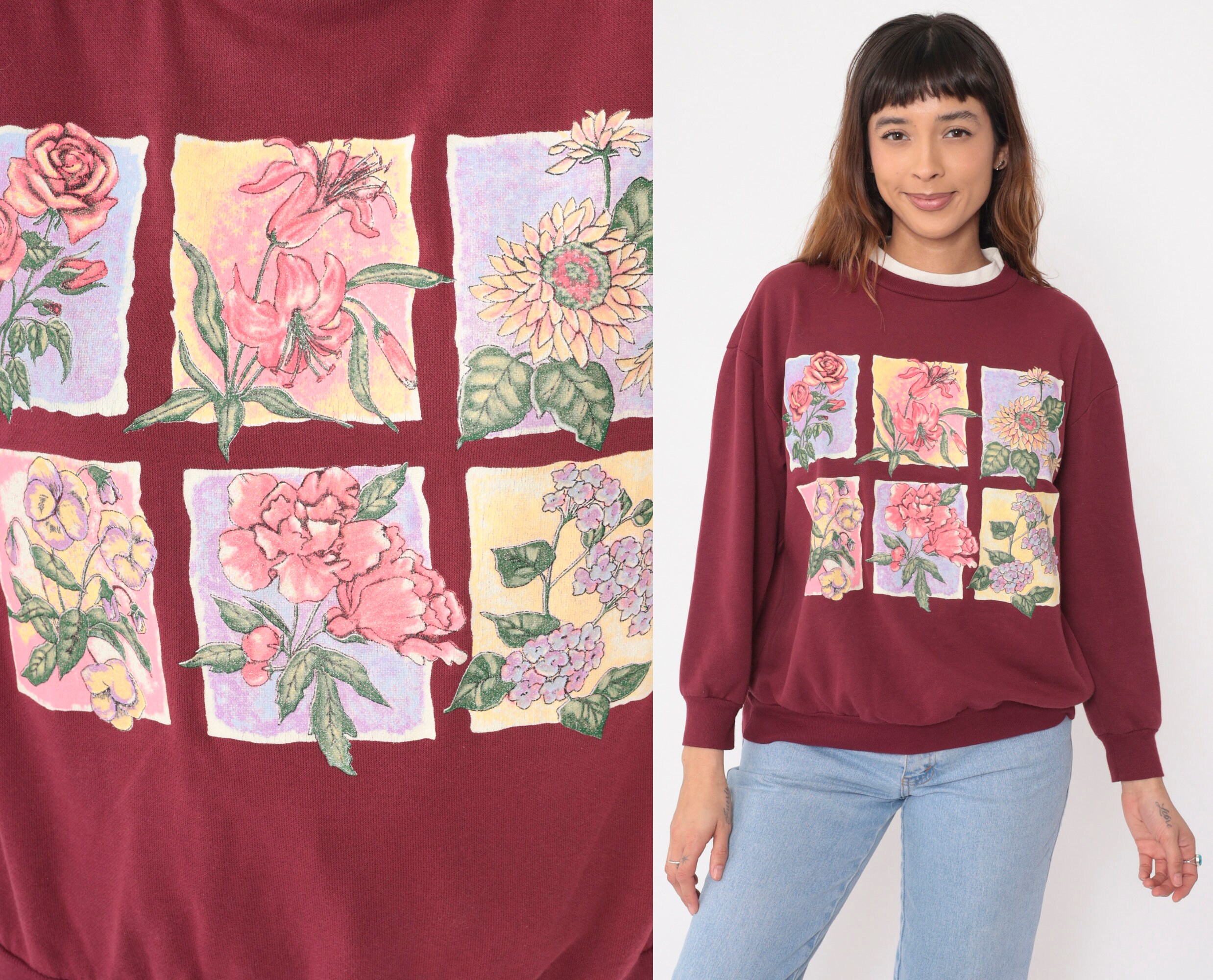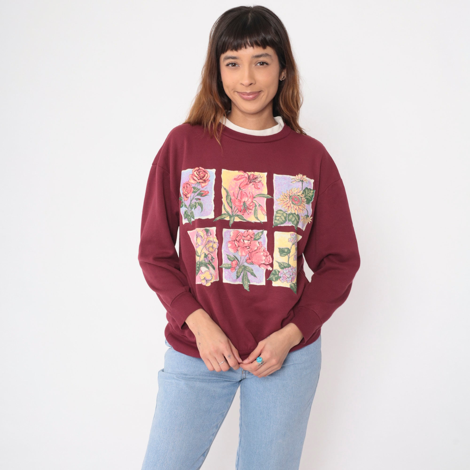 Vintage 90s sweatshirt in burgundy with a floral print on the chest and a double collar.