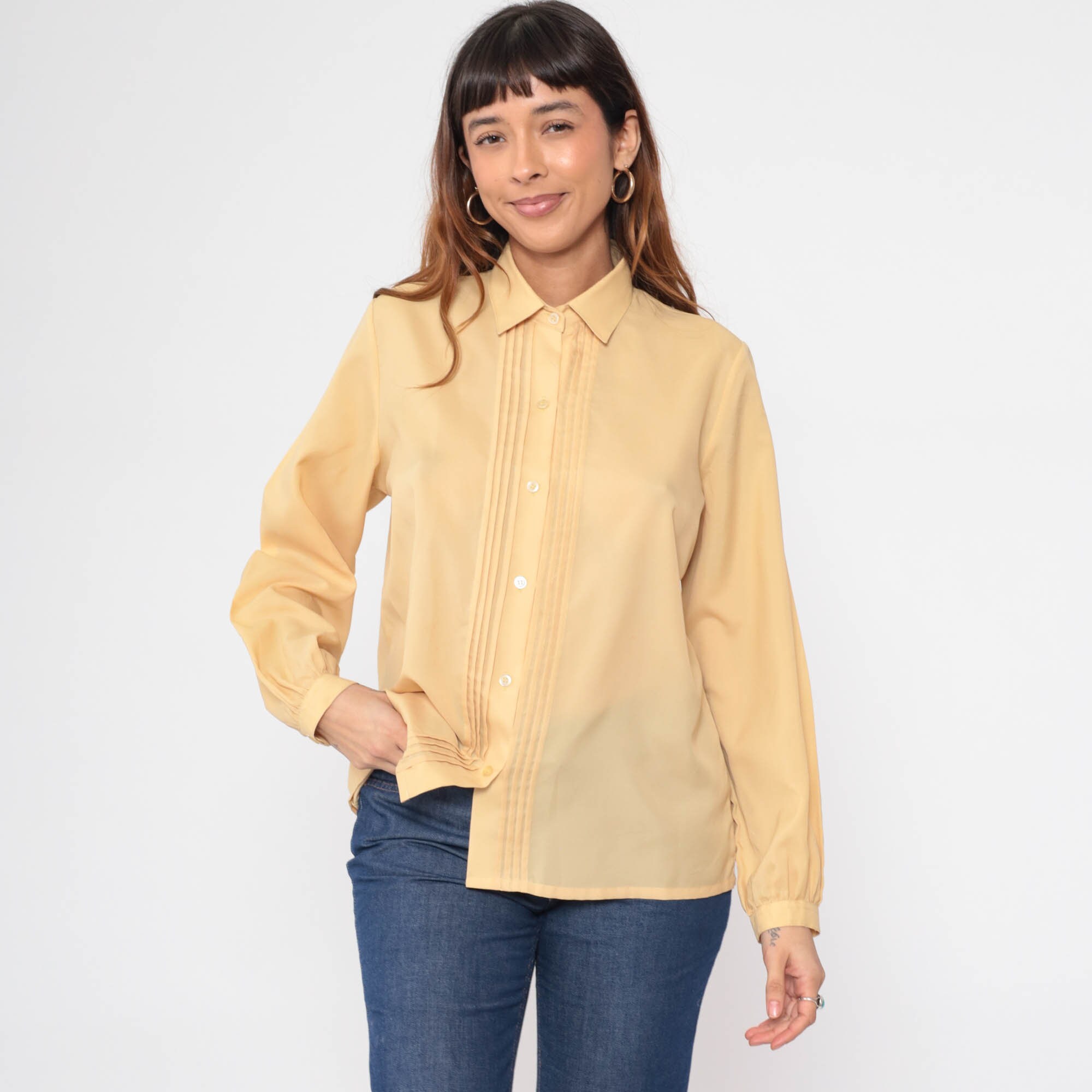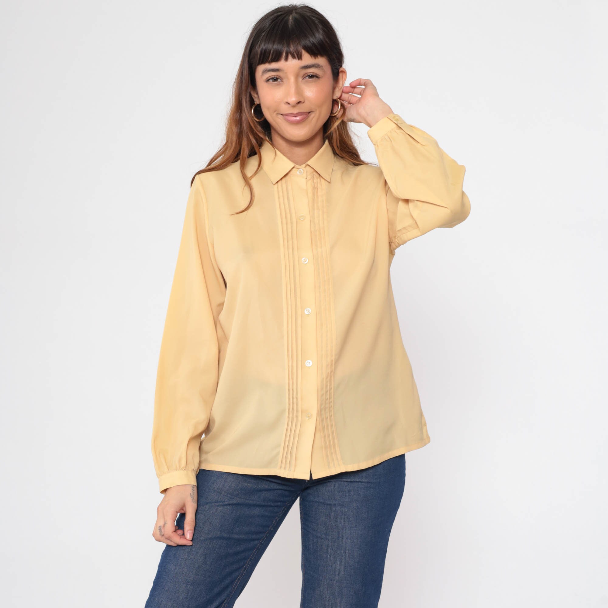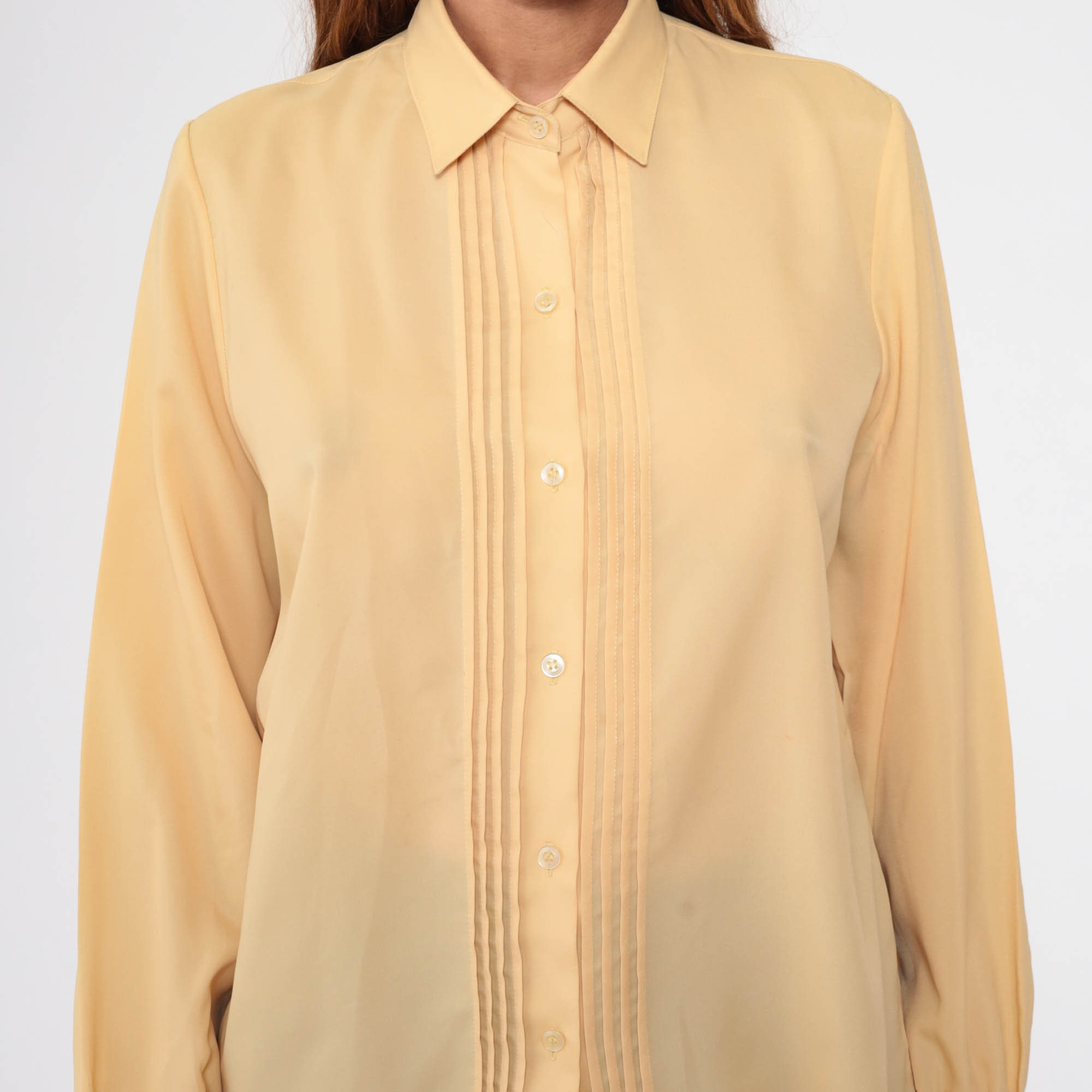 Vintage 80s shirt in yellow with long sleeves, pleats, and buttons up the front.