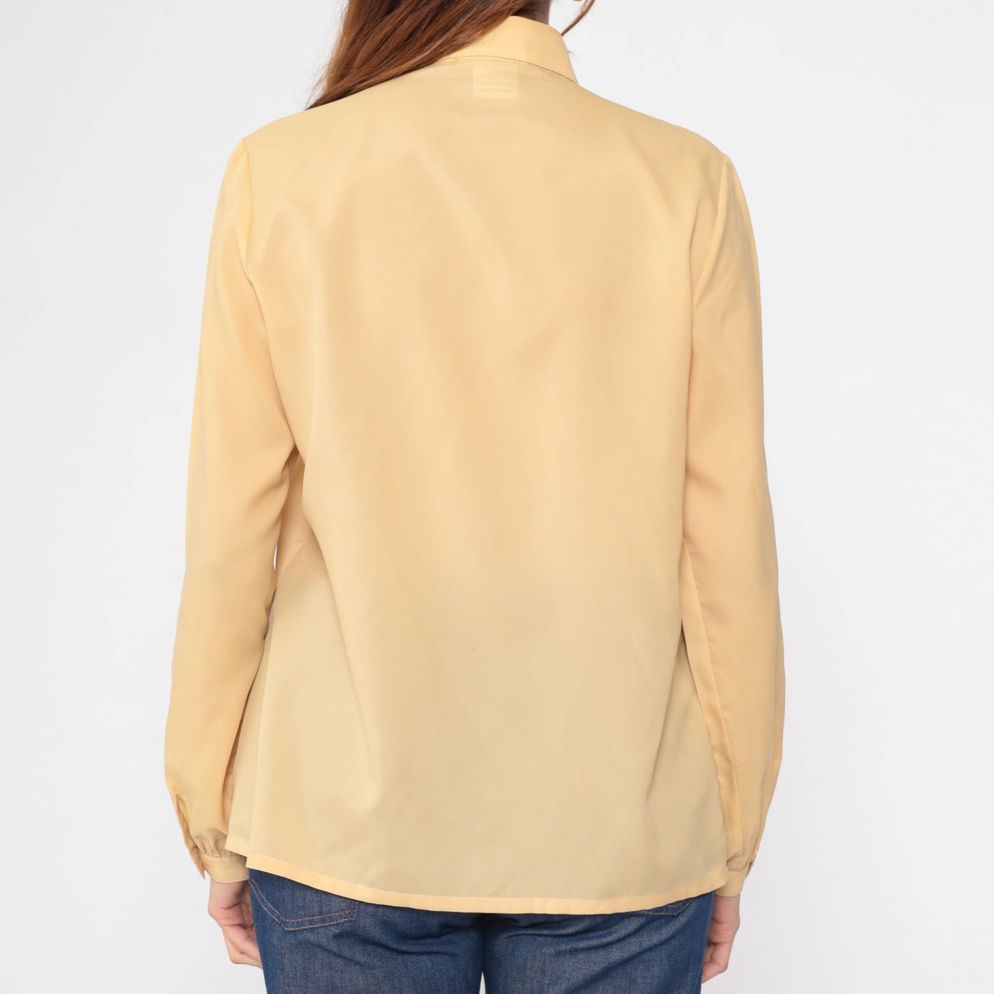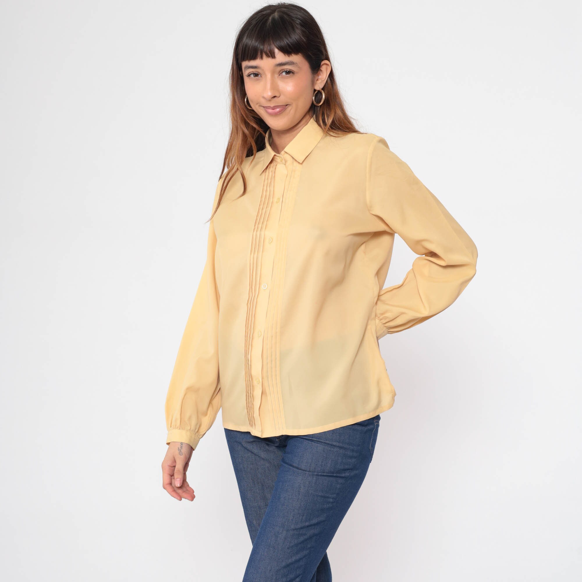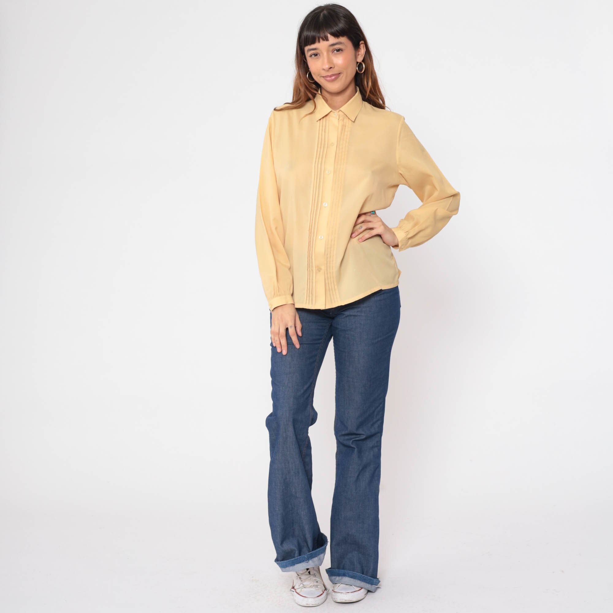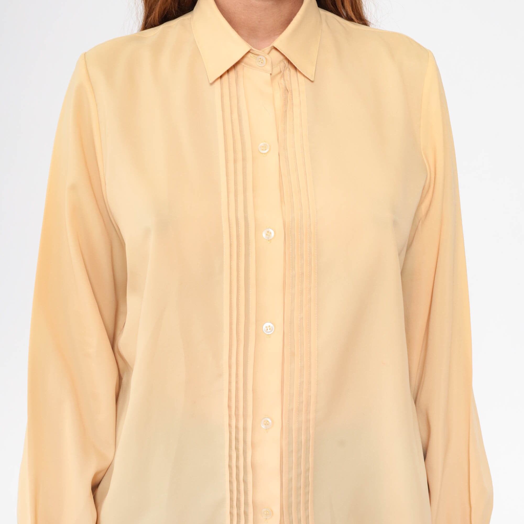 Vintage 80s shirt in yellow with long sleeves, pleats, and buttons up the front.