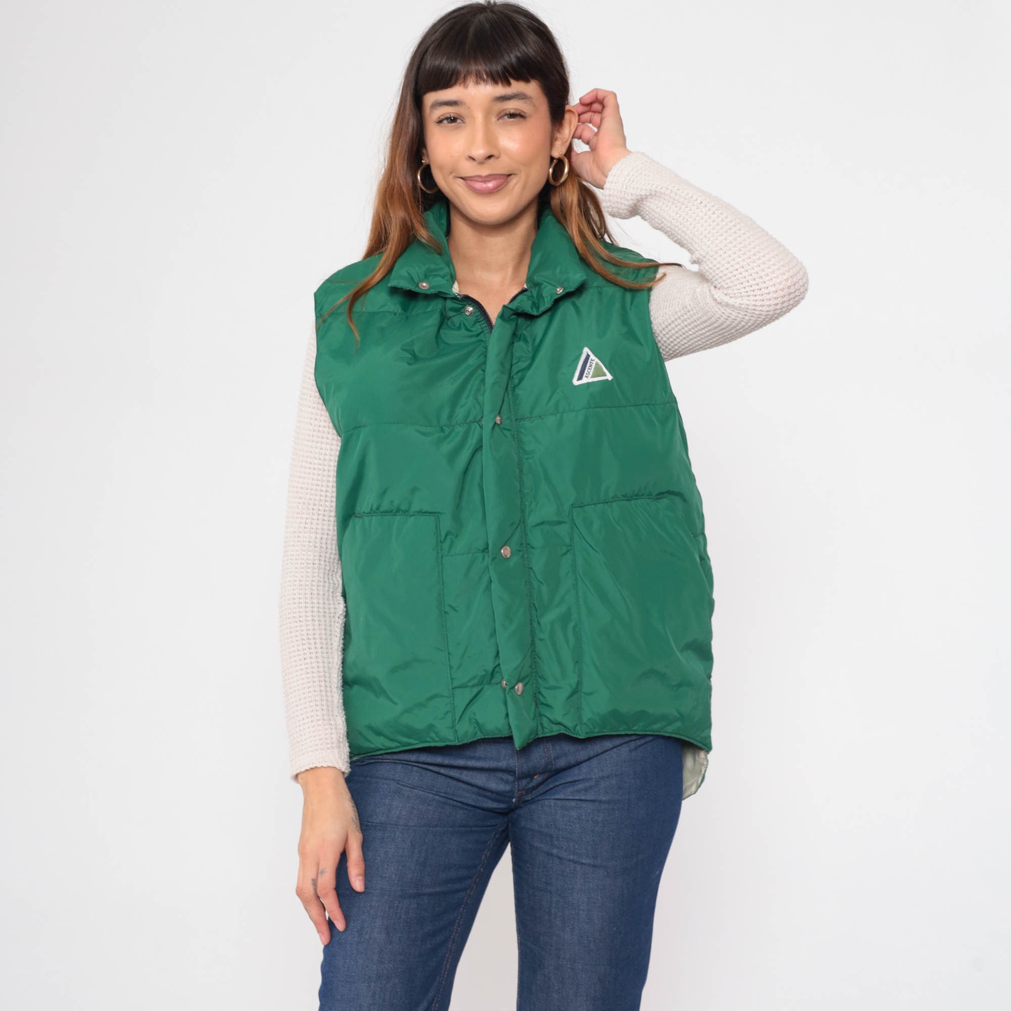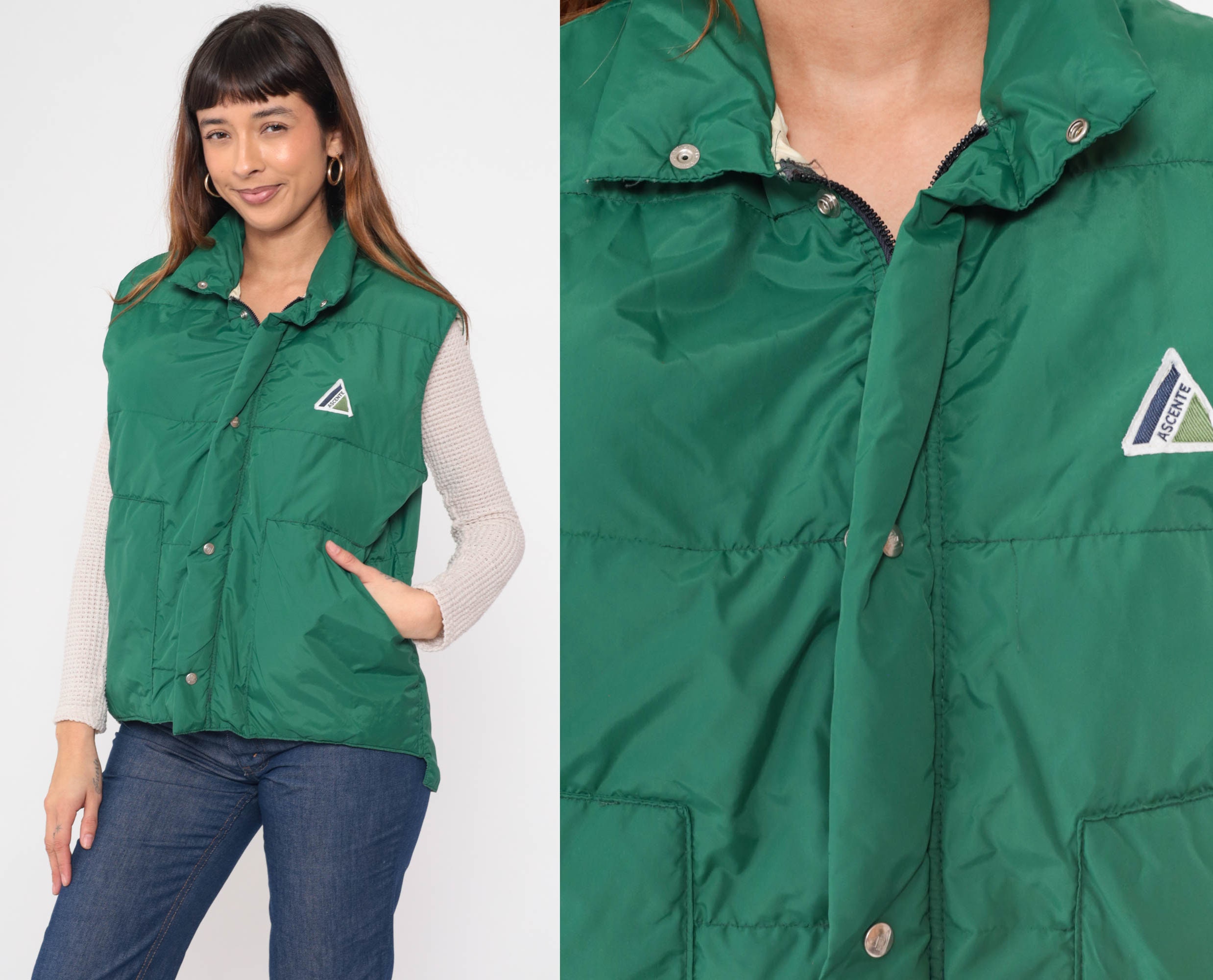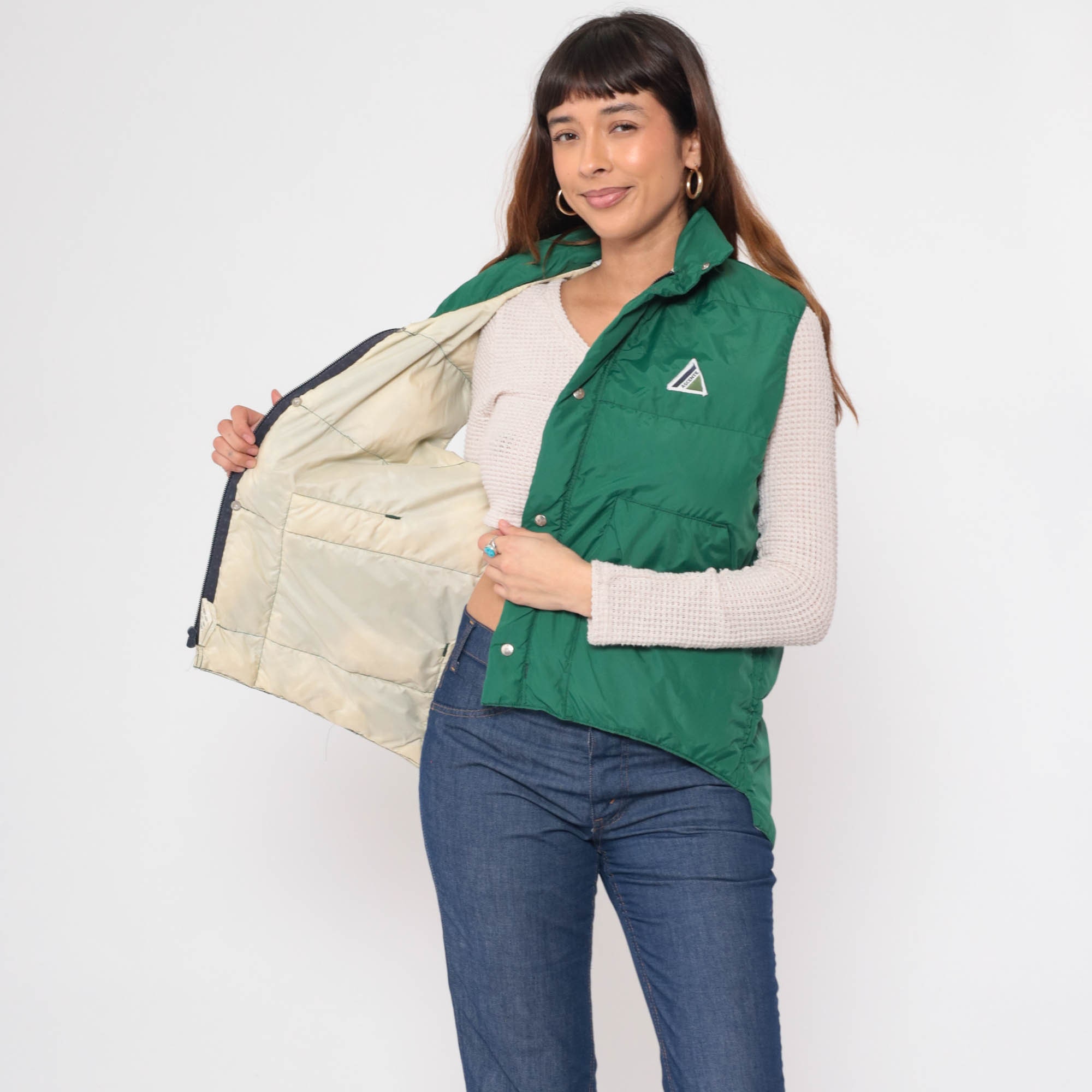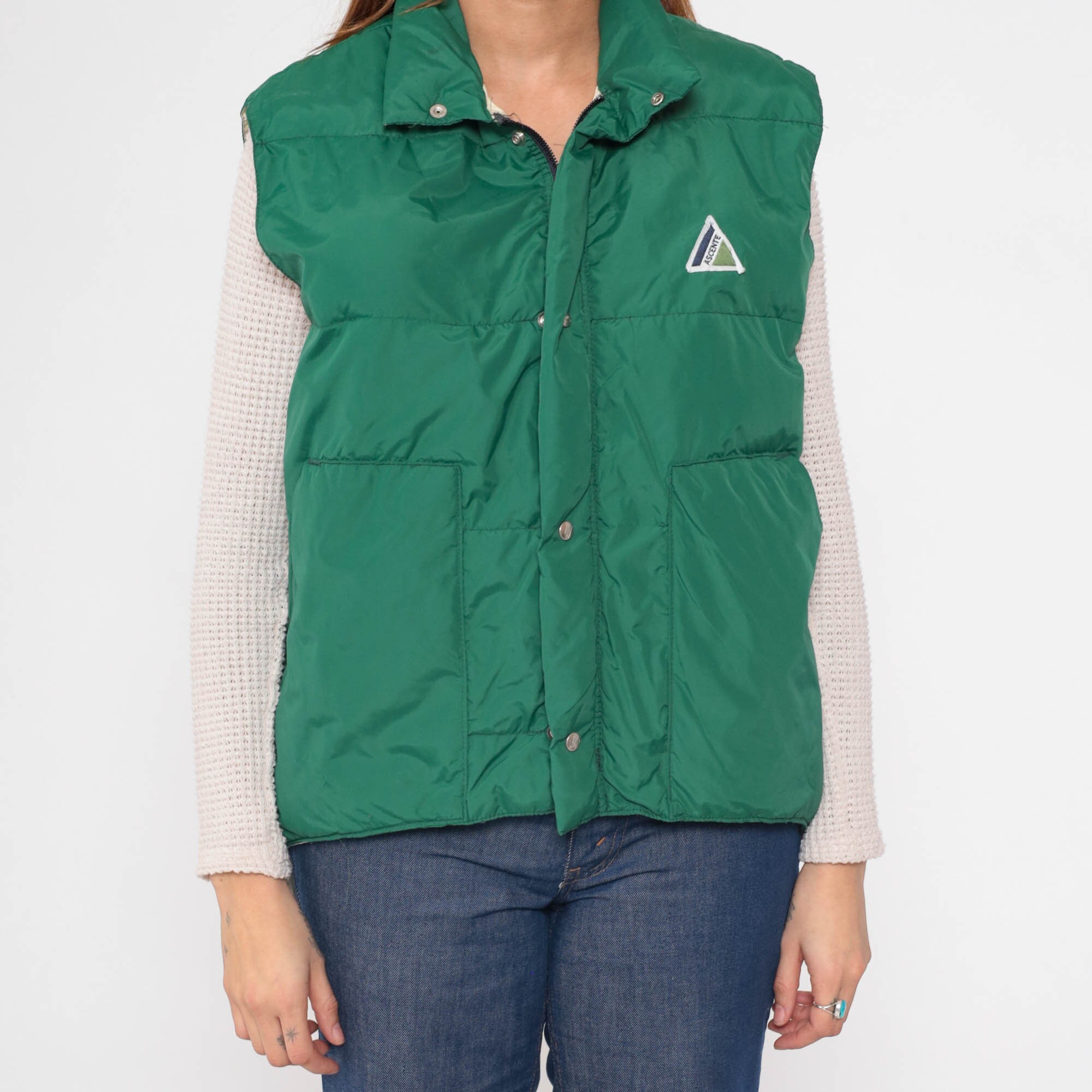 Vintage 80s puffer vest by Ascente in green with a goose down fill. Snaps up the front.