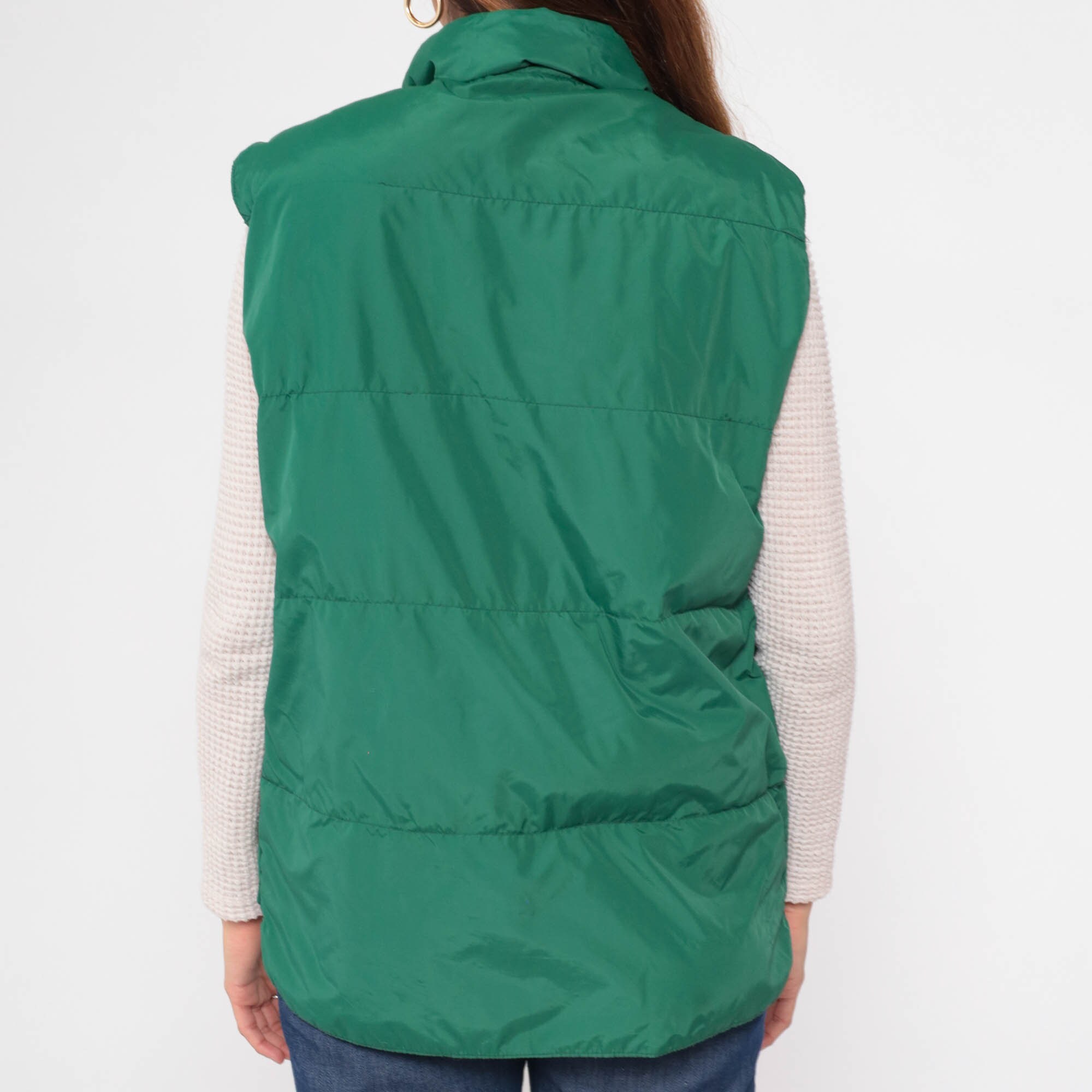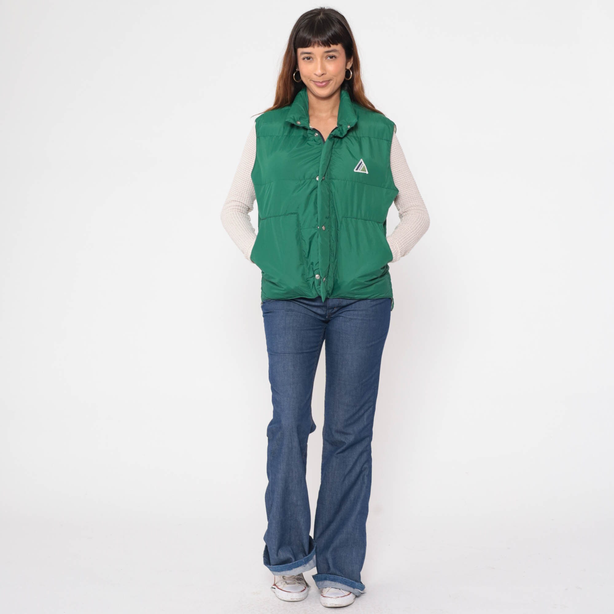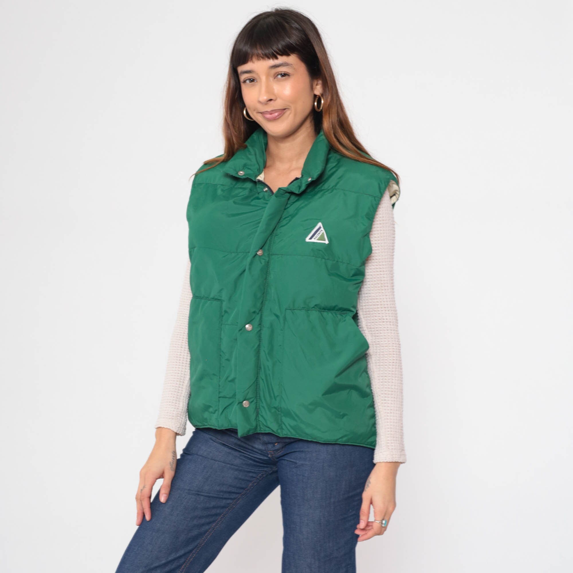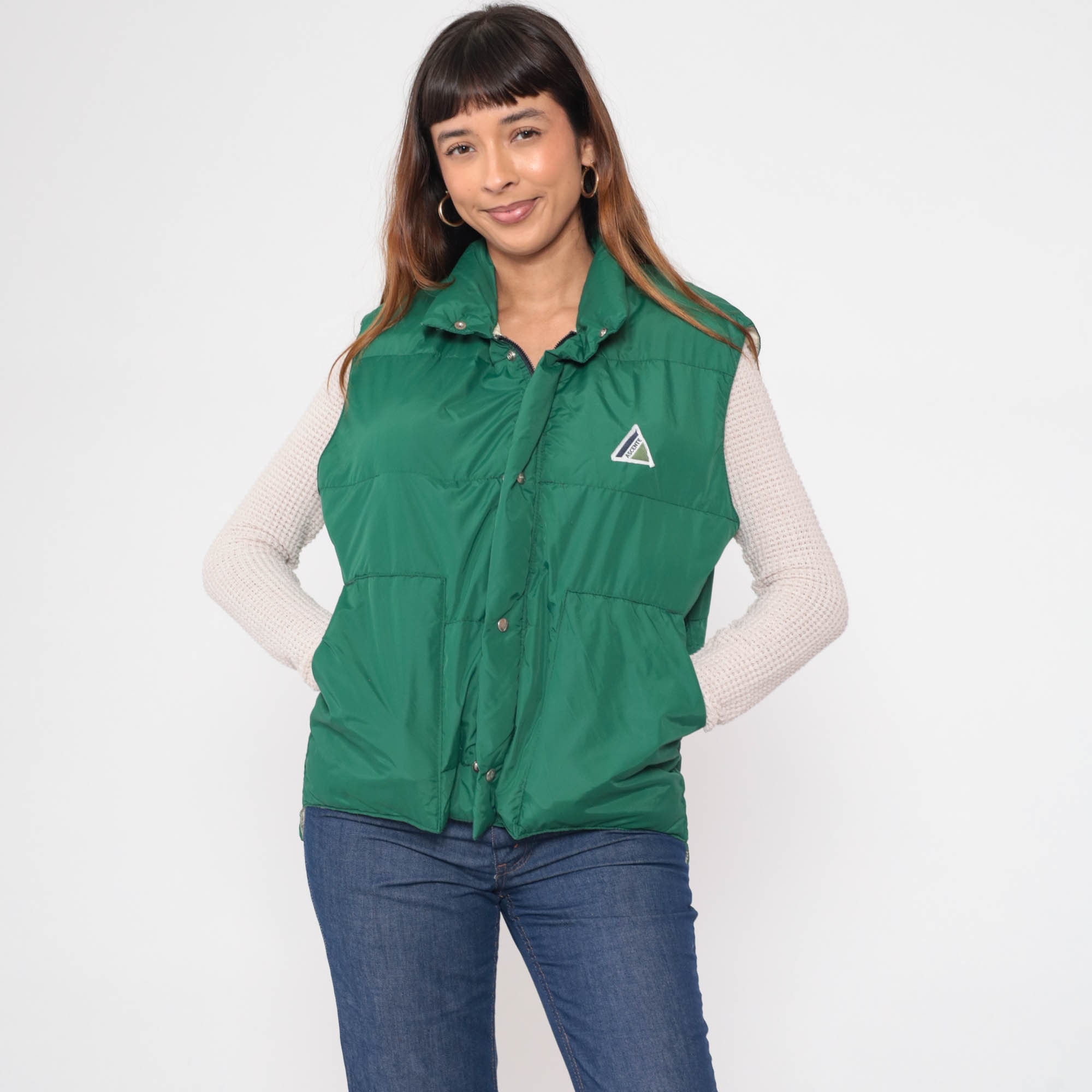 Vintage 80s puffer vest by Ascente in green with a goose down fill. Snaps up the front.