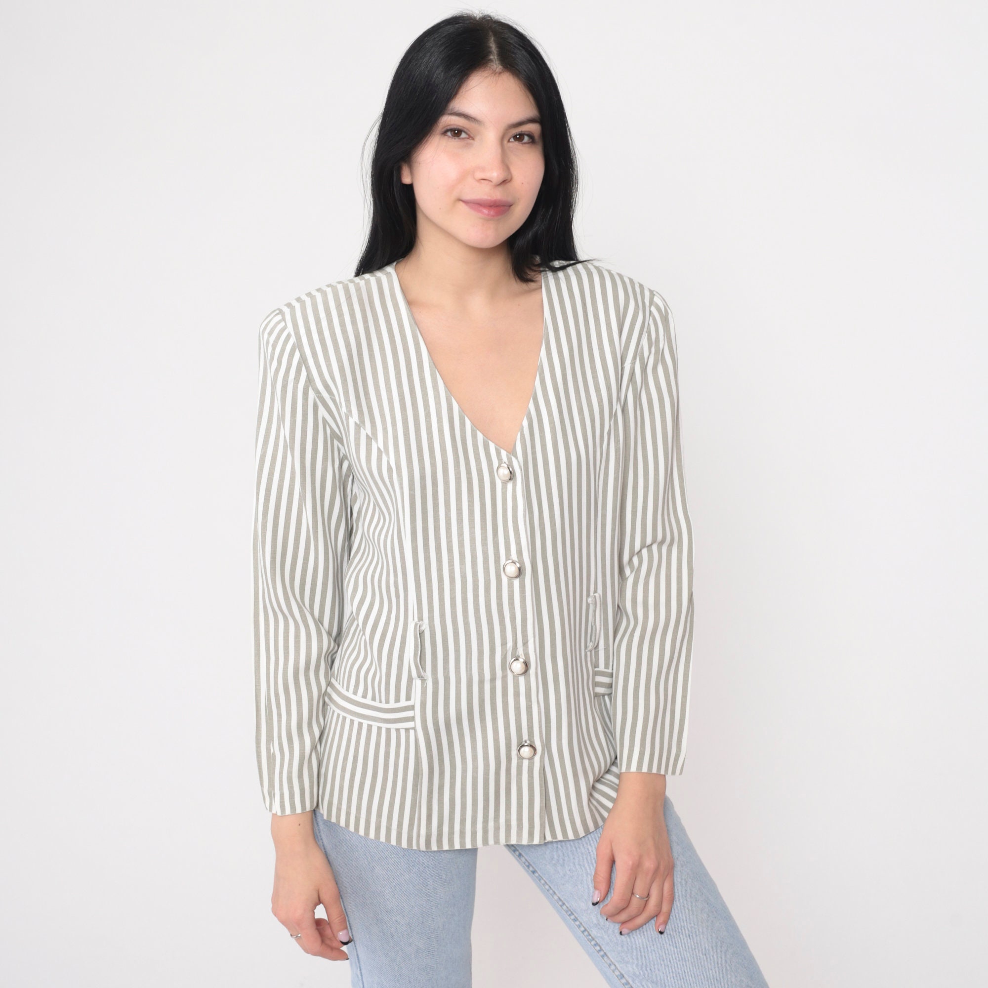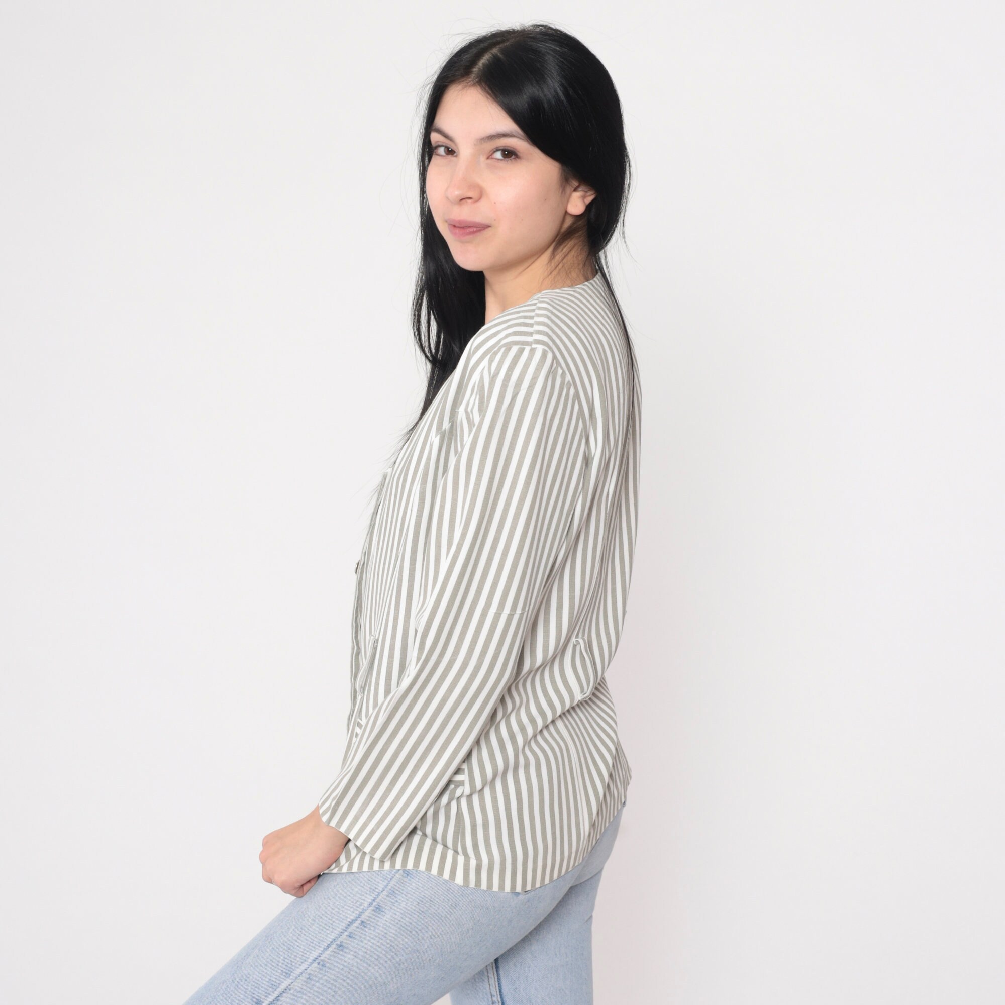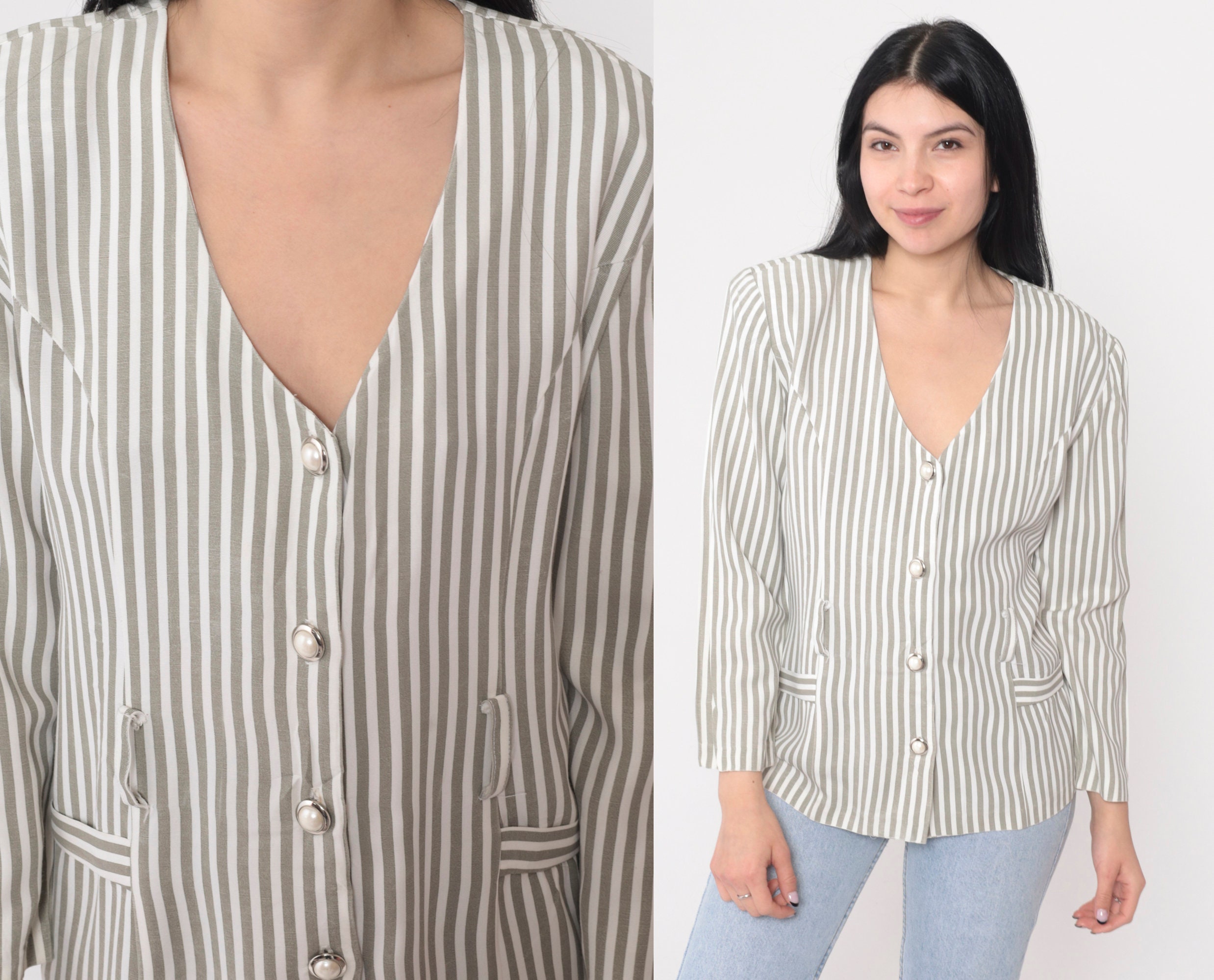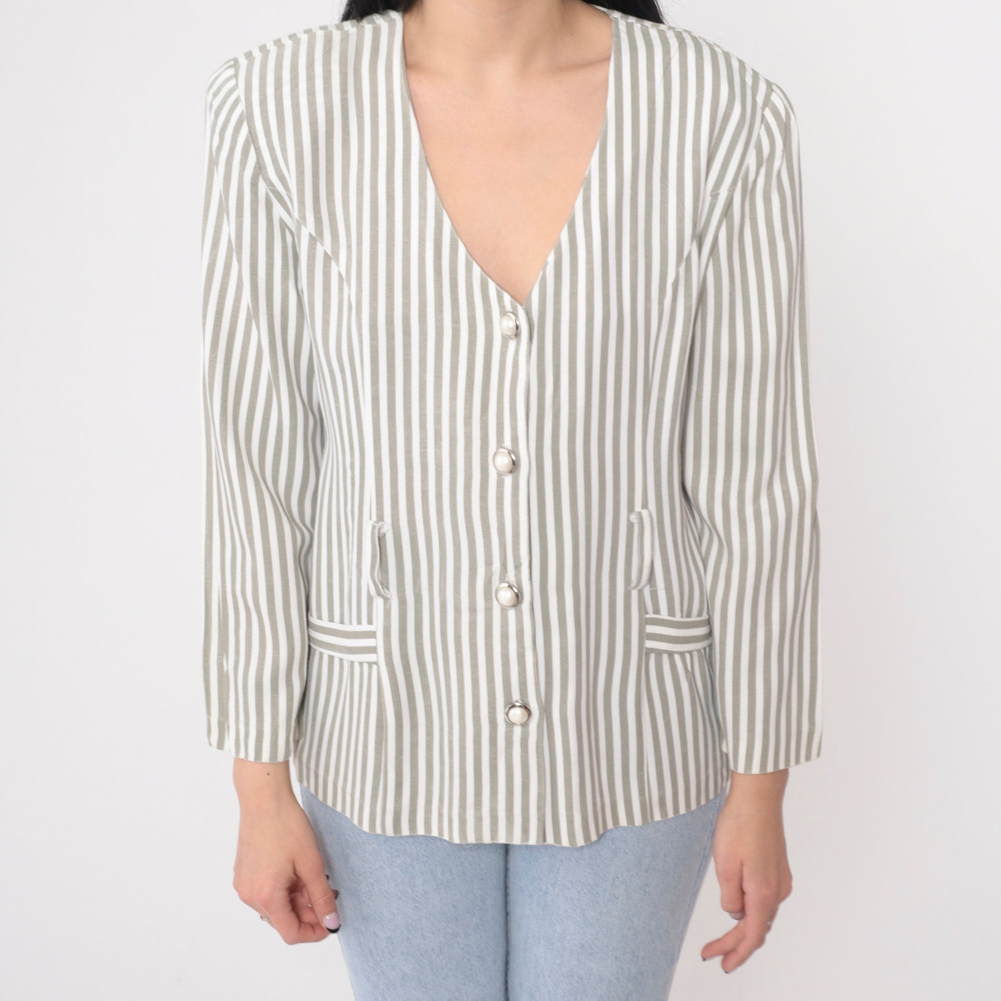 Vintage 90s blouse in a striped print. Buttons up the front with long puff sleeves and belt loops.