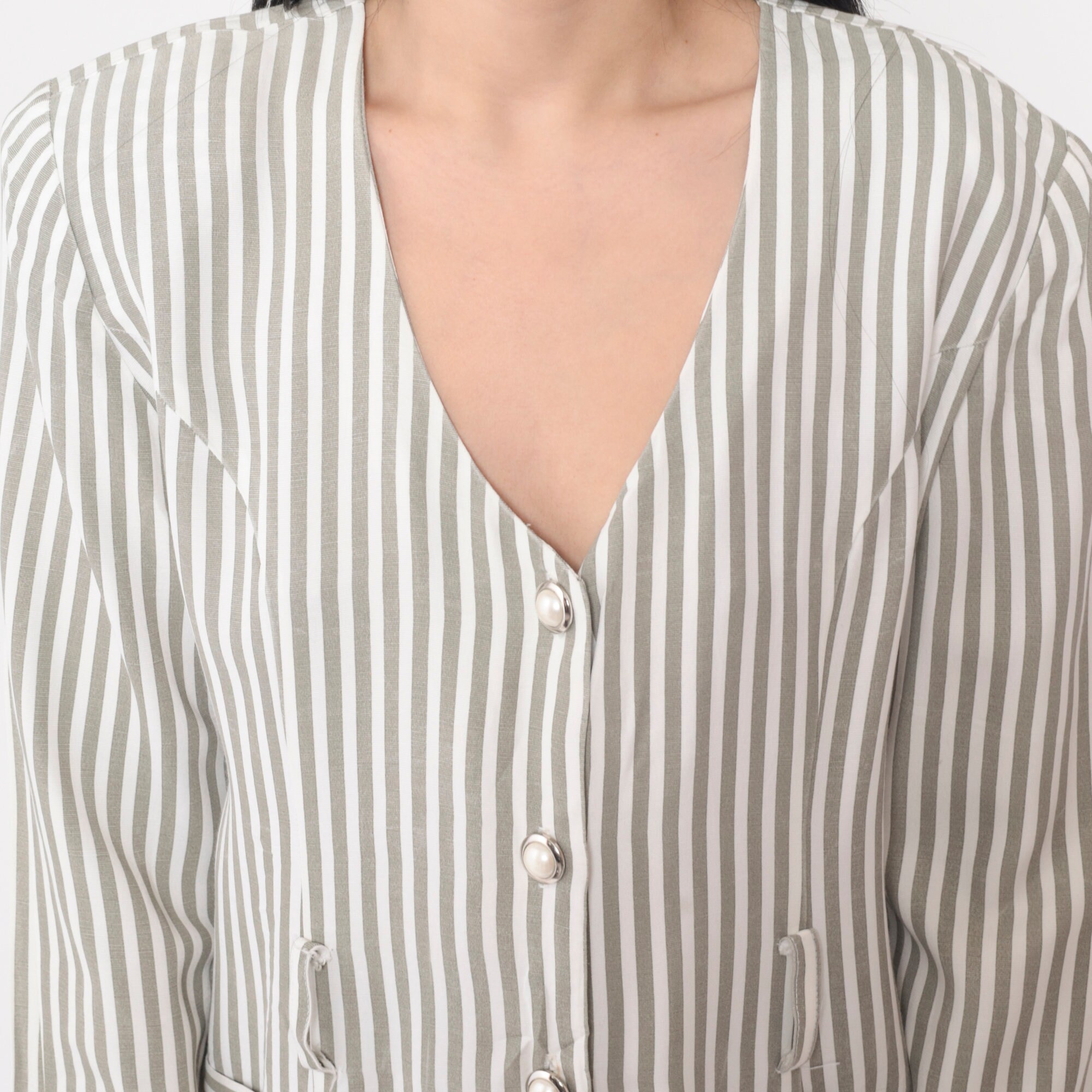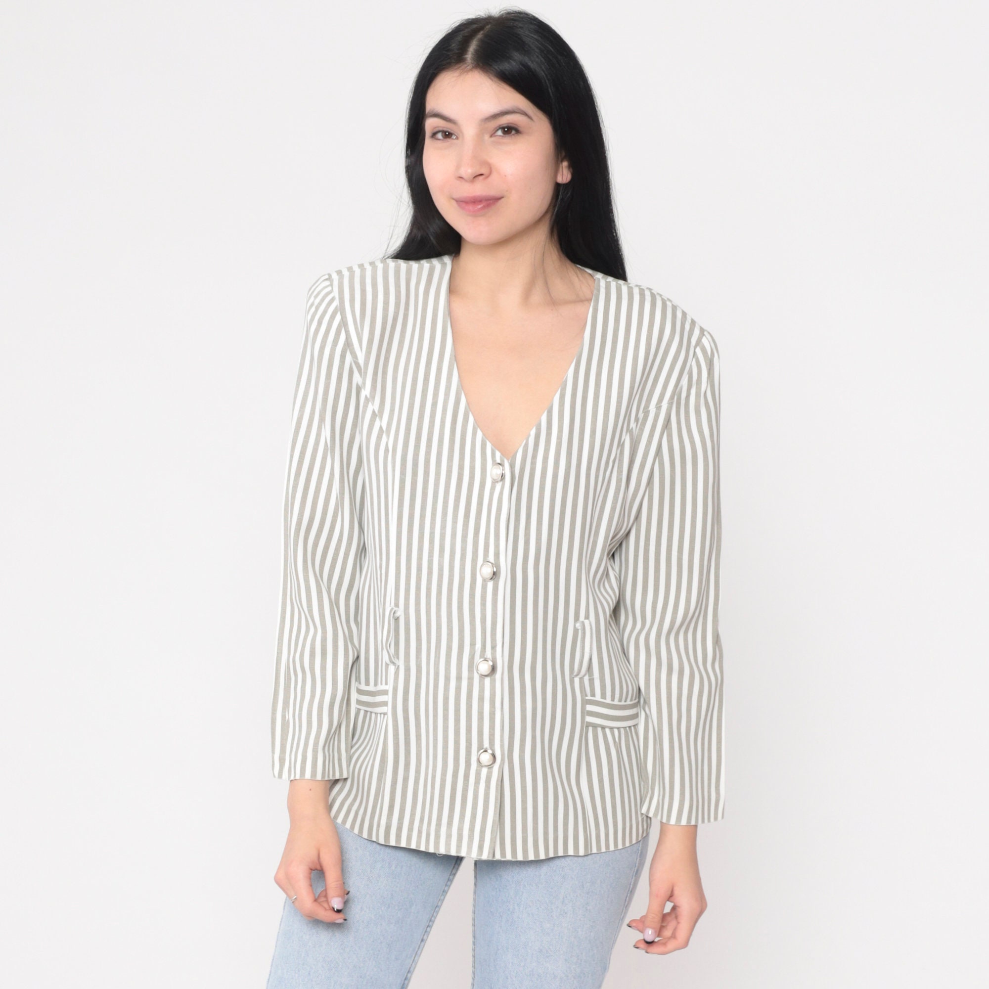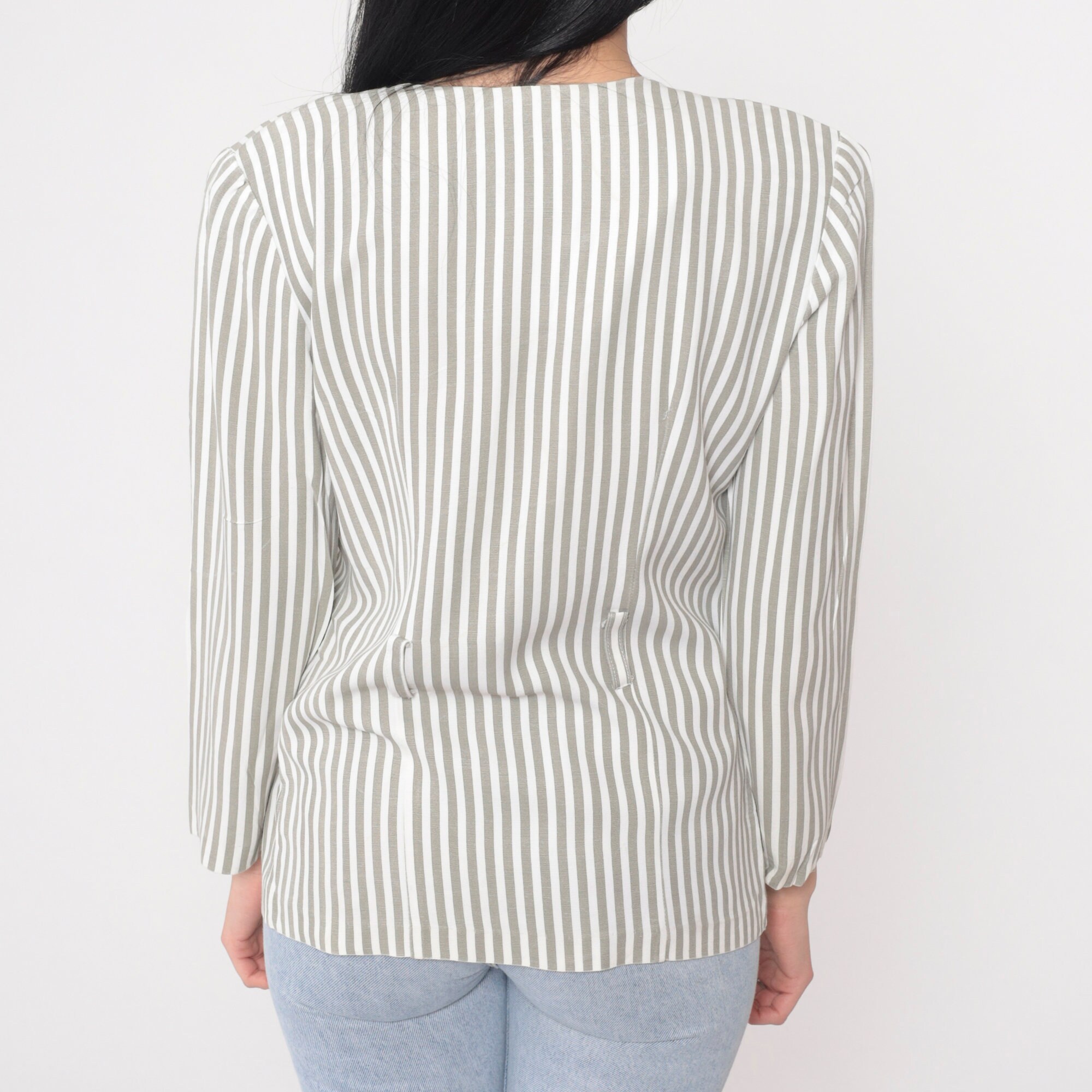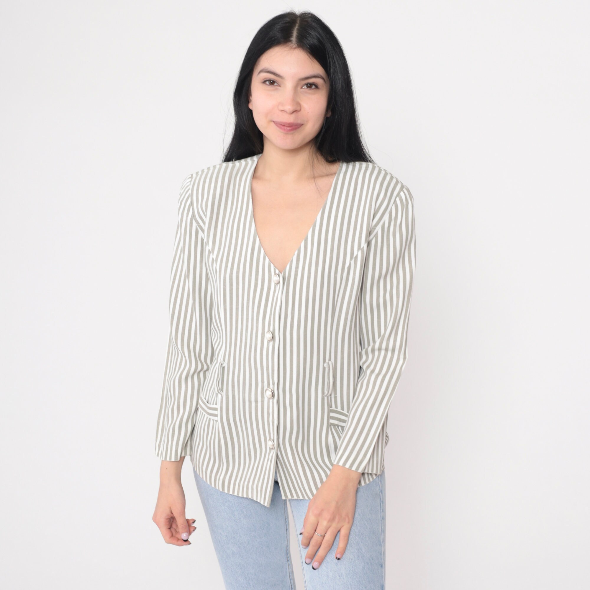 Vintage 90s blouse in a striped print. Buttons up the front with long puff sleeves and belt loops.