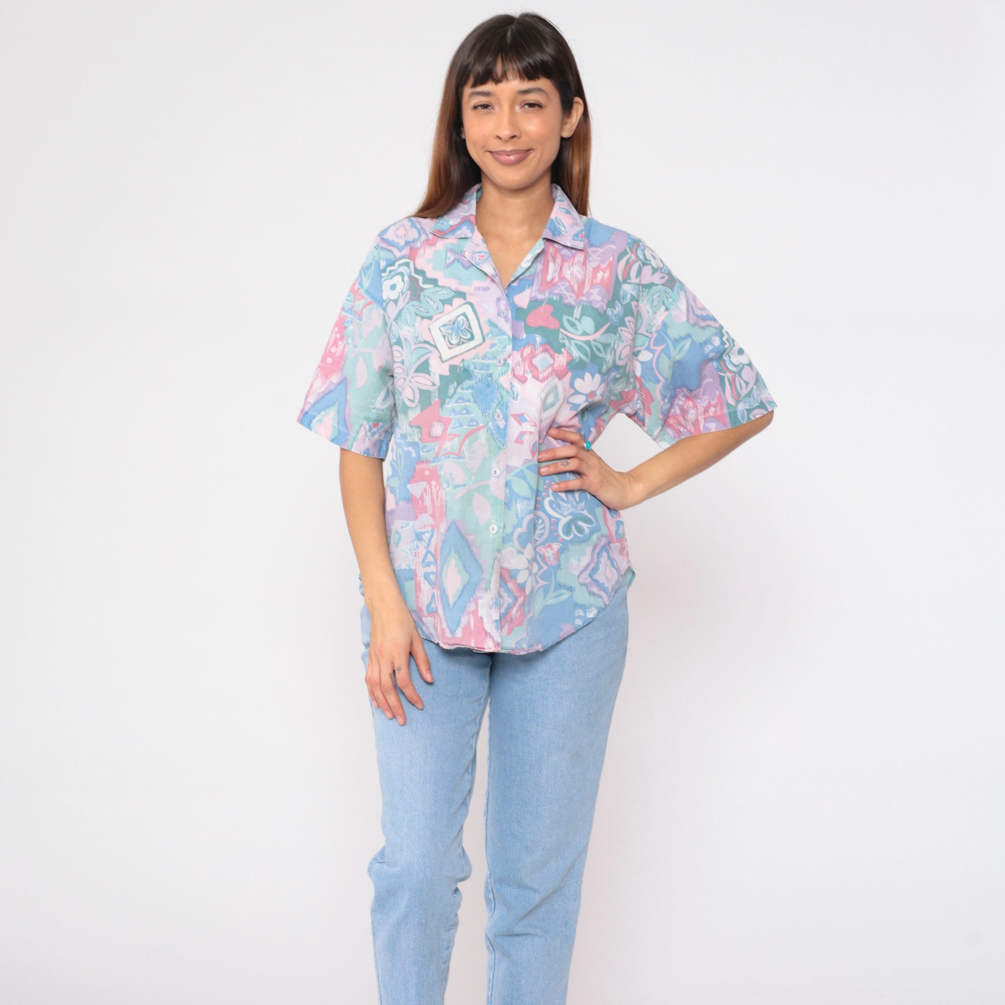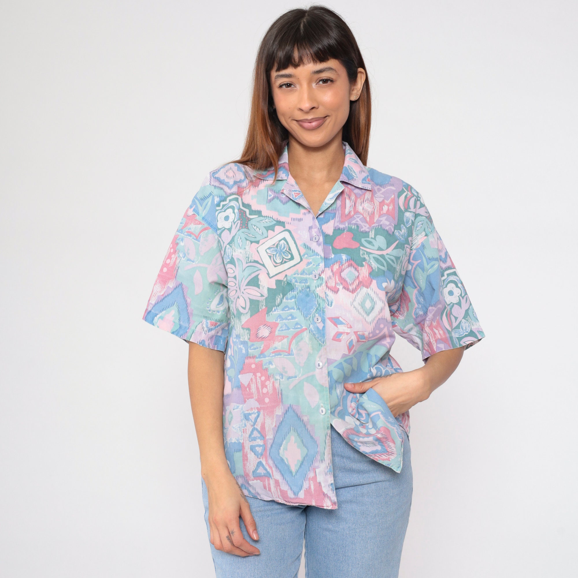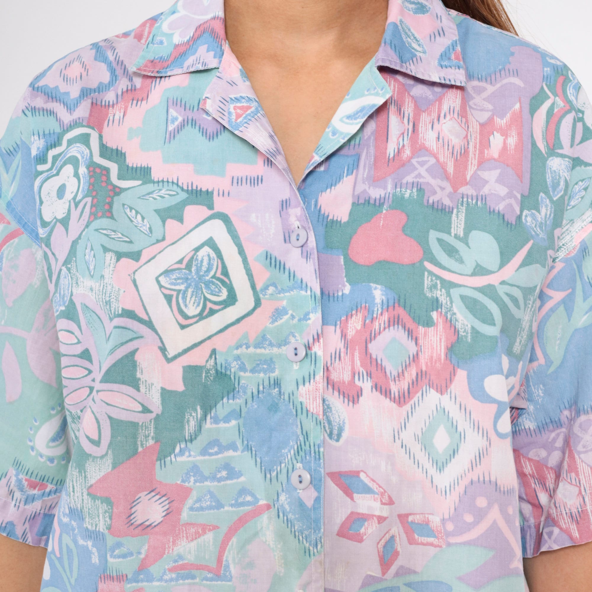 Vintage 90s blouse with an abstract floral geometric print and buttons up the front.