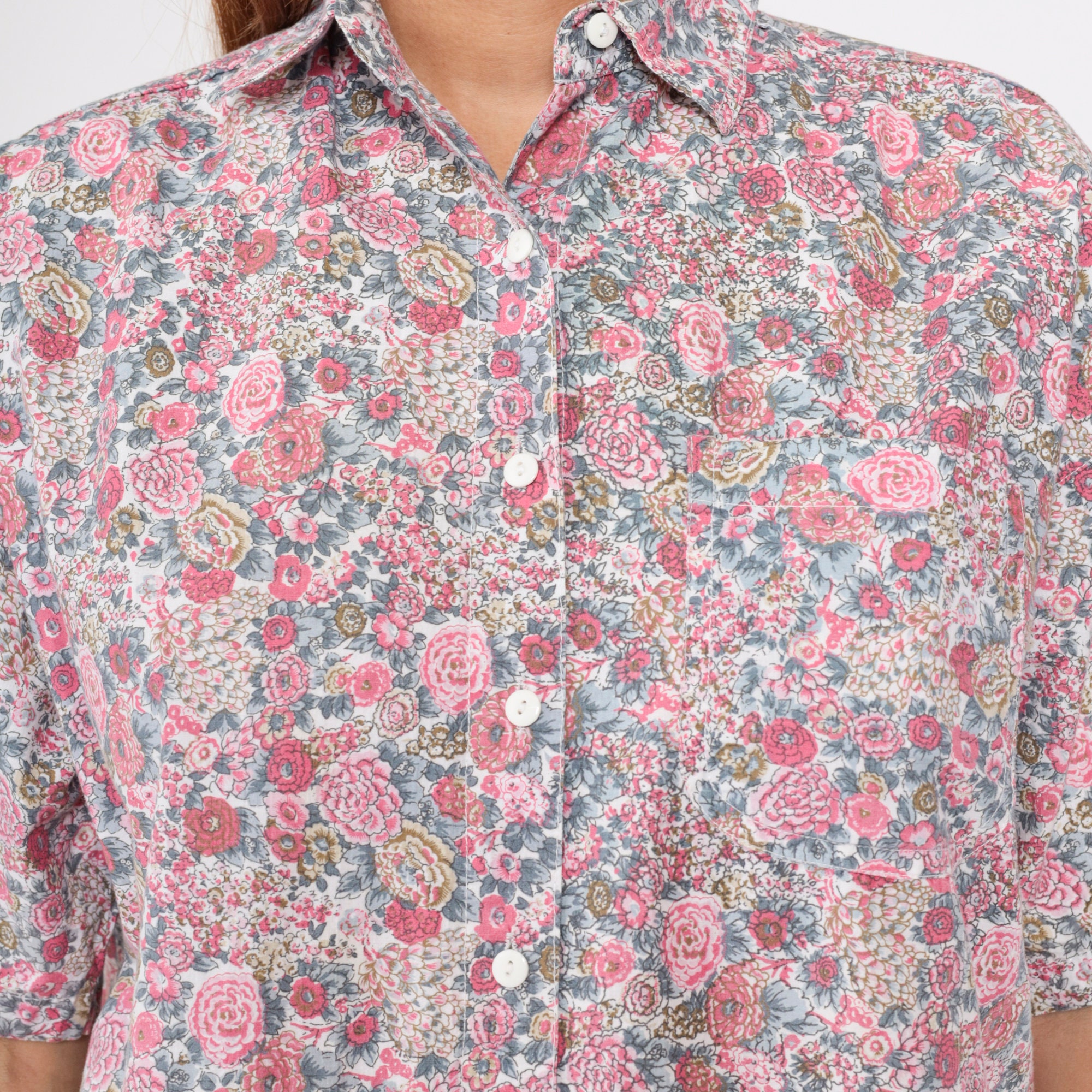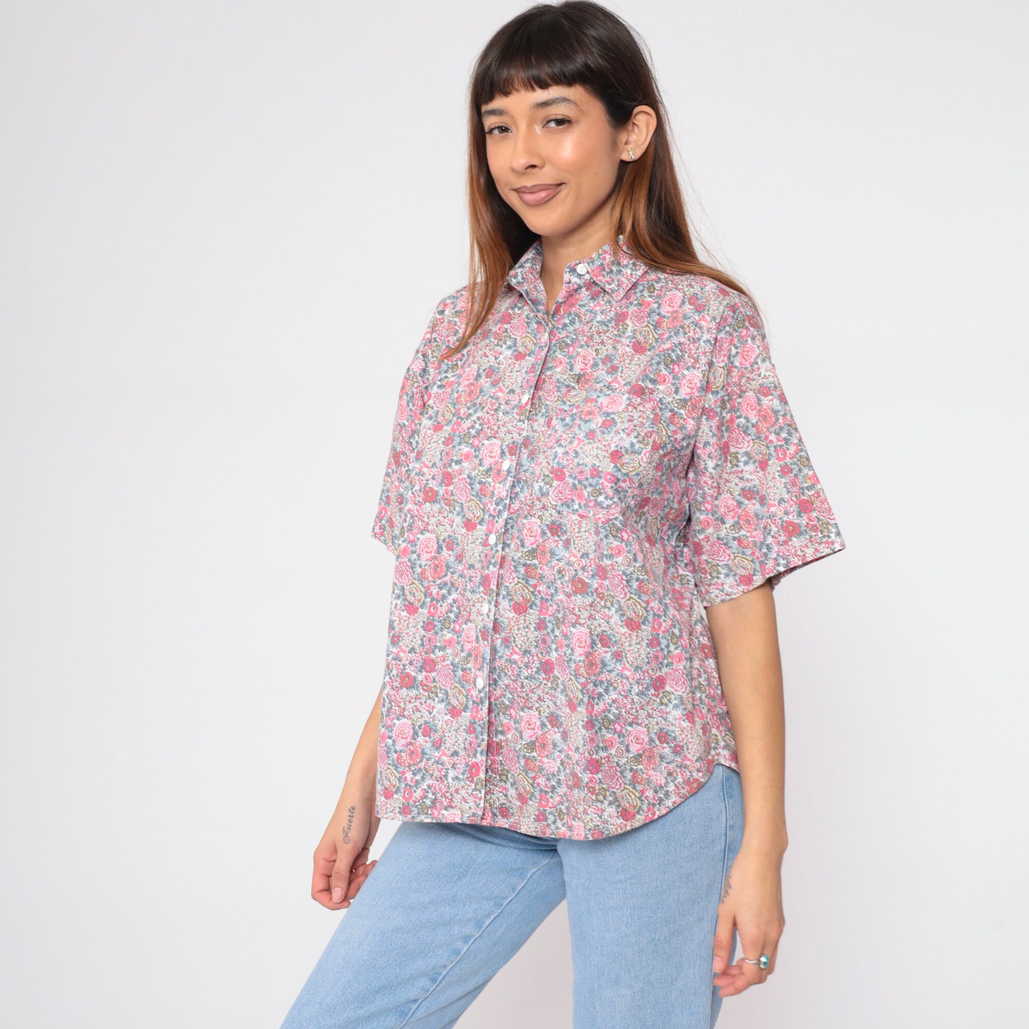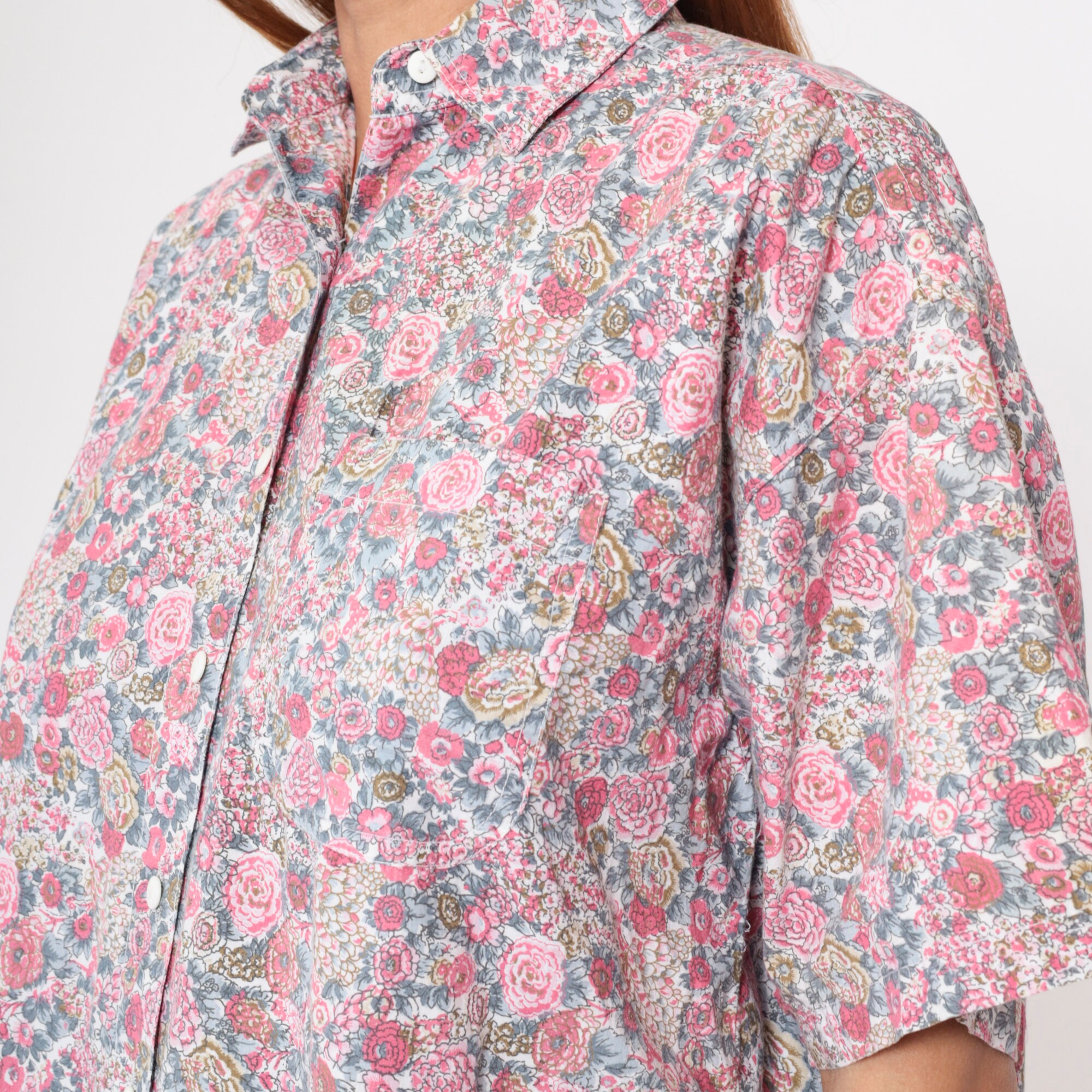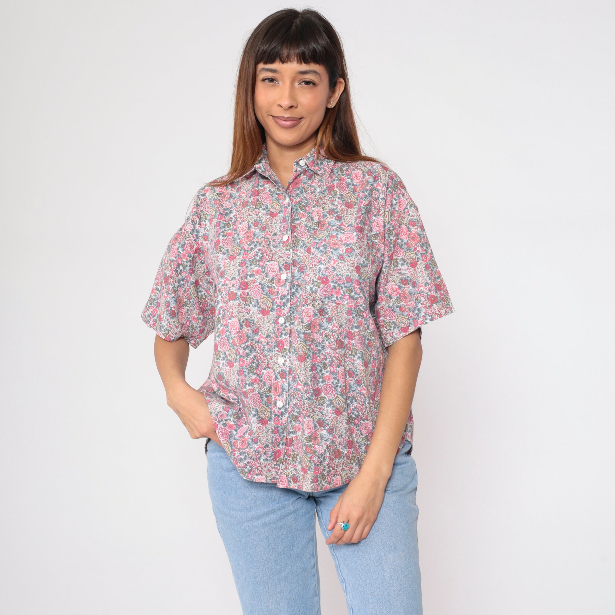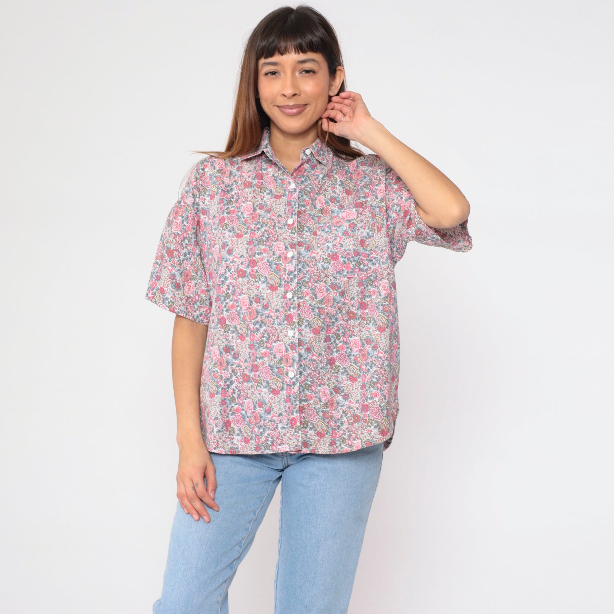 Vintage 90s shirt with a floral print. It has short sleeves and buttons up the front.