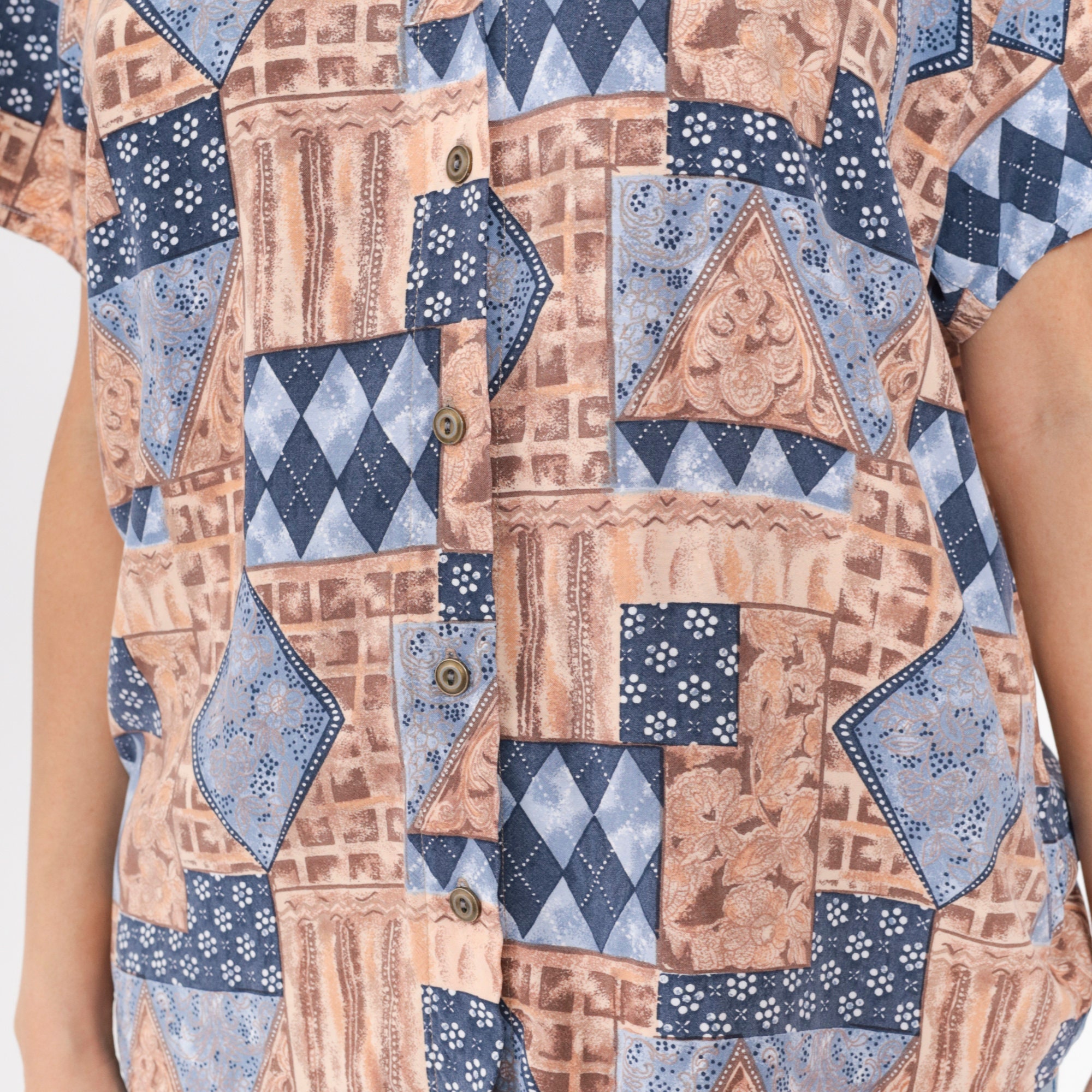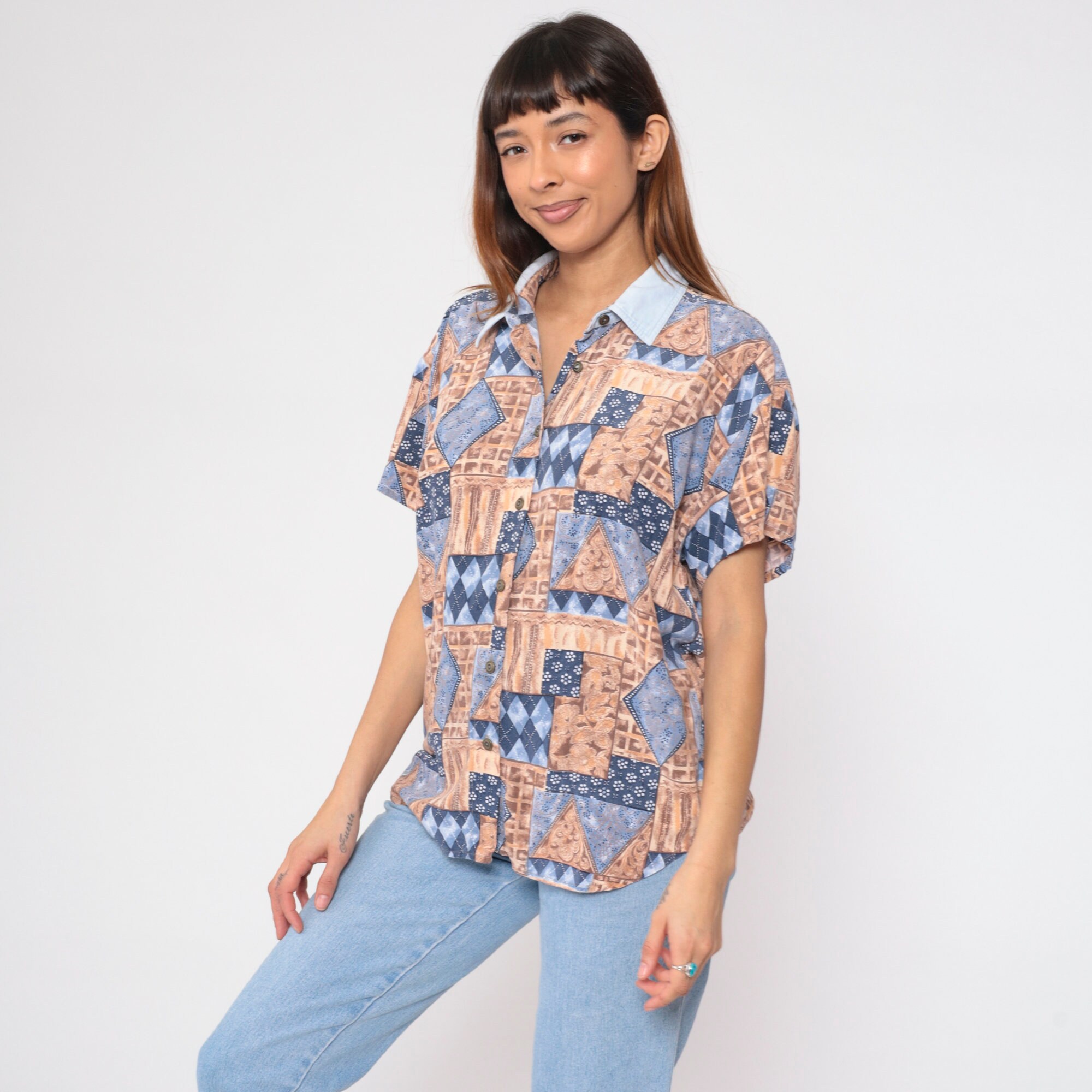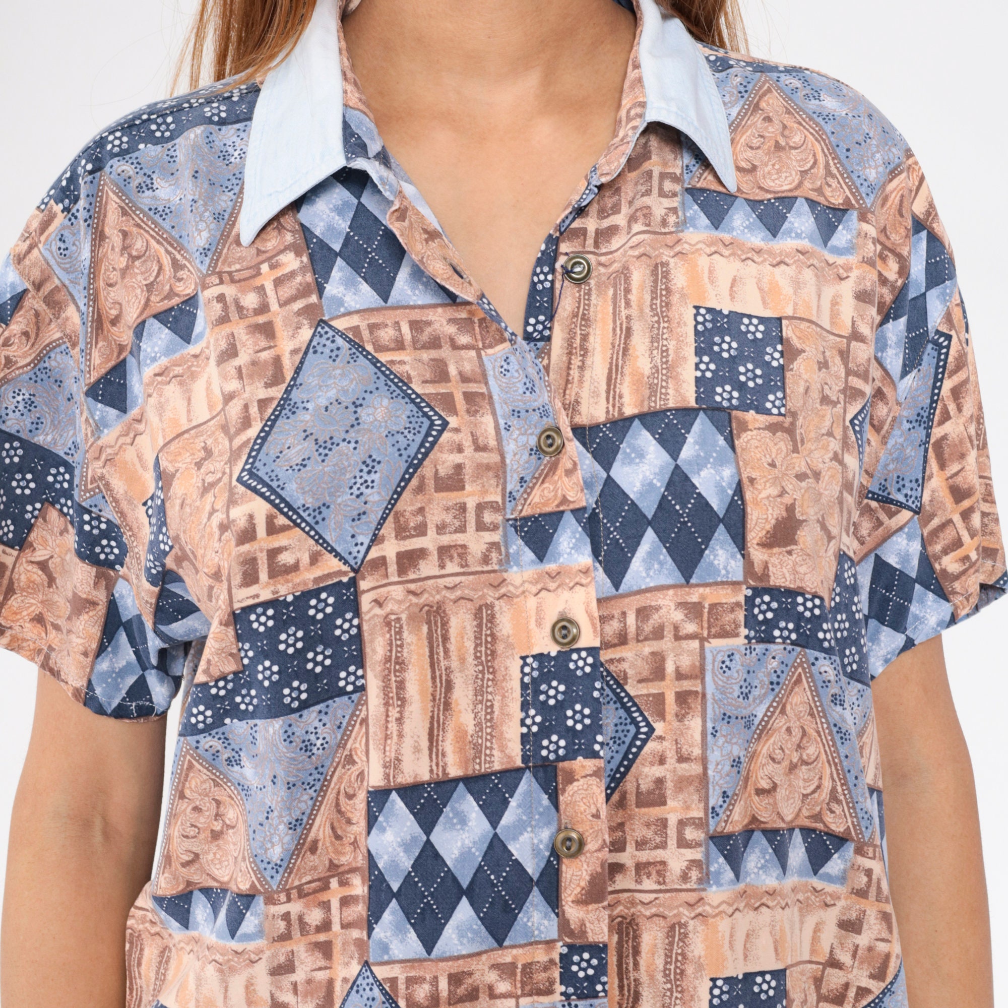 Vintage 90s shirt in an geometric and floral print. It has short sleeves and buttons up the front.