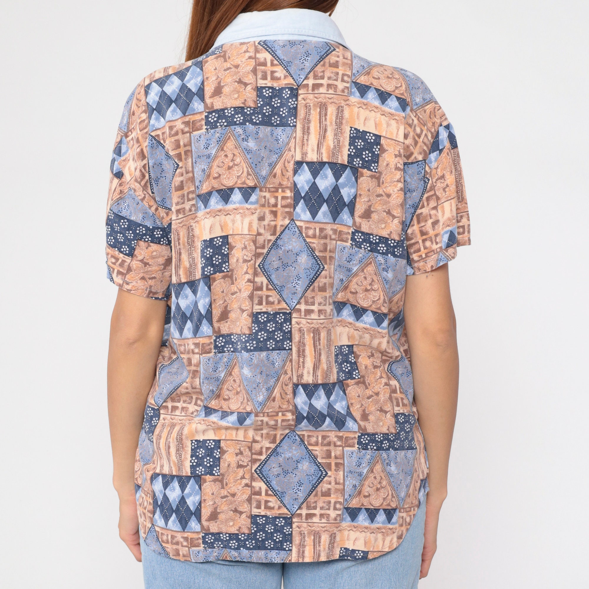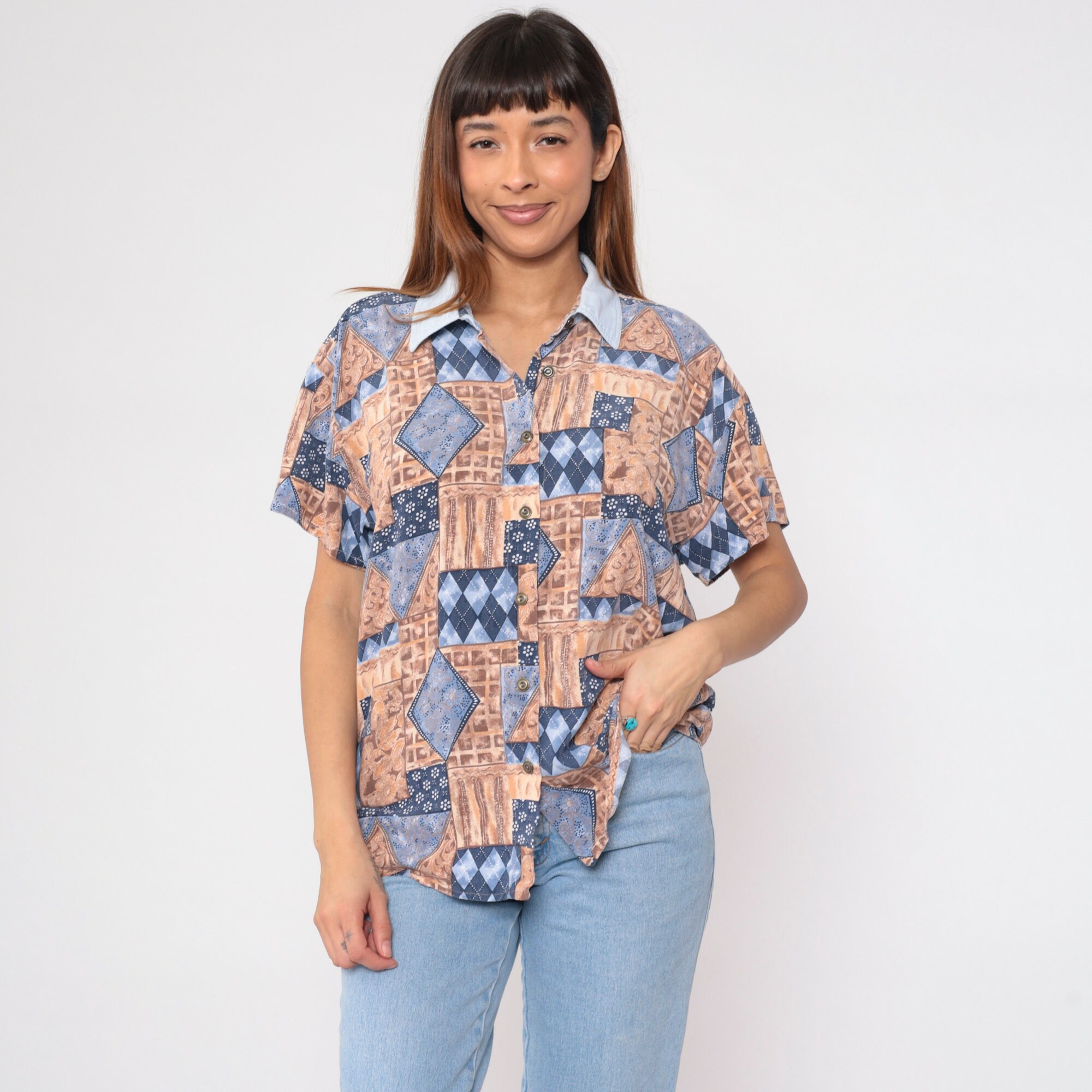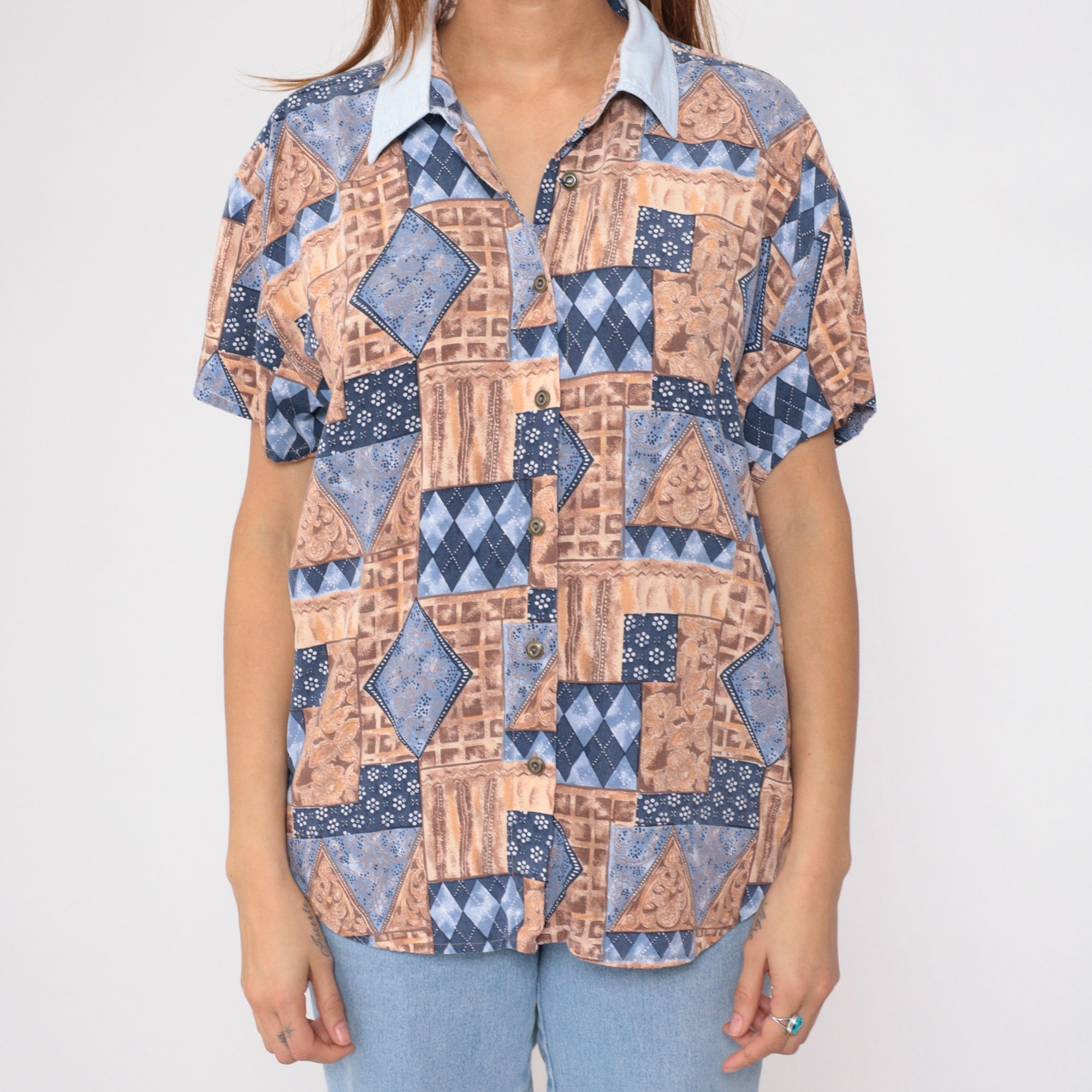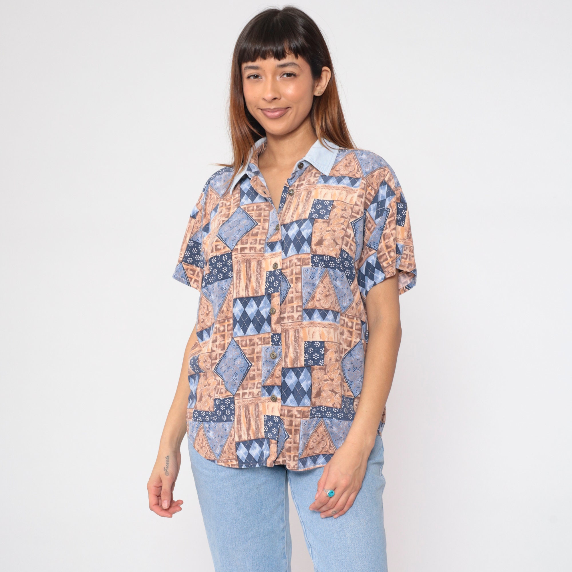 Vintage 90s shirt in an geometric and floral print. It has short sleeves and buttons up the front.