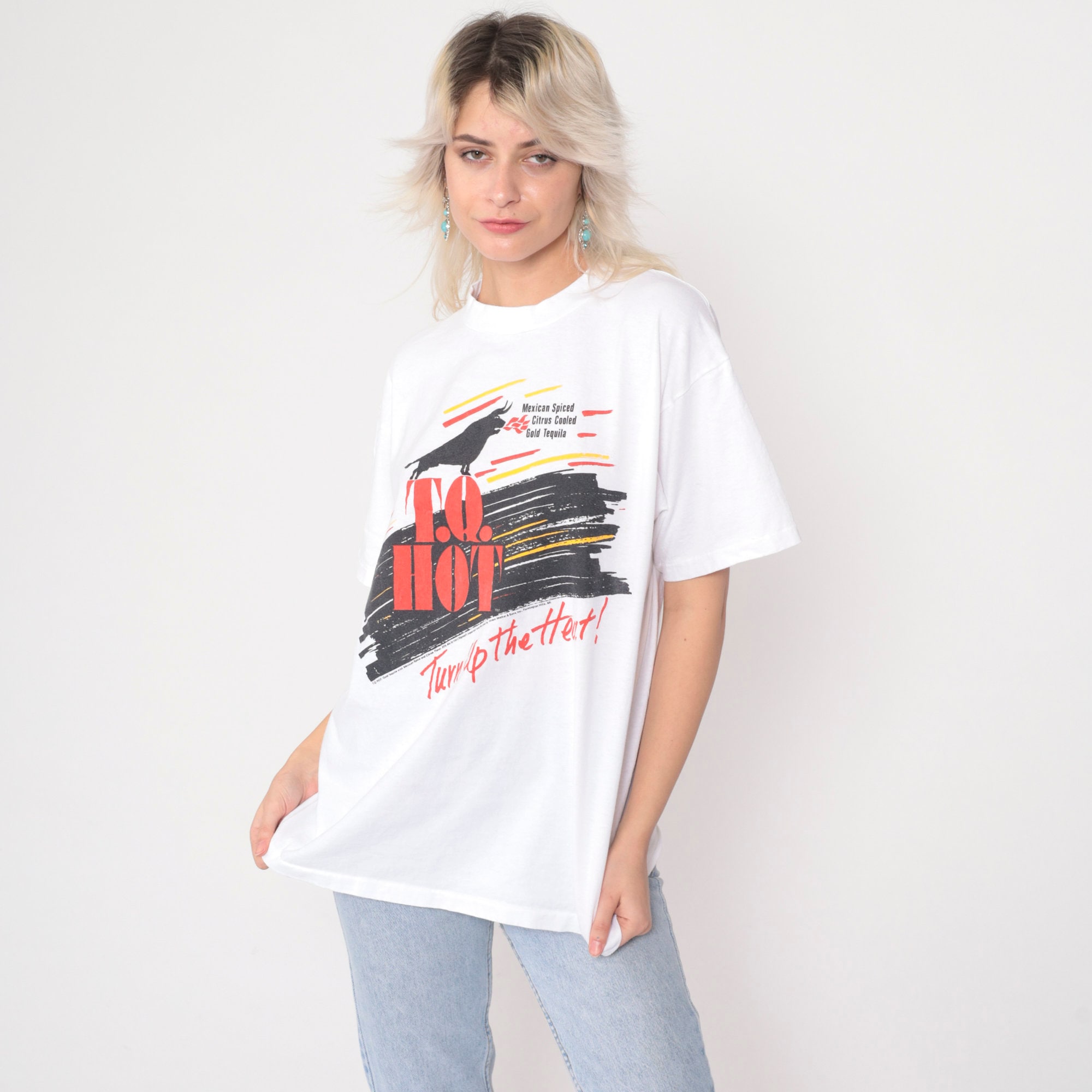 Vintage 90s t shirt with a TQ Hot gold tequila print with 'Turn up the heat!' on the front. TG Hot was discontinued in 2002.