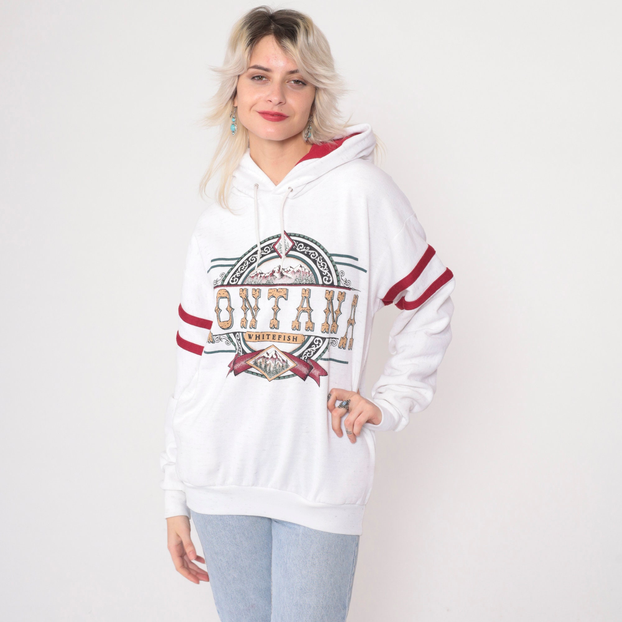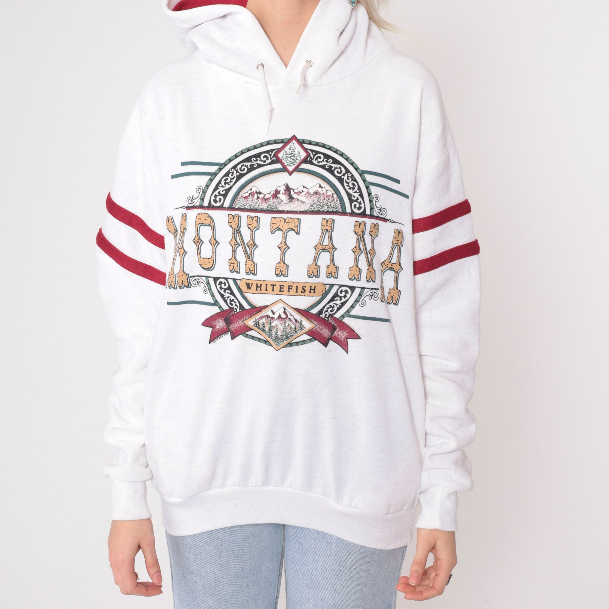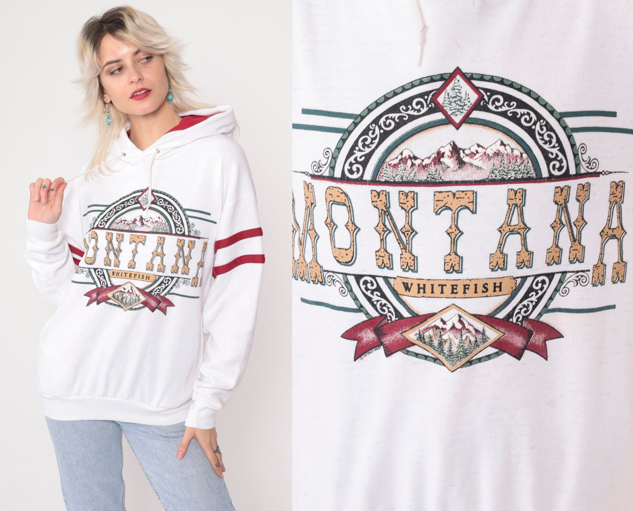 Vintage 90s hooded sweatshirt in white with a Whitefish Montana print and red stripes on the sleeves.
