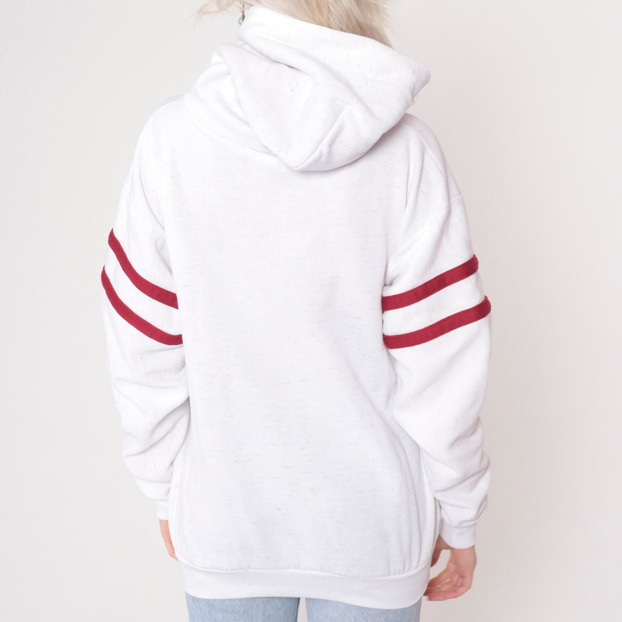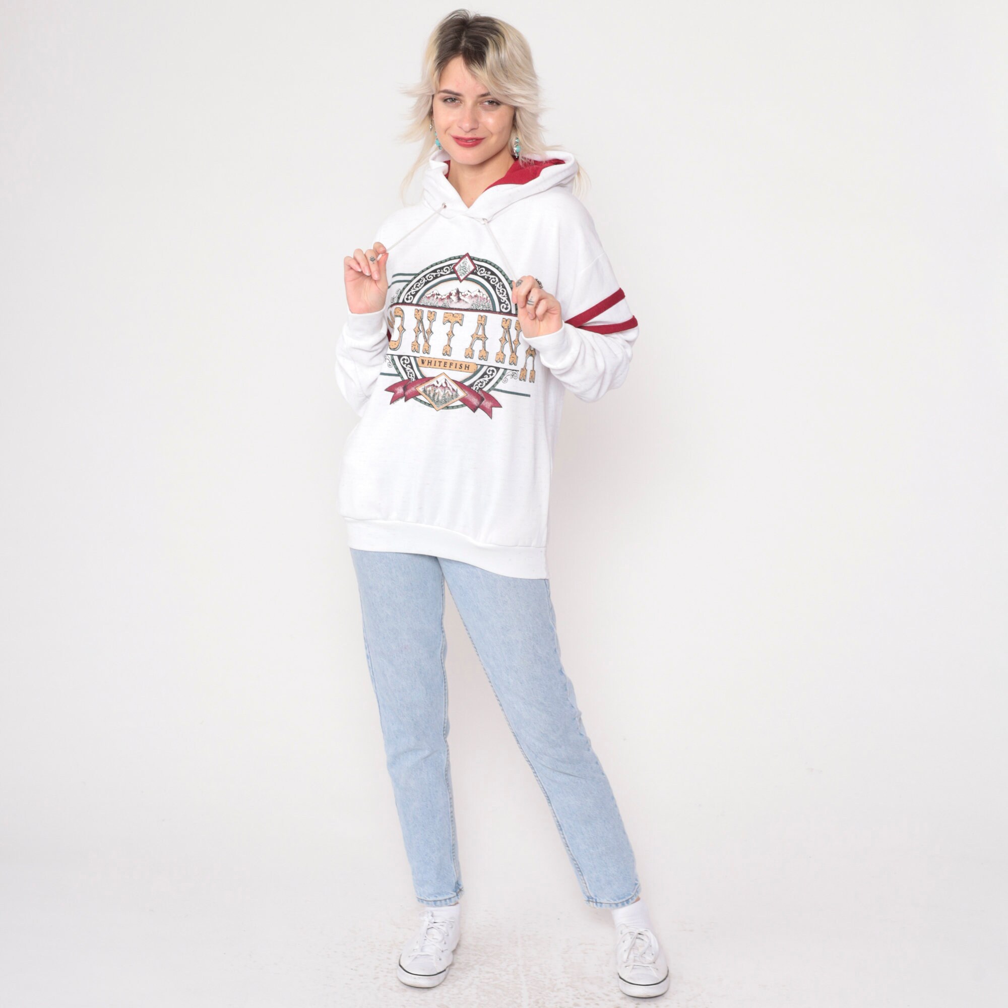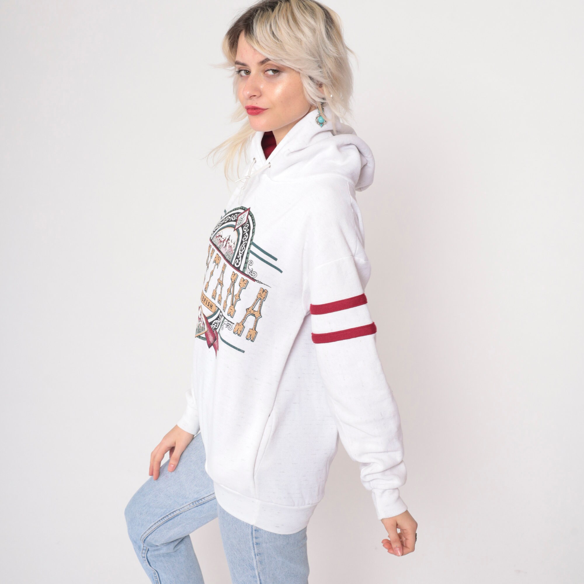 Vintage 90s hooded sweatshirt in white with a Whitefish Montana print and red stripes on the sleeves.