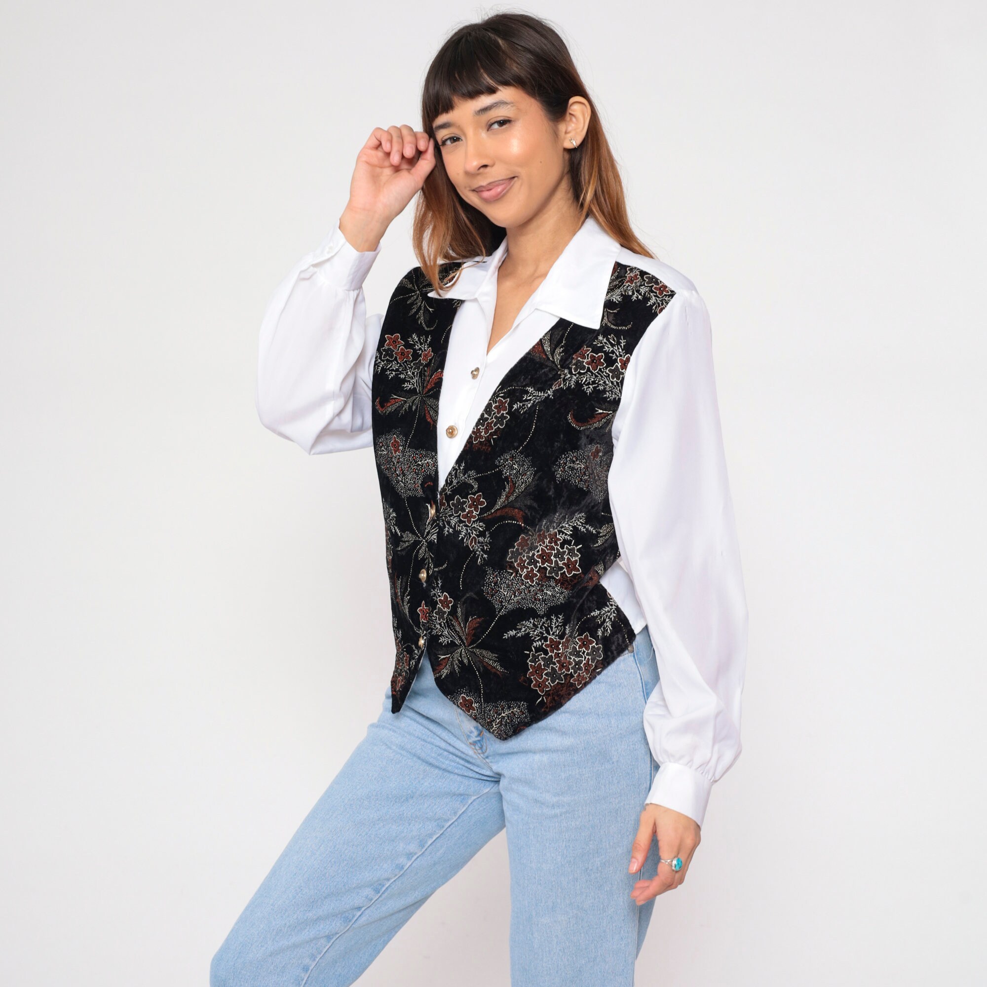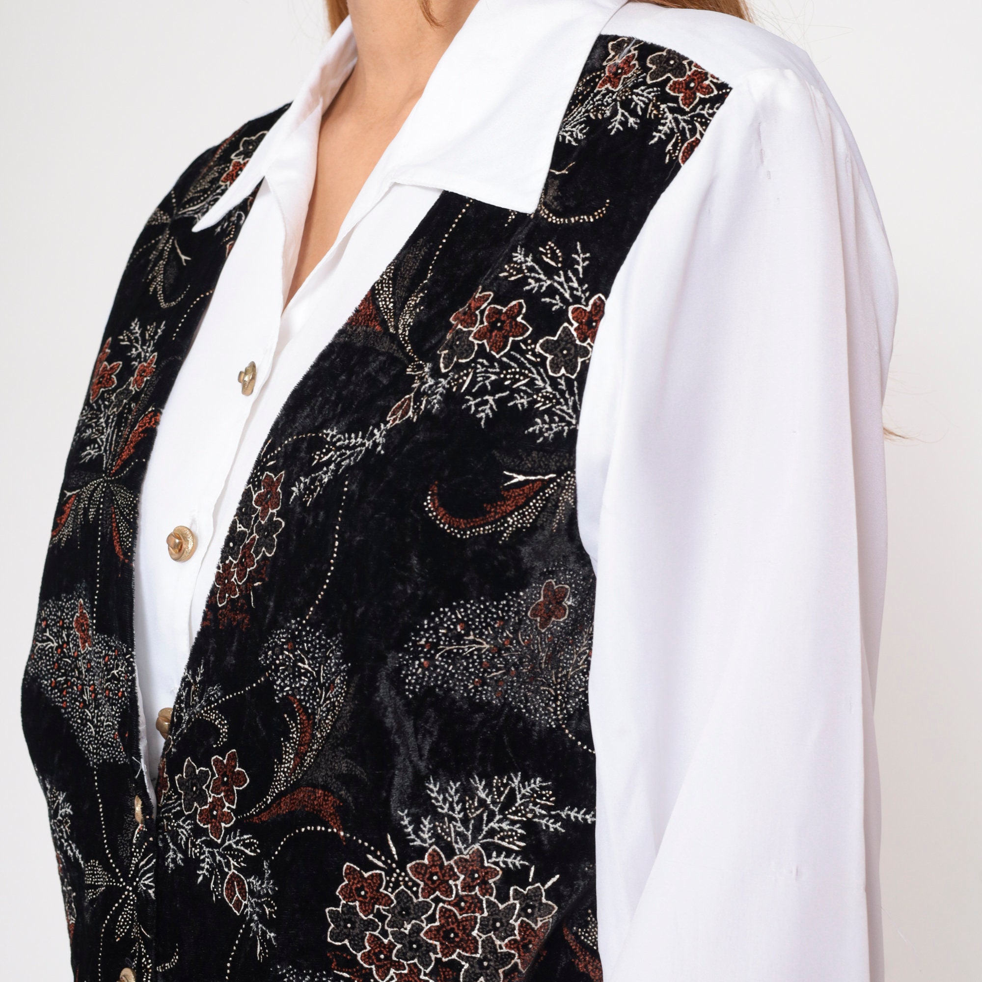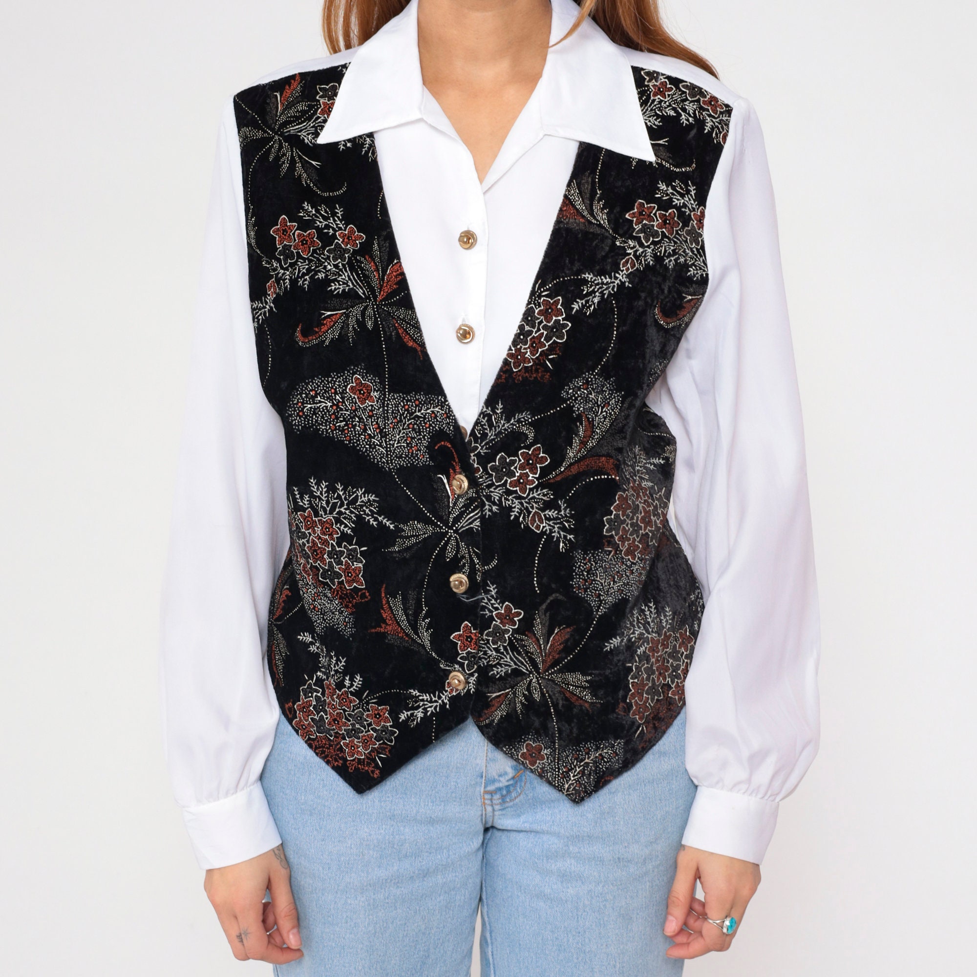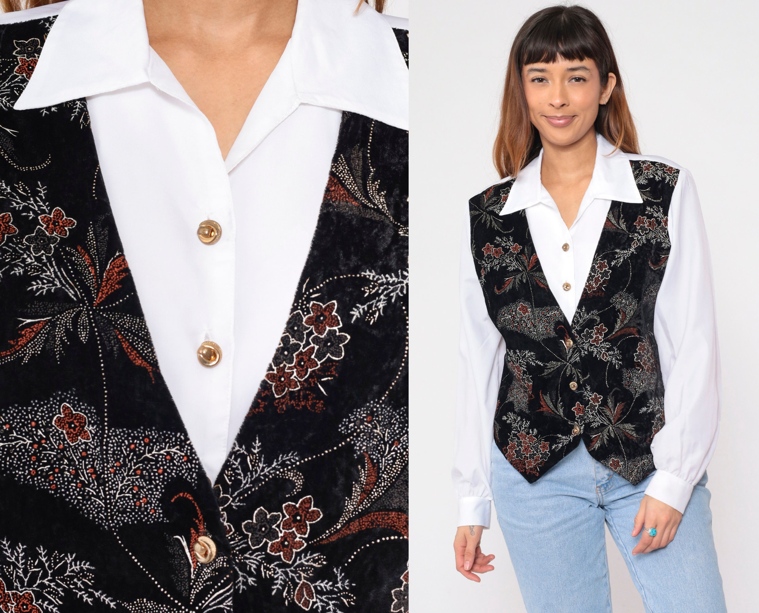 Vintage 90s shirt in white with attached black floral print vest on the front. Buttons up the front with long sleeves and a belt in the back.