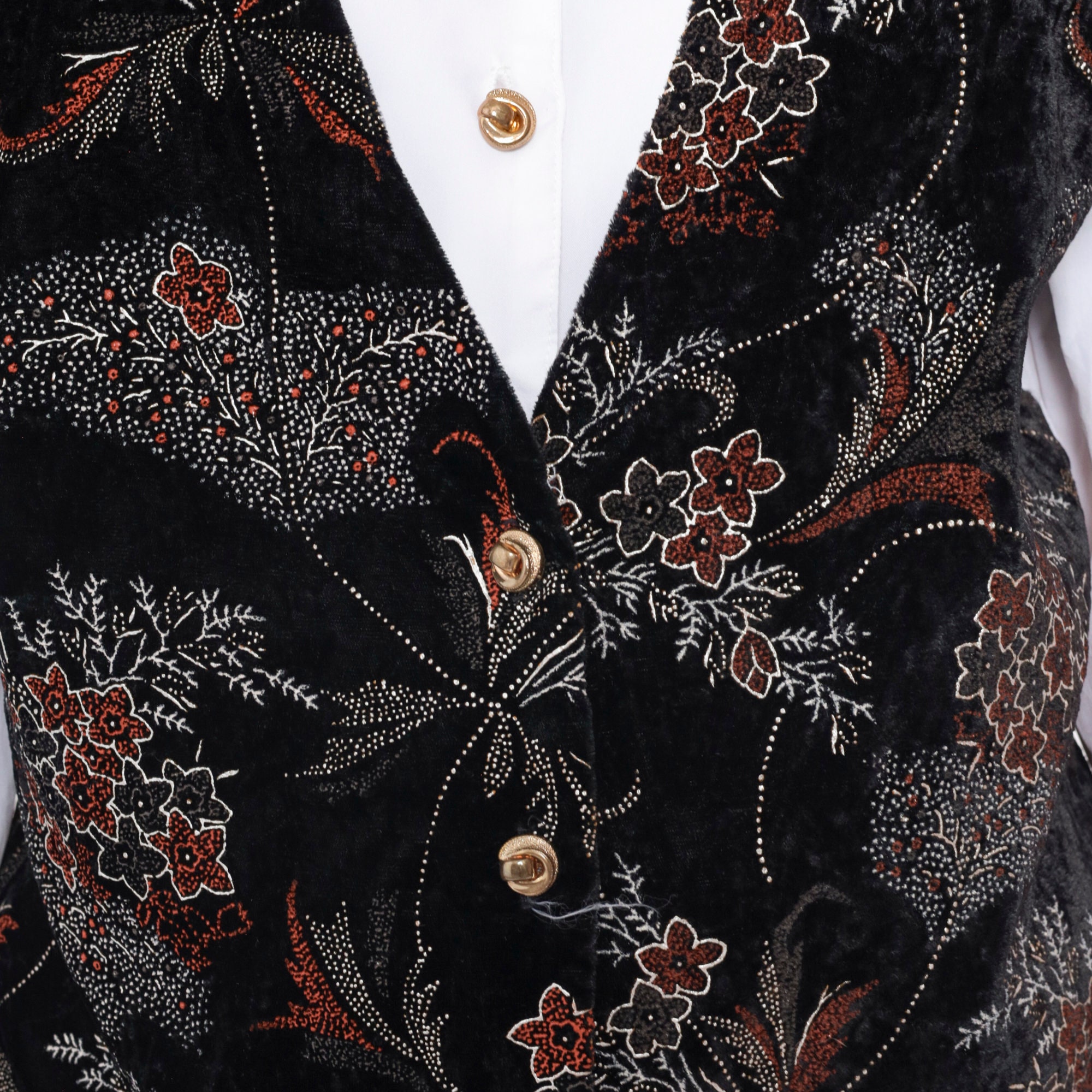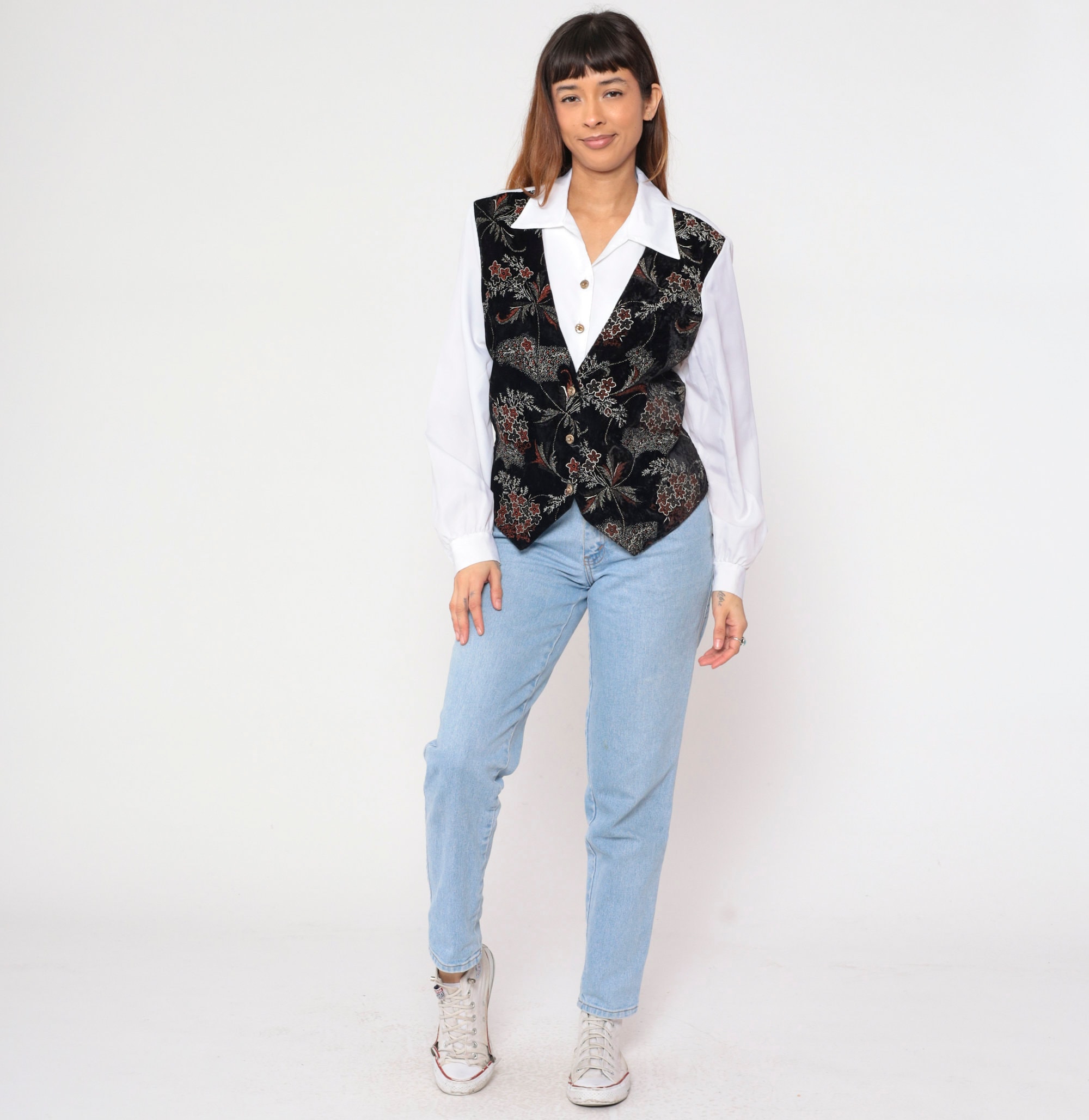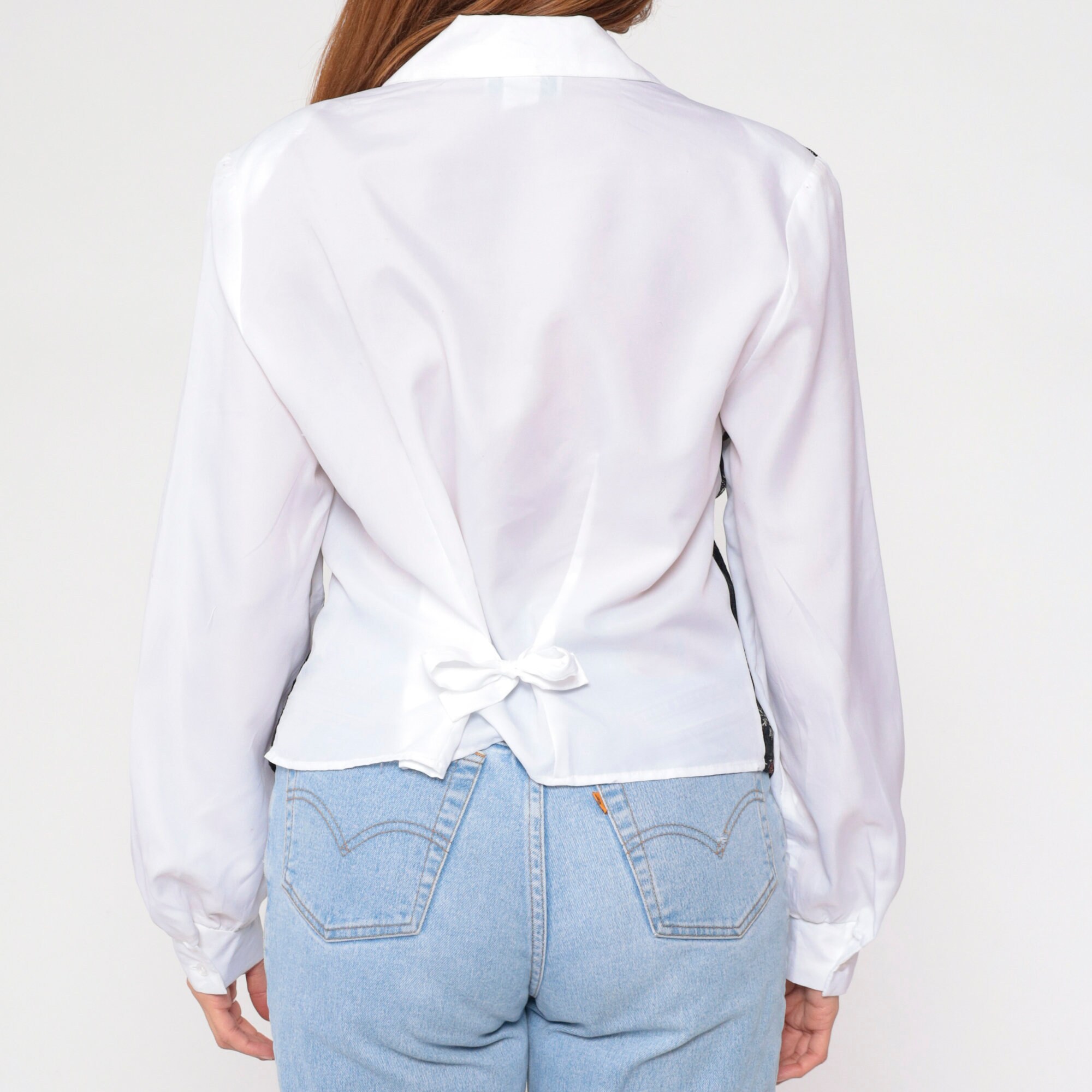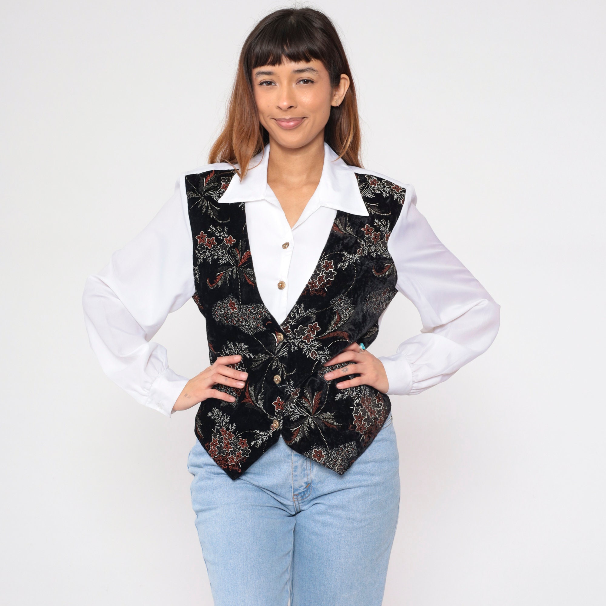 Vintage 90s shirt in white with attached black floral print vest on the front. Buttons up the front with long sleeves and a belt in the back.
