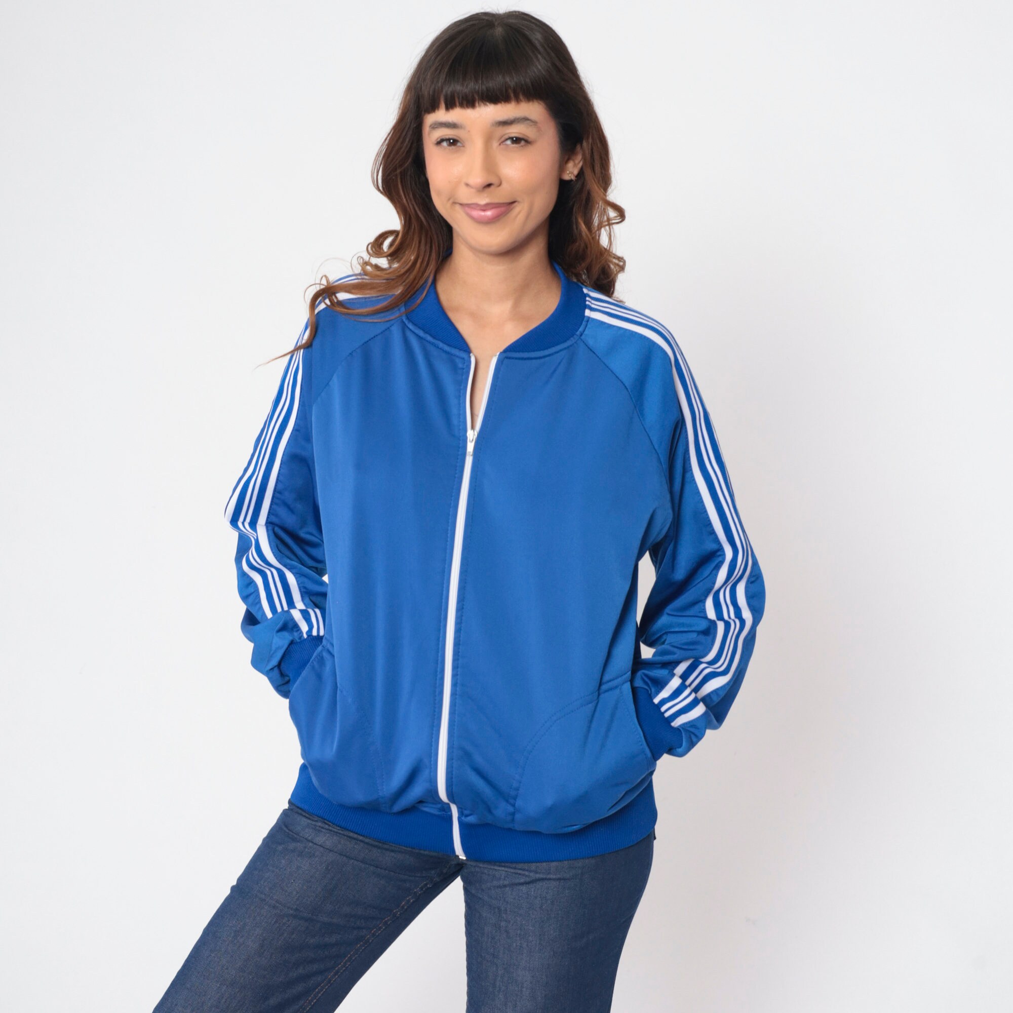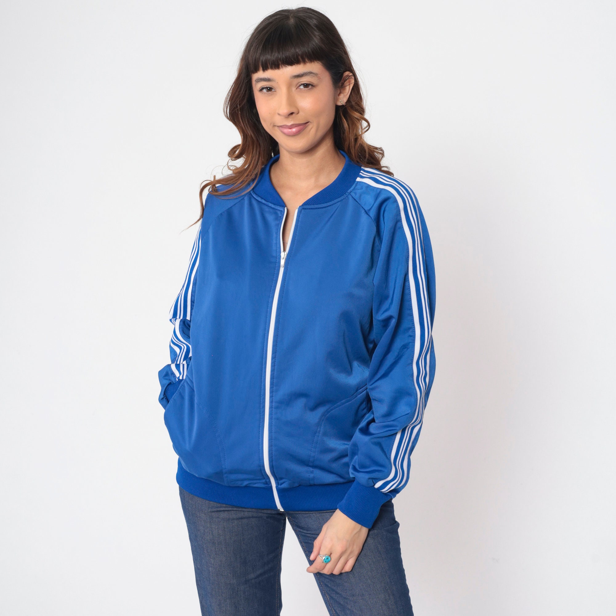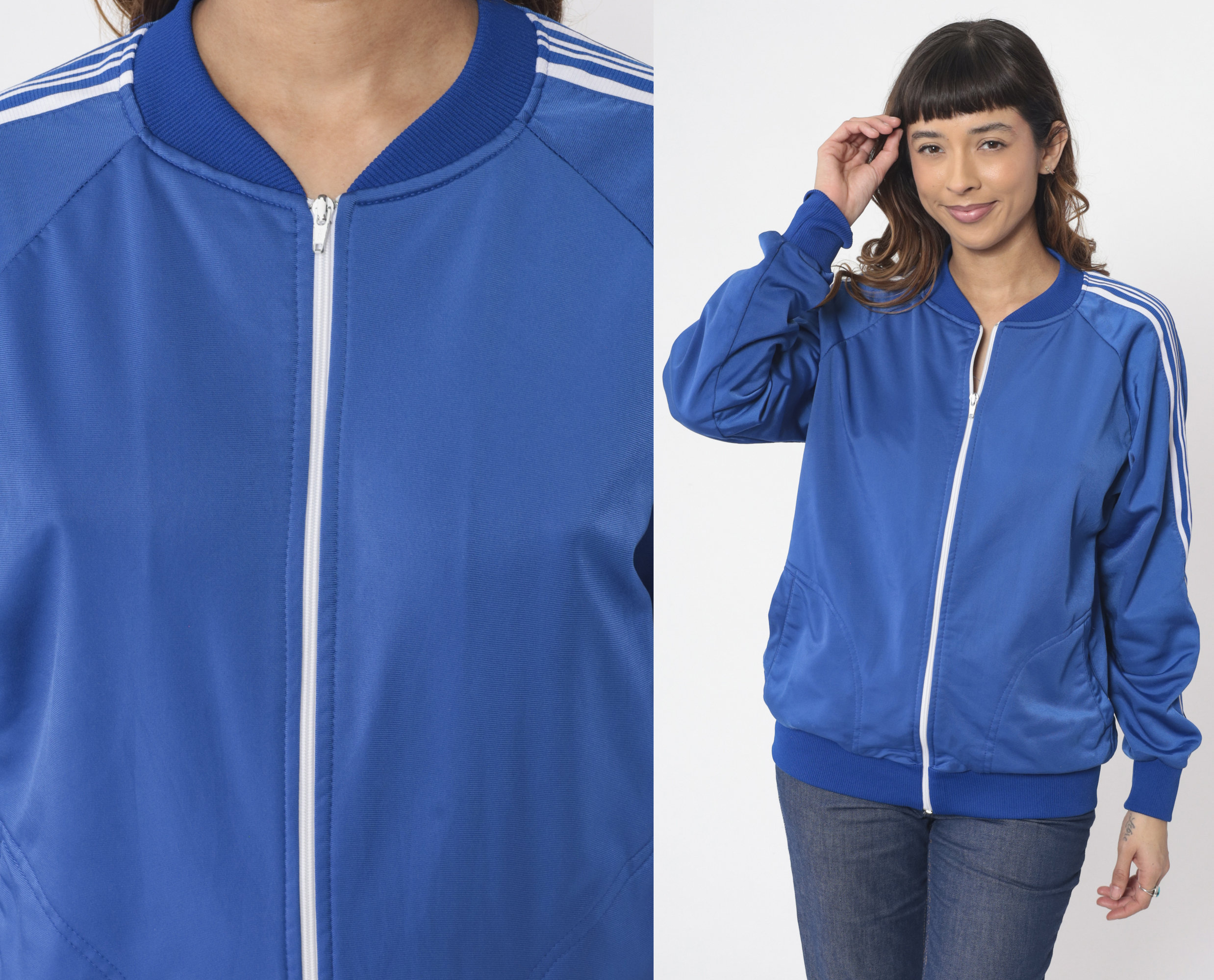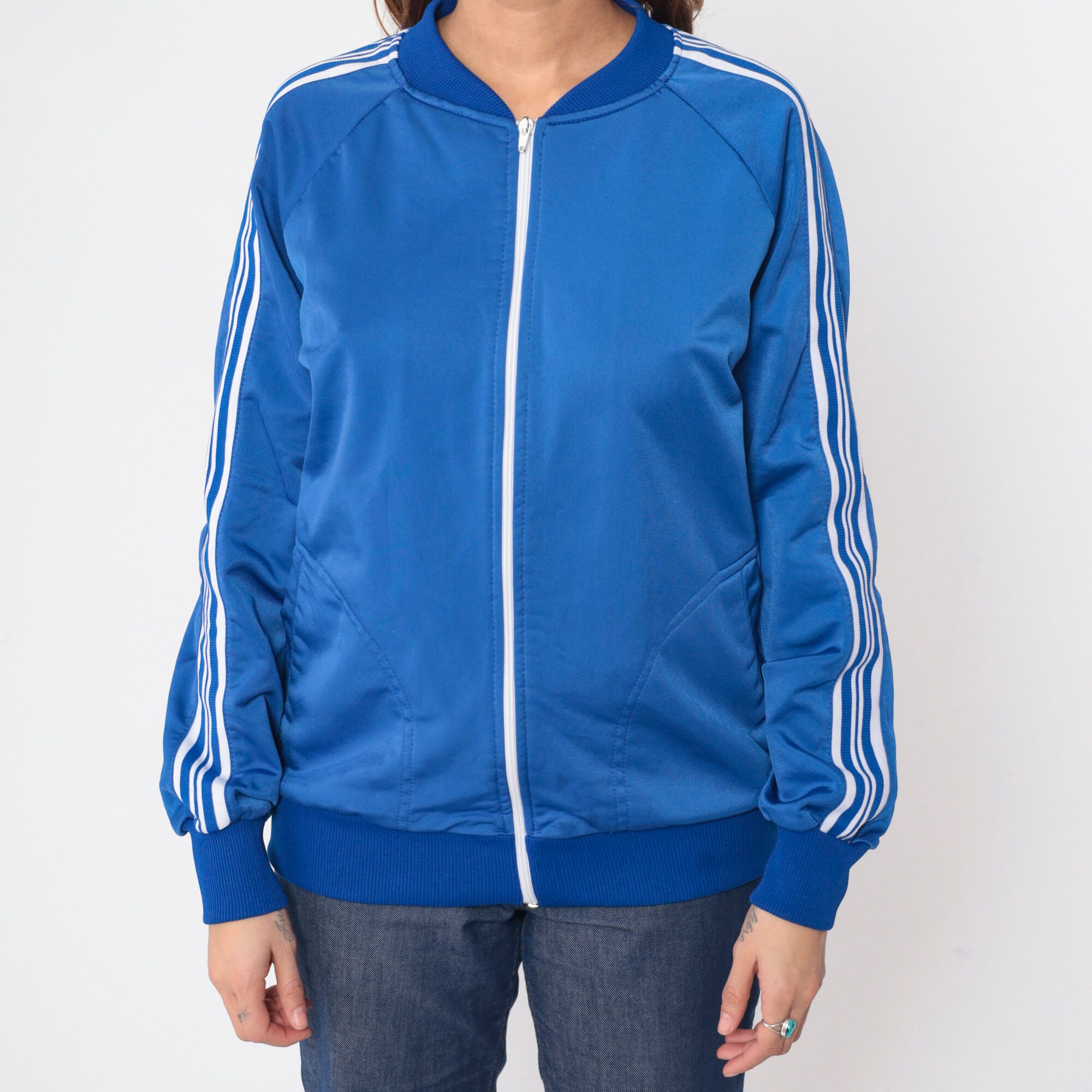 Vintage 80s track jacket in blue with raglan sleeves and white stripes. Zips up the front.