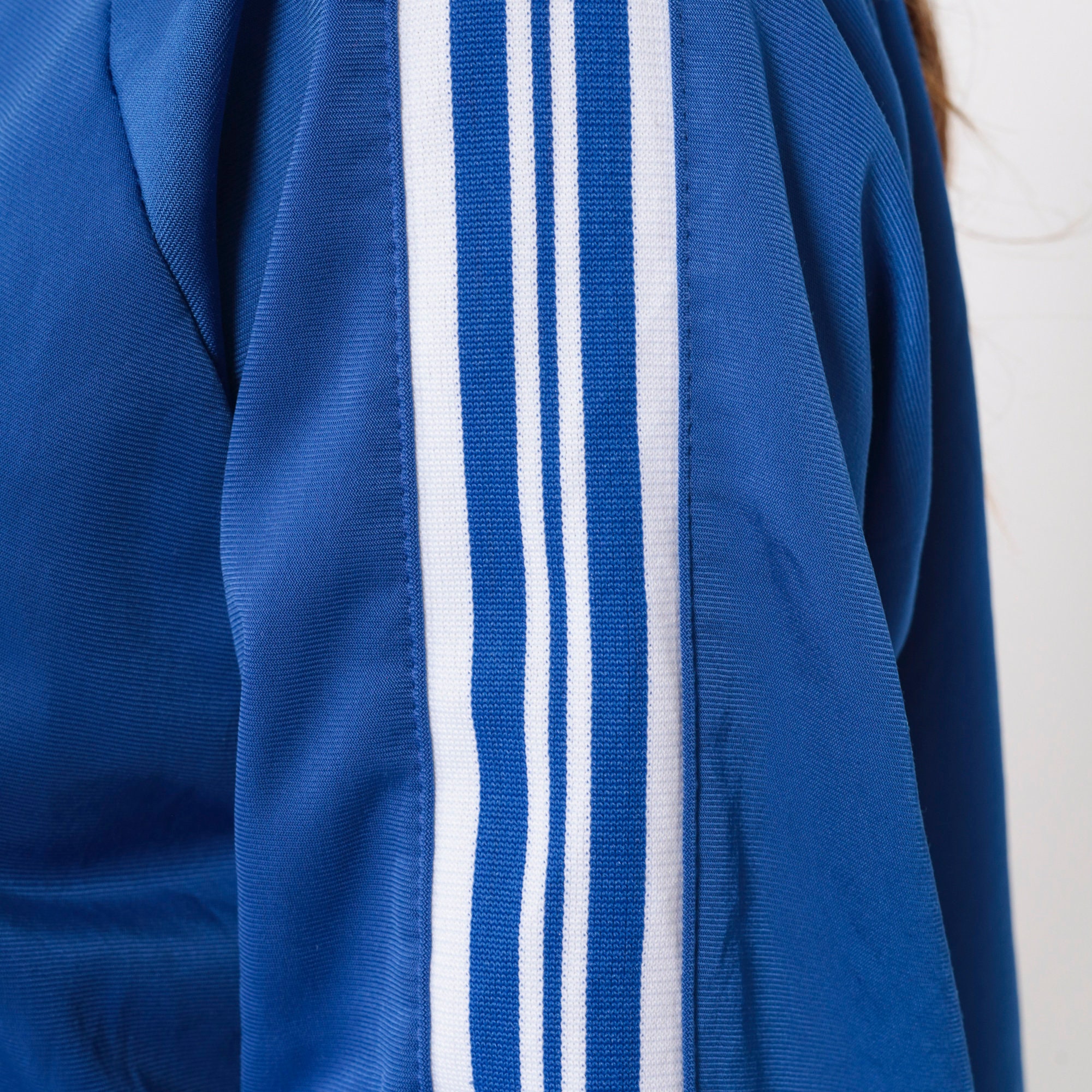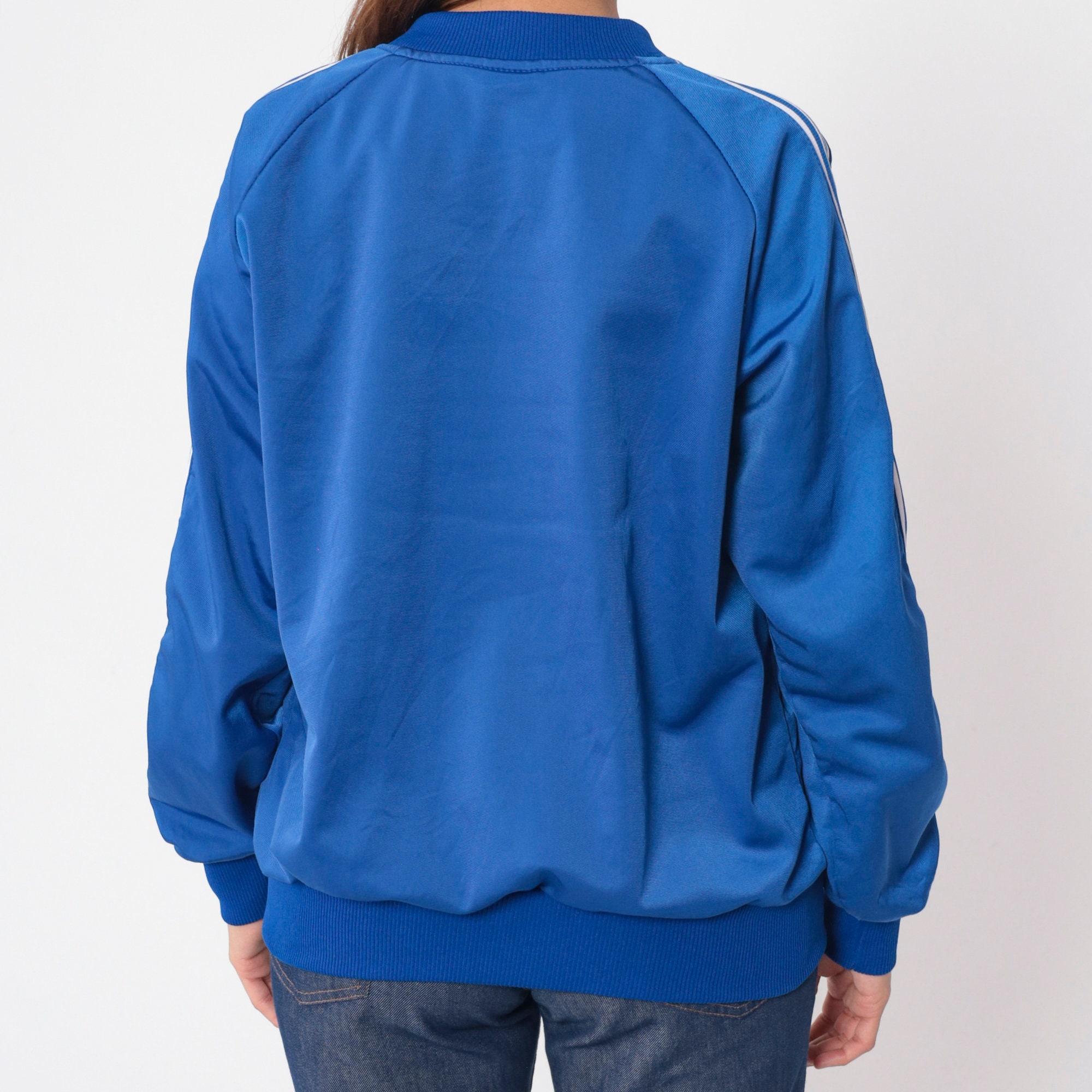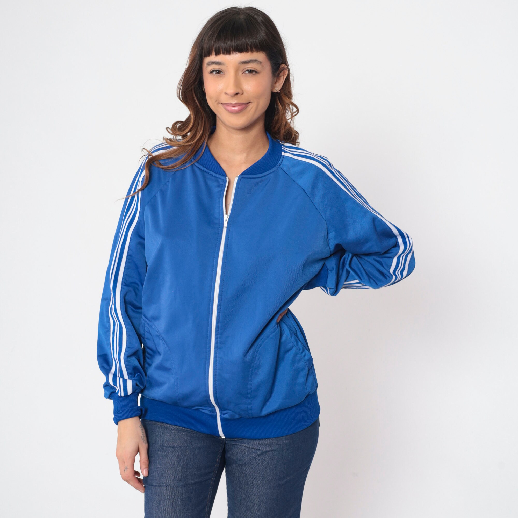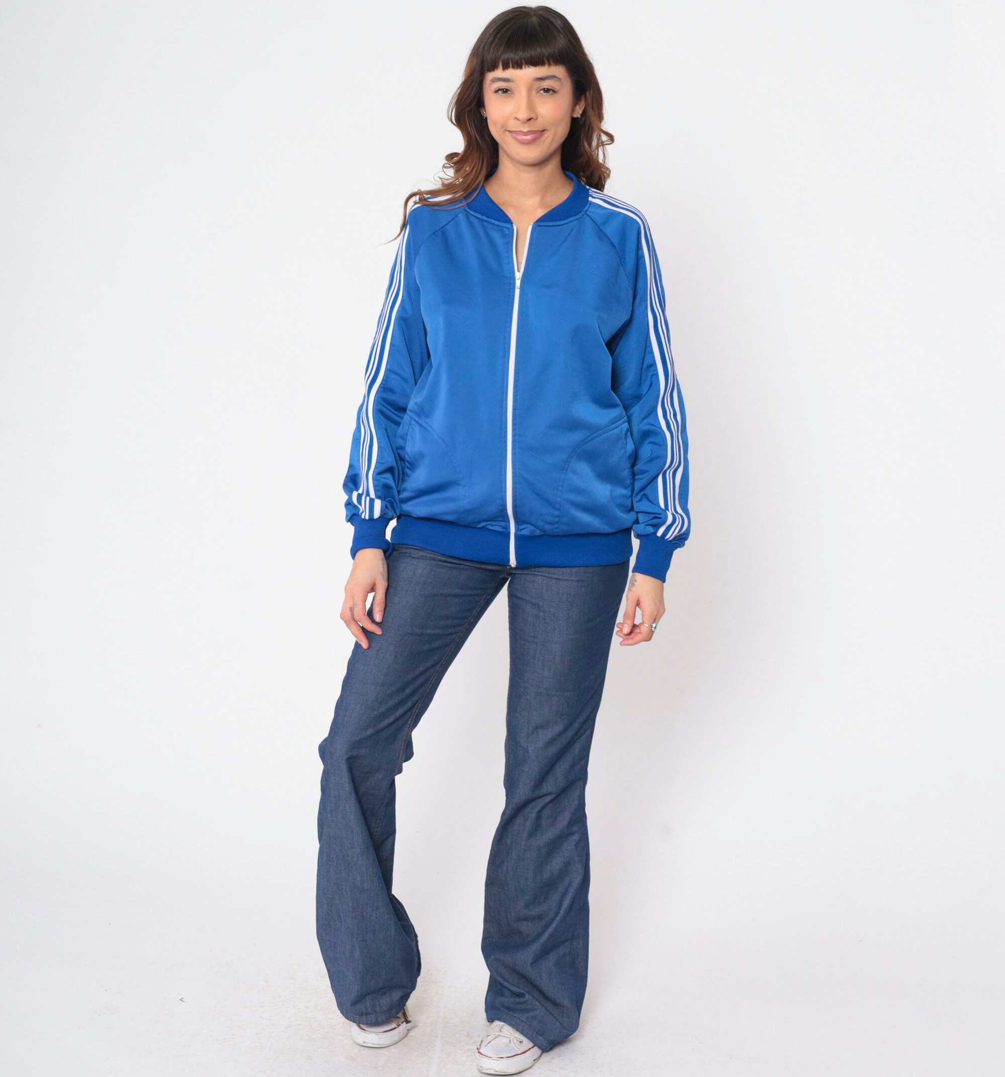 Vintage 80s track jacket in blue with raglan sleeves and white stripes. Zips up the front.