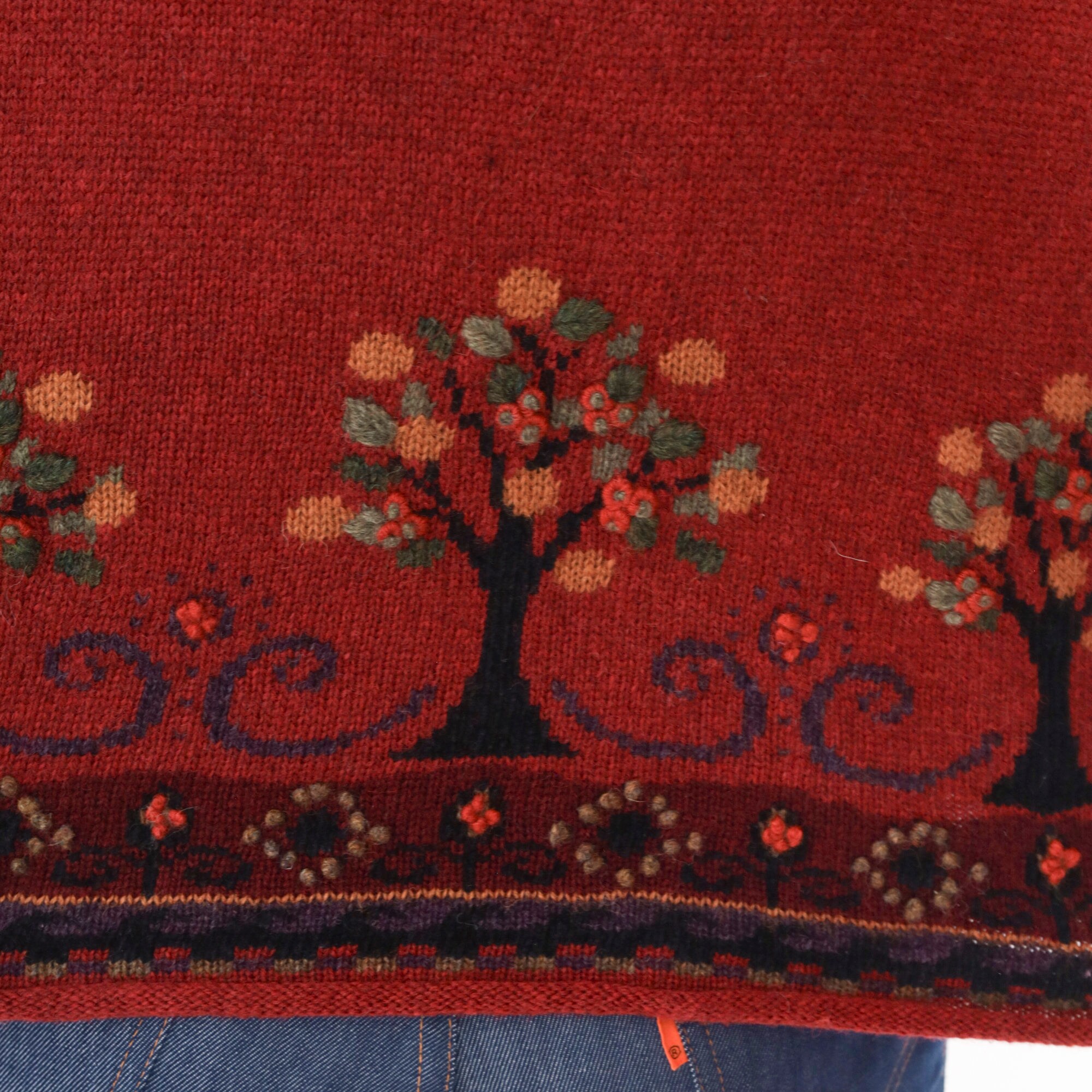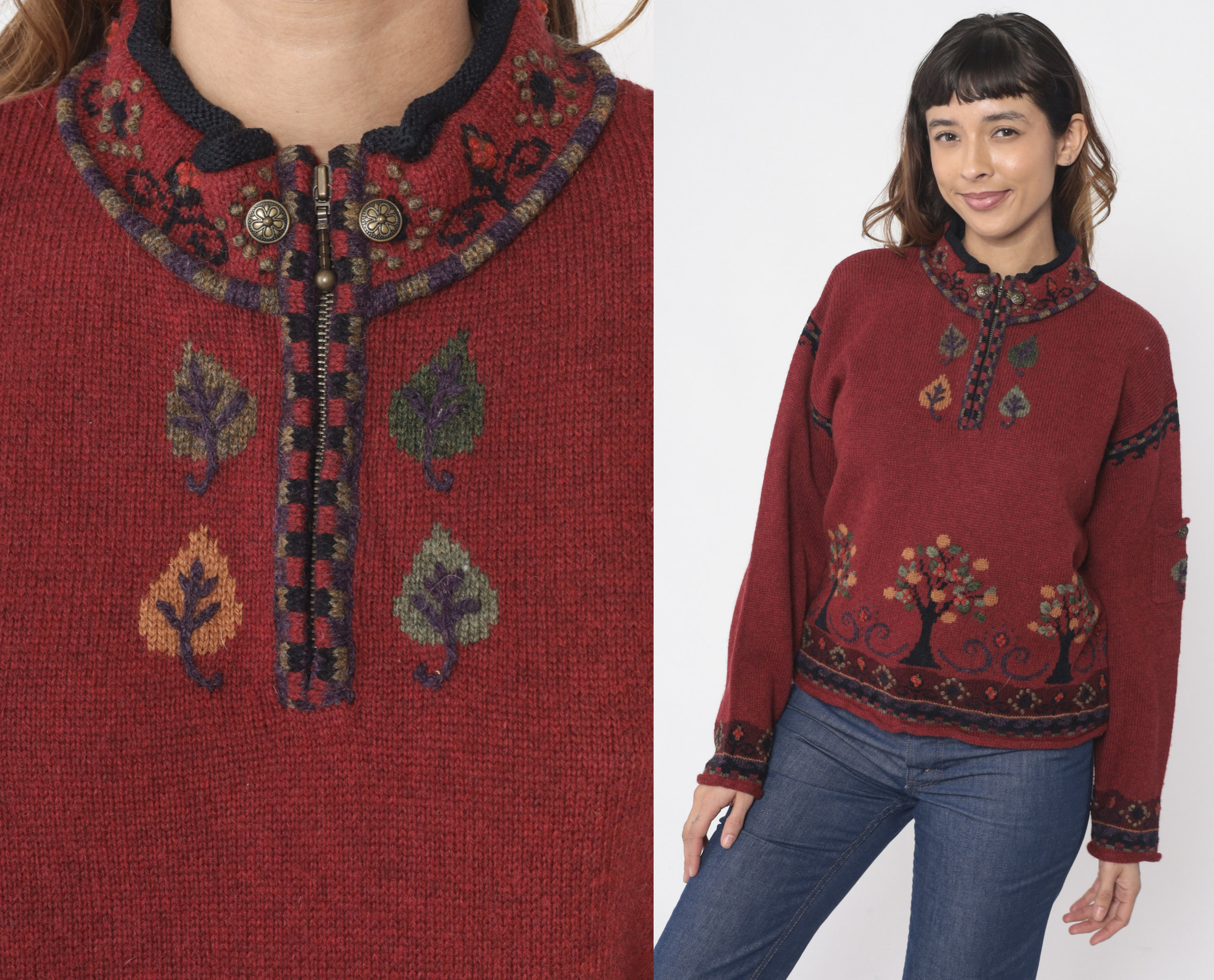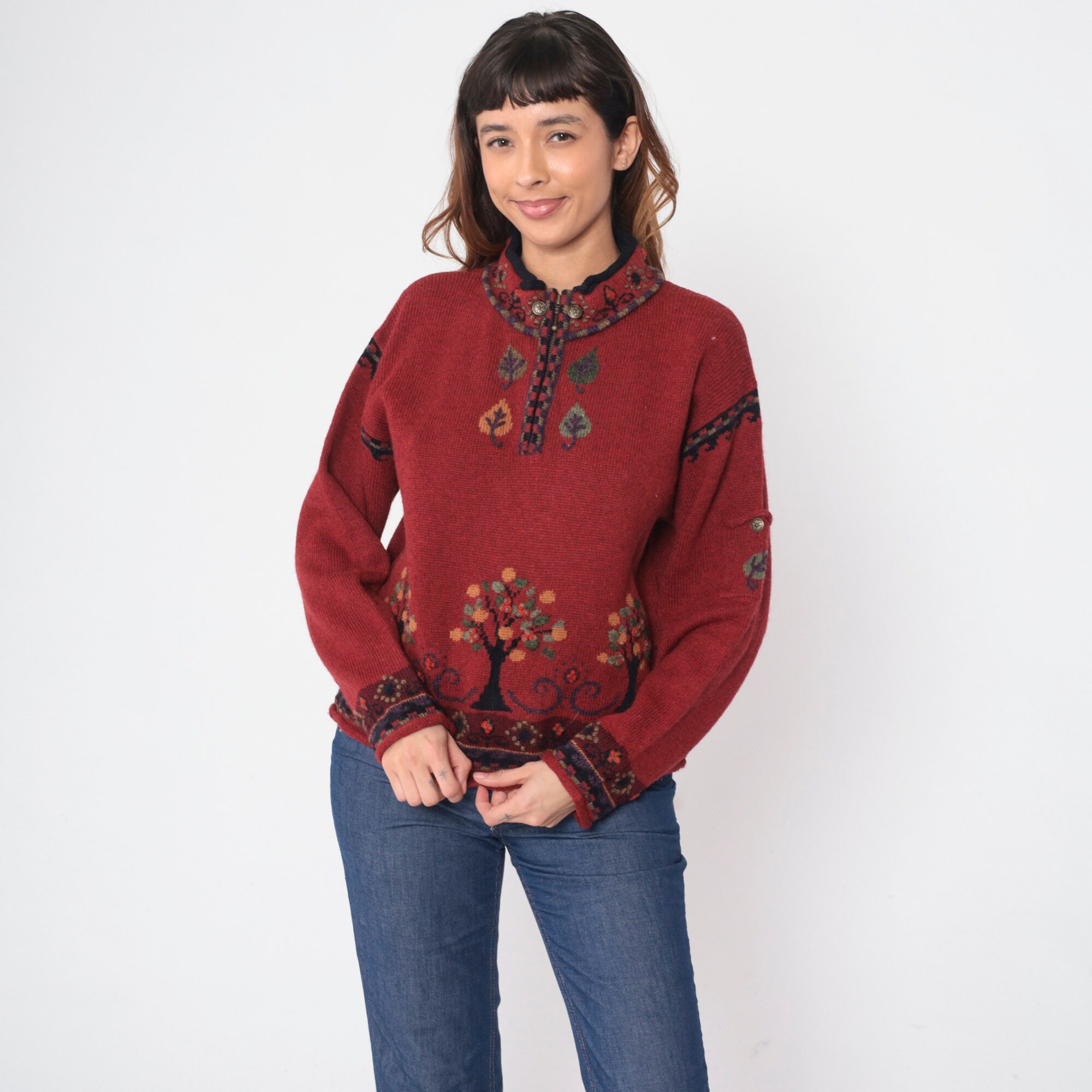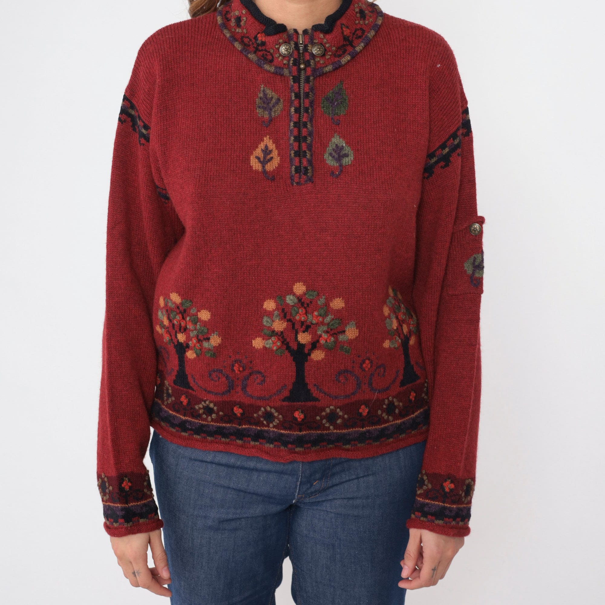 Vintage Y2K sweater in red wool with a tree design and a quarter zip up the chest.