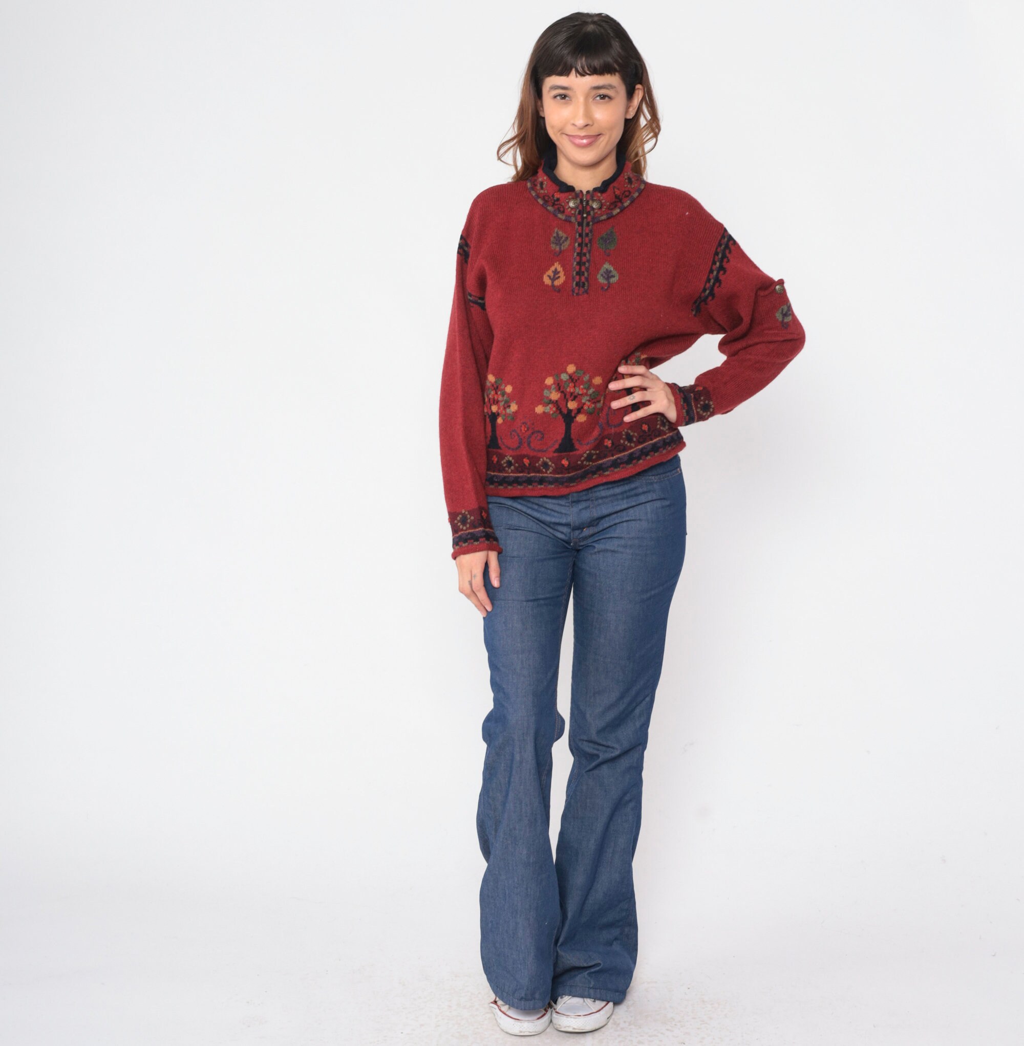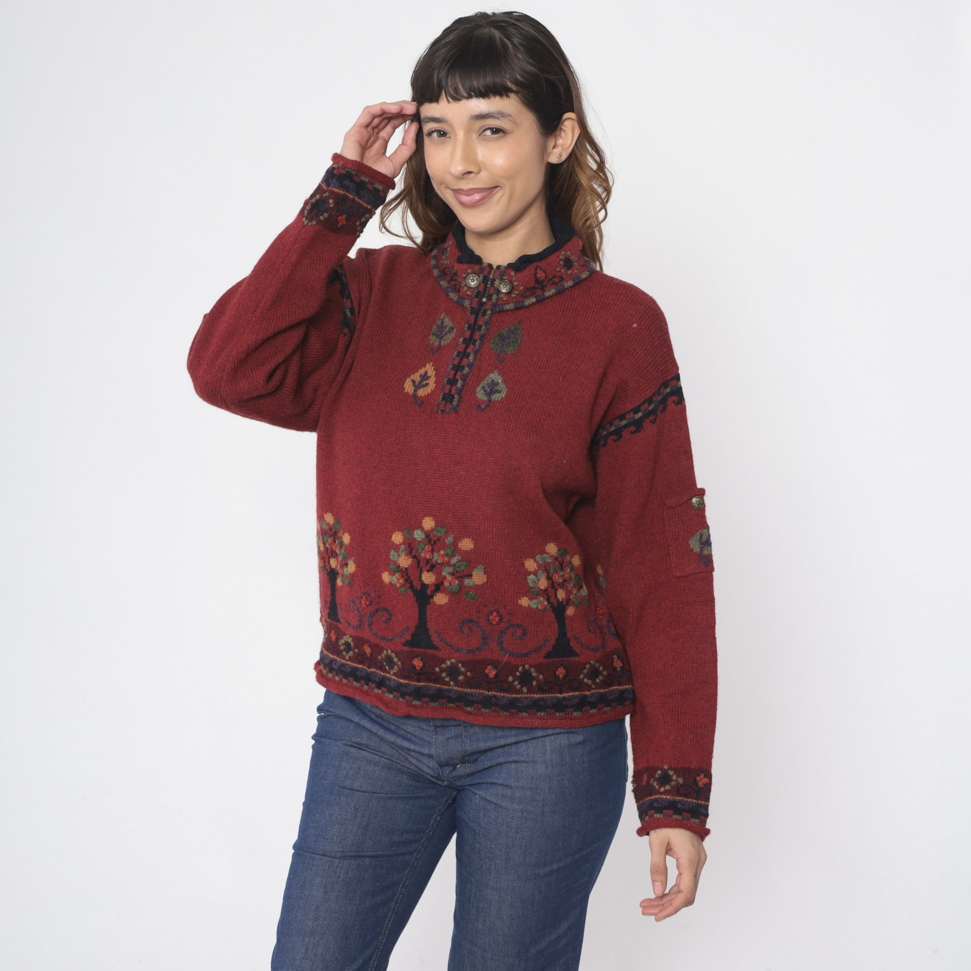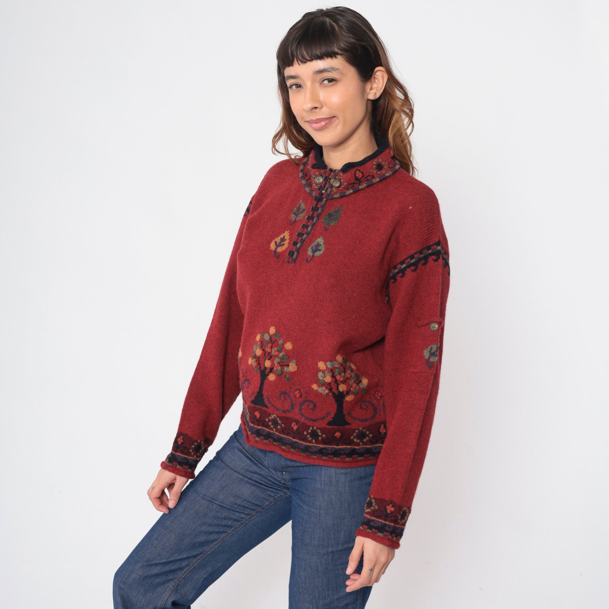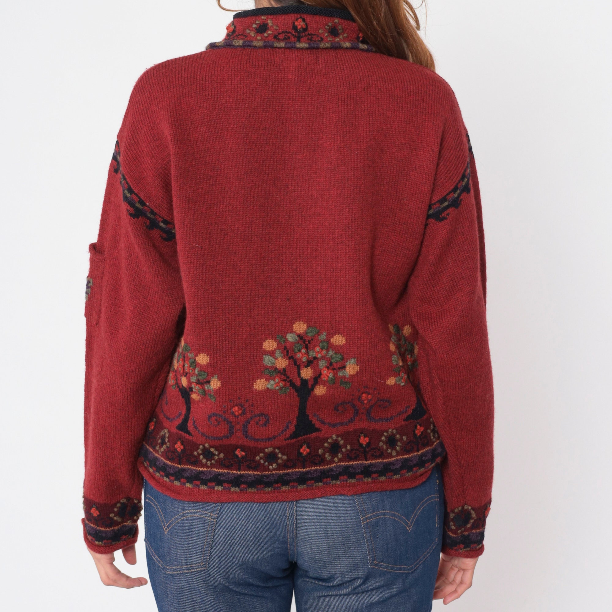 Vintage Y2K sweater in red wool with a tree design and a quarter zip up the chest.