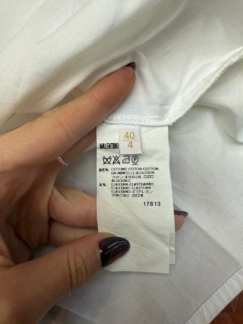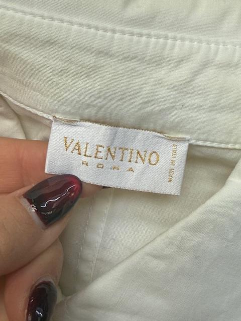 Vintage 80s blouse by Valentino in white with a ruffled front. Buttons up the front with long sleeves.