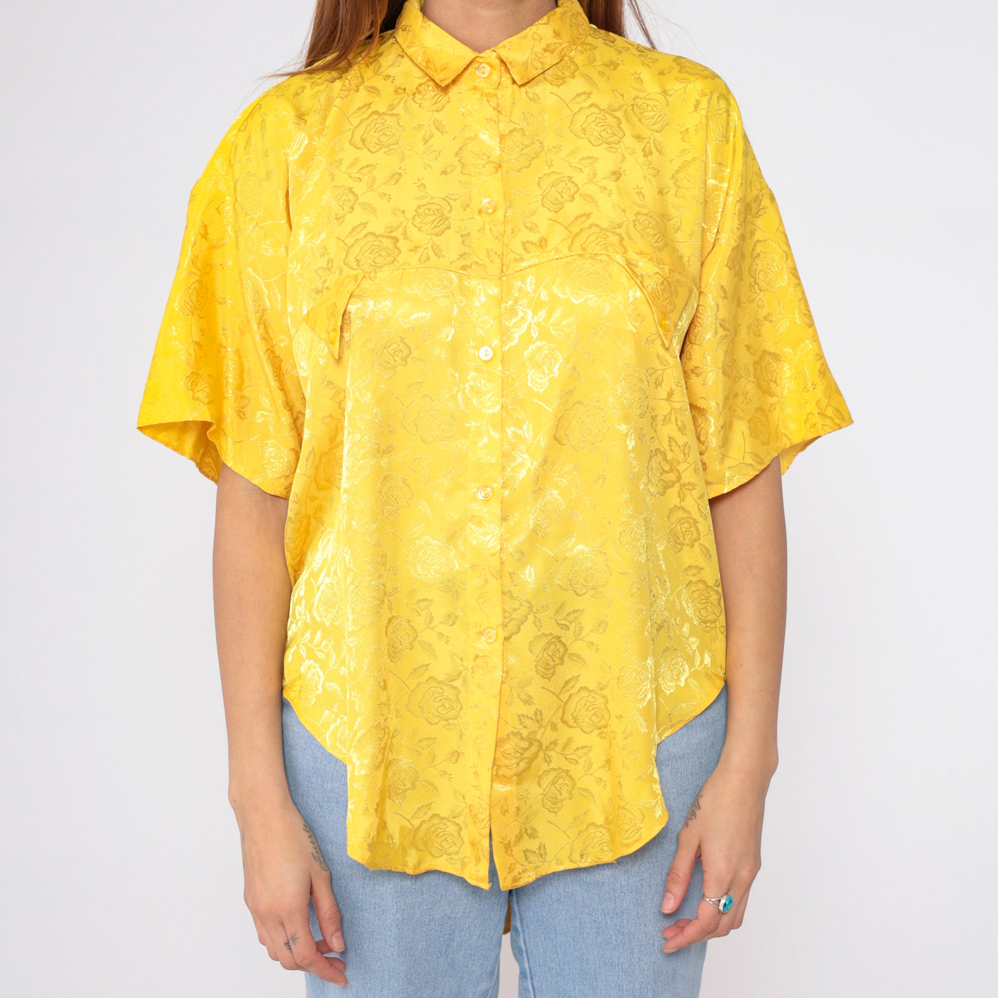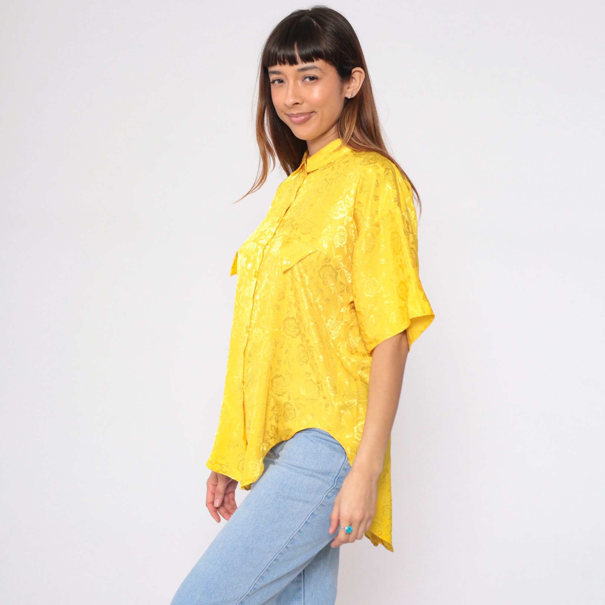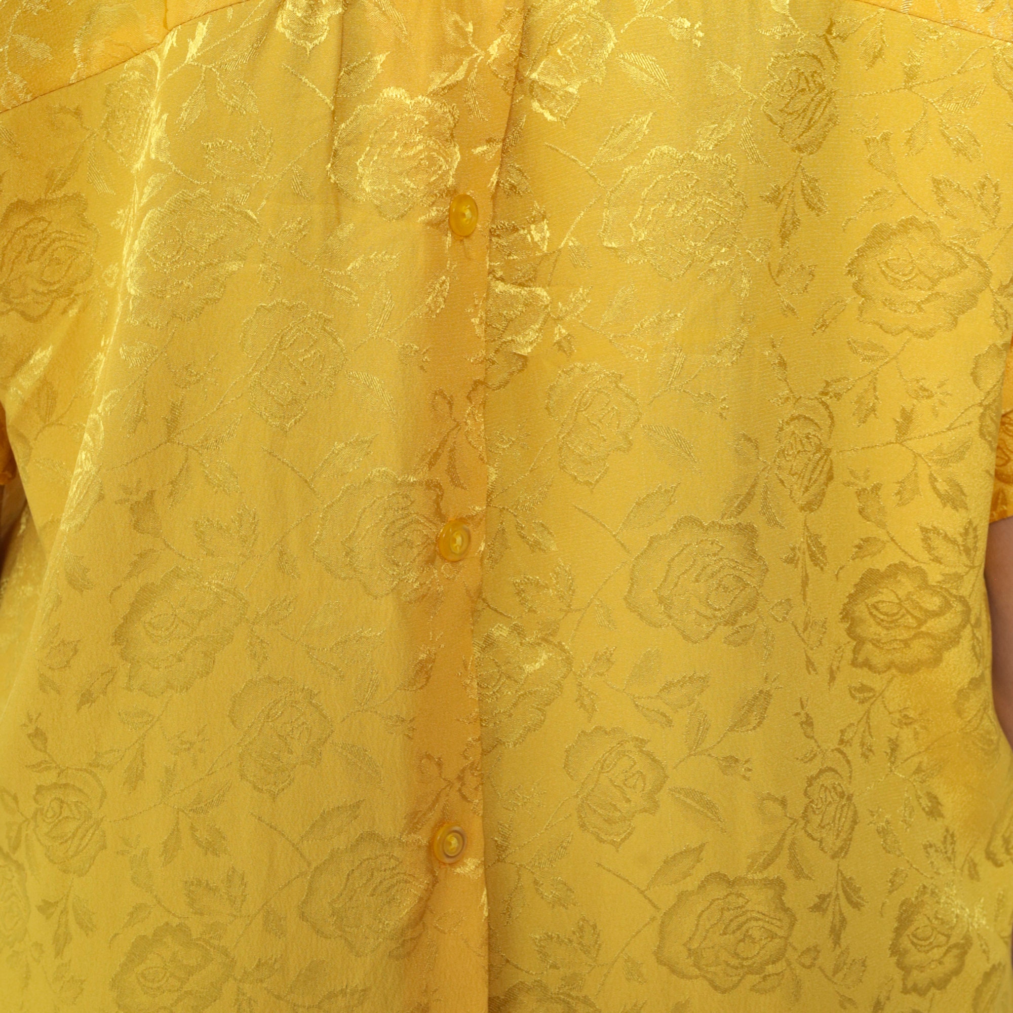 Vintage 90s blouse in bright yellow with an embossed floral design. Buttons up the front with short sleeves and decorative triangular flaps on the chest.
