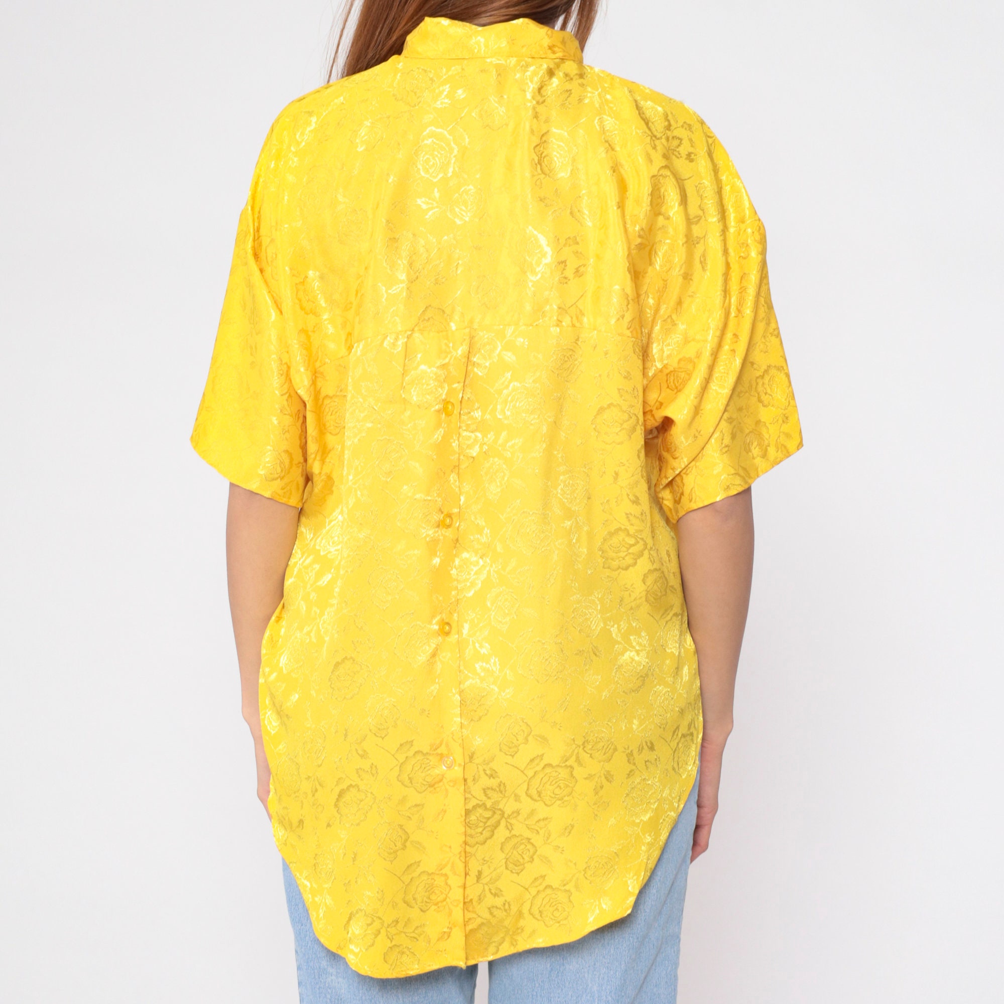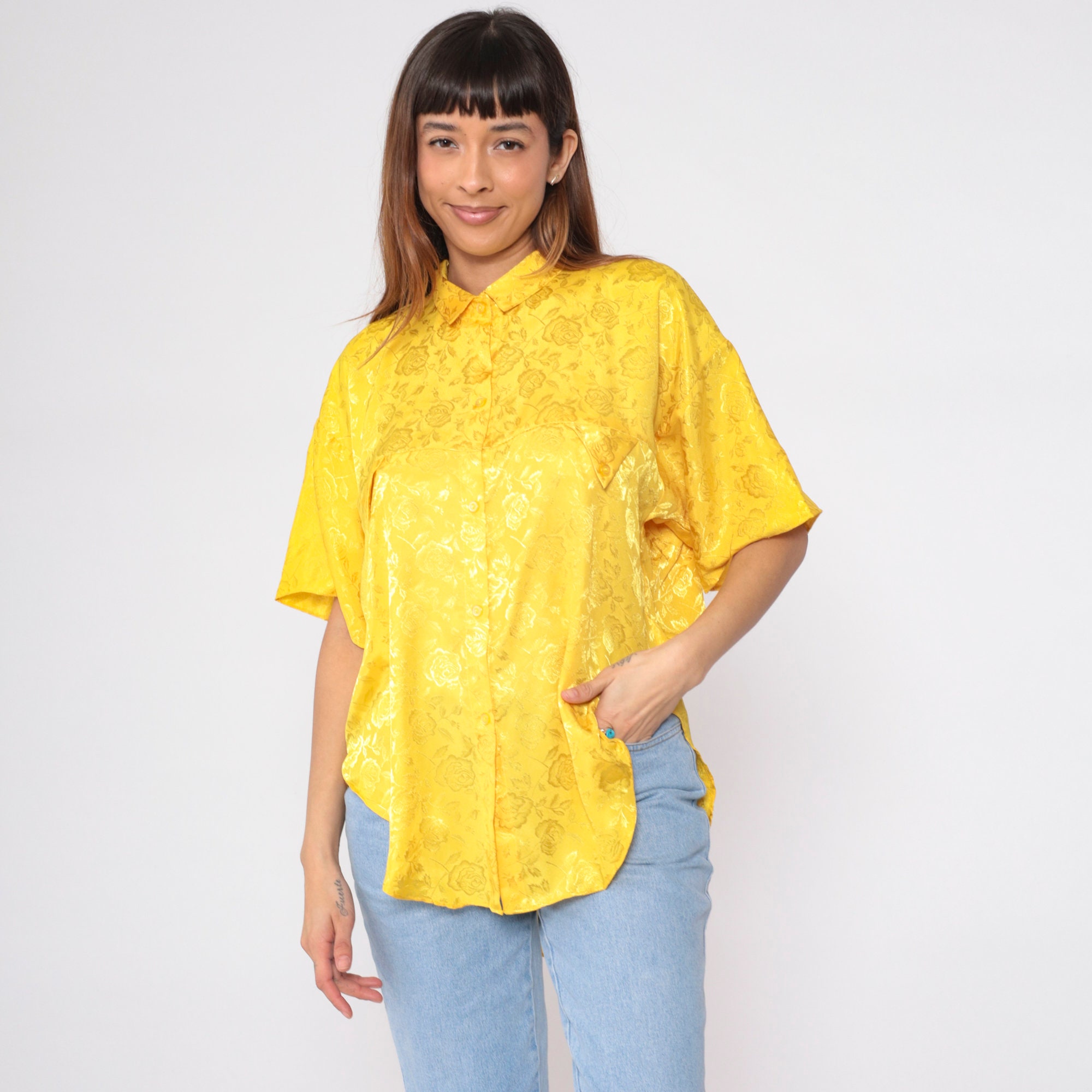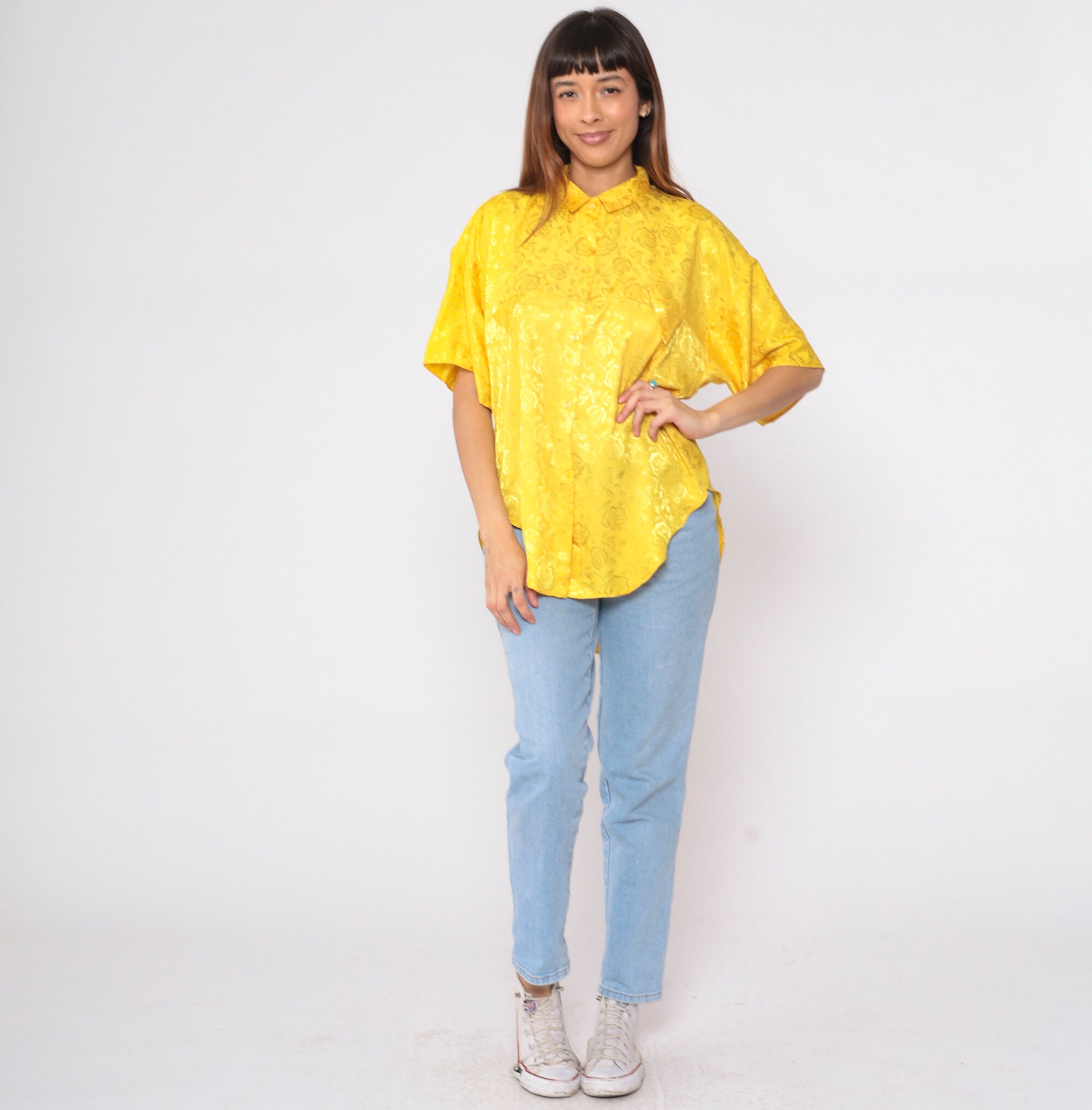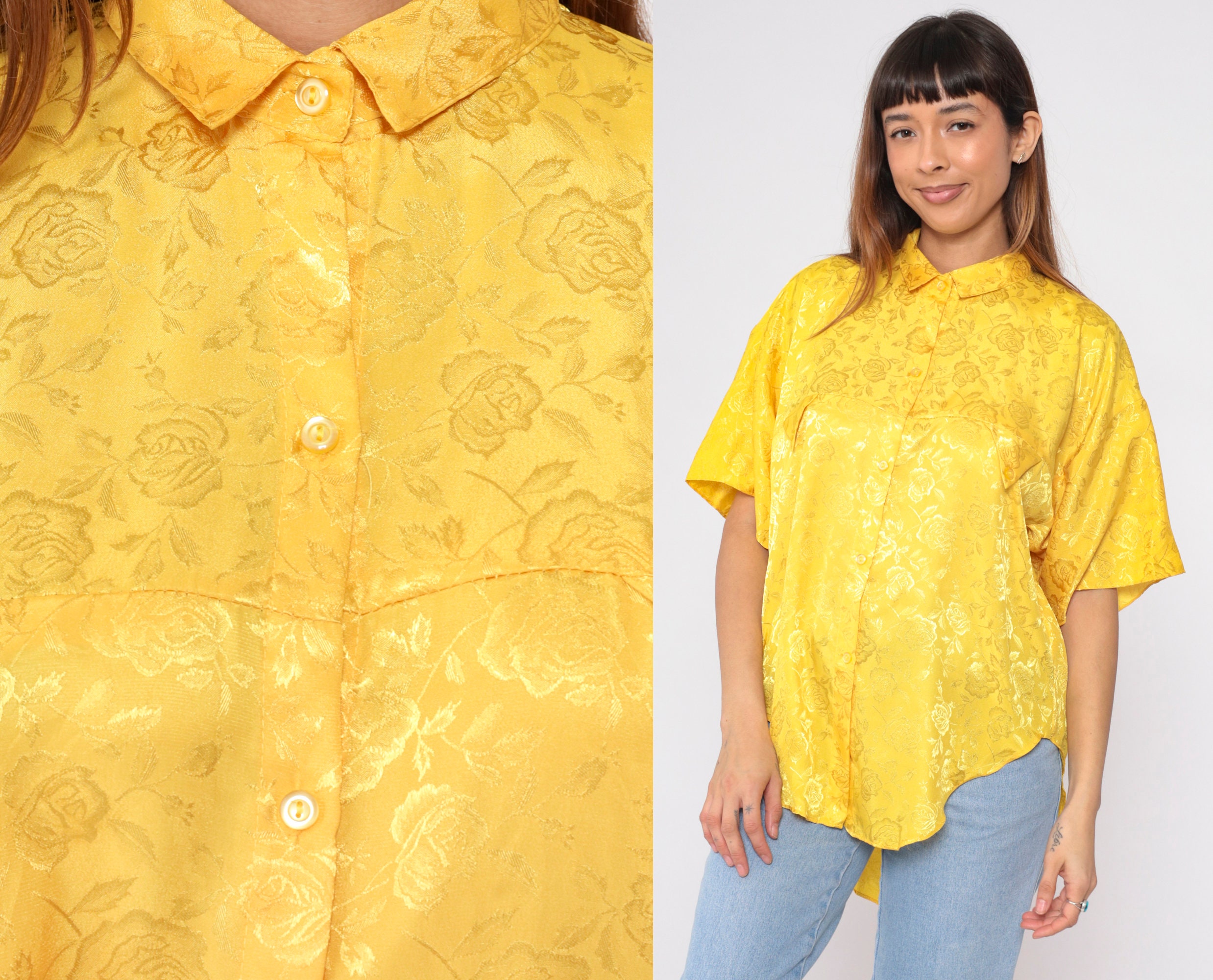 Vintage 90s blouse in bright yellow with an embossed floral design. Buttons up the front with short sleeves and decorative triangular flaps on the chest.
