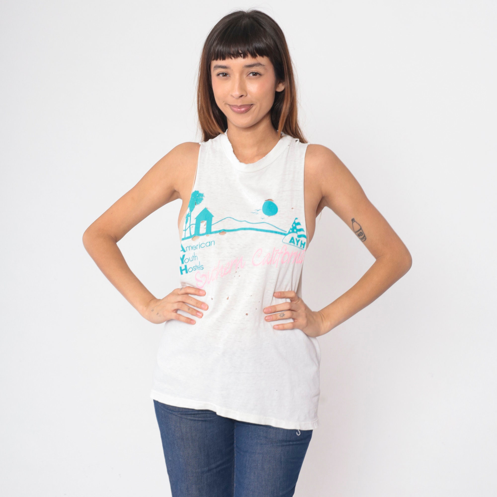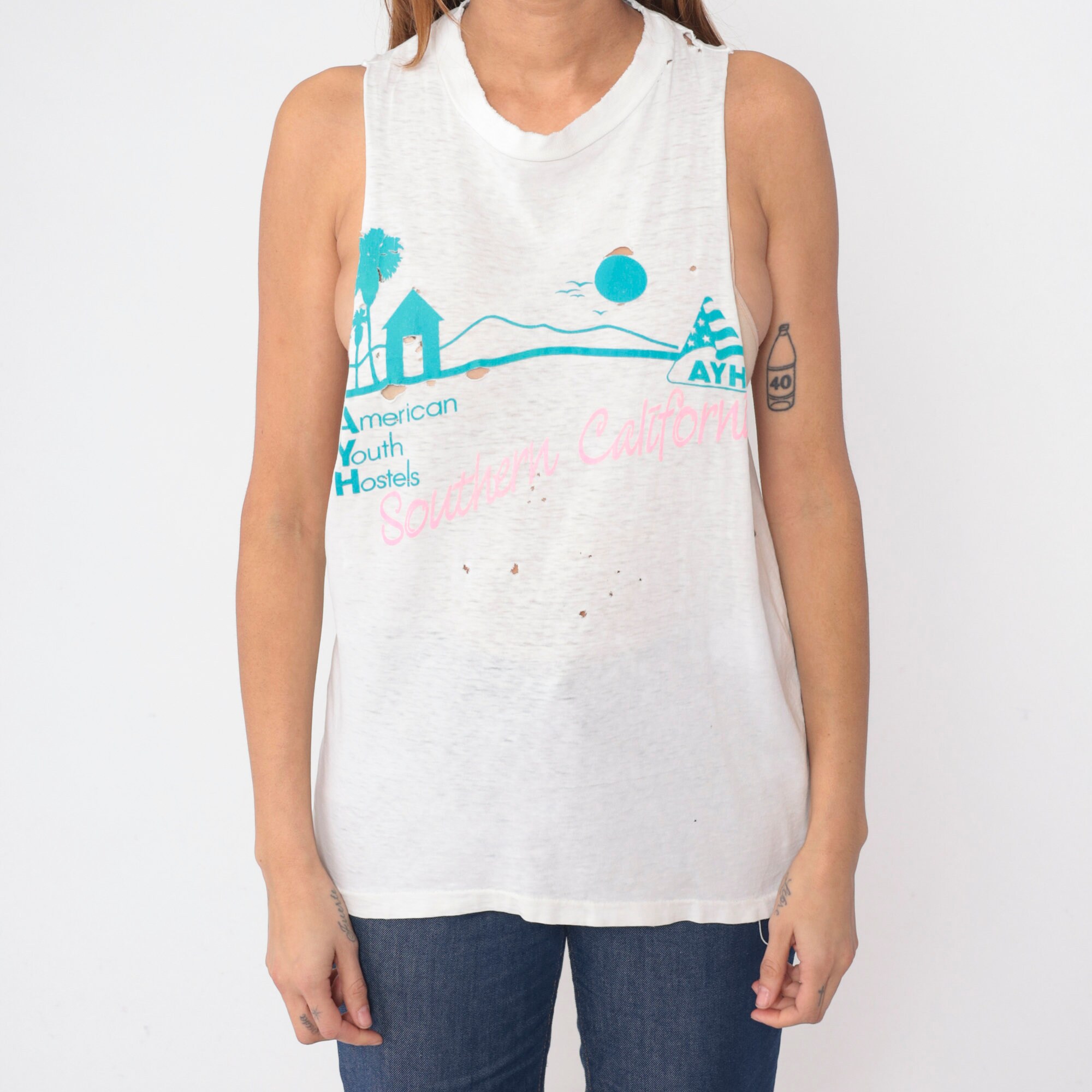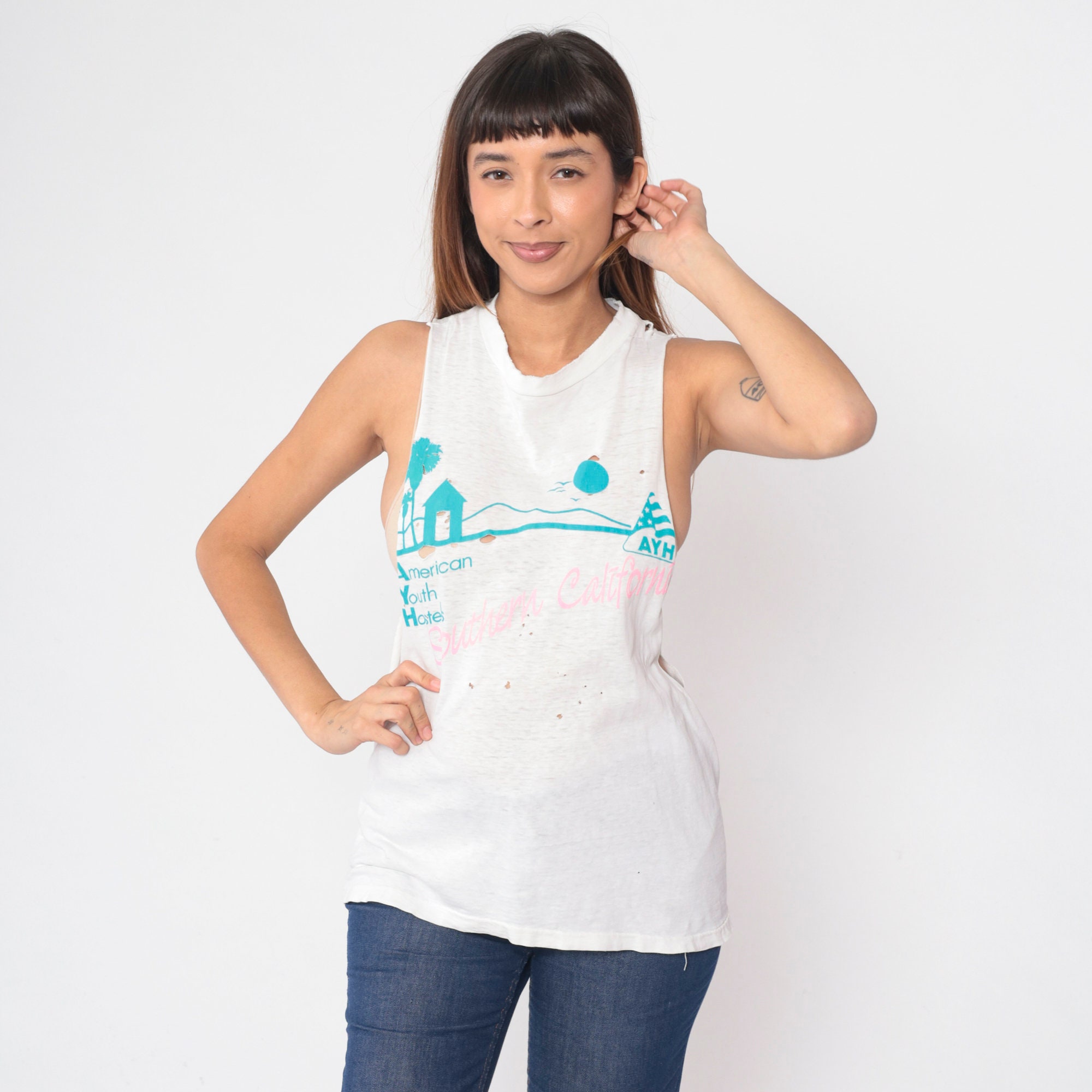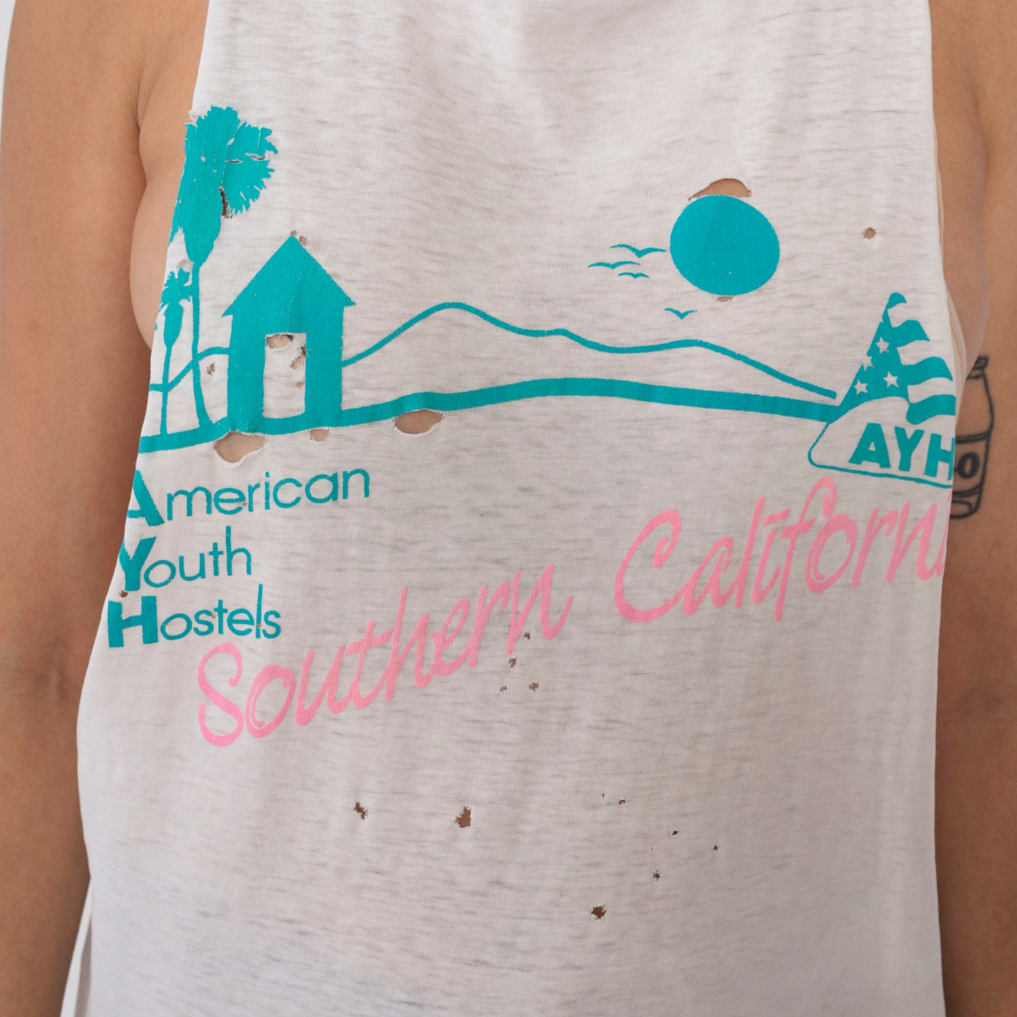 Vintage 90s tank top from Southern California American Youth Hostels with a bird and palm tree print. Distressed and thin with raw cut off armholes and holes throughout.