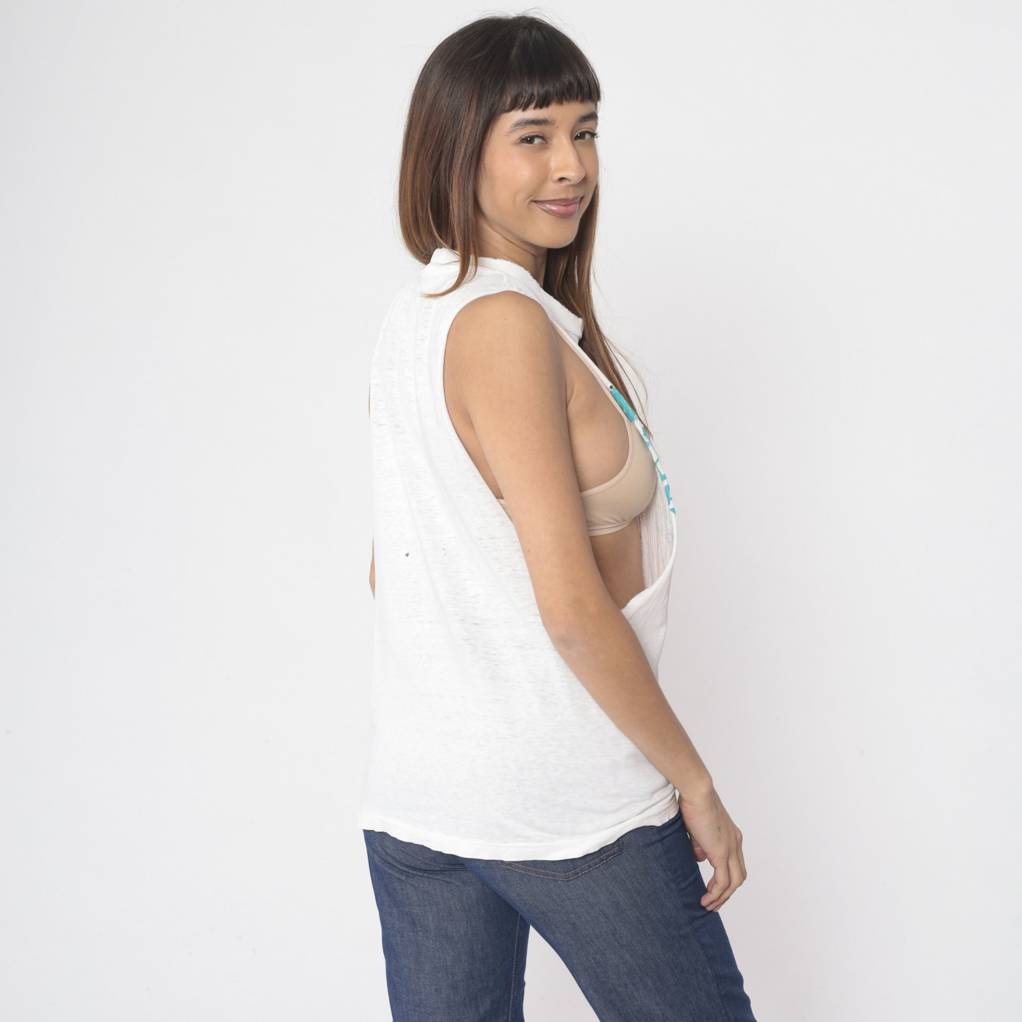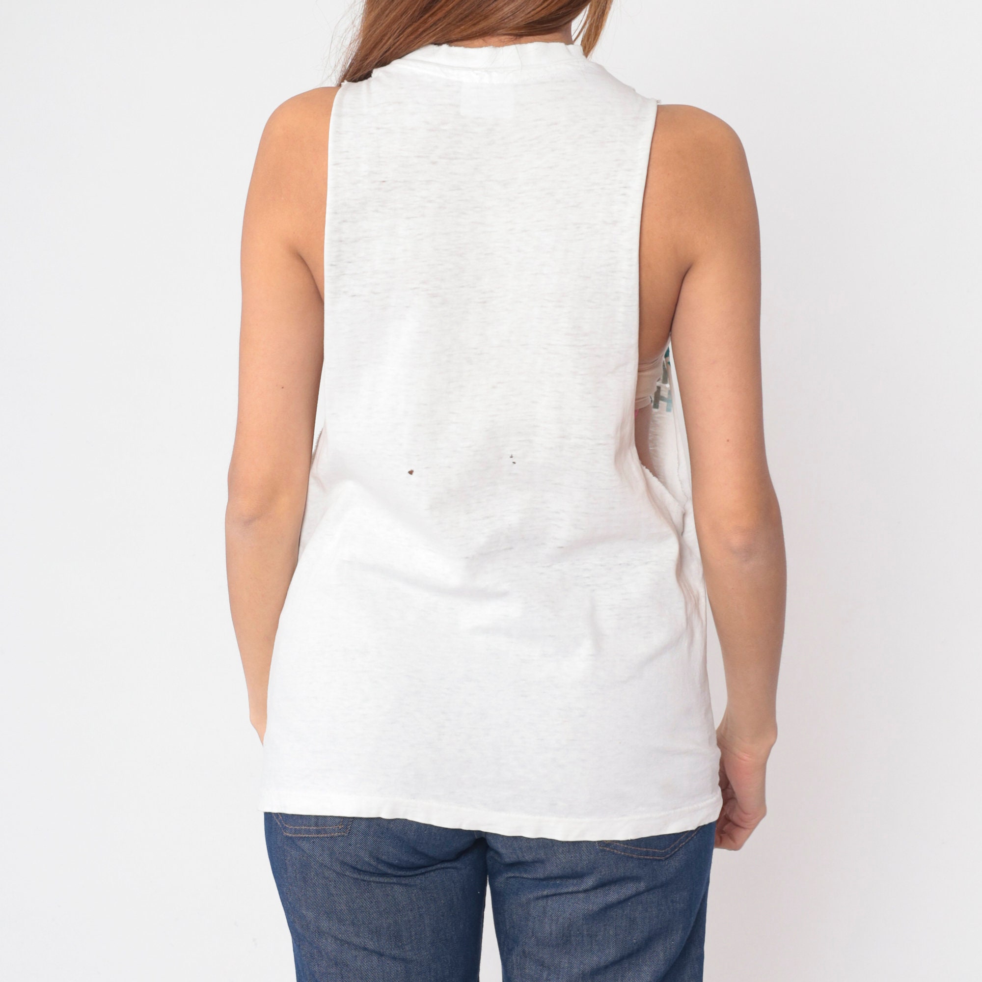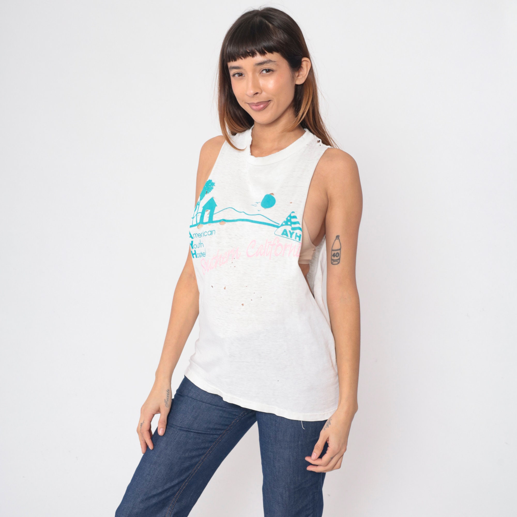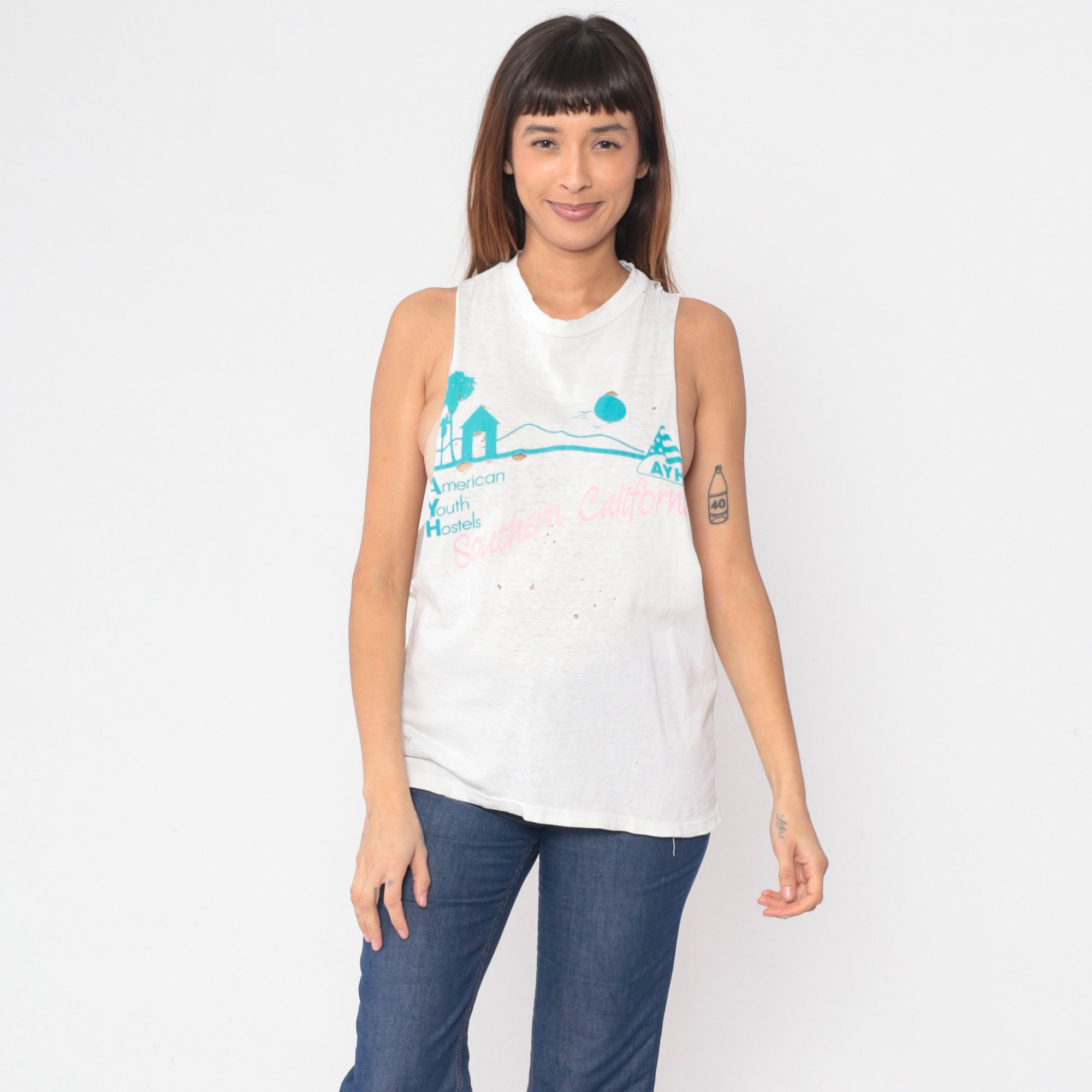 Vintage 90s tank top from Southern California American Youth Hostels with a bird and palm tree print. Distressed and thin with raw cut off armholes and holes throughout.