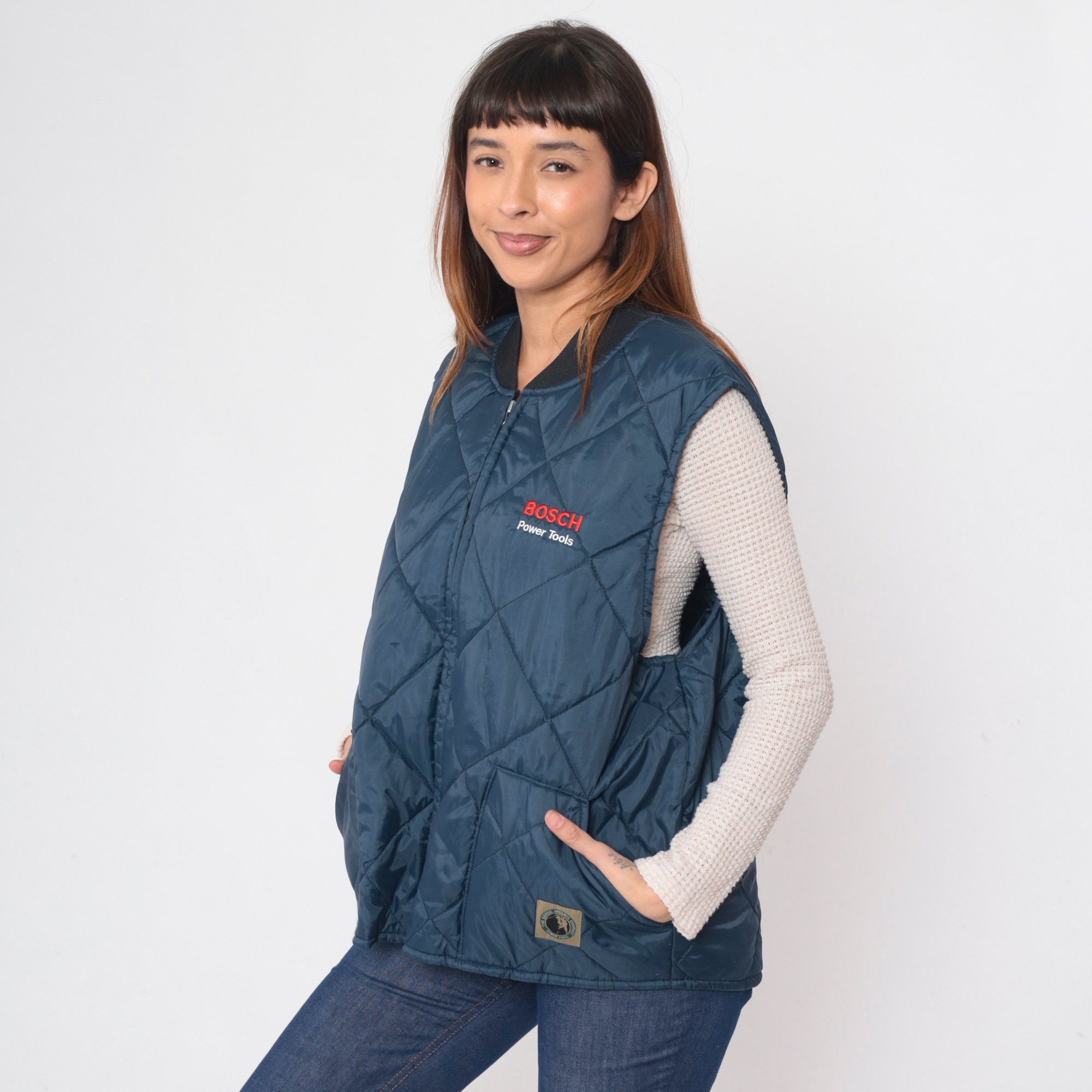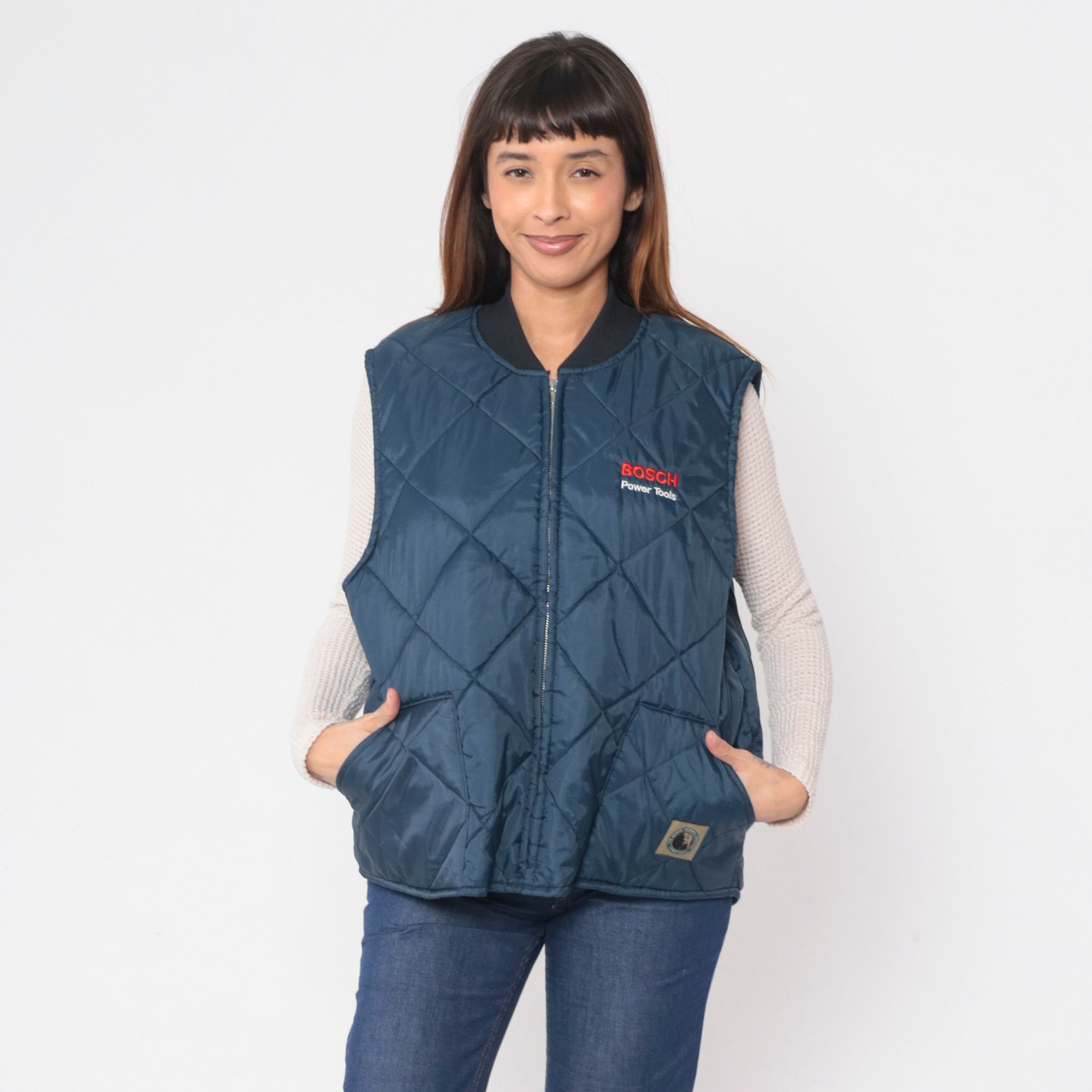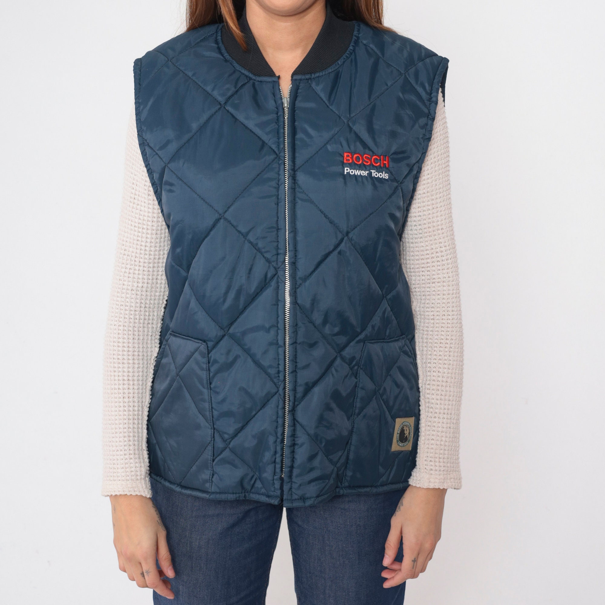 Vintage 90s puffer vest by Berne Apparel in quilted dark blue with Bosch Power Tools on the chest. Zips up the front.