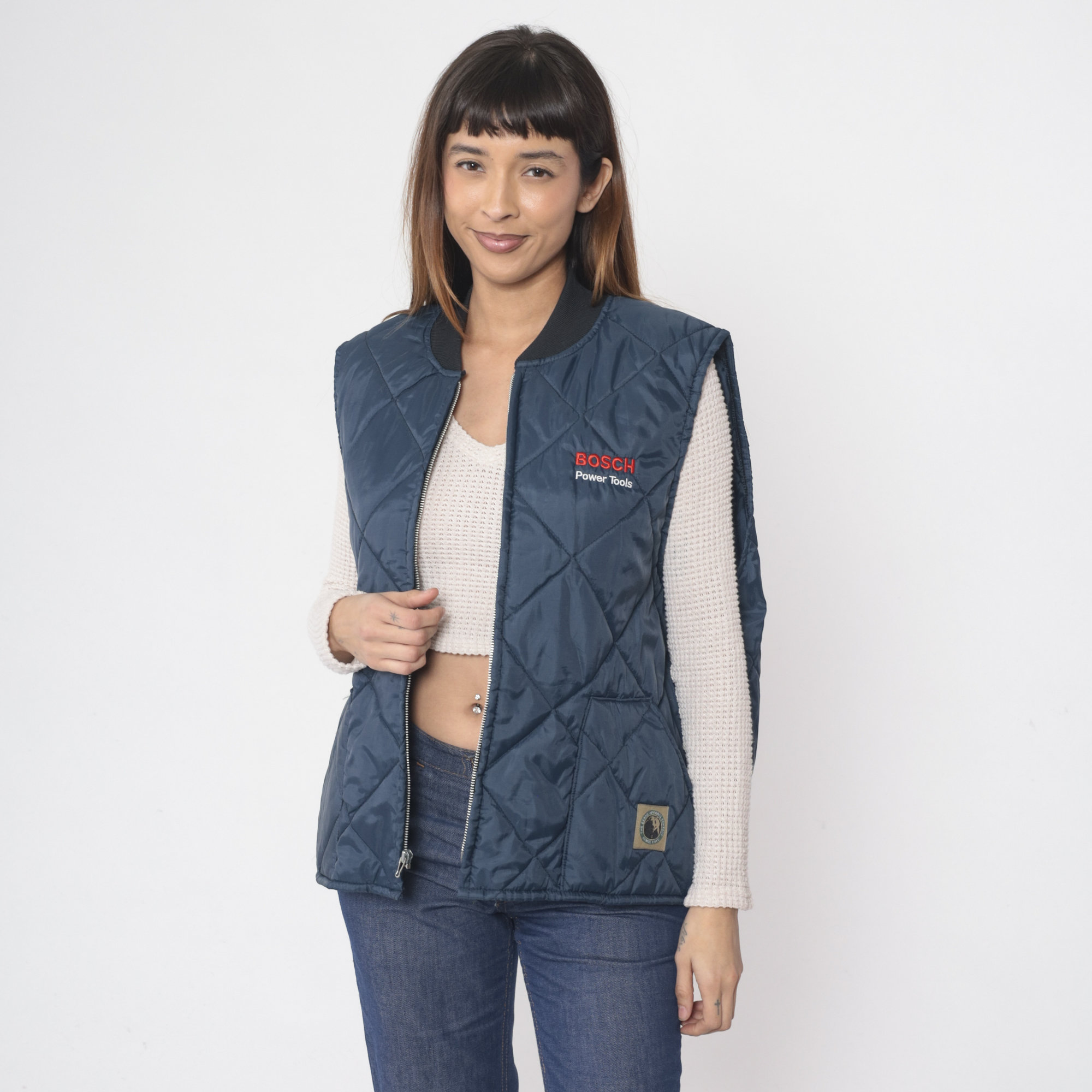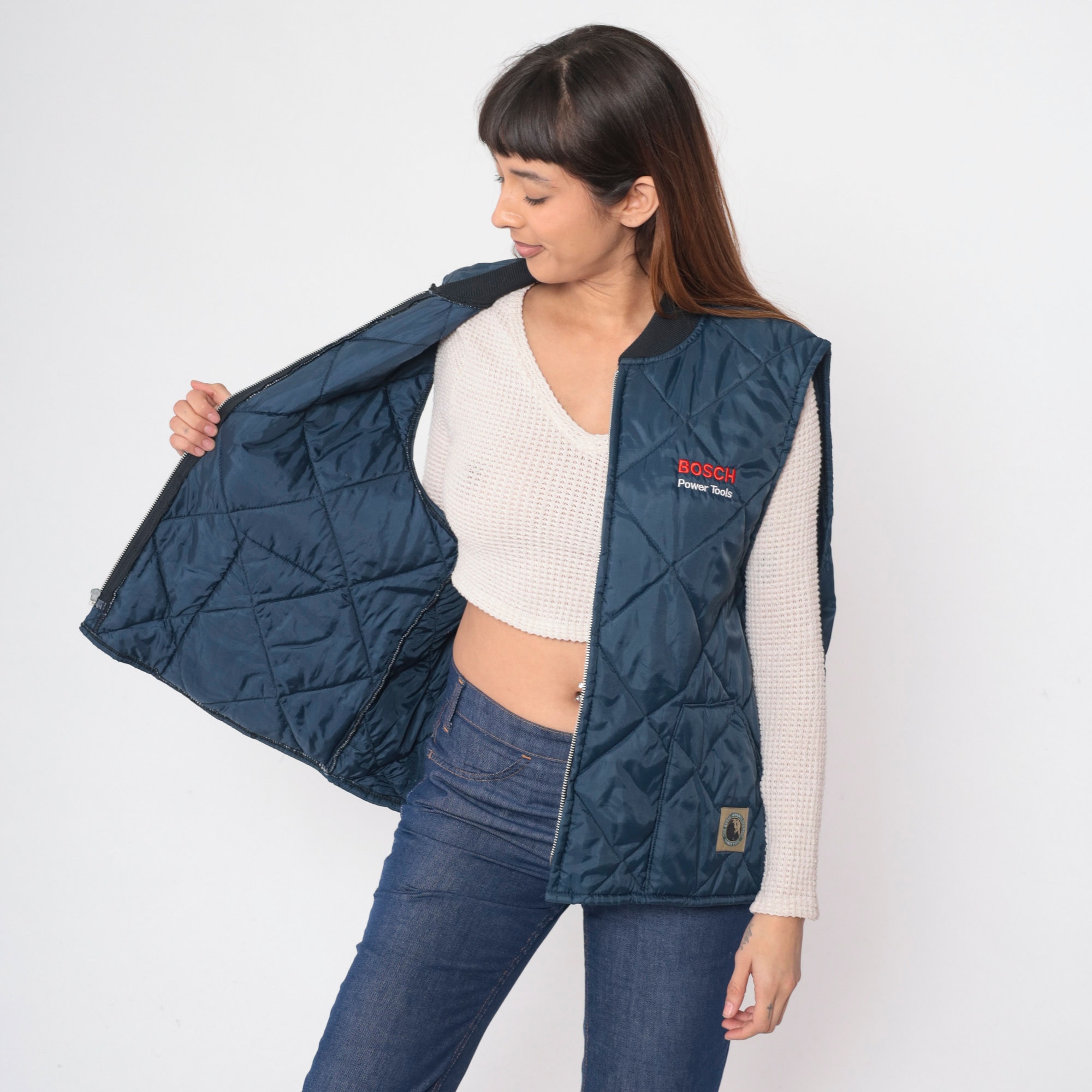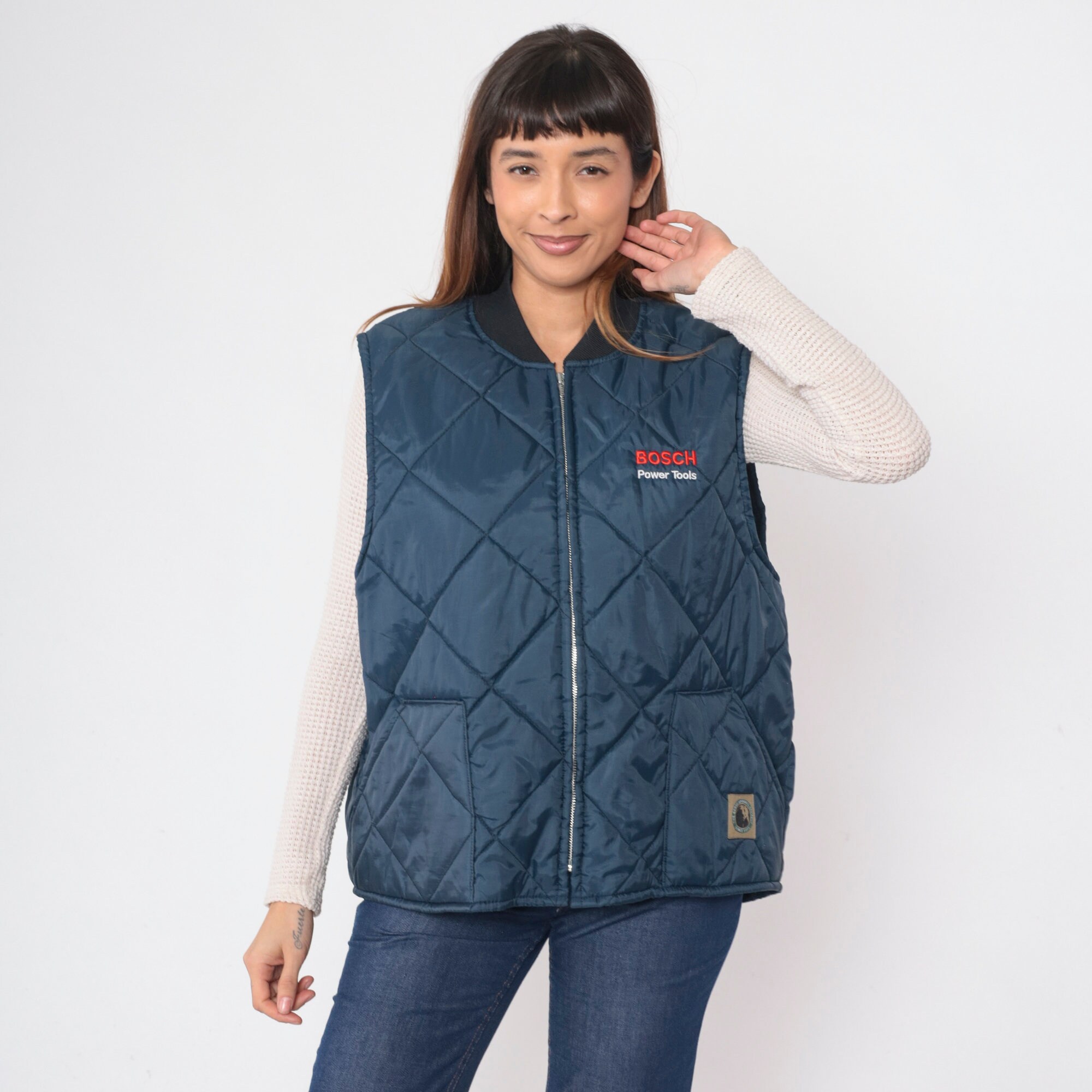 Vintage 90s puffer vest by Berne Apparel in quilted dark blue with Bosch Power Tools on the chest. Zips up the front.