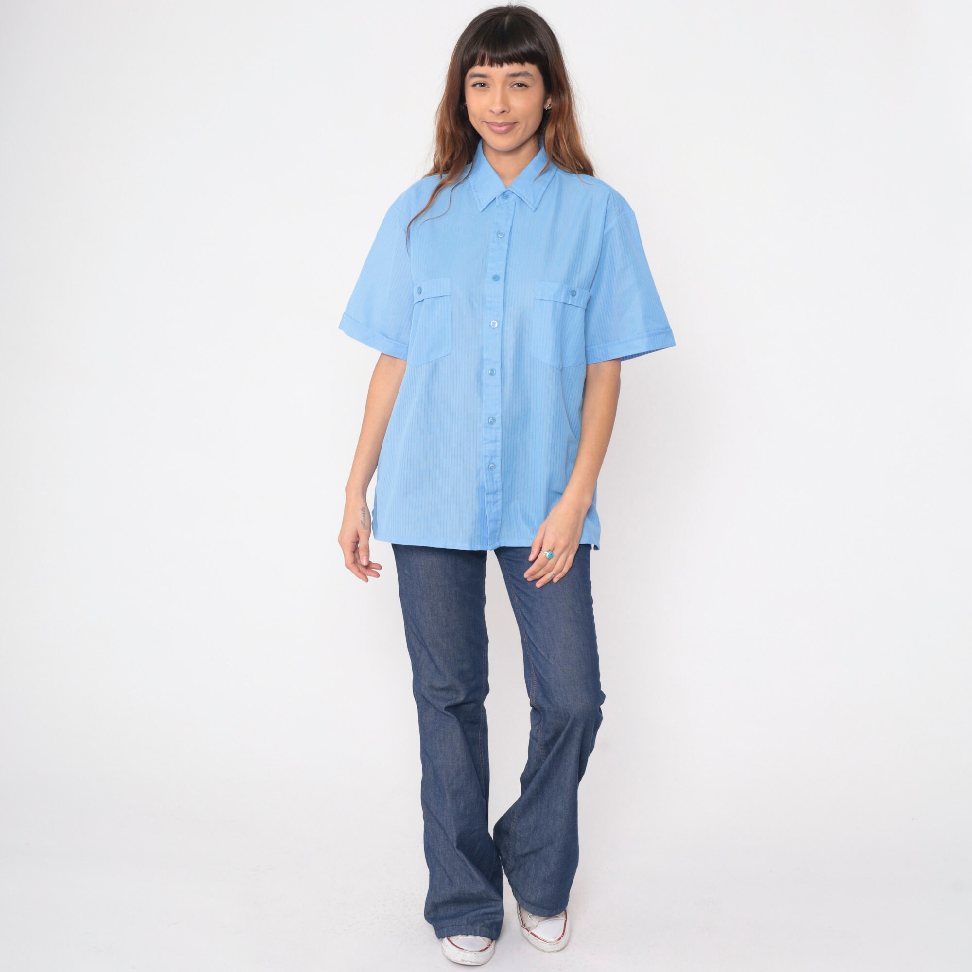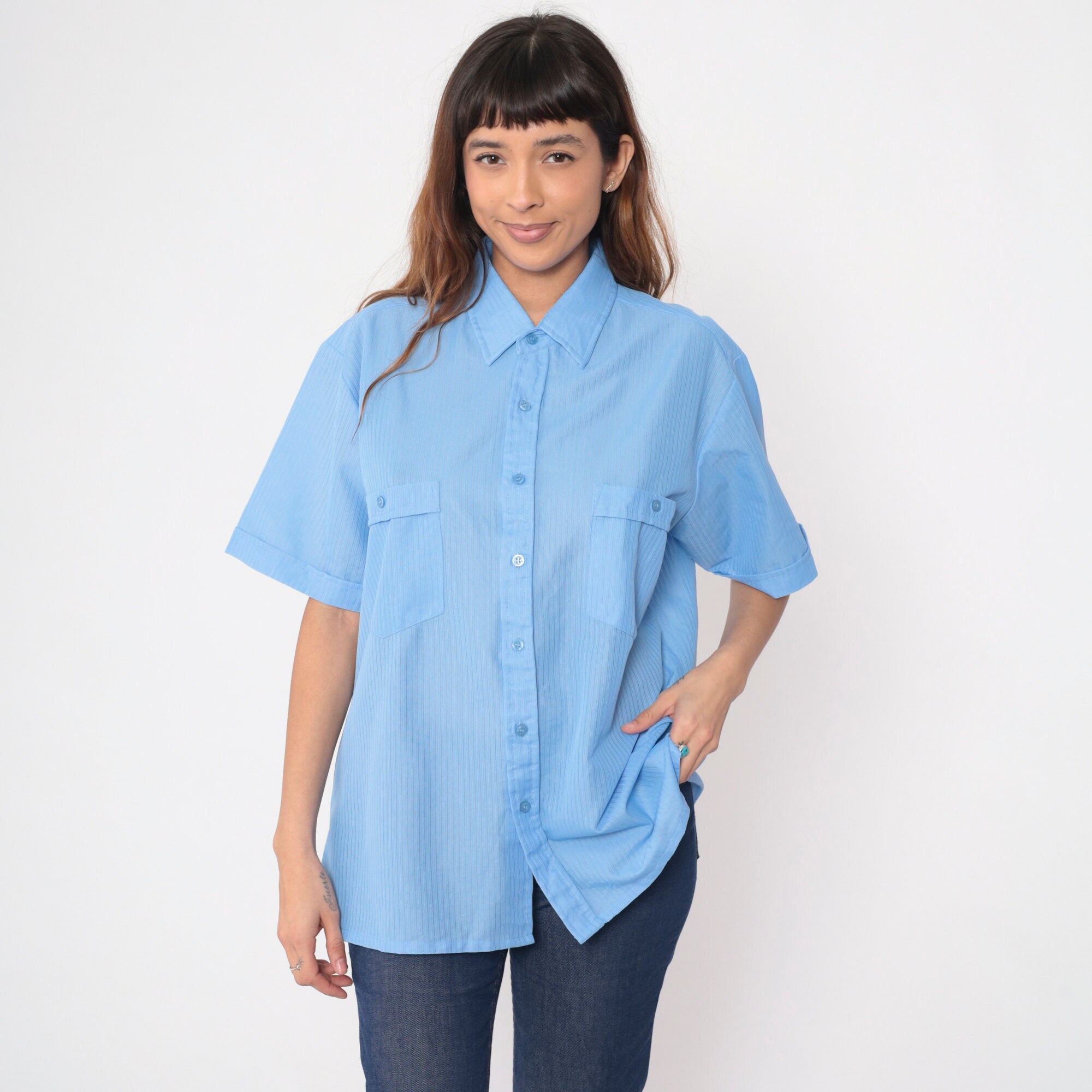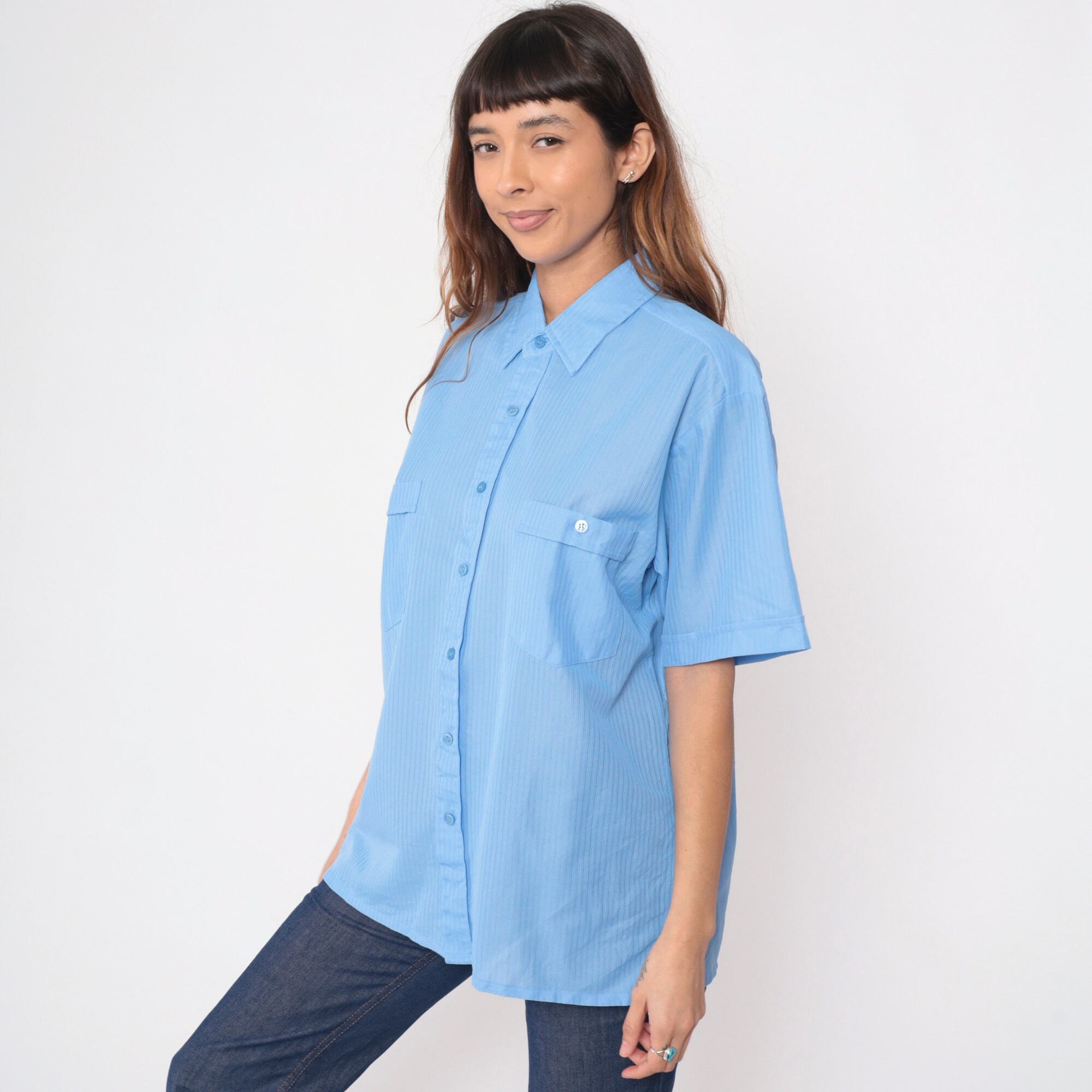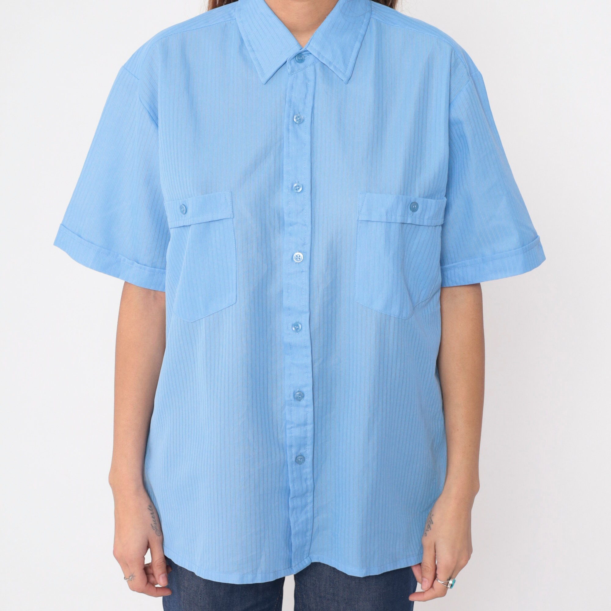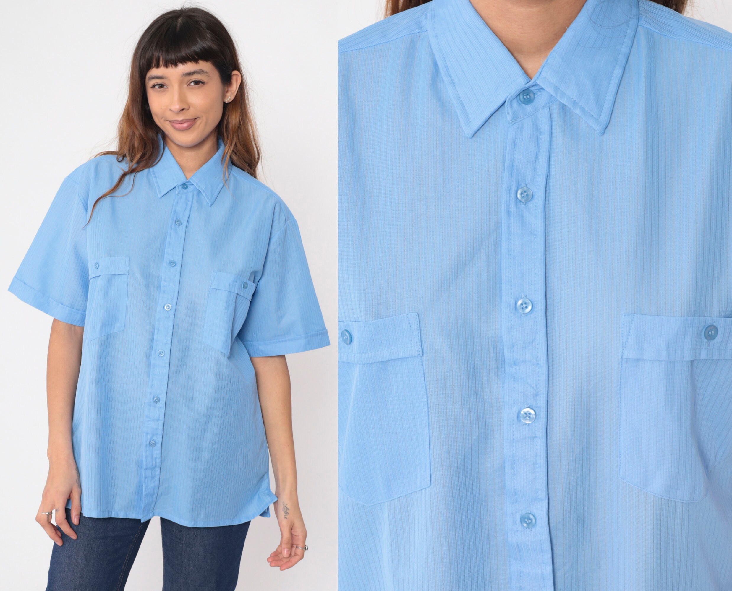 Vintage Y2K shirt in semi sheer light blue with stripes. Buttons up the front with a collar and short sleeves.
