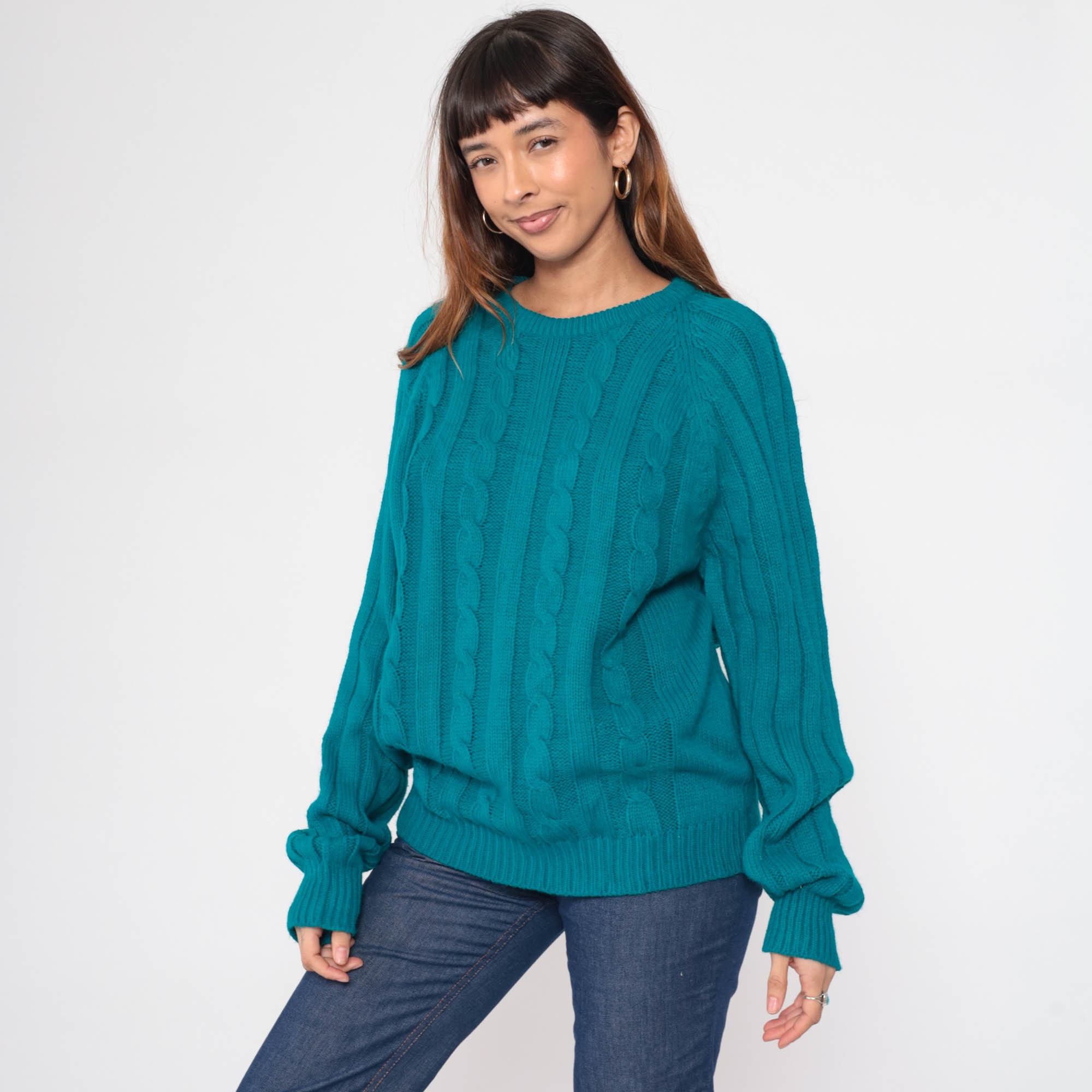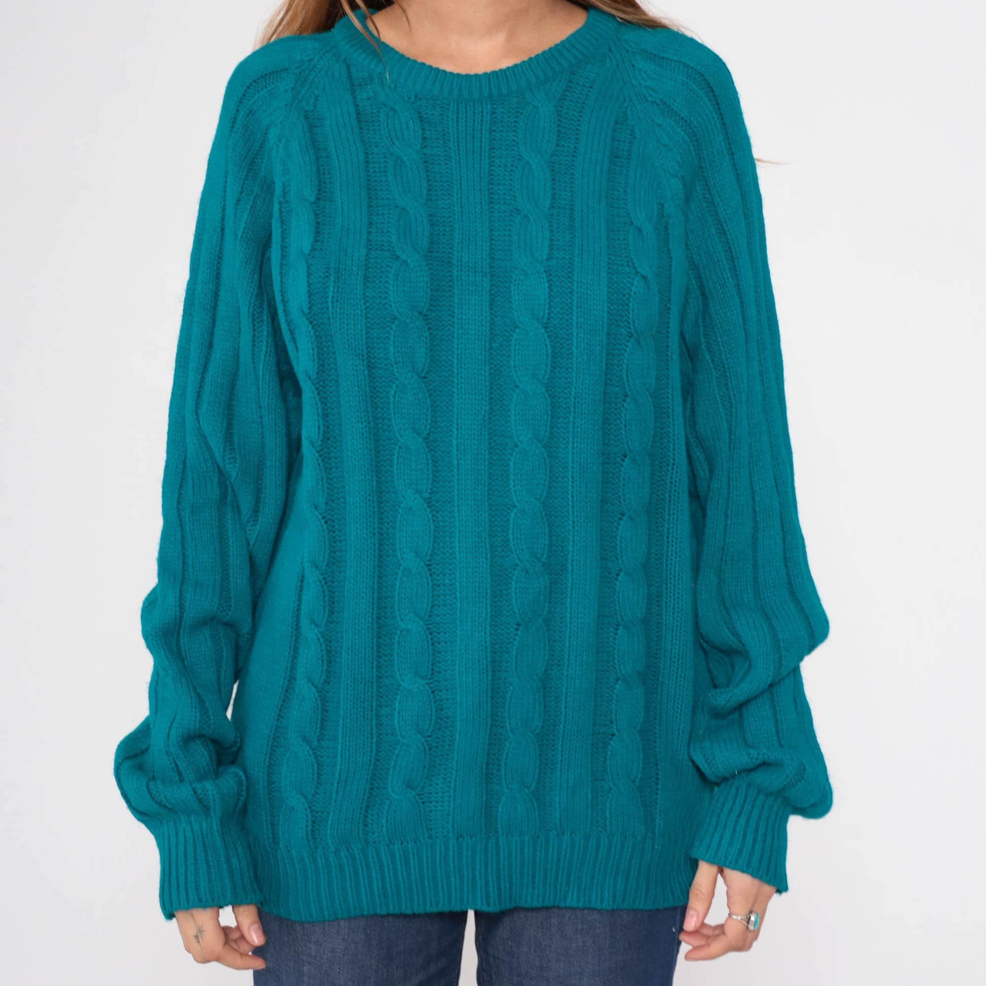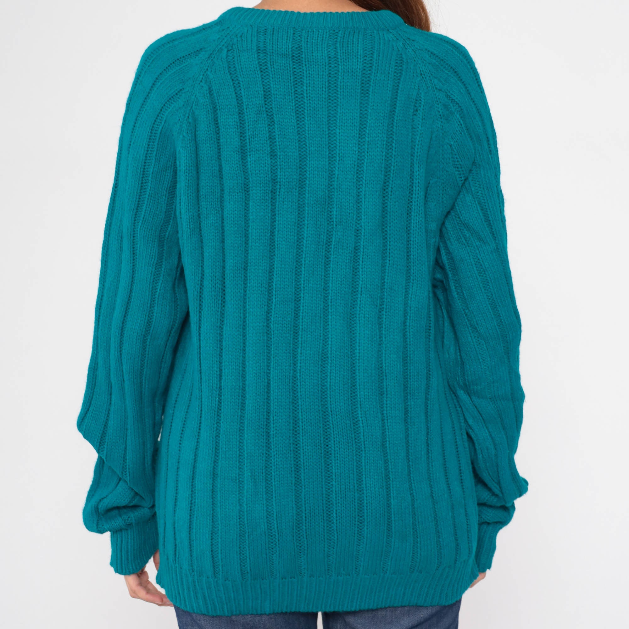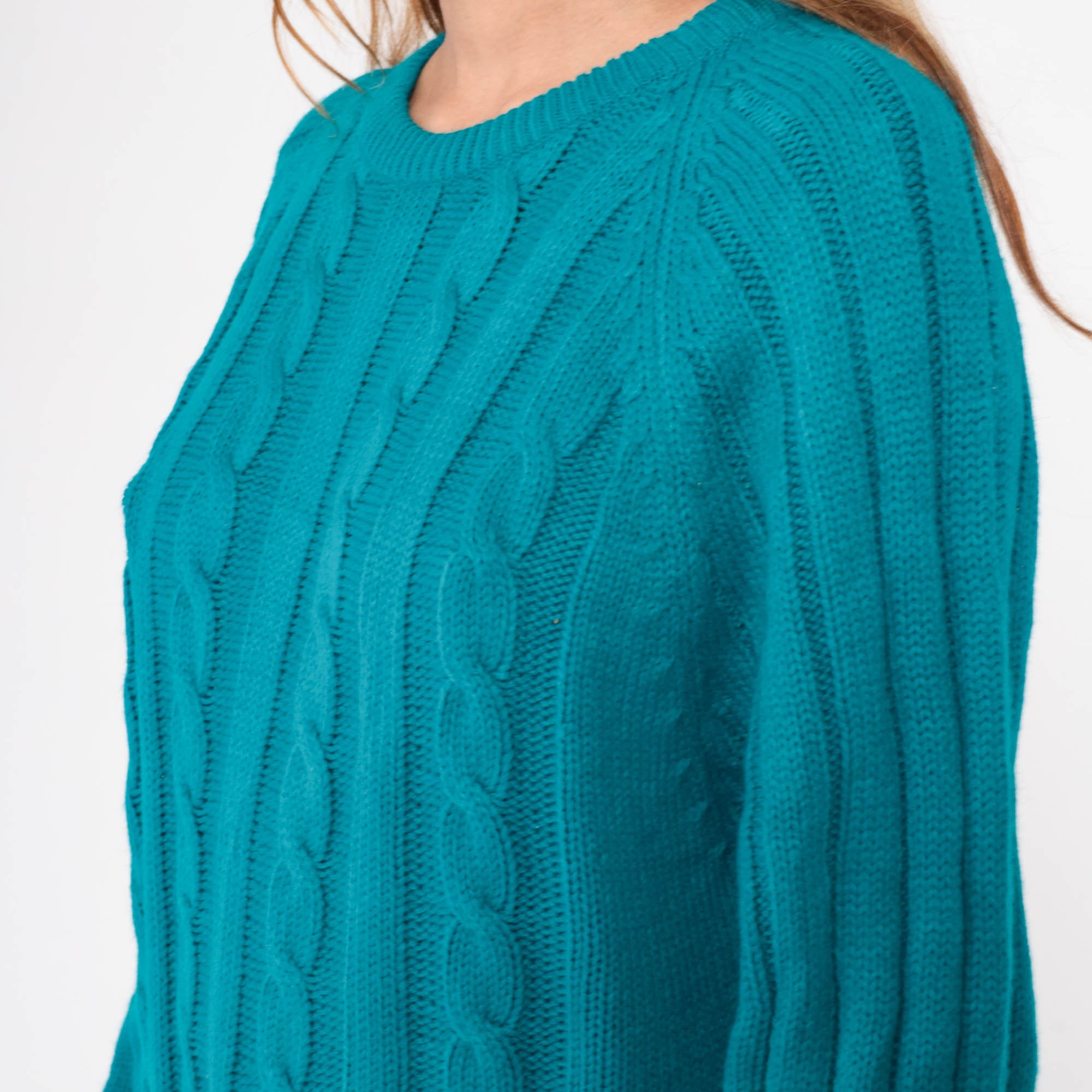 Vintage 80s sweater in teal blue ribbing and cable knit. It has a crewneck and raglan sleeves.