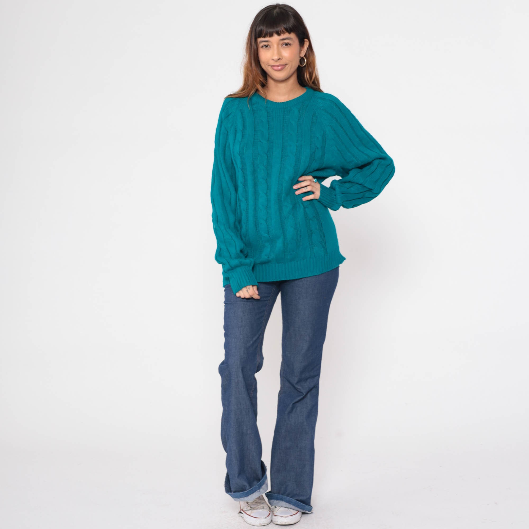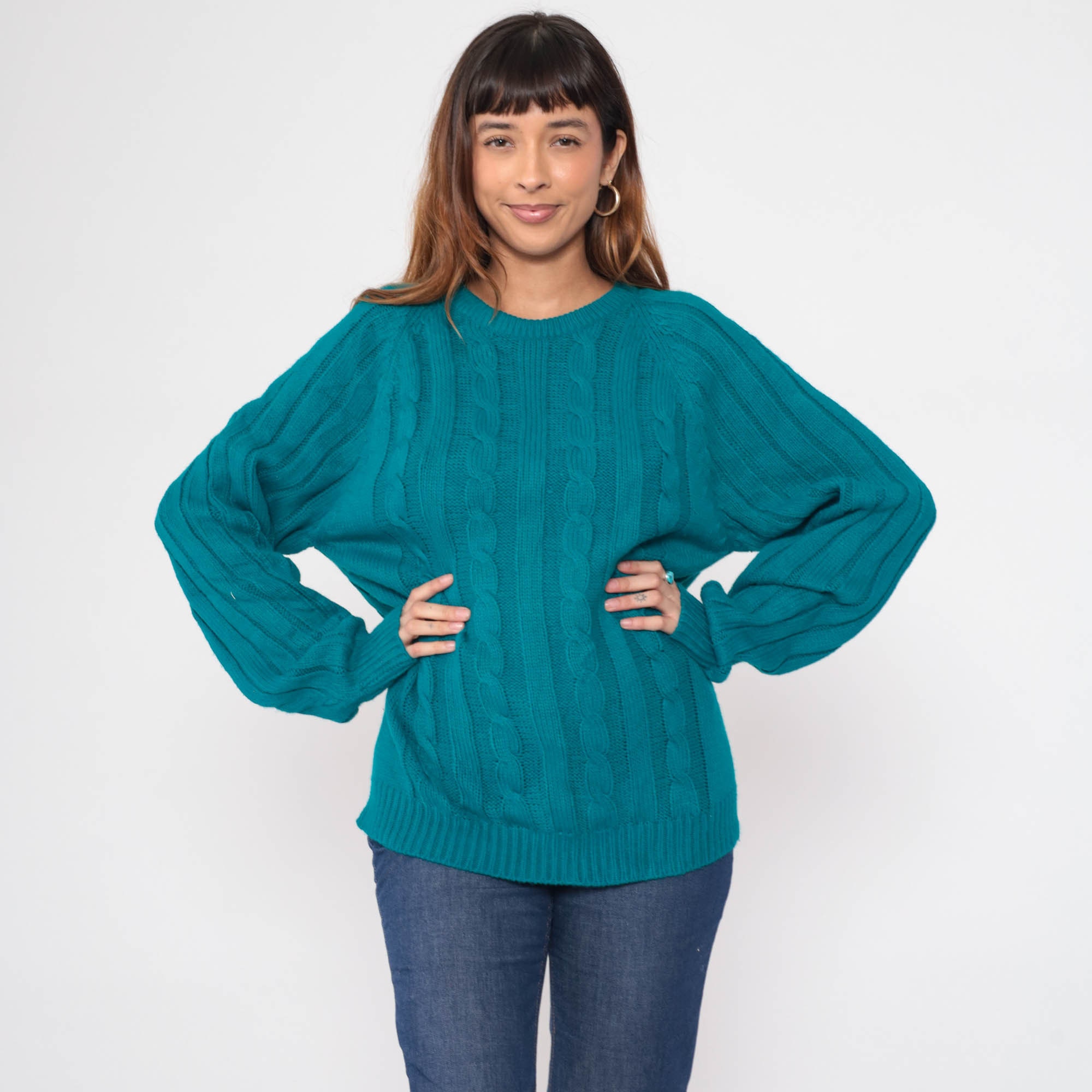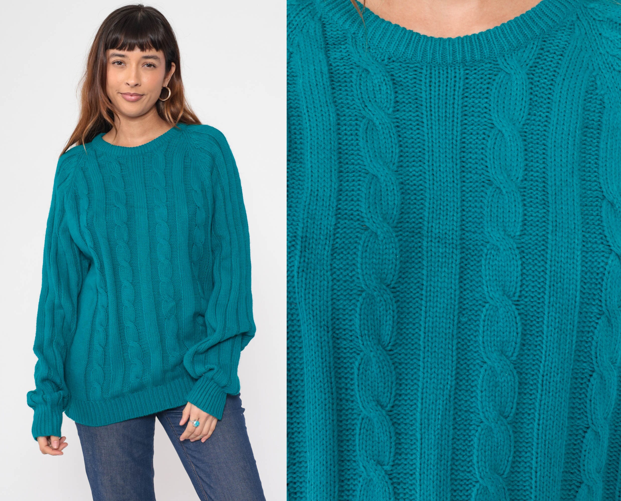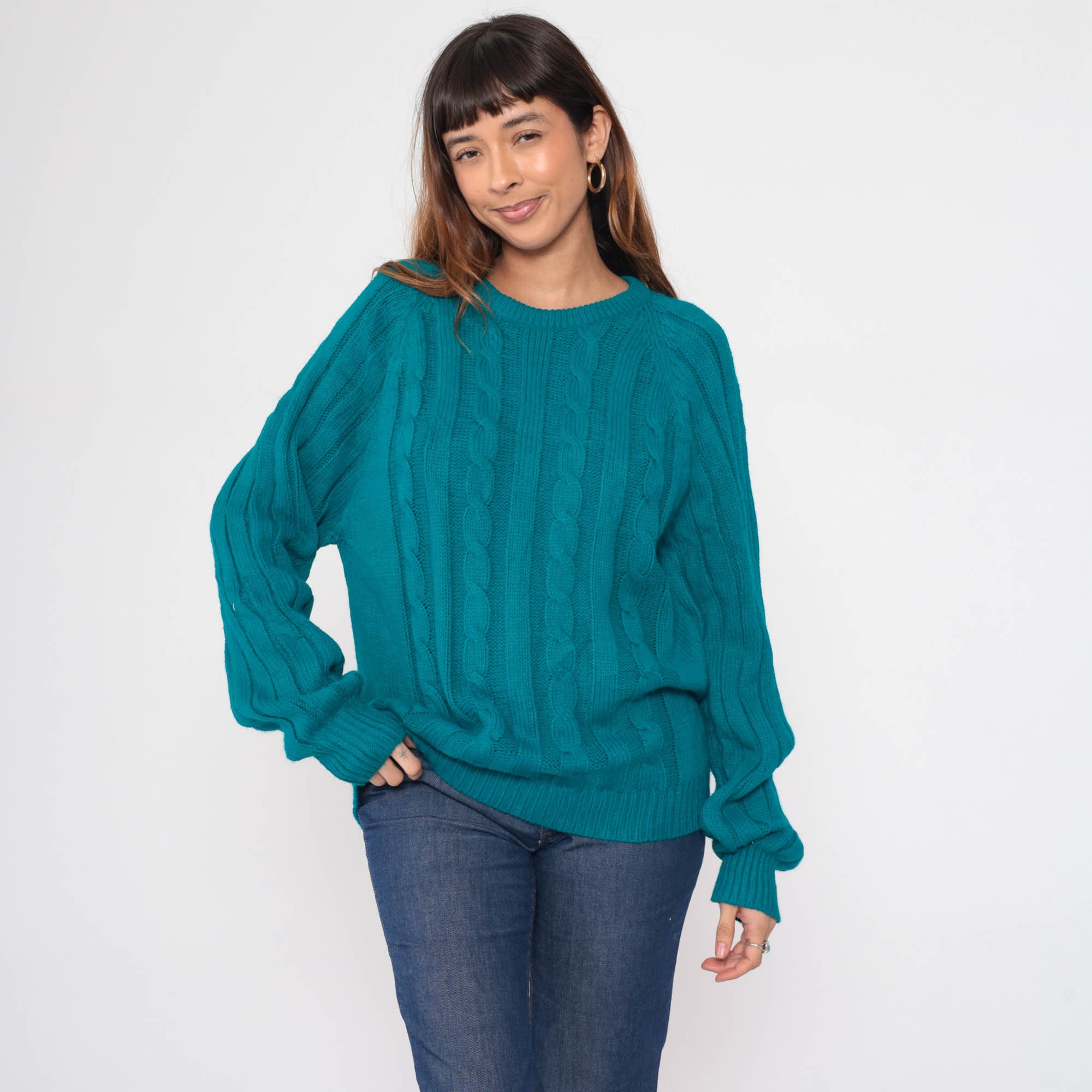 Vintage 80s sweater in teal blue ribbing and cable knit. It has a crewneck and raglan sleeves.