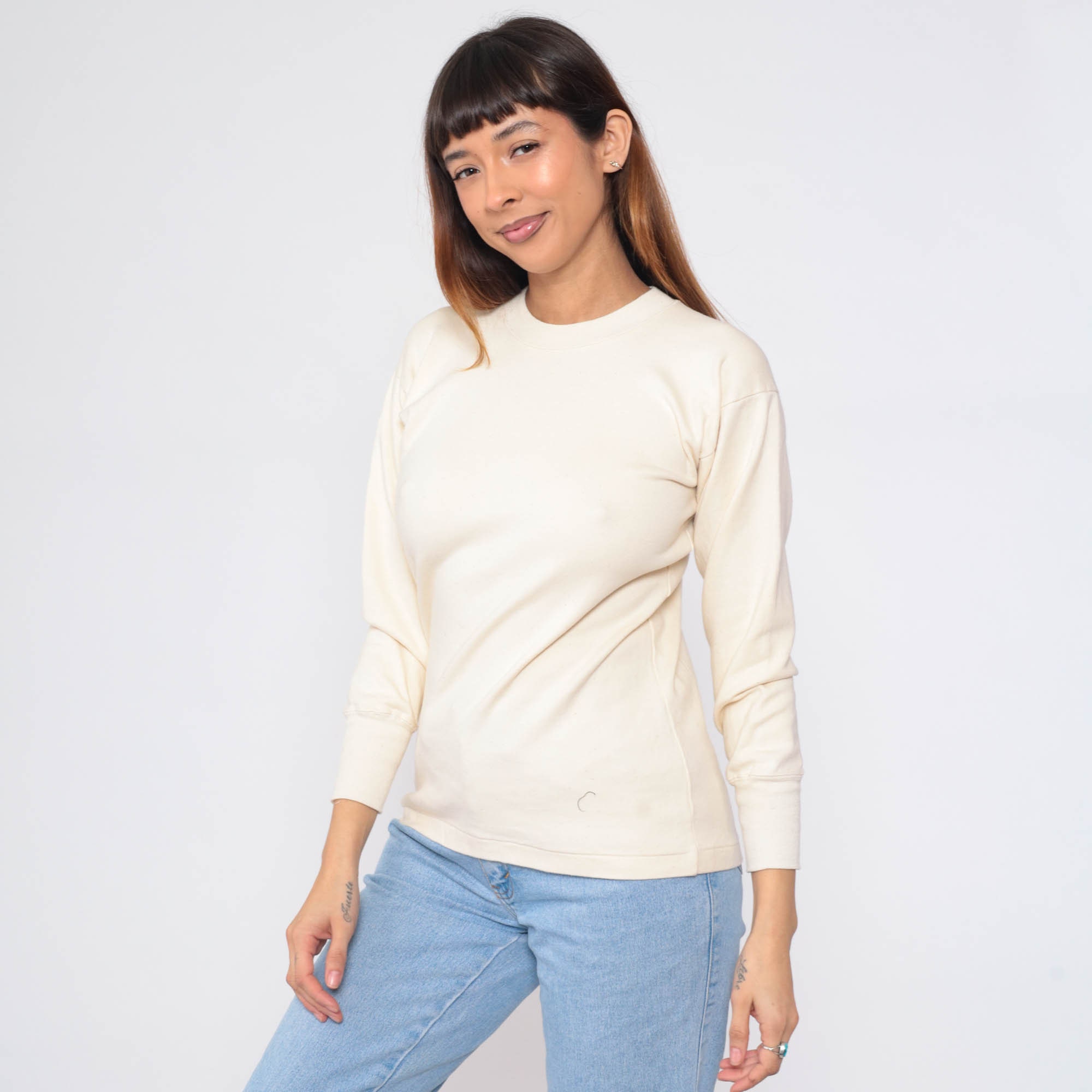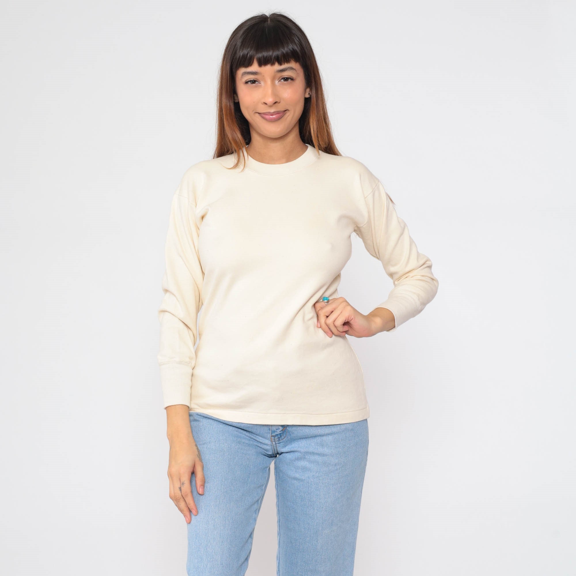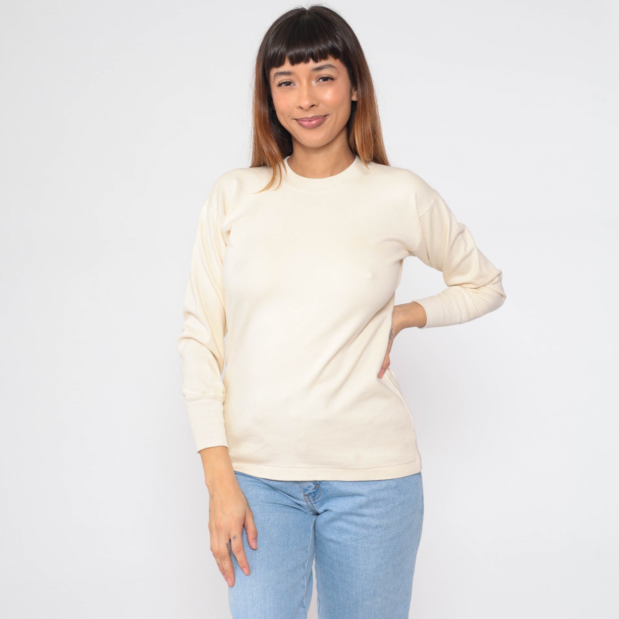 Vintage 80s shirt in solid cream with long sleeves and a crewneck.