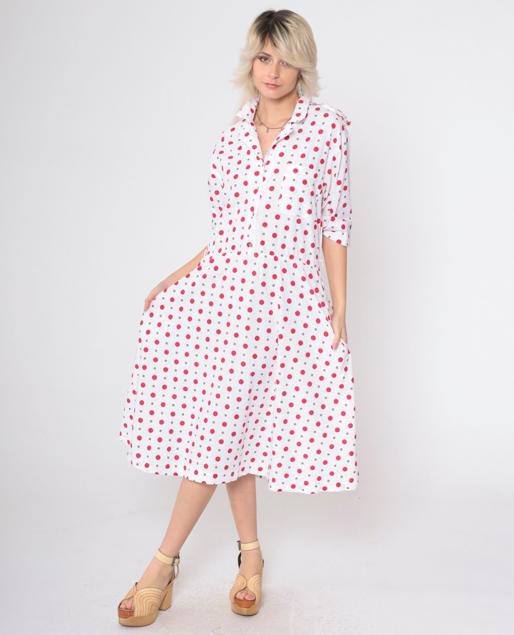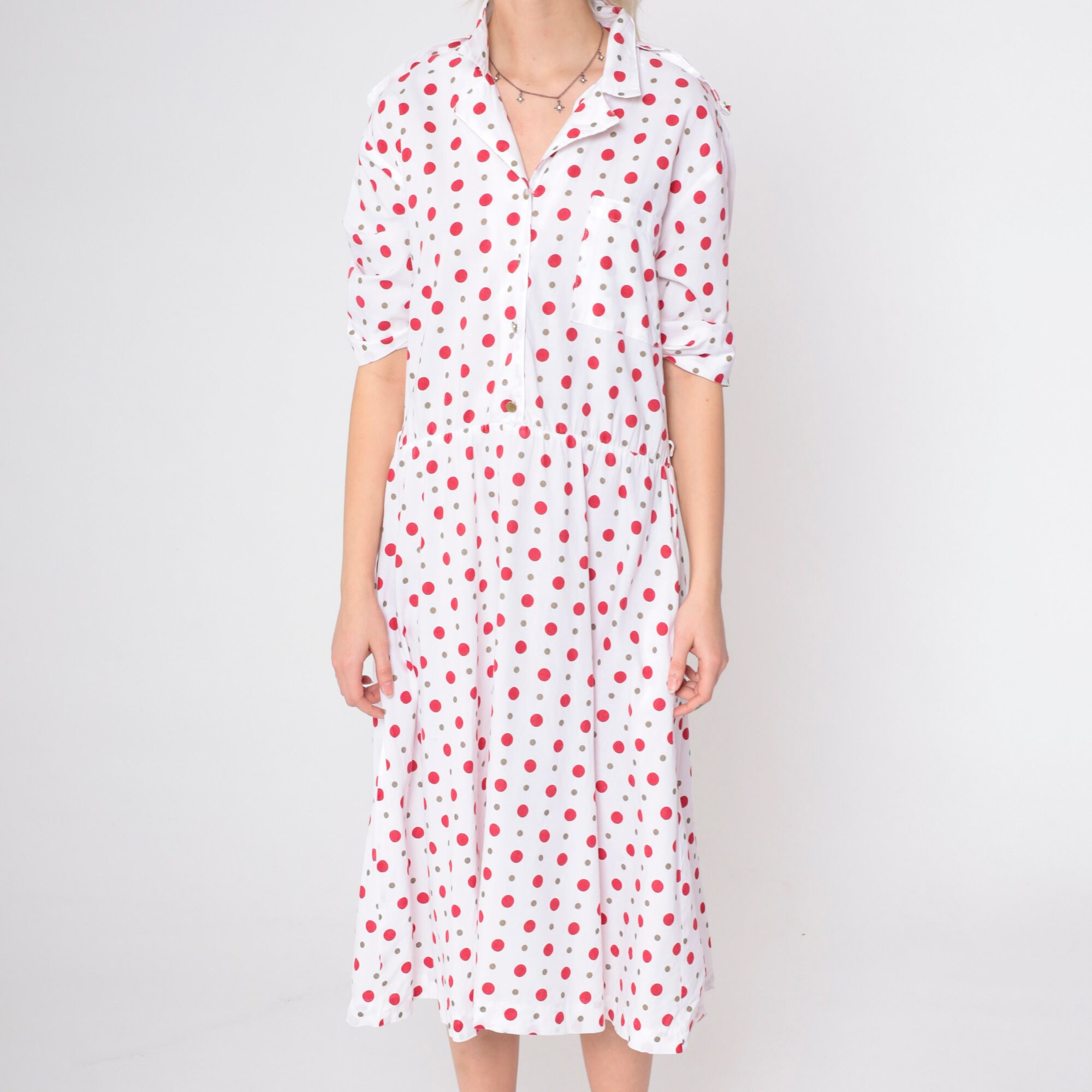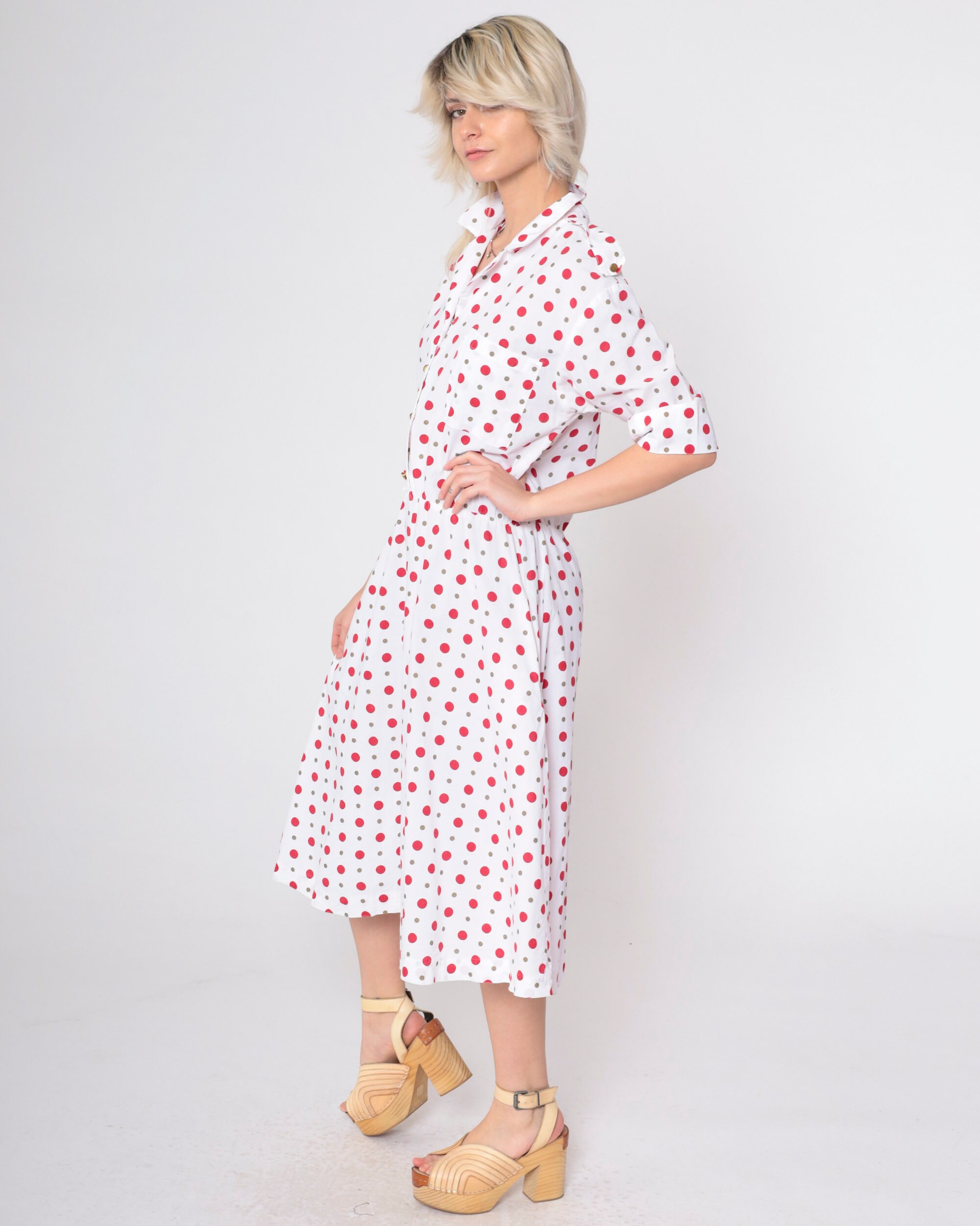 Vintage 80s dress in white with polka dots. It has short cuffed sleeves, buttons up the front and a low waist. Midi length.