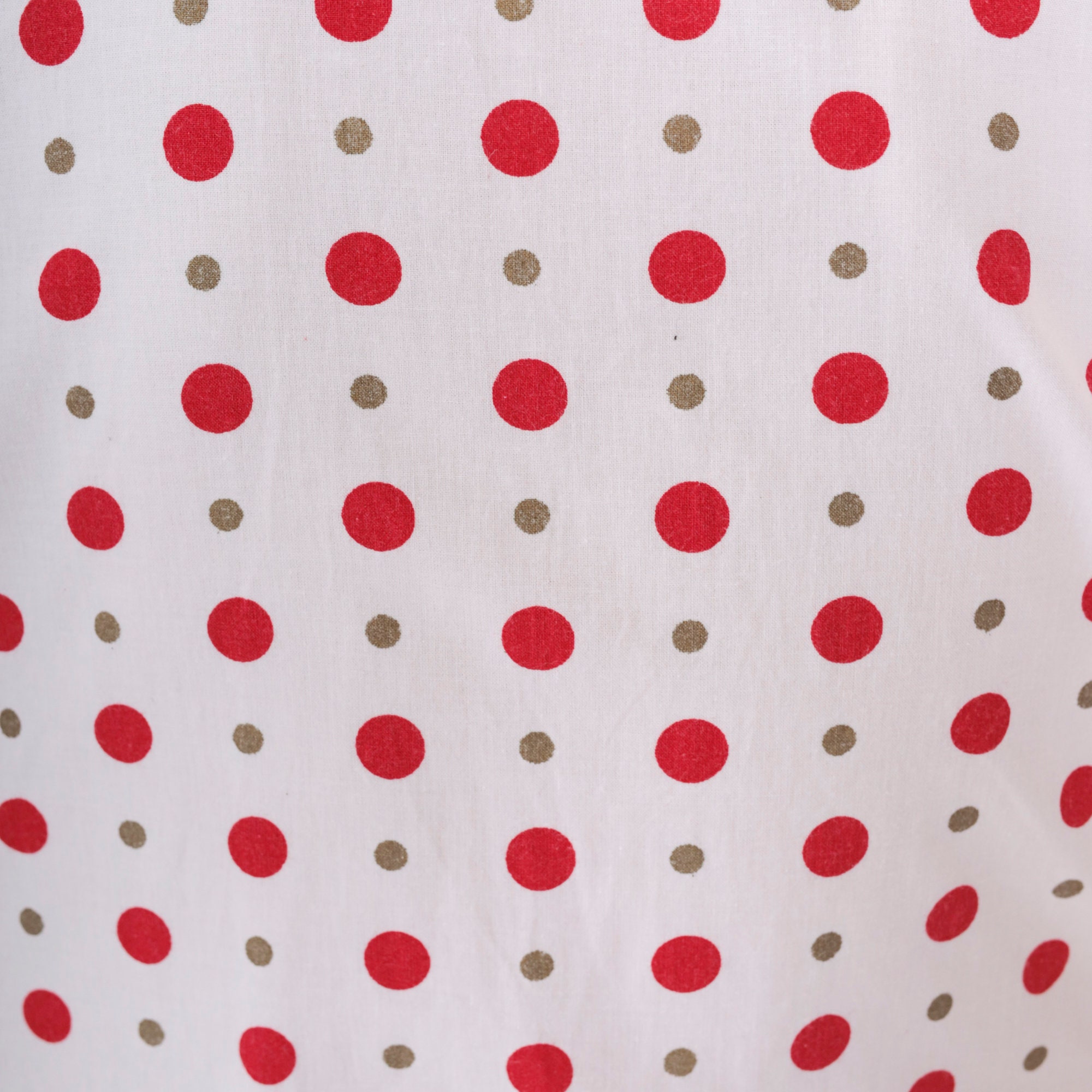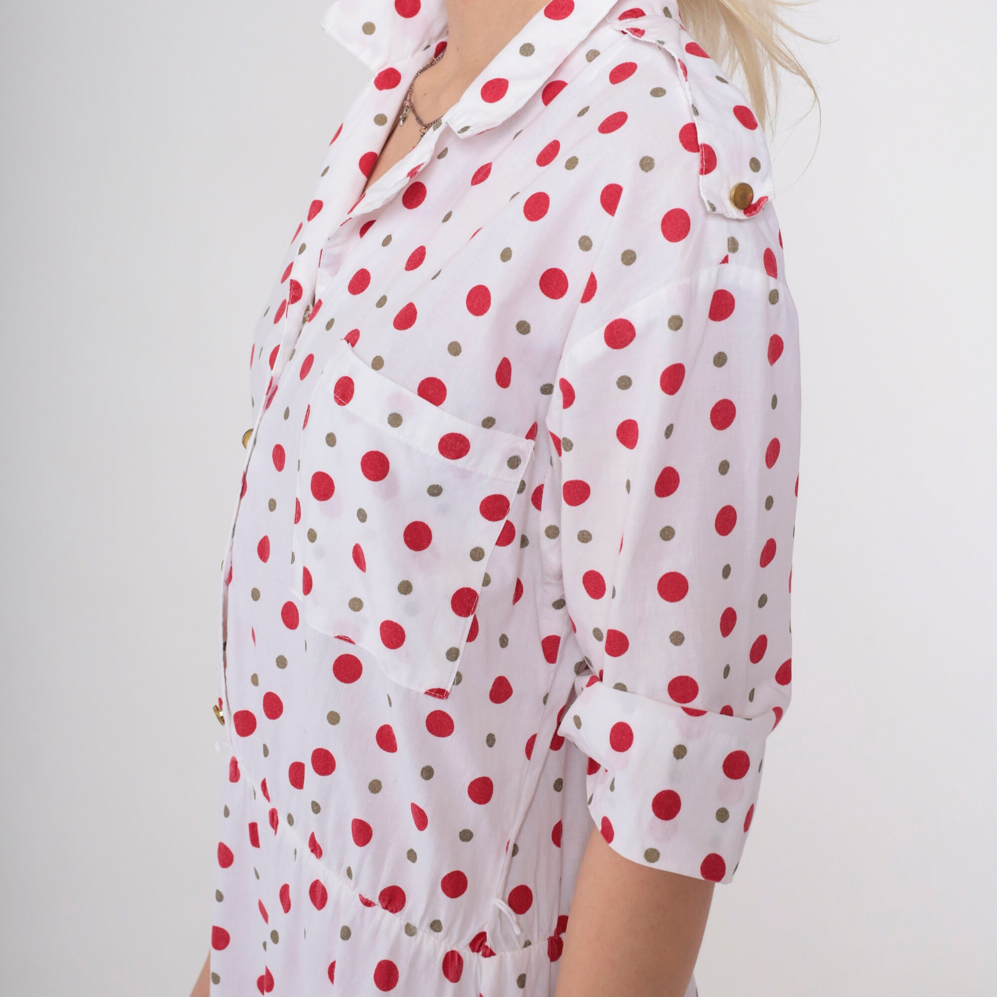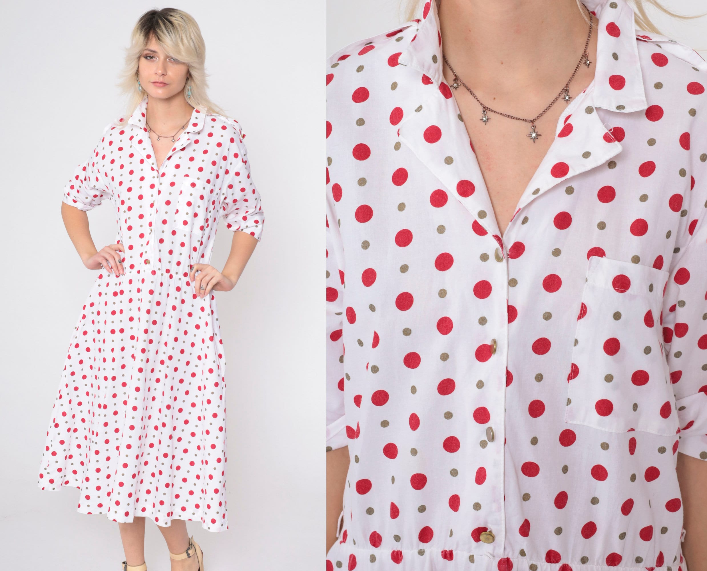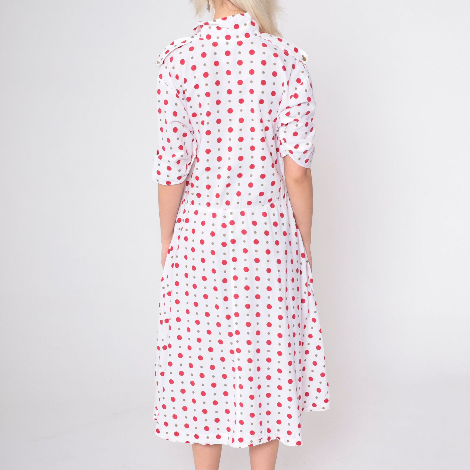 Vintage 80s dress in white with polka dots. It has short cuffed sleeves, buttons up the front and a low waist. Midi length.