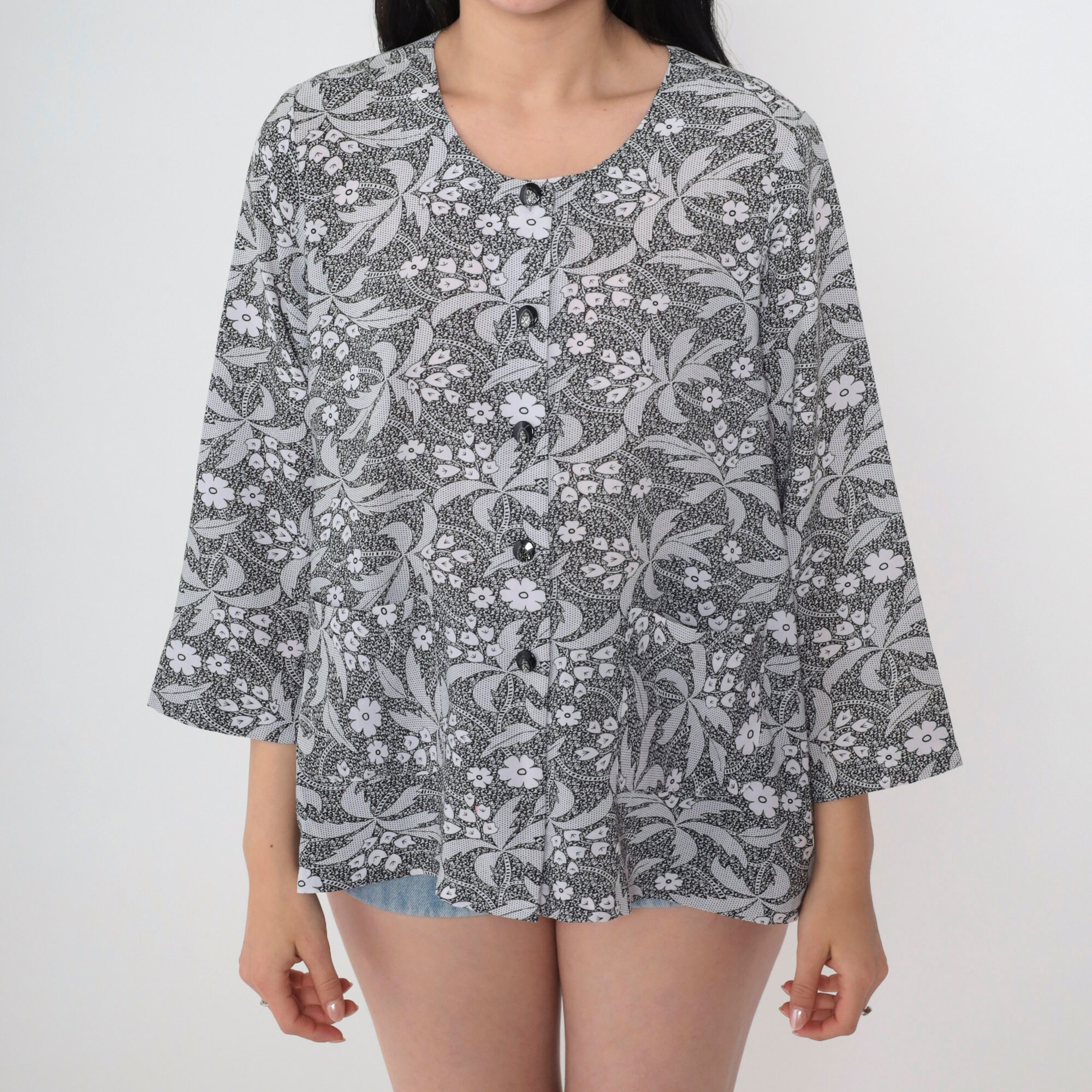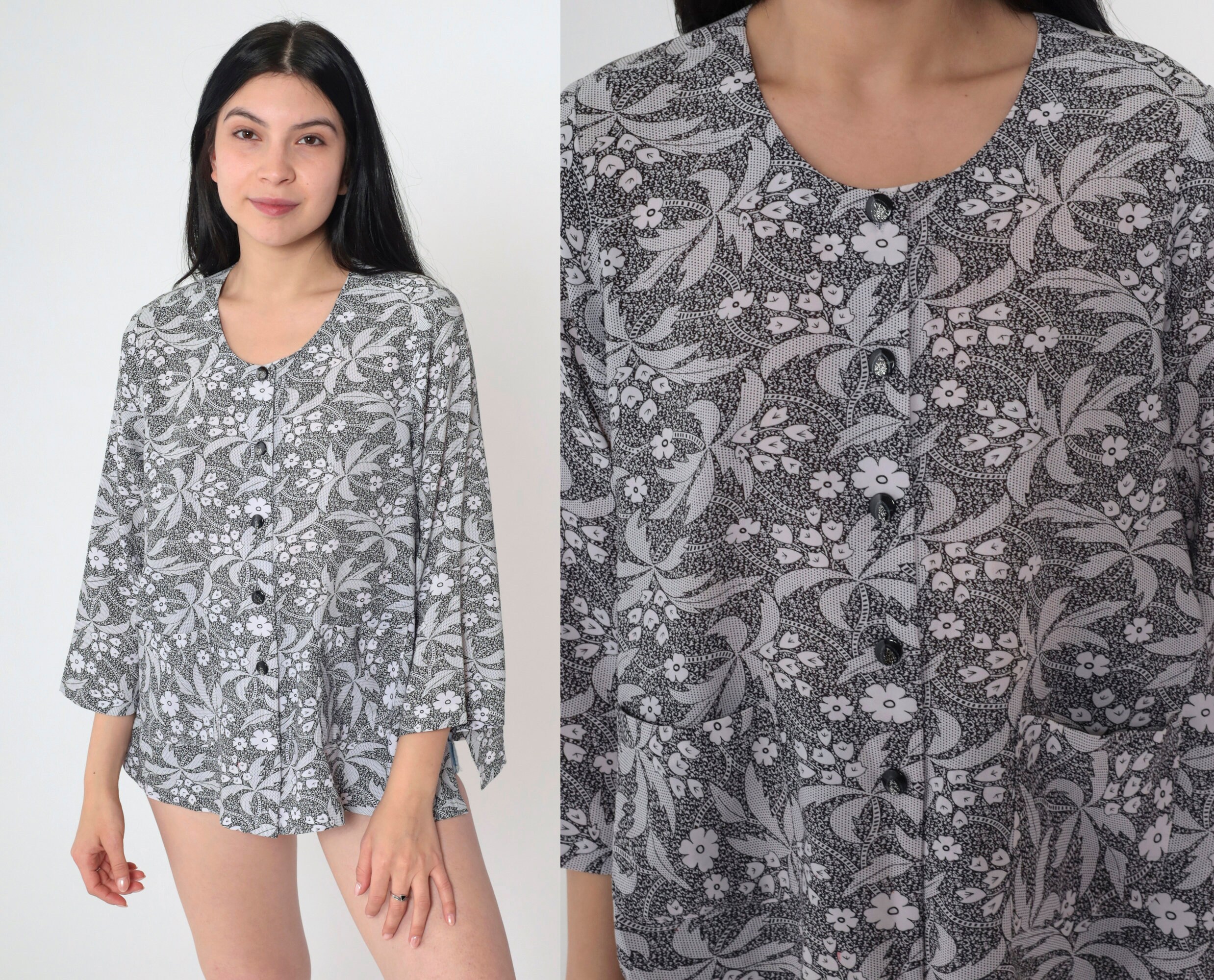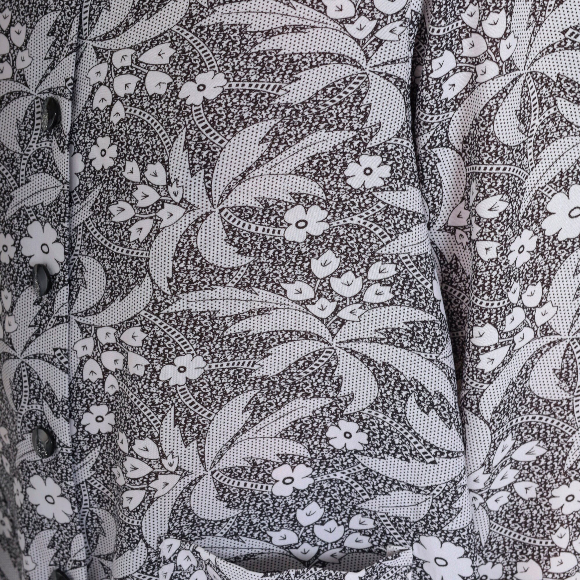 Vintage 90s shirt in black and white with a floral and palm tree print with glitter buttons up the front.