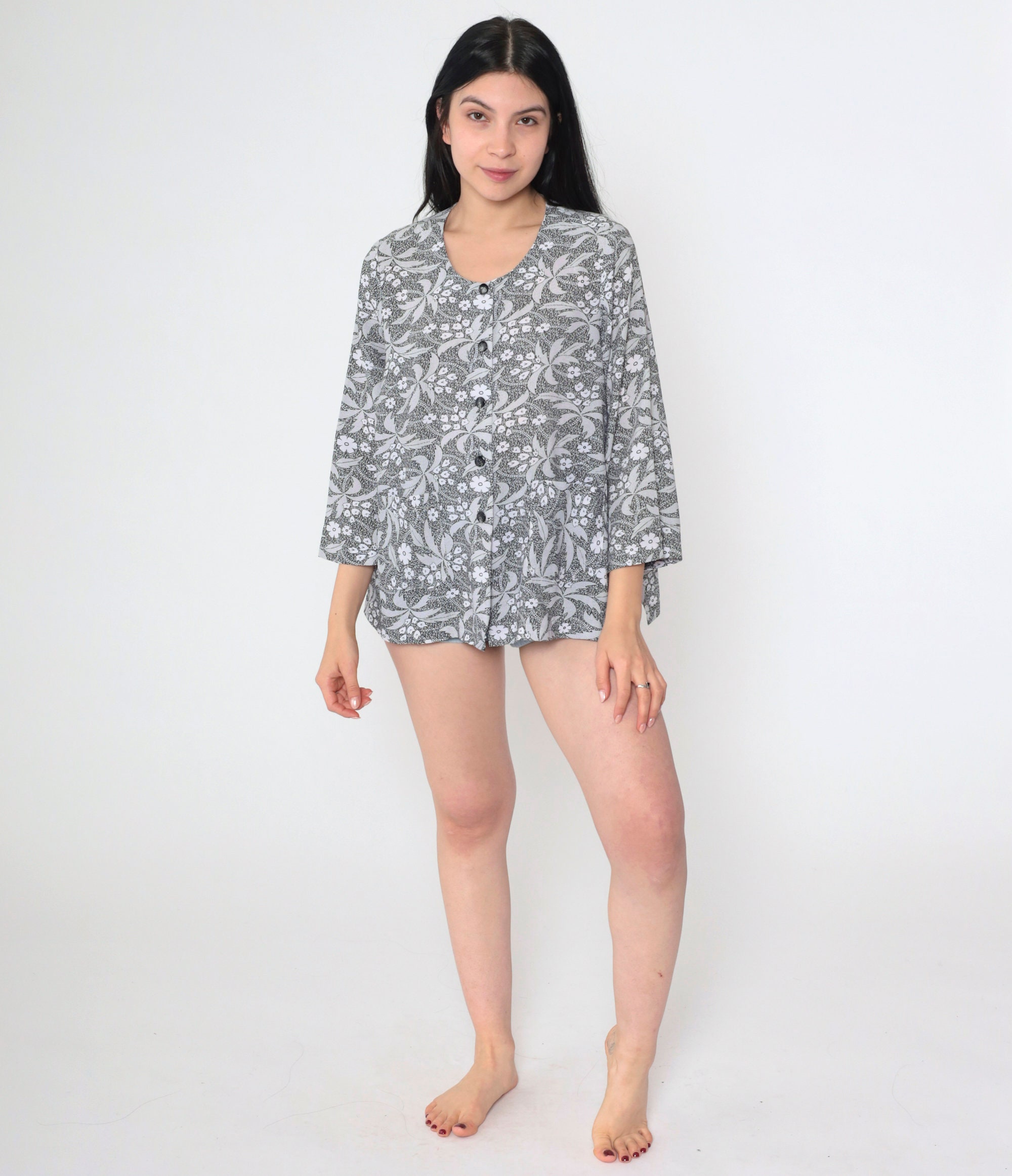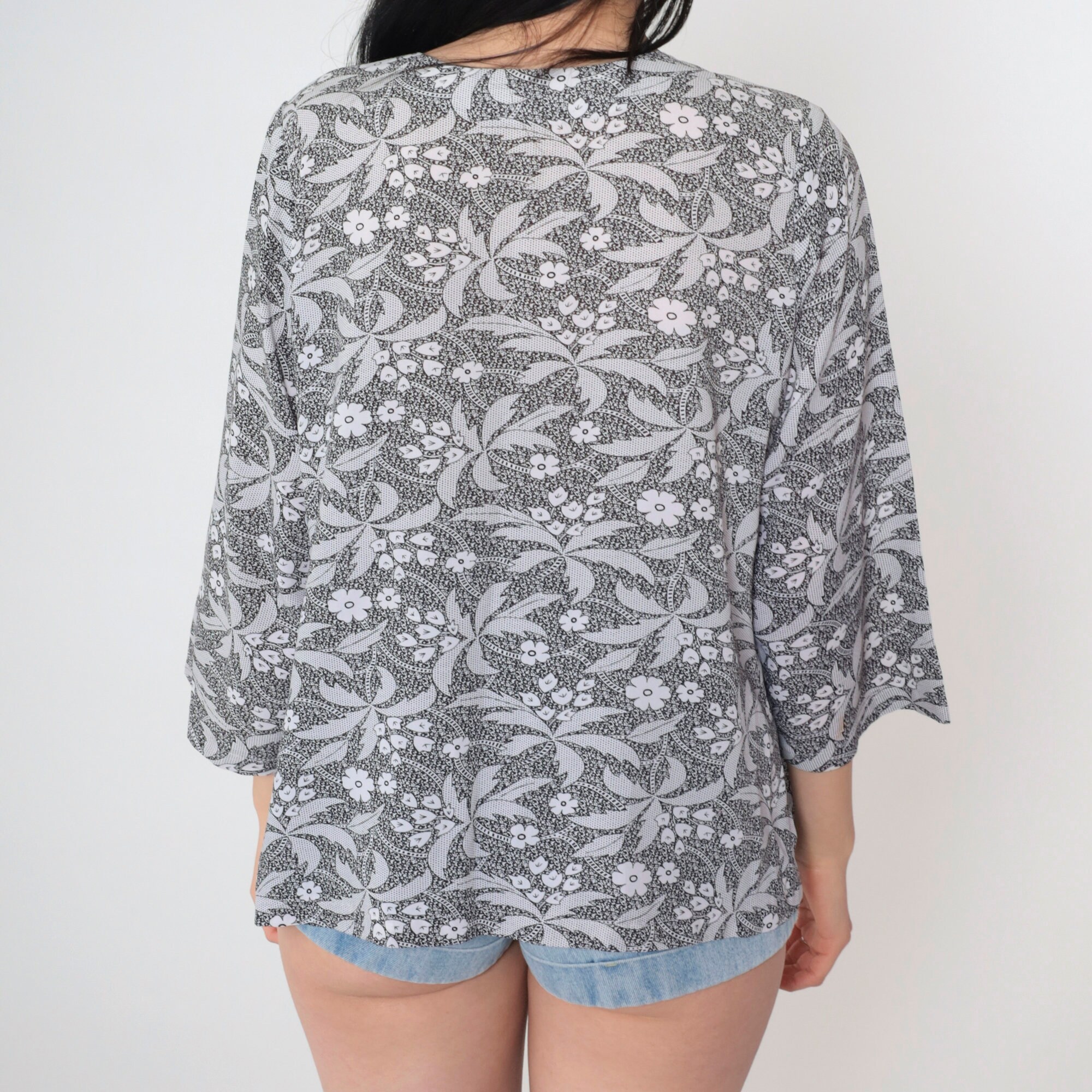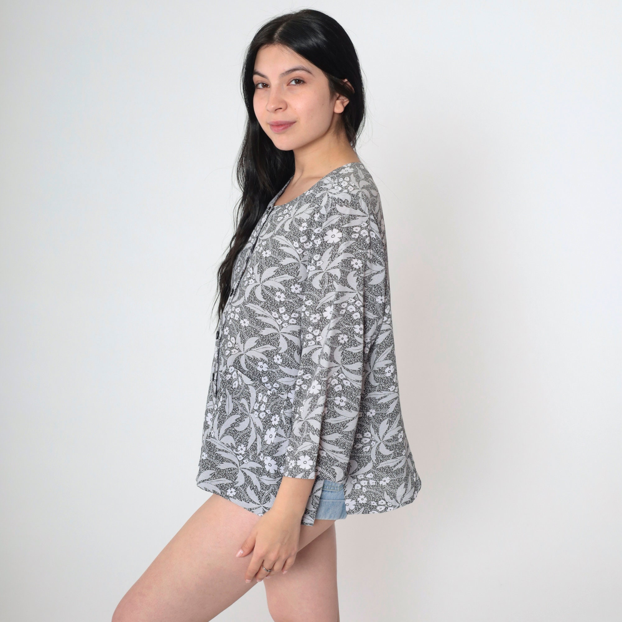 Vintage 90s shirt in black and white with a floral and palm tree print with glitter buttons up the front.