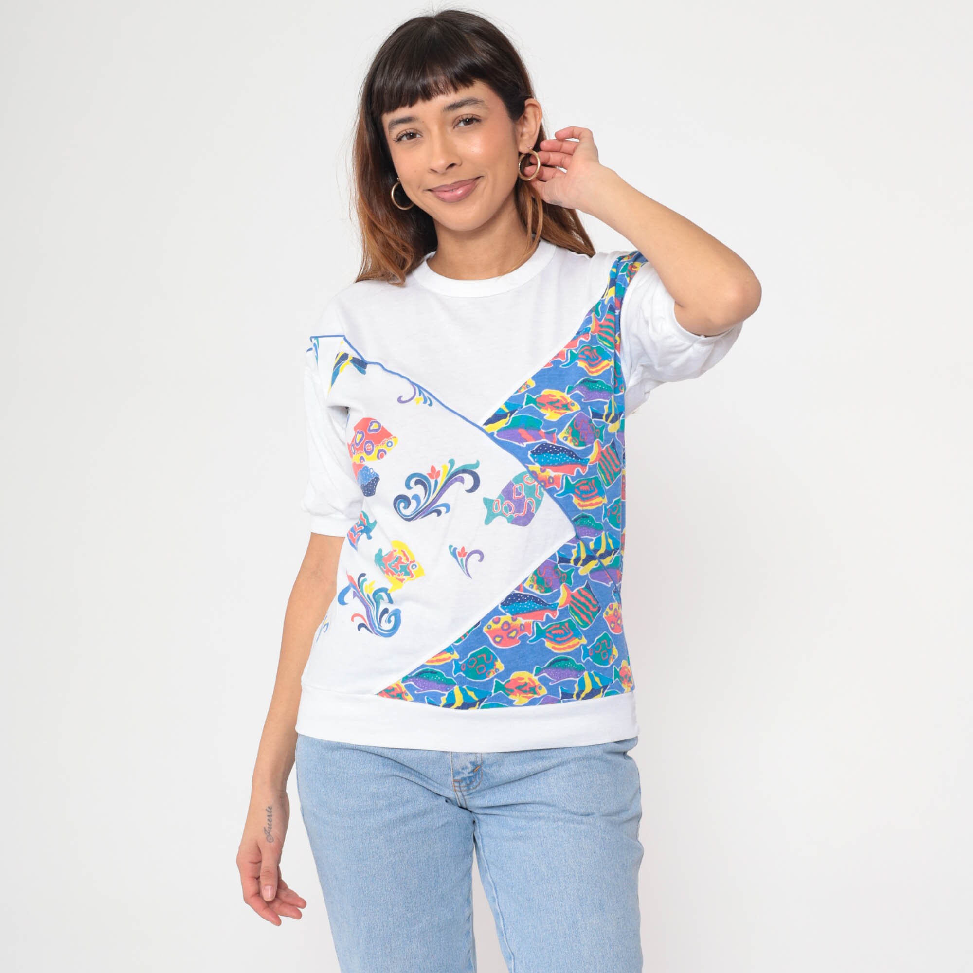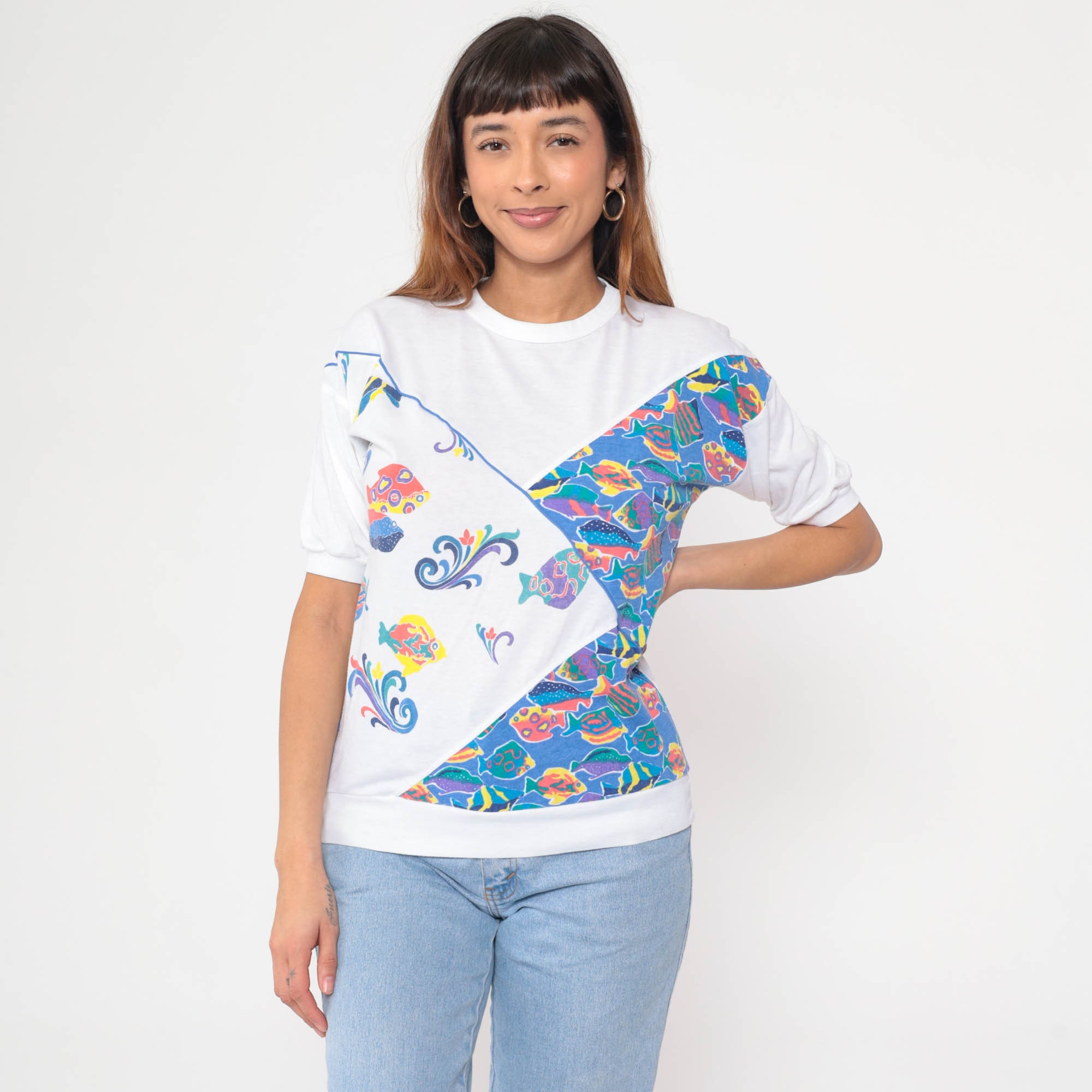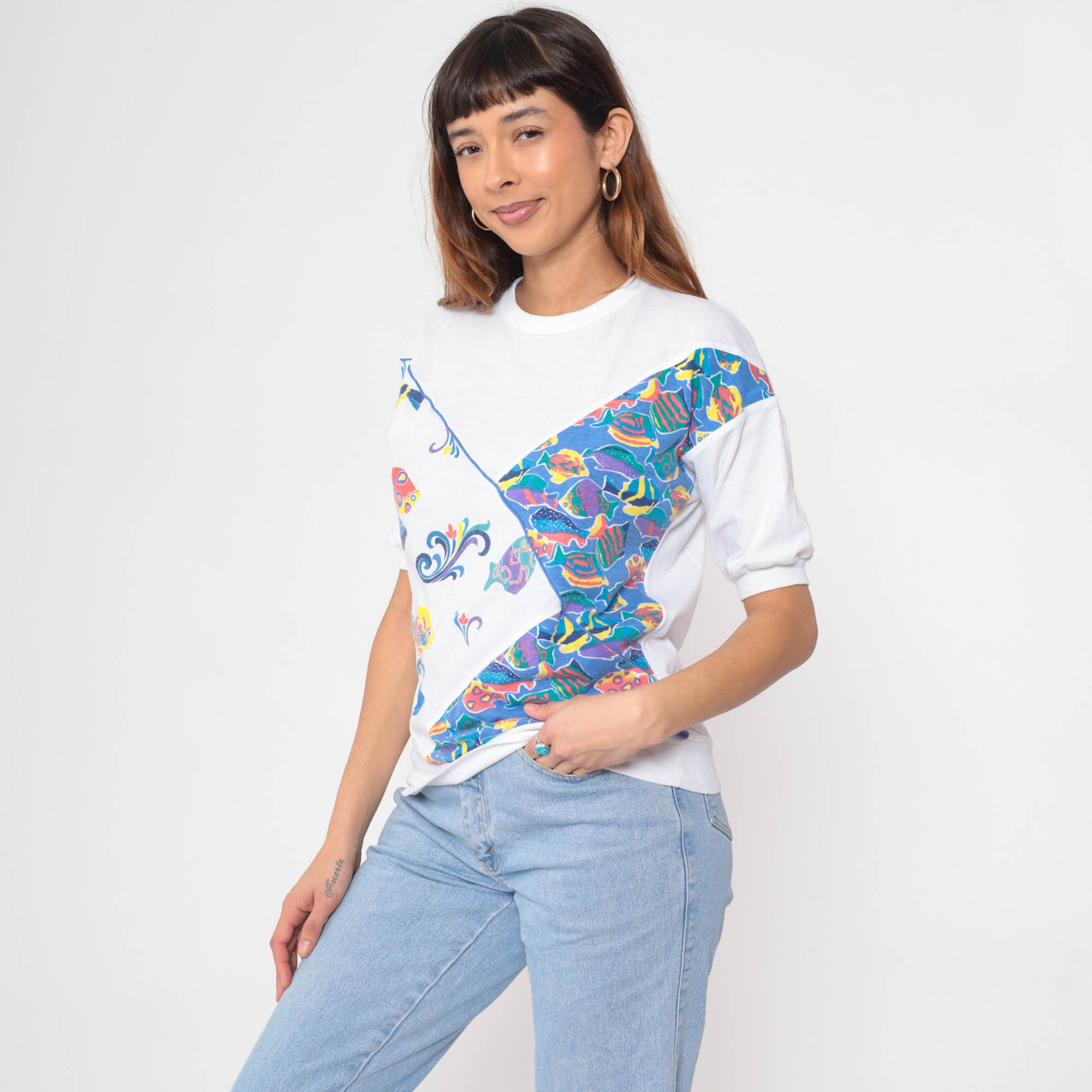 Vintage 80s t shirt with a tropical fish print. It has a crewneck, a banded hem for a slouchy fit, and short sleeves.
