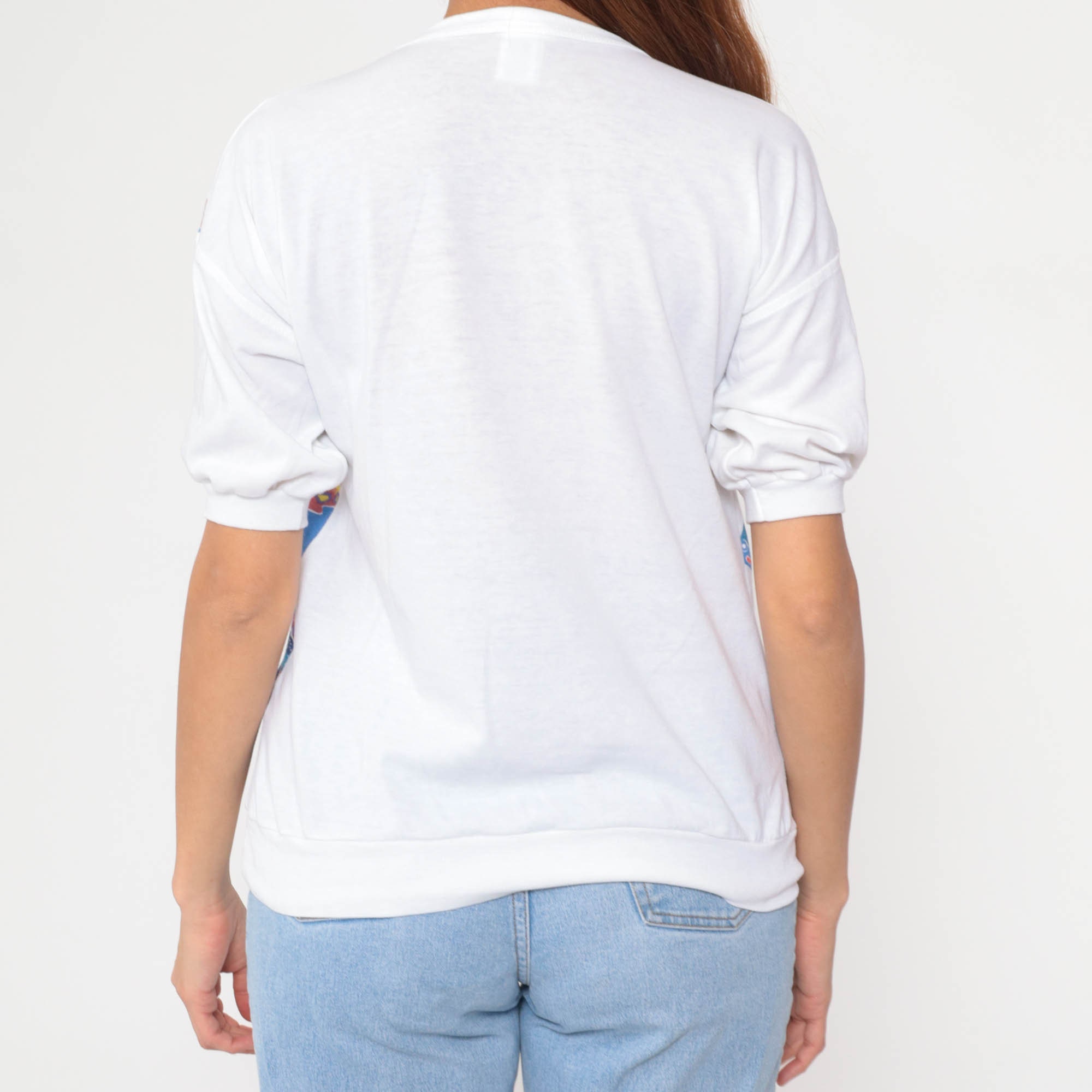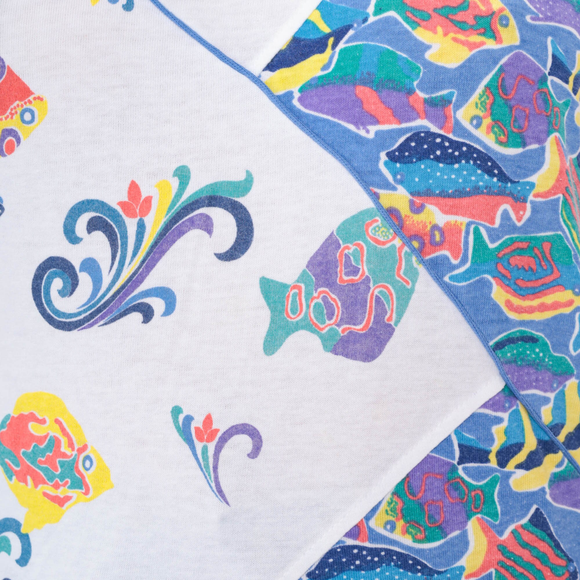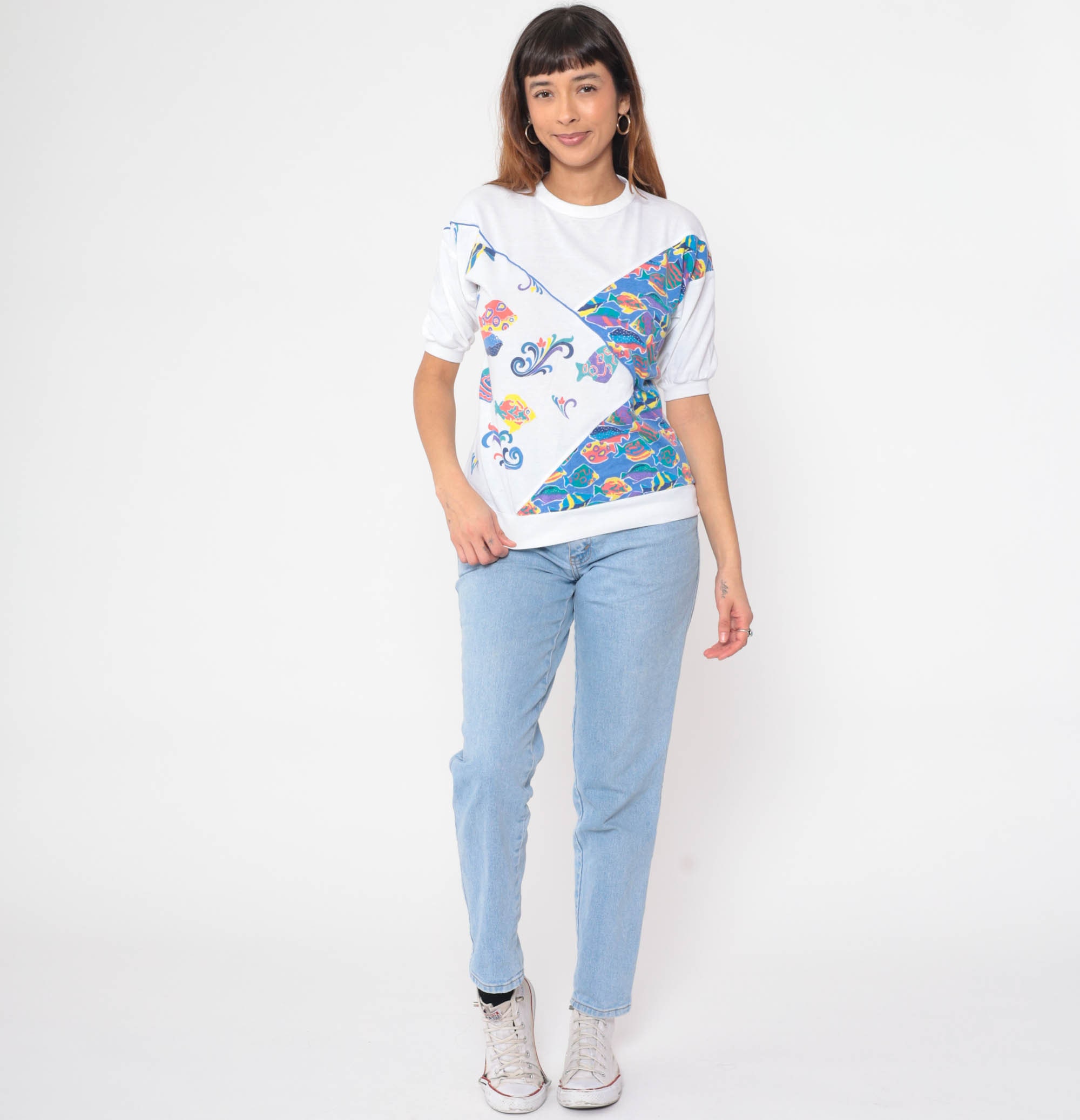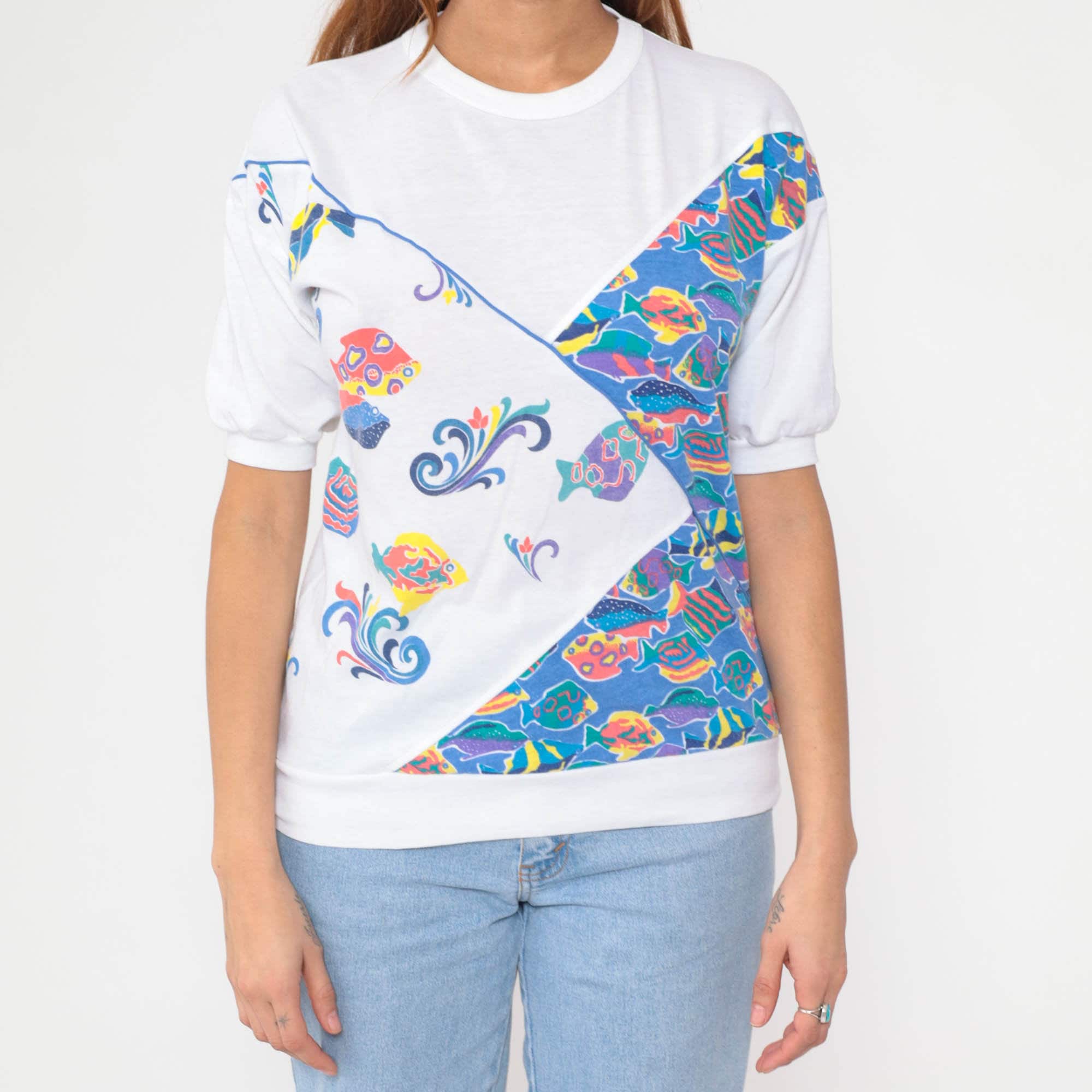 Vintage 80s t shirt with a tropical fish print. It has a crewneck, a banded hem for a slouchy fit, and short sleeves.