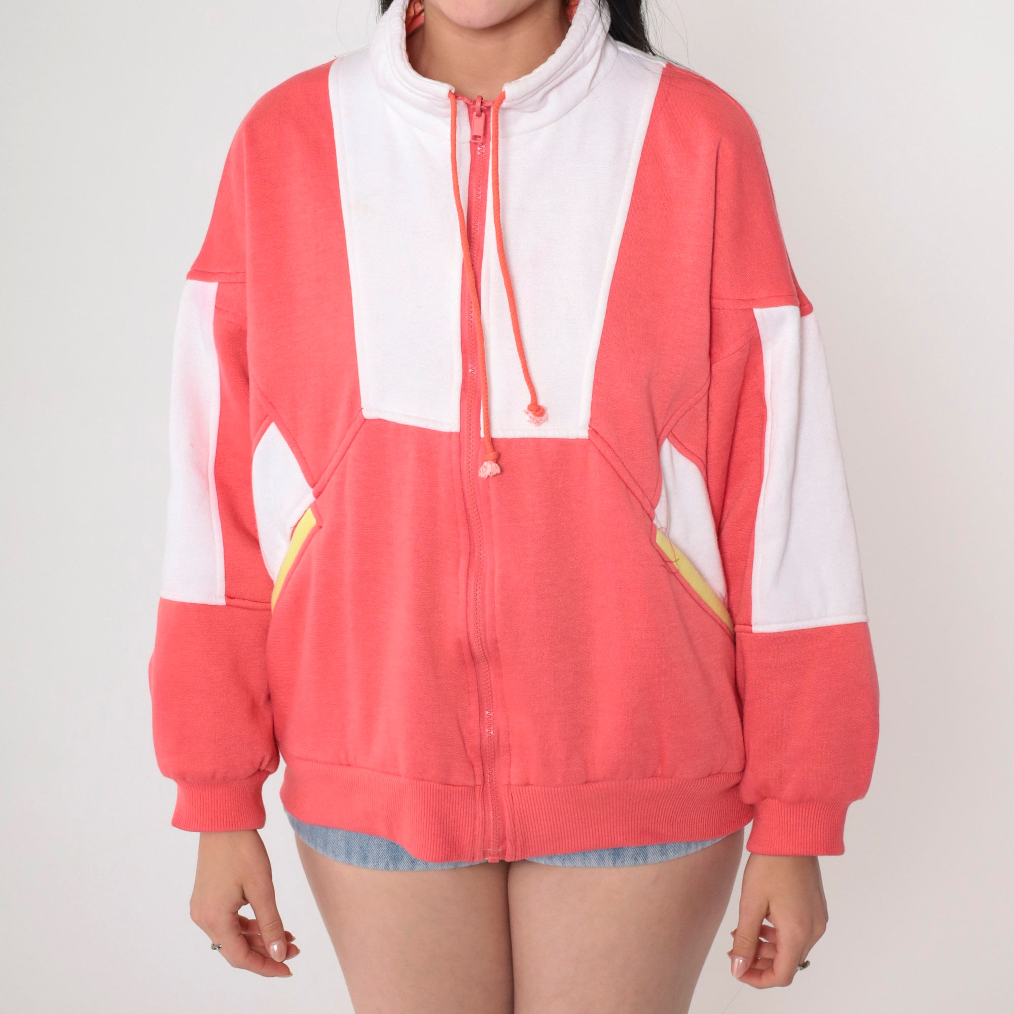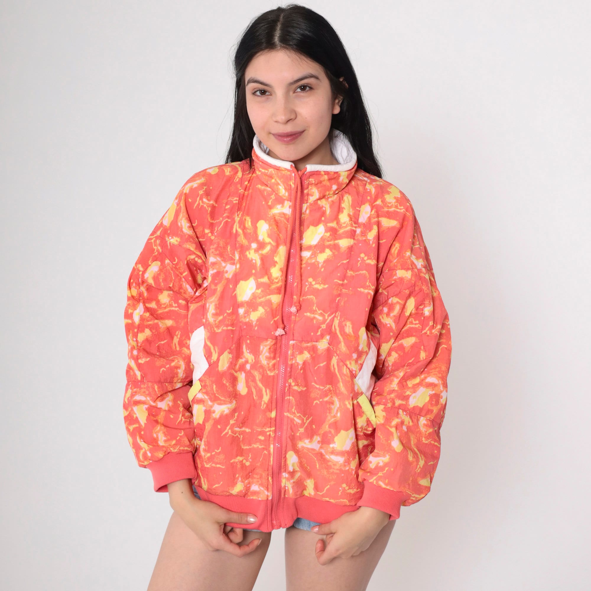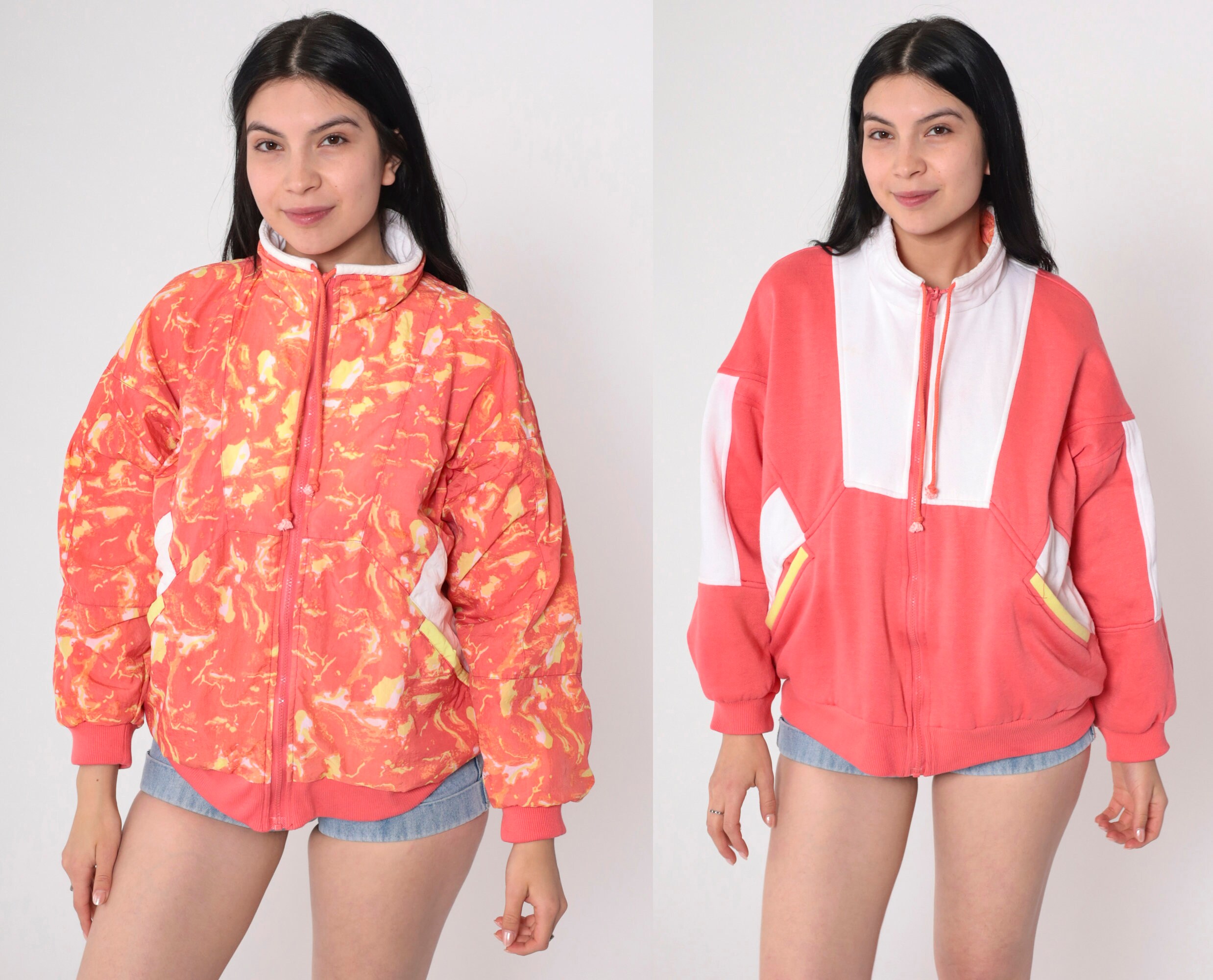 Vintage 90s reversible jacket in coral pink and white sweatshirt material with a psychedelic print in windbreaker material on the other side. Zips up the front.