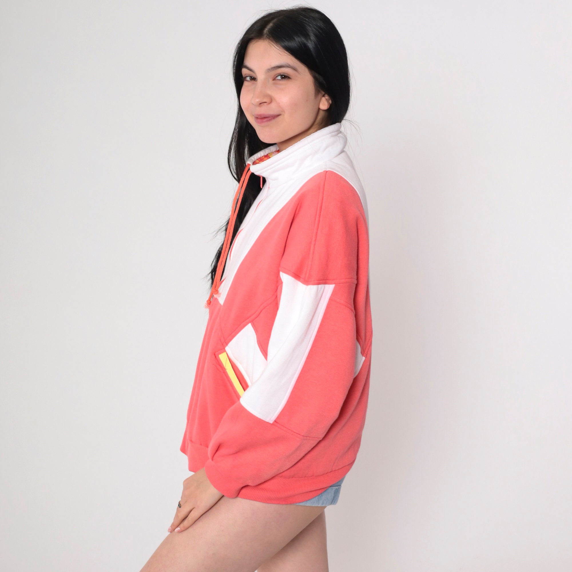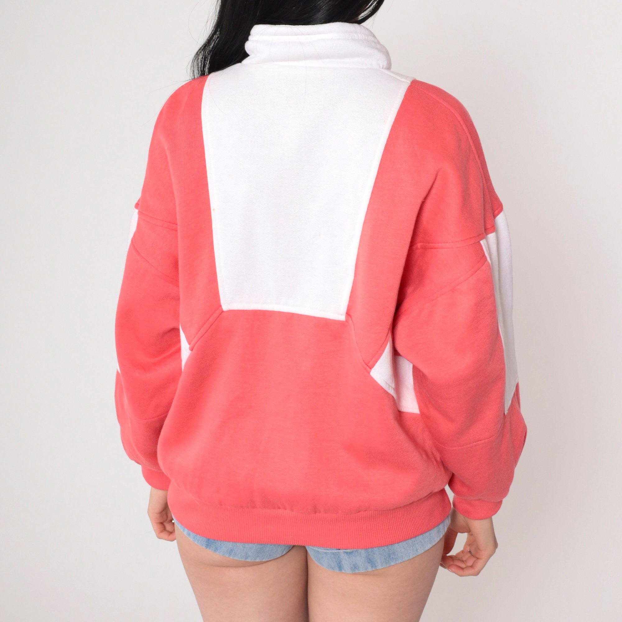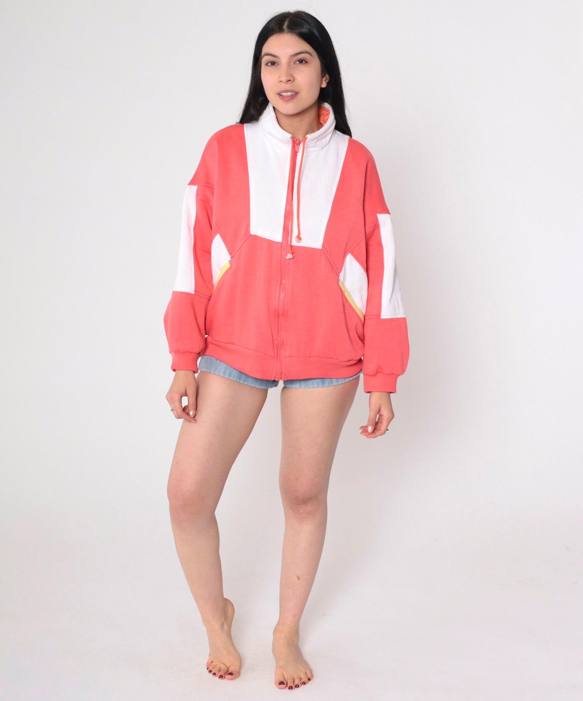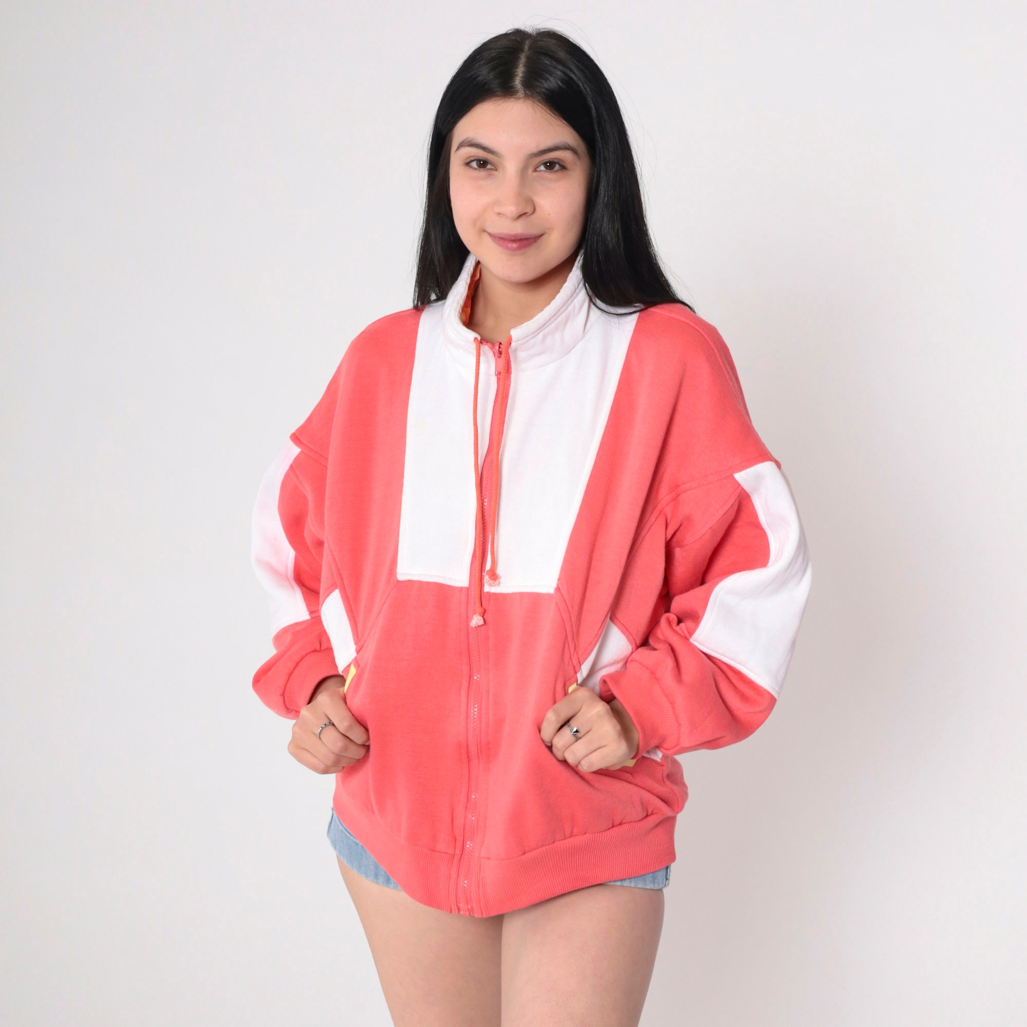 Vintage 90s reversible jacket in coral pink and white sweatshirt material with a psychedelic print in windbreaker material on the other side. Zips up the front.